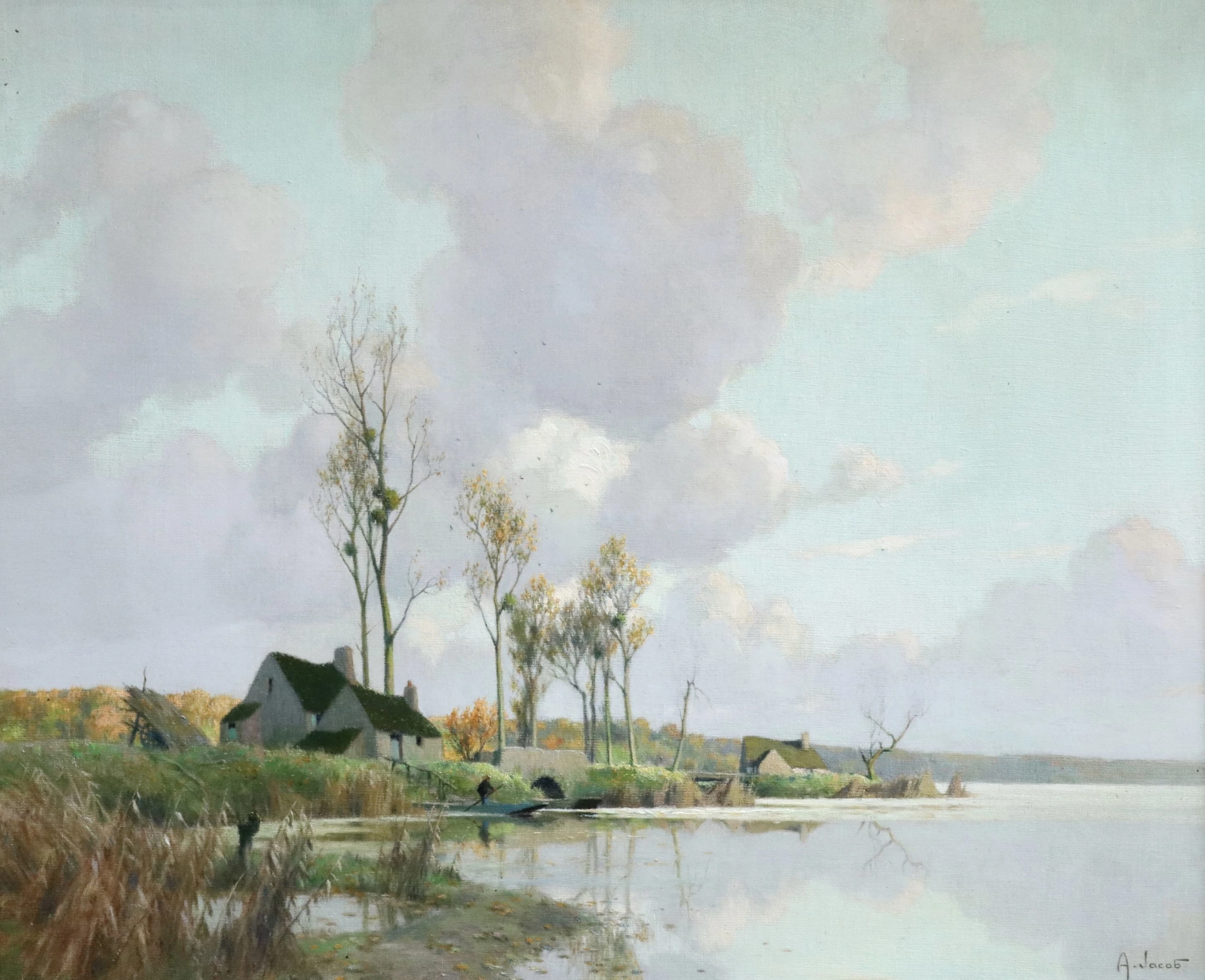 Jacob was a pupil of Eugène Claude. He was noted for his effects evoking the light of dawn and dusk. From 1899, he exhibited in Paris at the Salon des Artistes Français, of which he became a member in 1902. He received an honourable mention in 1908, a gold medal hors concours in 1914 and a gold medal at the Exposition Internationale in 1937. He exhibited there until 1950. He also showed at the Salon d'Hiver, the Salon des Aquarellistes, as well as in private galleries.
