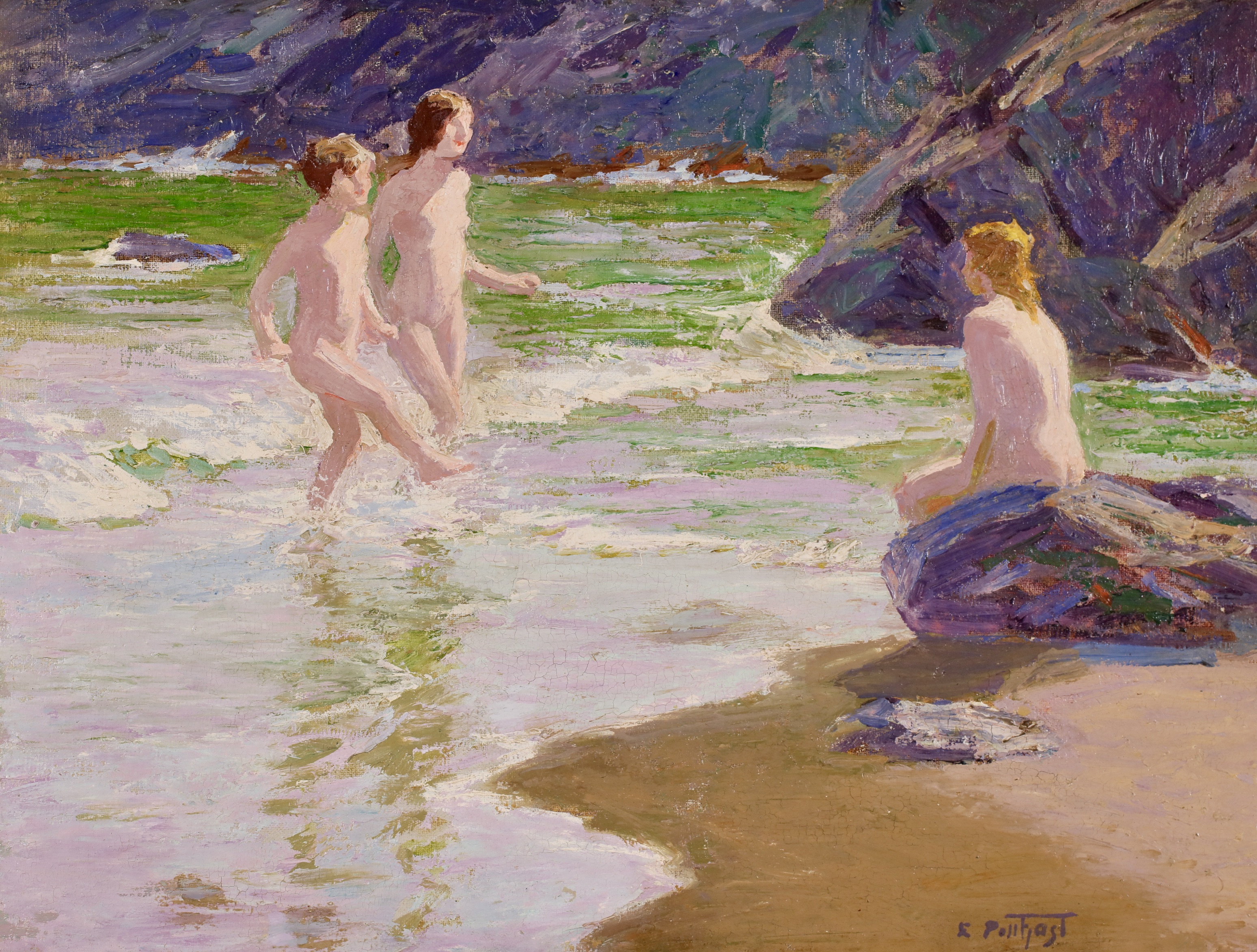 Potthast’s early works show the dark tonalities of the Munich school, but he began using brighter colours in 1896 after moving to New York. From 1915 he painted ocean beaches near New York City, and is best known for his scenes of women and children bathing or lounging on the beach, as in the oils Afternoon Fun, or Ring around the Rosy (around 1915). He also painted scenes of the New England coast, with the ocean breaking on rocky shores. Potthast produced illustrations for magazines such as Scribner's and Century. His work was characterised by a carefully selected viewpoint, the elimination of distracting detail, thick pigment, little facial expression in subjects, and contrasting blocks of colour. Most of his paintings are undated.