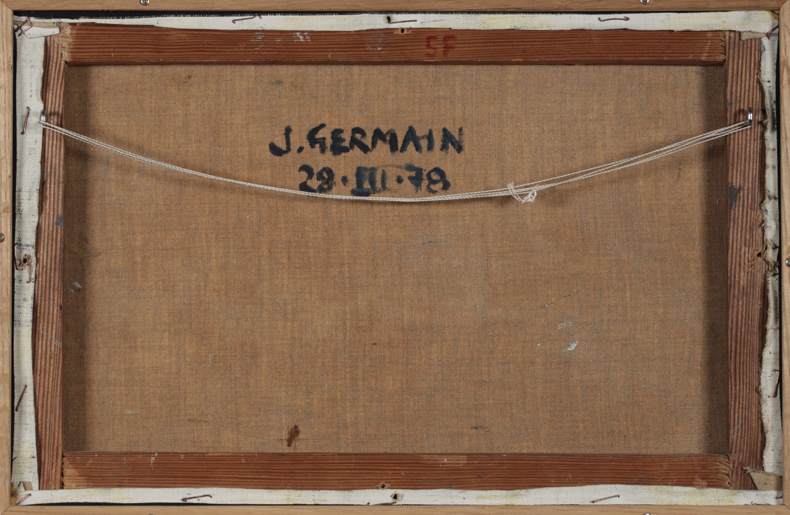 Jacques Germain was born in Paris in 1915. In 1931, on the advice of Blaise Cendrars, he became a pupil of Fernand Léger and Amédée Ozenfant at the Académie Moderne, Paris. He soon left for the Bauhaus in Dessau, where Jean Leppien remembered his arrival, and was taught by Kandinsky and Albers from 1931 to 1932. In 1932 and 1933 he studied advertisement and graphic design in Frankfurt at Willy Baumeister's Kunstgewerbeschule (Commercial Art School). Conscripted in 1936, he served in the war and was a prisoner in Germany until 1943. Since 1944 he has divided his time between Paris and his family home in Tremblay-sur-Mauldre. In 1946 he met Antoine Artaud and worked with him.