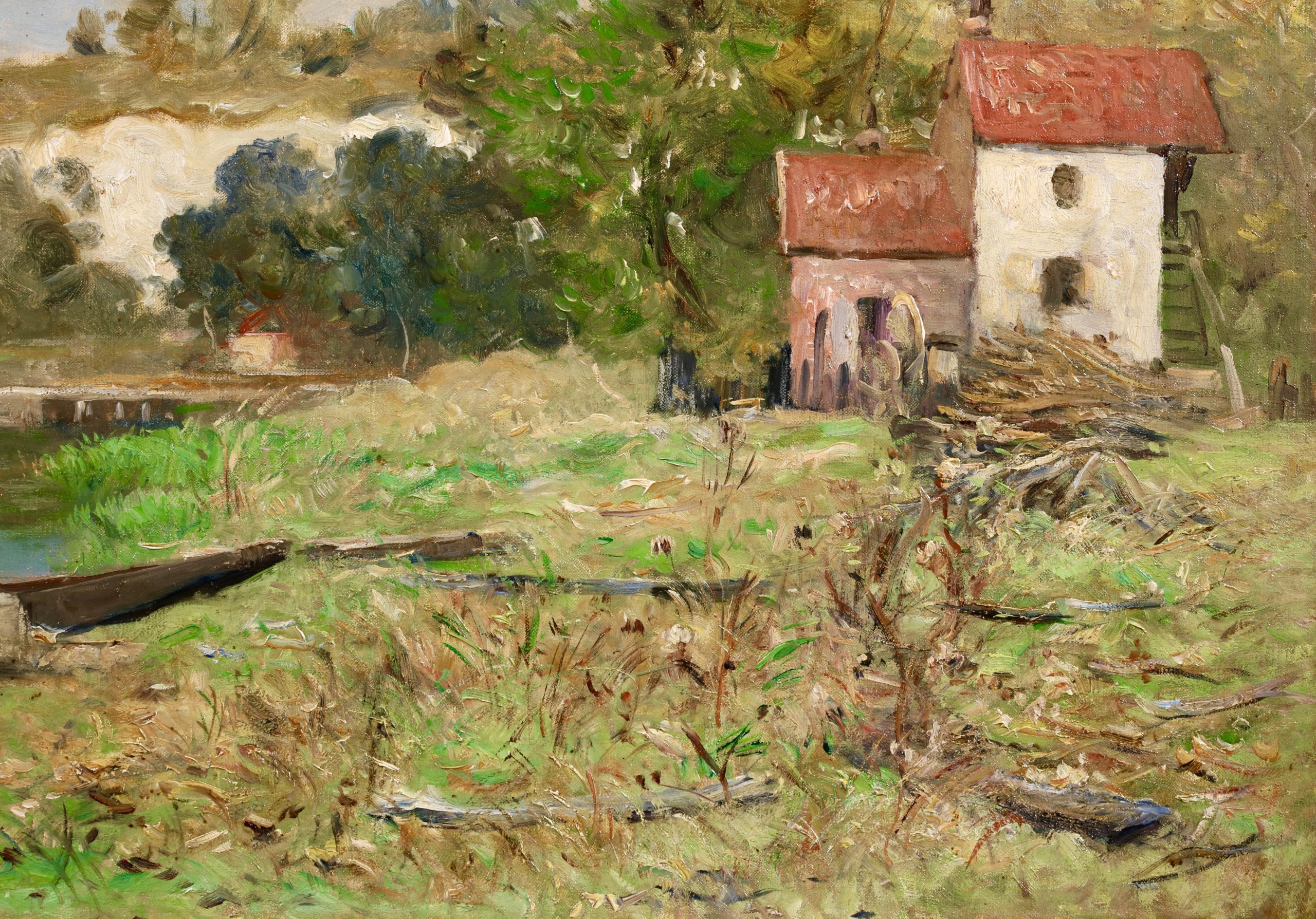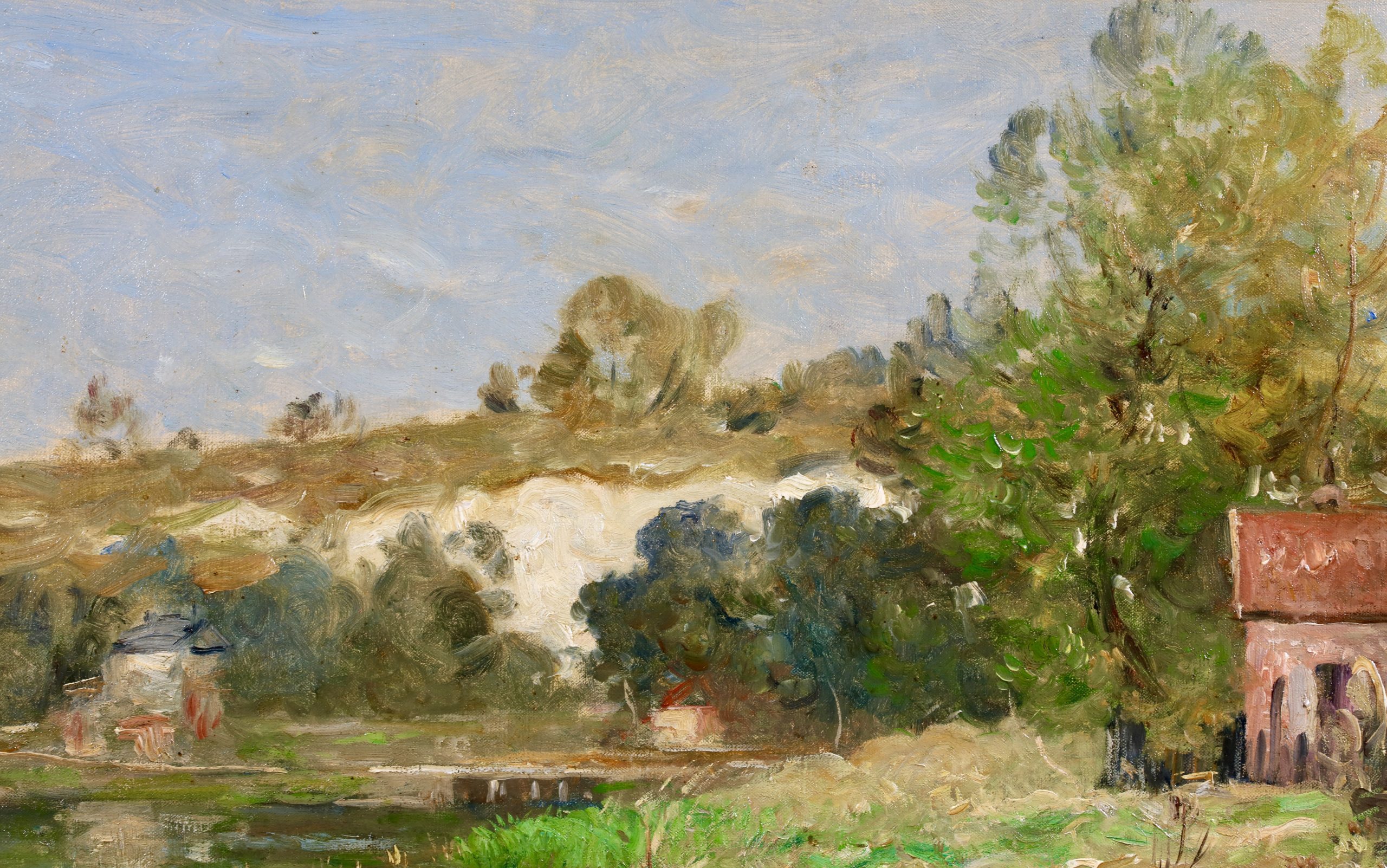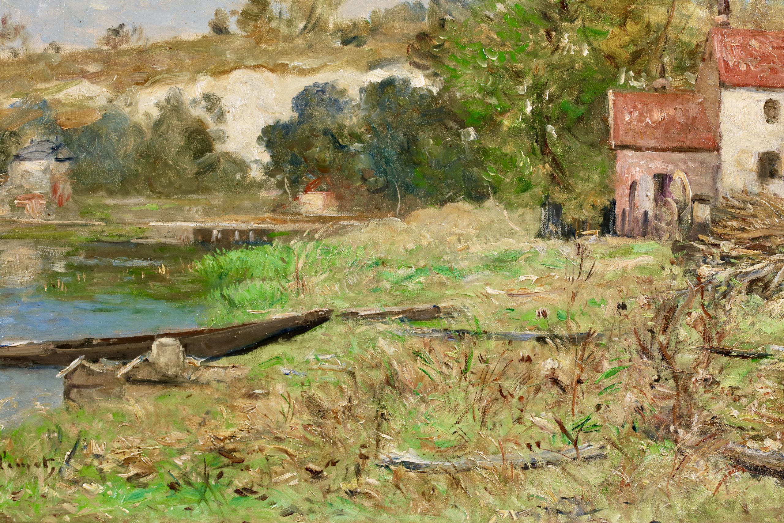 In the Exposition Universelle (1889), celebrating the centennial of the French Revolution. Guillemet was represented by seven paintings, including Le Vieux Quai de Bercy and Paris, vue prise de Meudon. In 1891 Antoine Guillemet painted a view up the Seine from the sight of these pictures towards the eastern end of the Quai de Bercy titled Le Quai de Bercy à Charenton. Which was purchased by the Musée de la Ville de Paris, now the Musée Carnavalet. And in the same year, he produced the present picture, La Seine à Conflans-Charenton.
