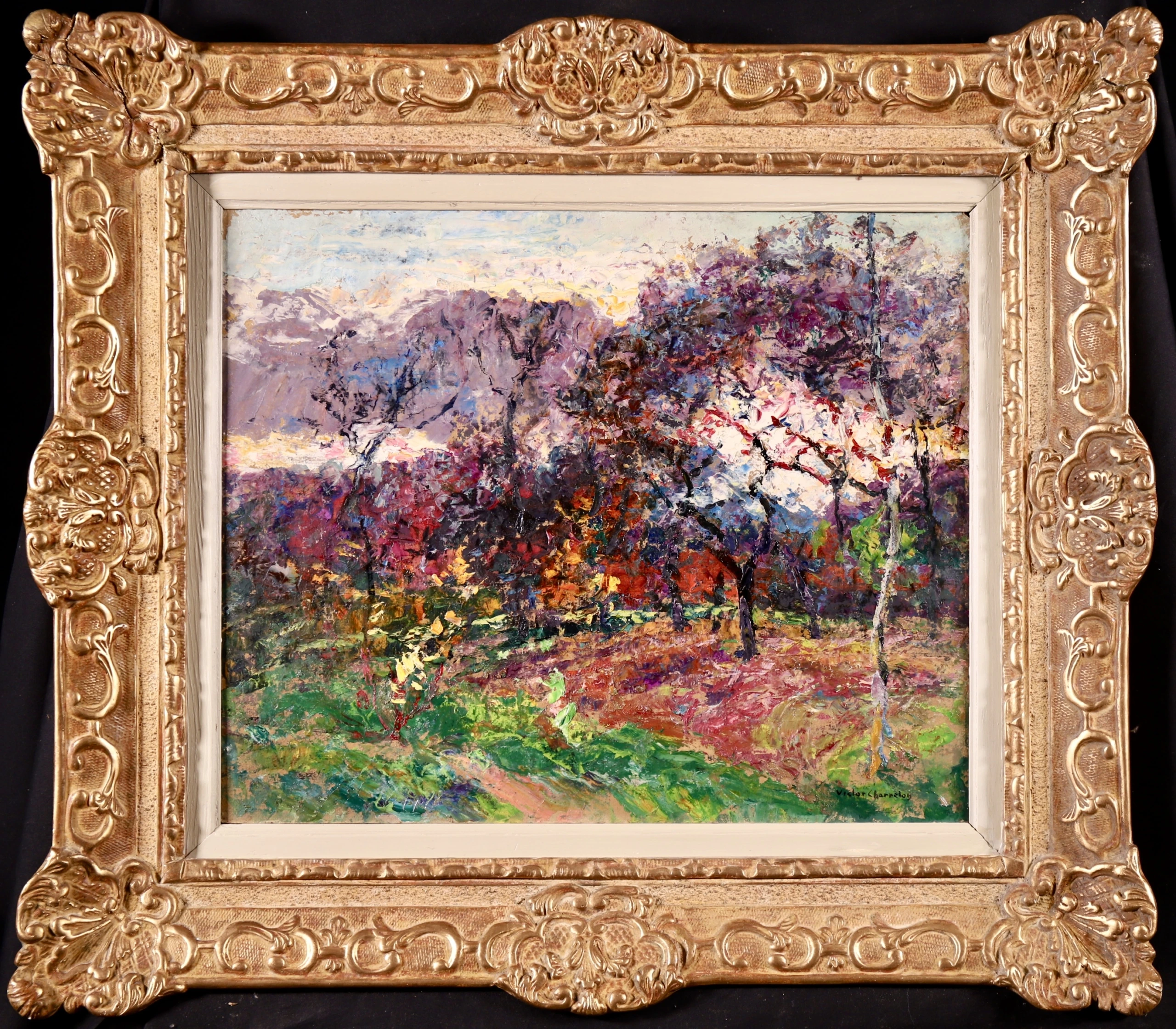 Charreton was a landscape artist in the Lyons tradition with a love of sensual impasto. In his works he seeks to capture fleeting, momentary effects, like those achieved by the Impressionists: effects at different times of day and in different seasons, such as dusk and snow. As a young man he painted the environs of Bourgoin, but his marriage in 1893 took him to Auvergne where he painted the characteristic landscapes of the region. Landscapes of Auvergne make up approximately two-thirds of his output. What became known as the School of Murols, named after a village in Auvergne, was principally formed around him between 1910 and 1925. Skilled in capturing minute changes in the weather, he was also adept at capturing the spirit of new places. Beside his native Dauphiné and his adopted Auvergne, he was also charmed by the landscapes of the Île-de-France and Paris - Montmartre, the Jardin du Luxembourg and the Parc Montsouris - and also Provence, Creuse and Brittany. However, no trace has been found of his trips abroad. It would be a misjudgment to think that he only painted pretty picture-postcard scenes in the regions he visited; on the contrary, he would seek out the intimist qualities of a place, choosing perhaps a quiet hamlet, with a humble bridge over an anonymous stretch of water, or an ordinary tree outside a tumbledown house. He would paint blazing autumn landscapes, with a sumptuous colour palette, but also favoured snowy scenes, their exact chromatic opposite. At the start of his career he would paint dusky scenes and contre-jours in halftones and misty sunsets. As his artistic development progressed, he attached more and more importance to light and colour. In this respect his work follows on from that of Ravier and, like Guillaumin, it is almost a precursor to Fauvism, or alternatively can be regarded as complicit with it, like the work of Maurice Marinot. His brushwork evolved in tandem with his use of colour, which became ever more vibrant; for example his fondness for purple hues and later his striking colour contrasts. His brushwork became more conspicuous and he would suppress the insignificant details in order to bring out the forms that made up the general composition. Among art historians he is not ranked alongside the innovators who succeeded the Impressionists, like Gauguin, Seurat, Van Gogh or Cézanne. Older than Matisse, who was himself already by far the eldest of the Fauves, Charreton stopped short of what he considered to be their excesses. He placed himself at the crossroads between two centuries: the end of the century of Impressionism and the start of the leaps made by Fauvism. His life and the major themes in his work are evidence of this, but he decided to be a regional painter; as such, his talent and qualities are clearer than they may otherwise have been if he had chosen a more ambitious career. Beside his painting, he also wrote a play in three acts entitled The Montrouge Well ( Le Puits de Montrouge), which was performed in Bourgoin in December 1883.