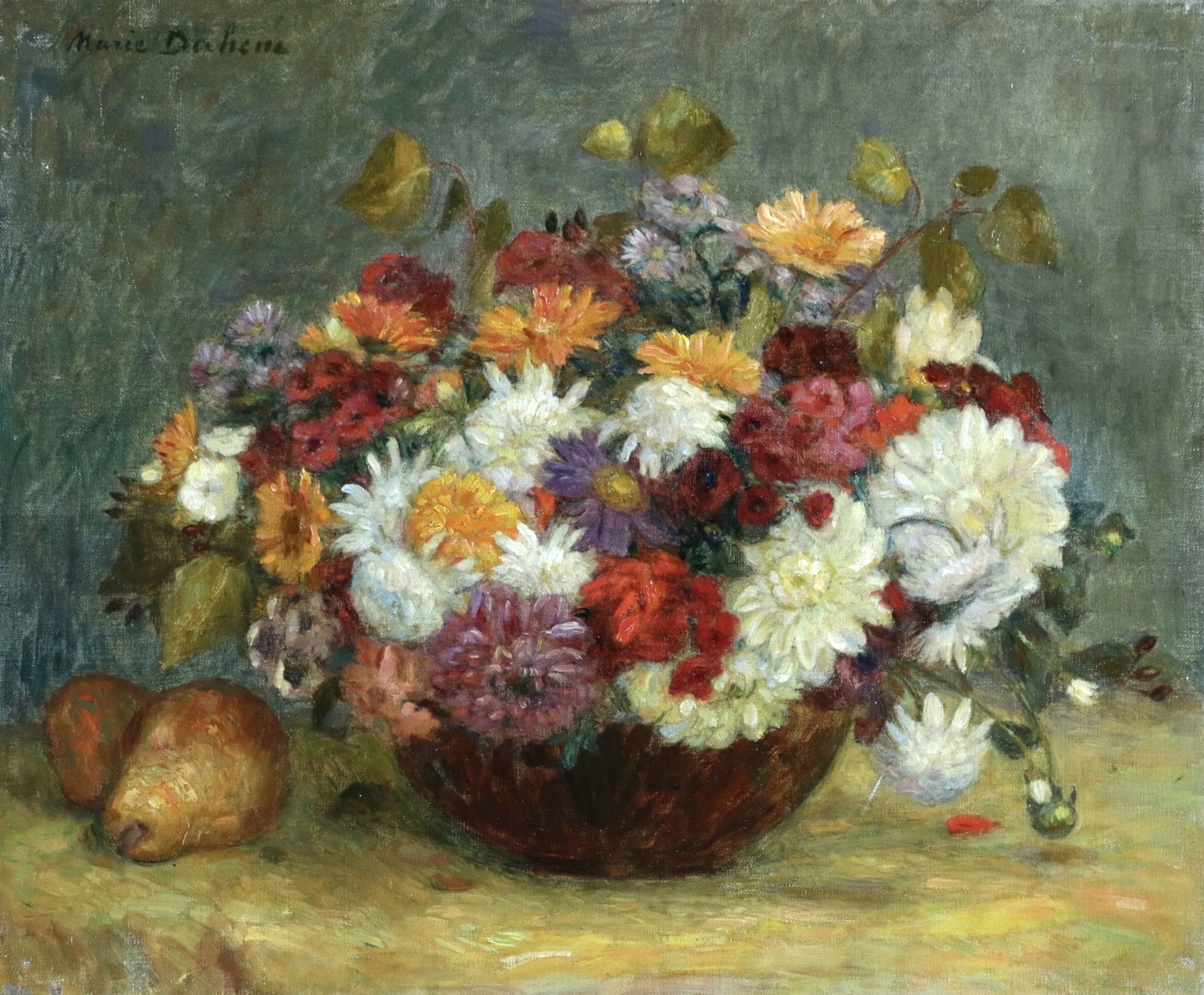 Marie Duhem was a painter whose career had a national influence. She was named Officer of the Palmes académiques, named Knight of the Legion of Honor in 1912, she received a medal at the World Fair of 1900. A personal exhibition is dedicated to her in 1906, in Paris, at the Georges Petit Gallery. That same year, the State acquired an oil on canvas entitled "White Buttercups" for the Luxembourg Museum, now kept at the Musée d'Orsay, which also owns Duhems "Queens Daisies in a Vase".