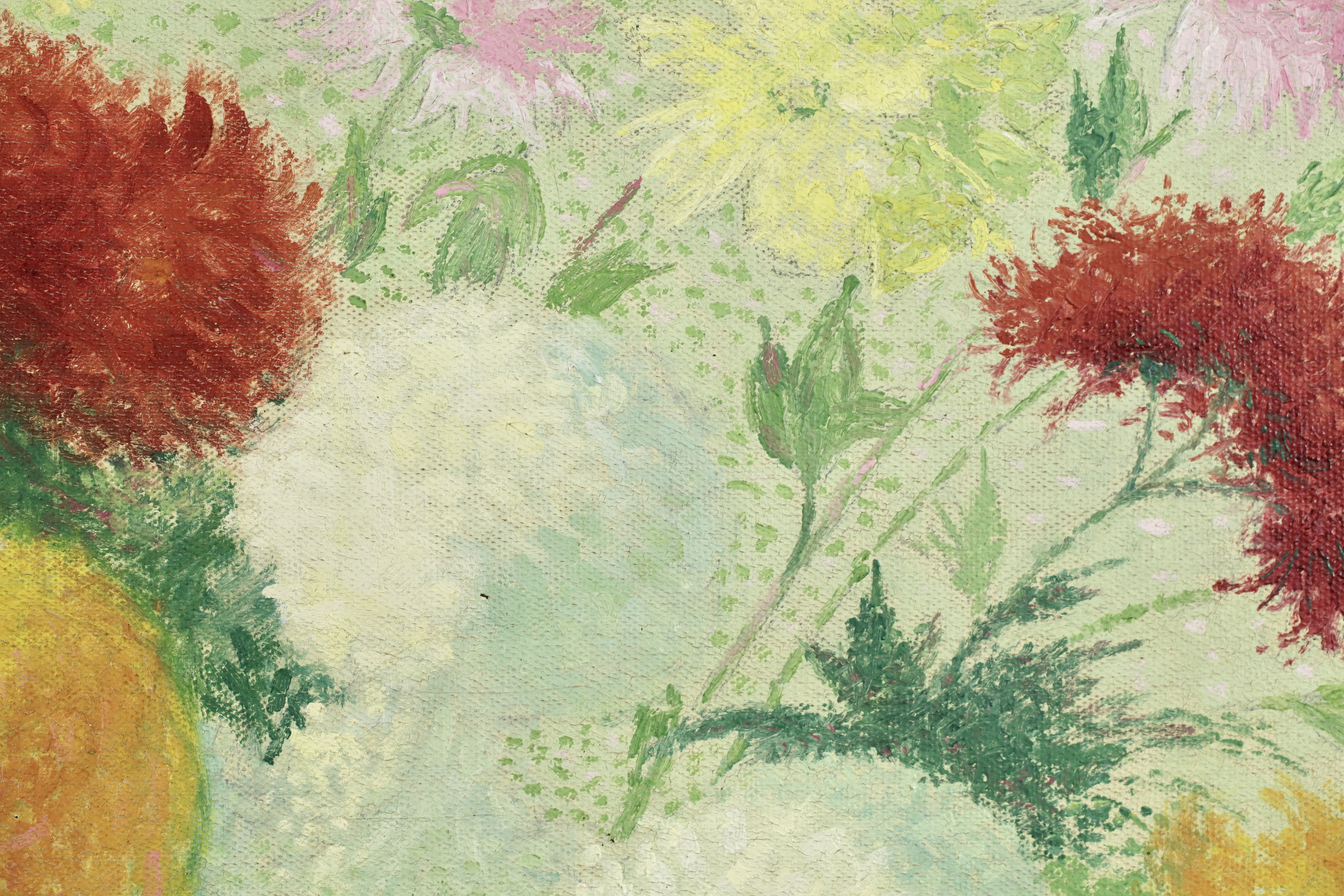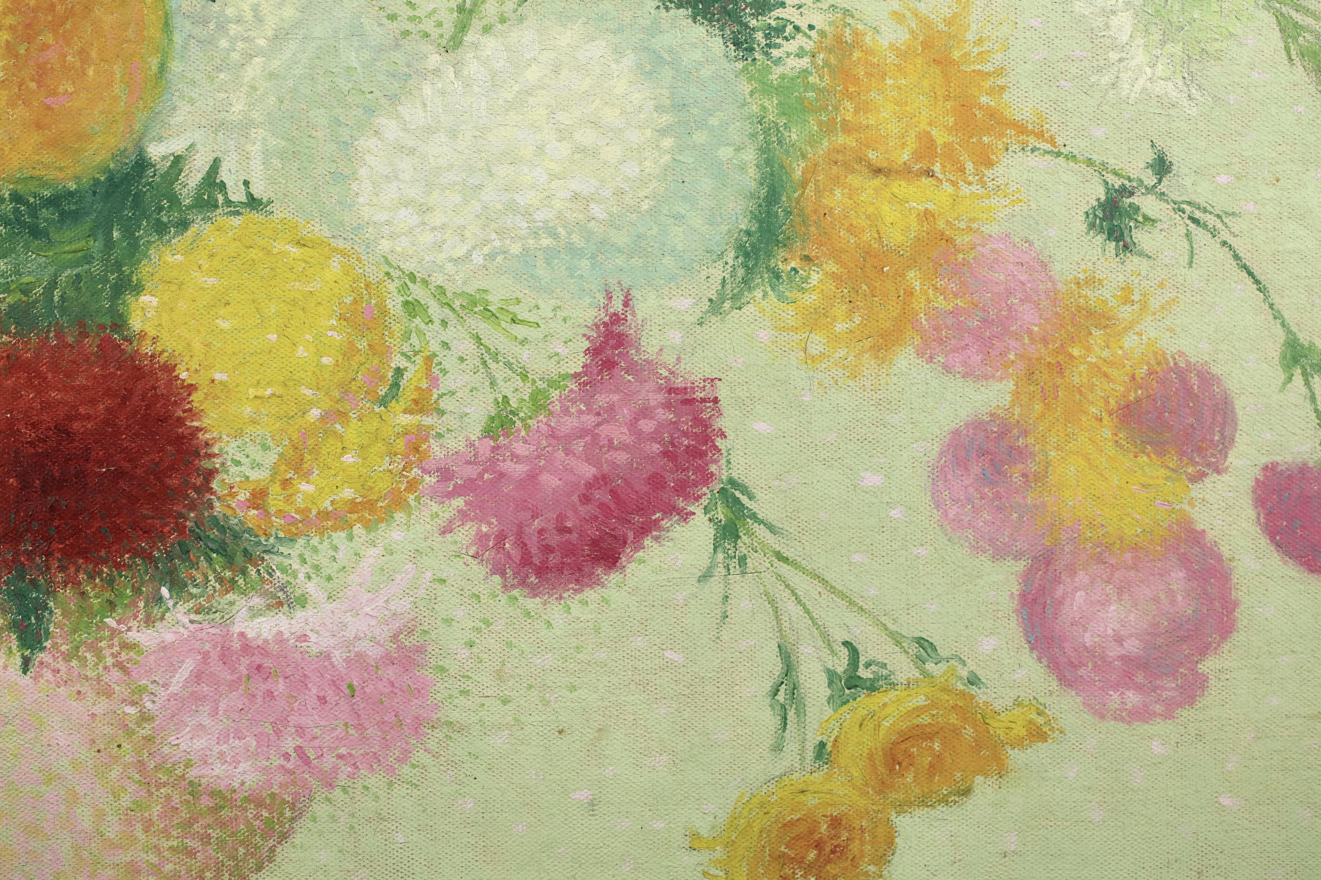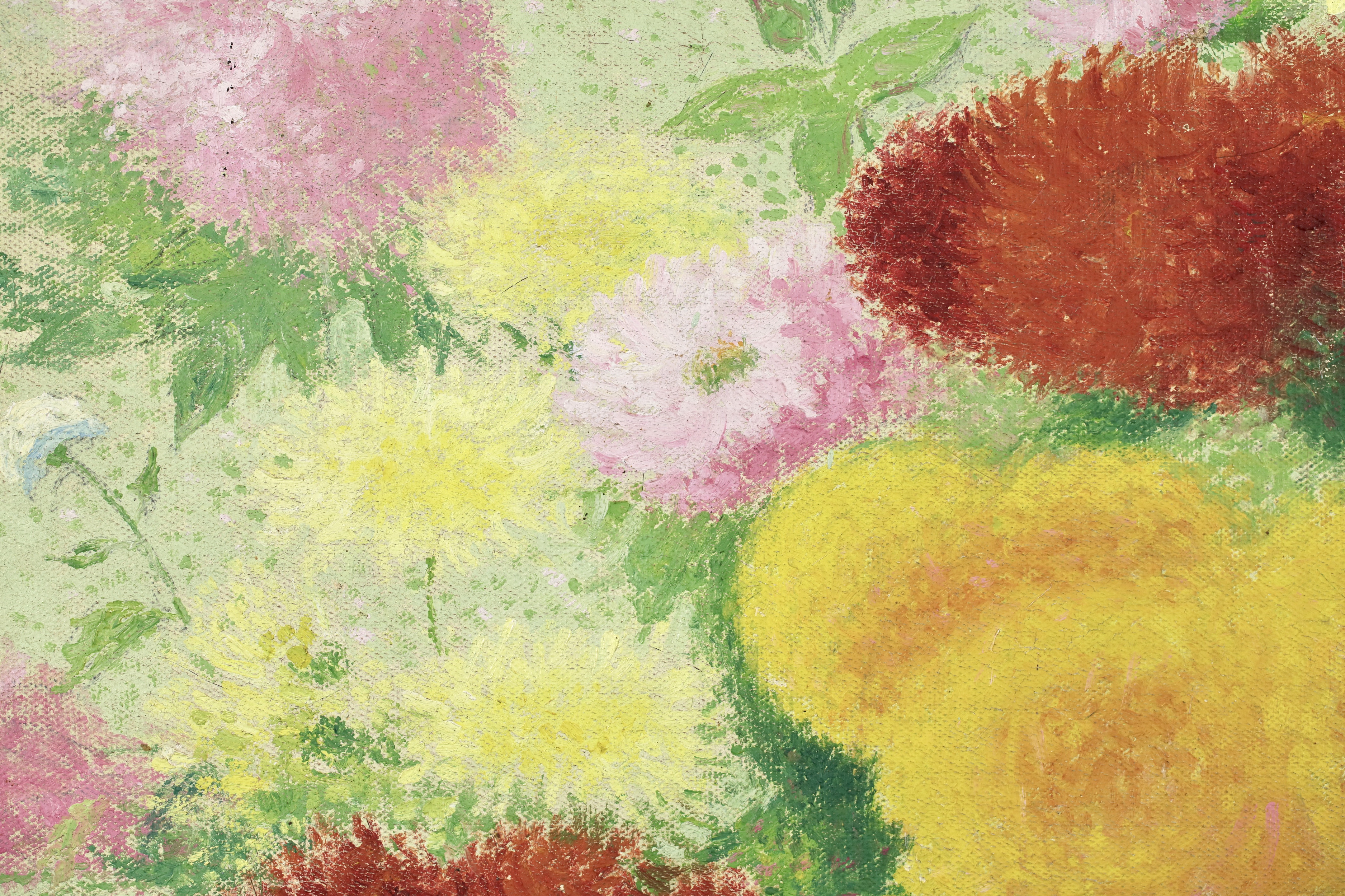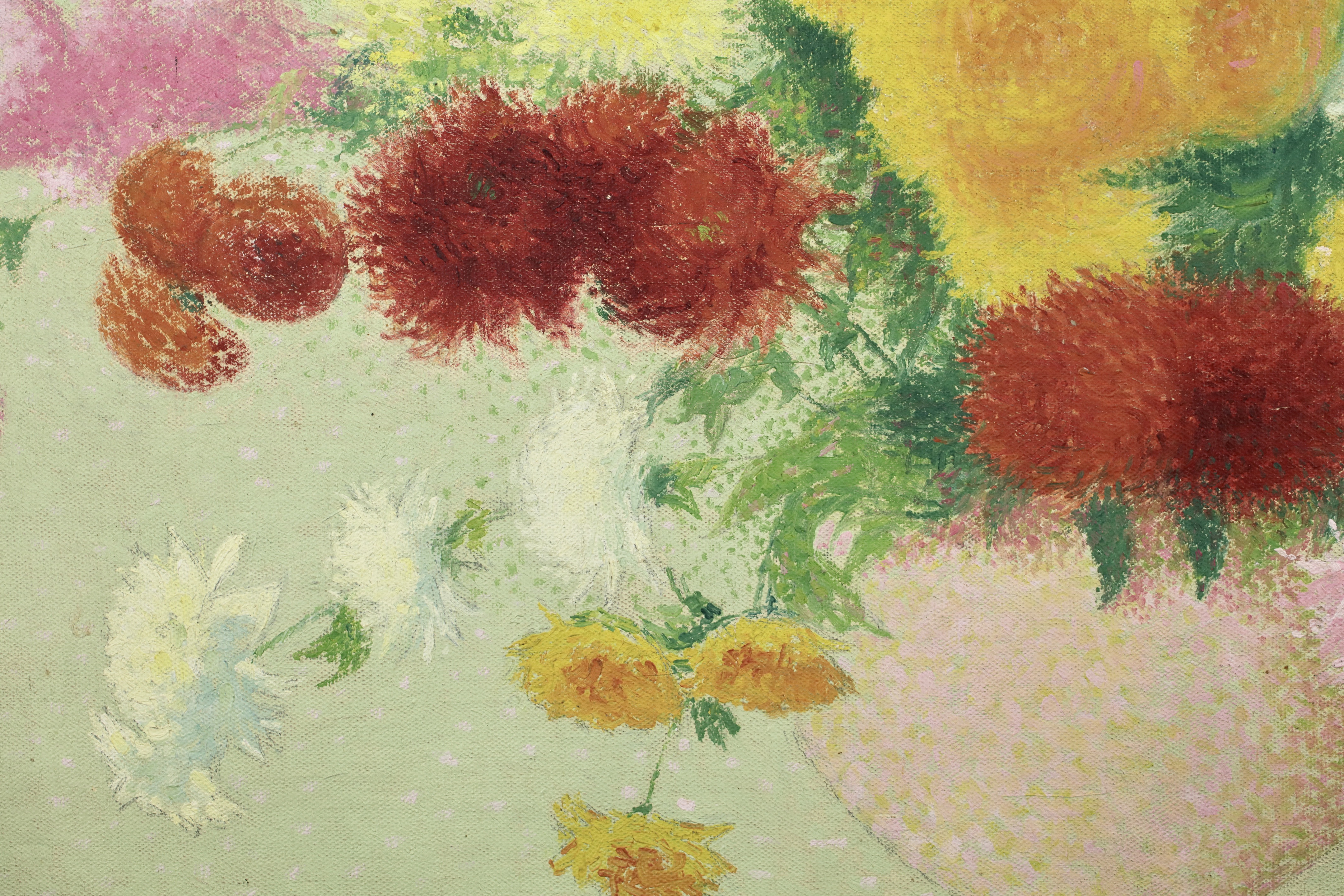 This work was originally commissioned for the Gailhadet estate by Mr. Castel the local elected member of the Assemblée National of France. This partially unrealized decoration was to include works of fields and flowers. The motif of the bouquet with dahlias would recur several times in the work of Achille Laugé. Its first appearance is found in an oil on canvas from 1916 preserved at the Museum of Art and History of Narbonne. The same year, the artist delivered to the Manufacture des Gobelins his models for a tapestry project commissioned by the State on the theme "The Seasons". We find there in Laugé's model and then in the tapestry executed by the Manufacture des Gobelins this motif of dahlias in a vase. Dahlias, with the multiplicity of their petals, allow Laugé to fully express his talent for color modulations and the Divisionist touch.