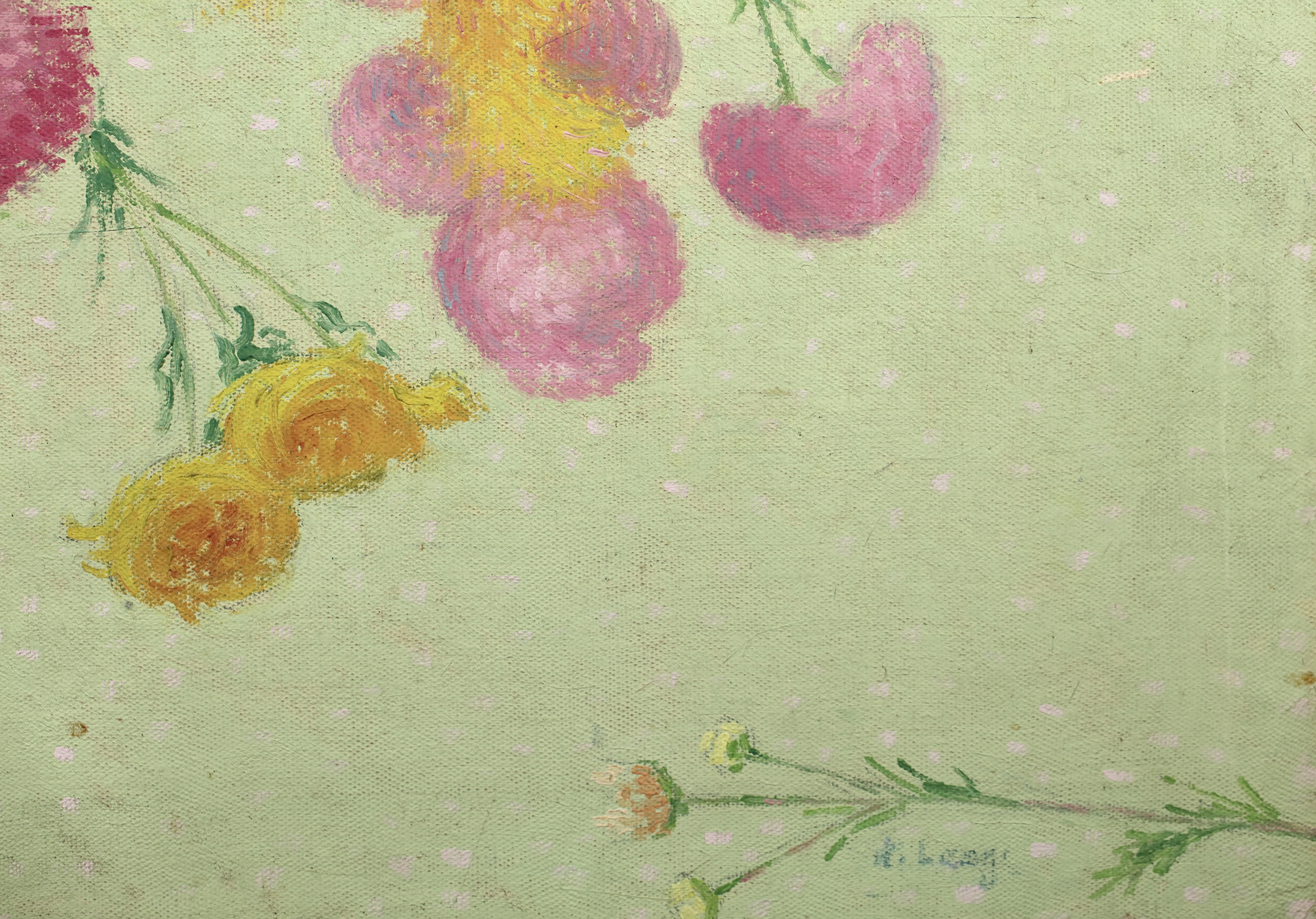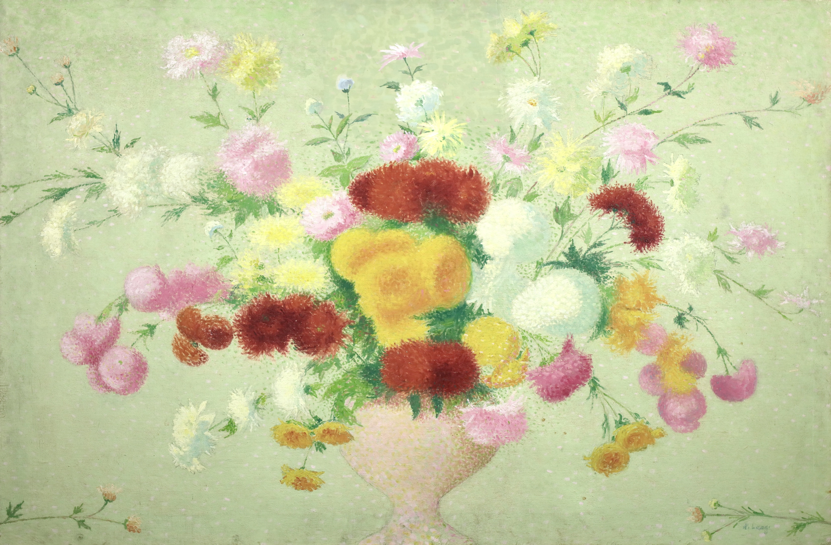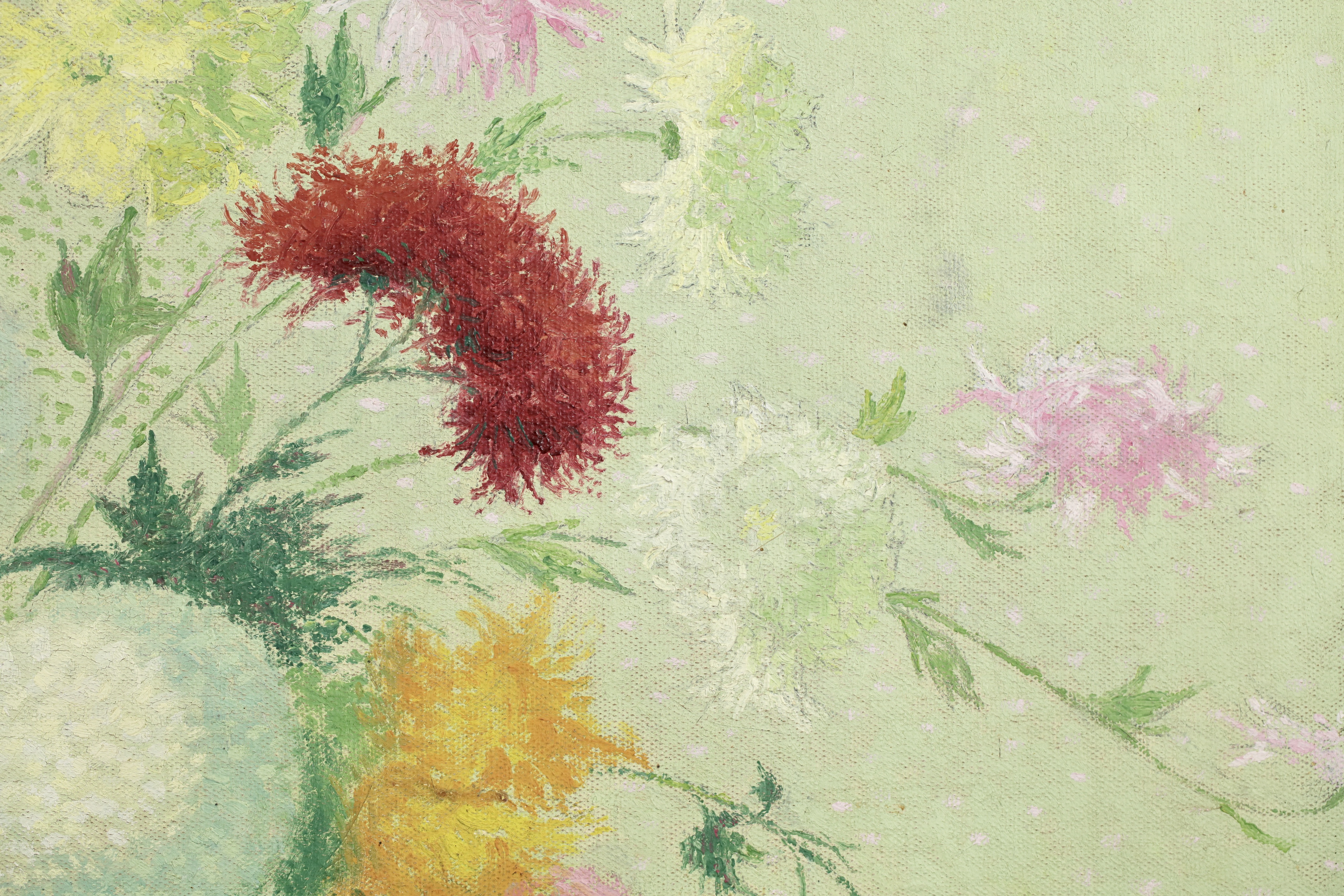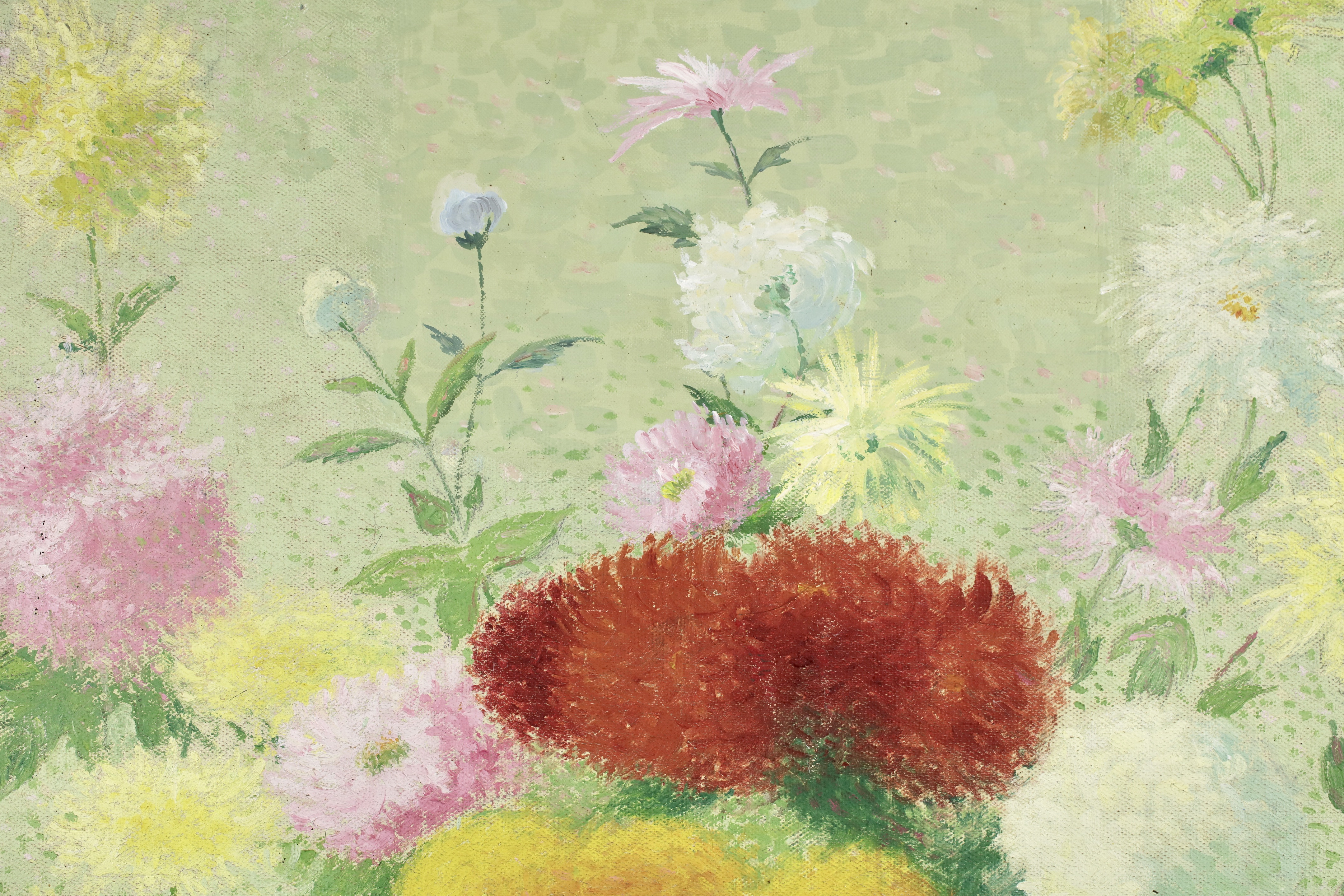 This work was originally commissioned for the Gailhadet estate by Mr. Castel the local elected member of the Assemblée National of France. This partially unrealized decoration was to include works of fields and flowers. The motif of the bouquet with dahlias would recur several times in the work of Achille Laugé. Its first appearance is found in an oil on canvas from 1916 preserved at the Museum of Art and History of Narbonne. The same year, the artist delivered to the Manufacture des Gobelins his models for a tapestry project commissioned by the State on the theme "The Seasons". We find there in Laugé's model and then in the tapestry executed by the Manufacture des Gobelins this motif of dahlias in a vase. Dahlias, with the multiplicity of their petals, allow Laugé to fully express his talent for color modulations and the Divisionist touch.
