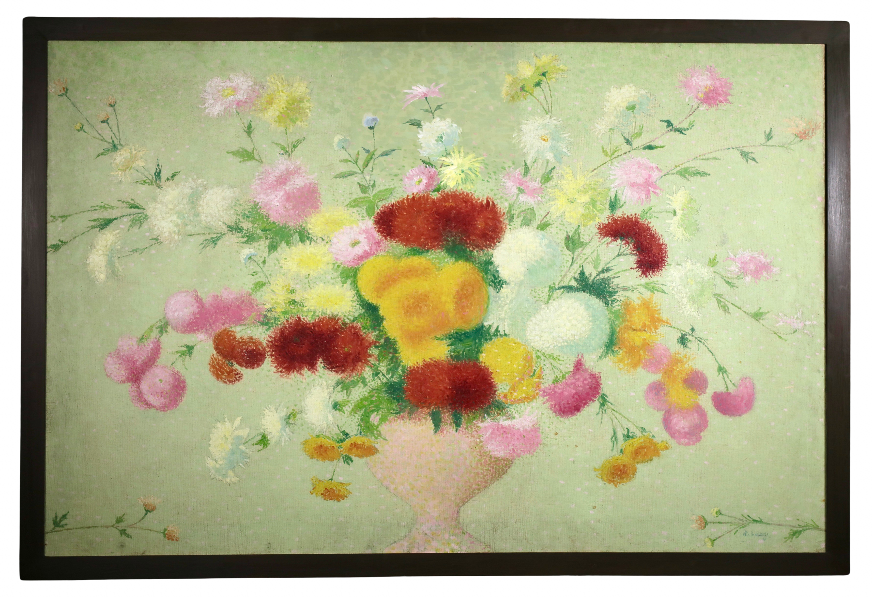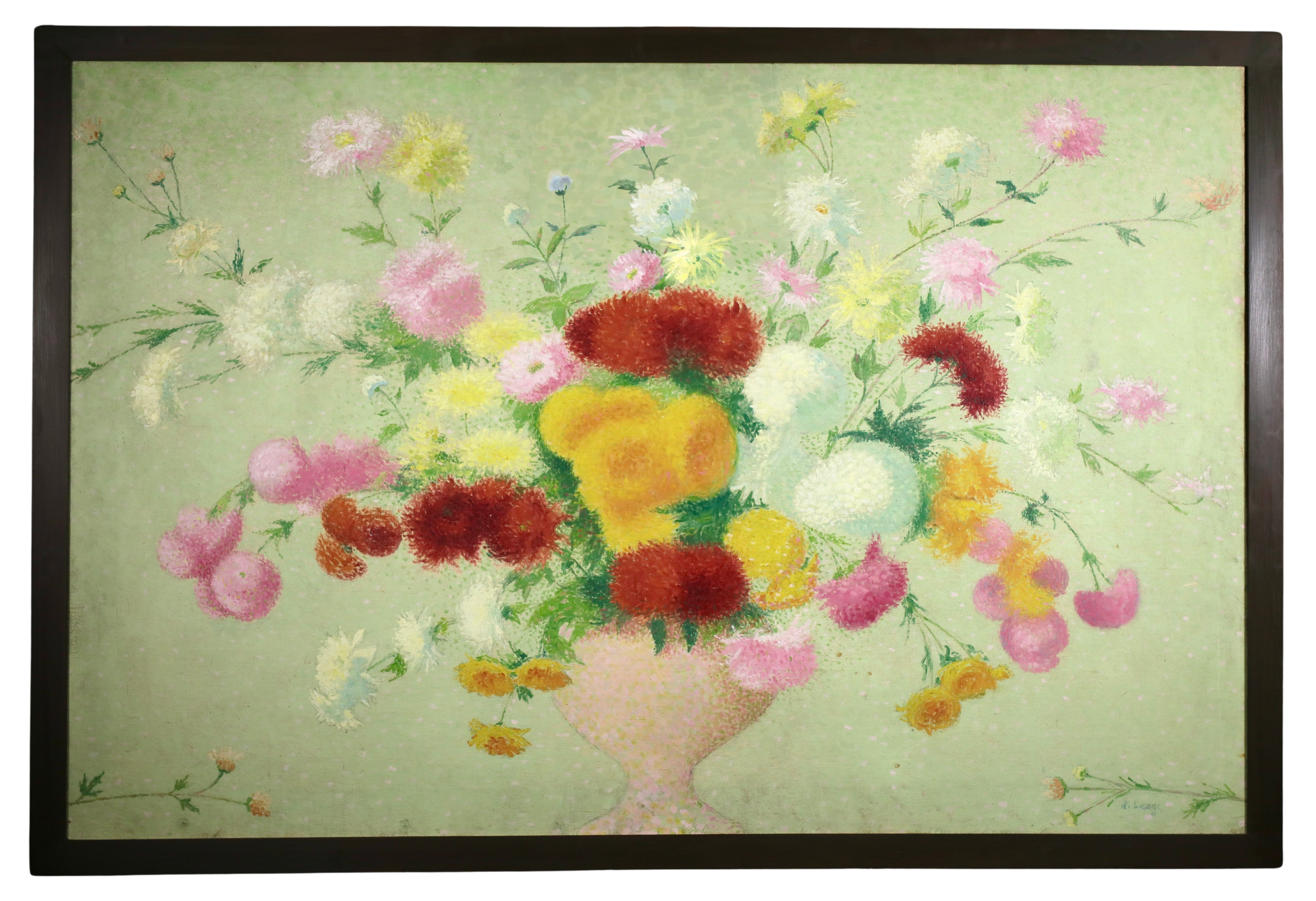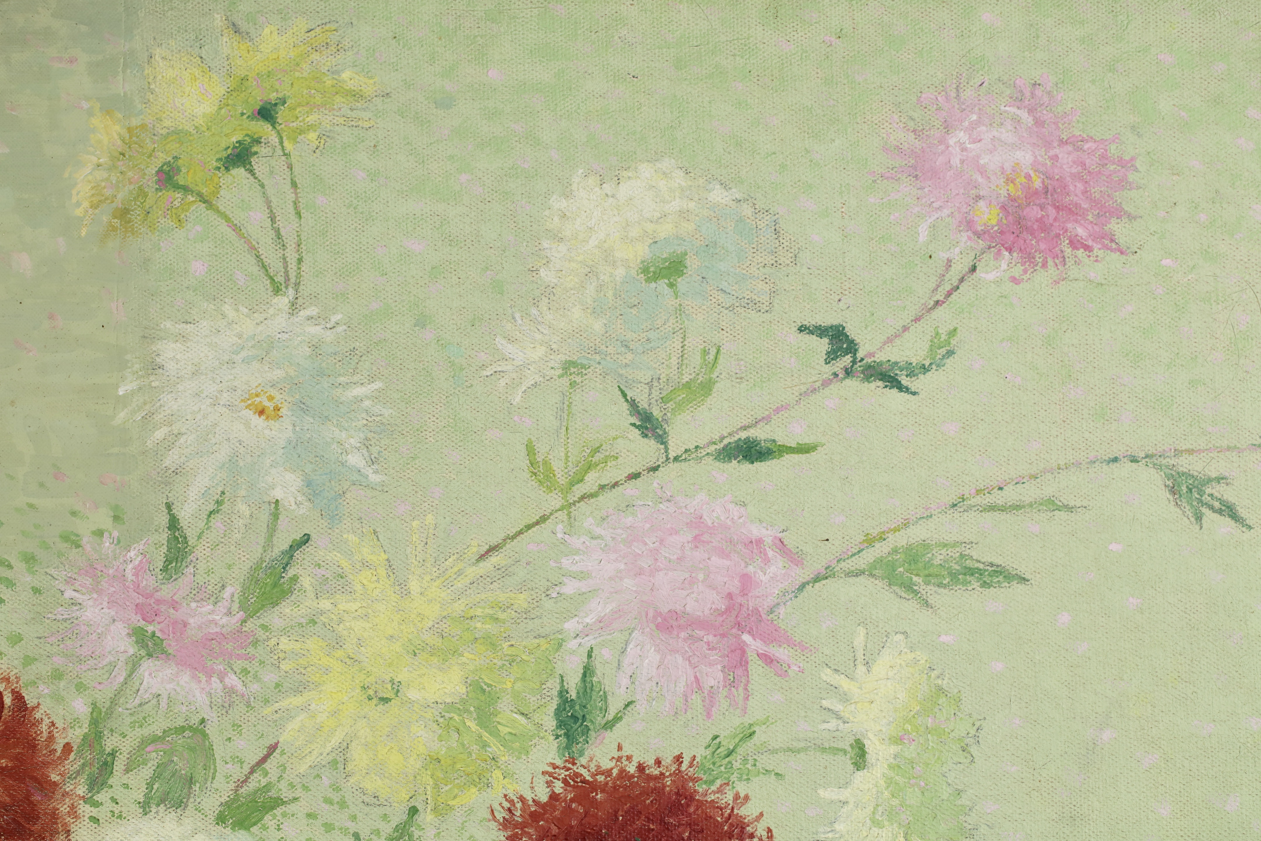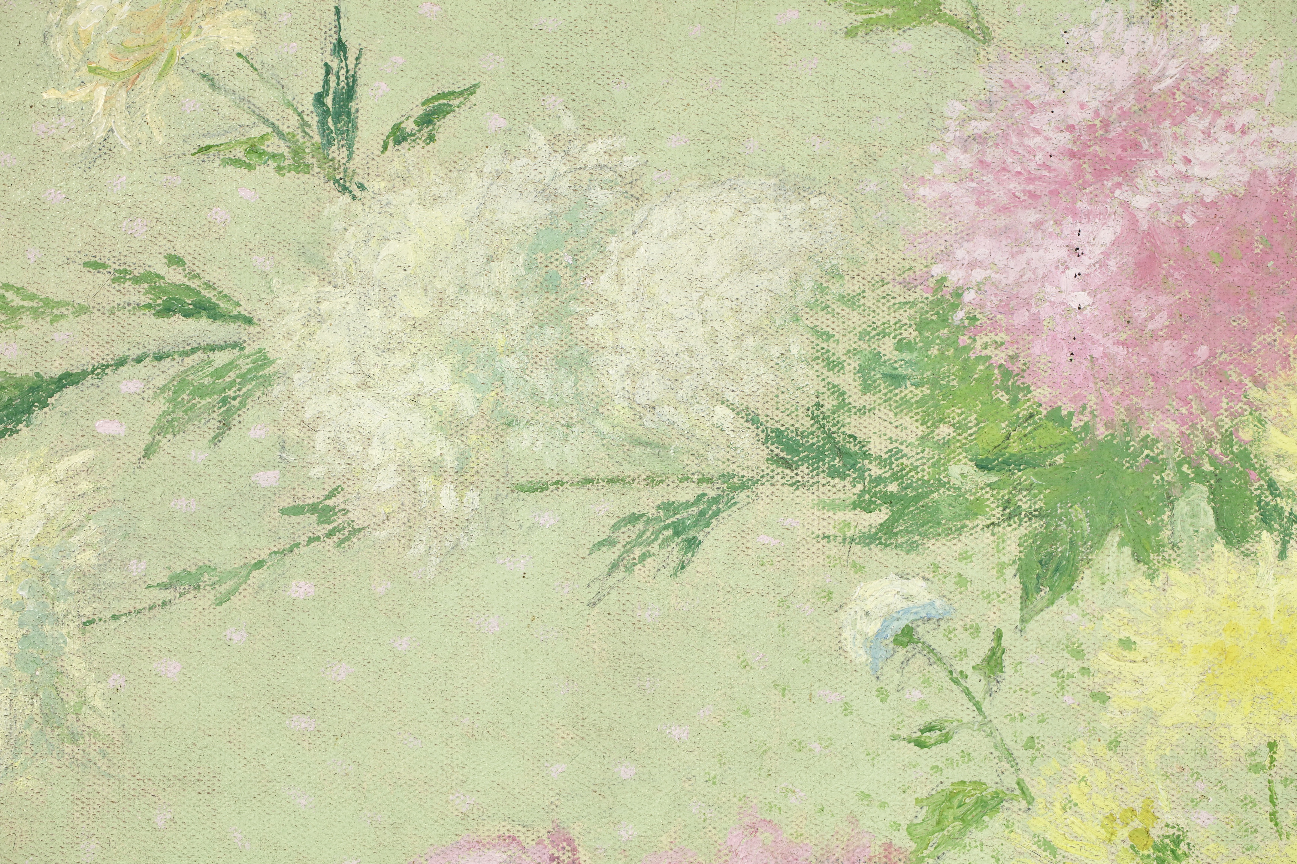 This work was originally commissioned for the Gailhadet estate by Mr. Castel the local elected member of the Assemblée National of France. This partially unrealized decoration was to include works of fields and flowers. The motif of the bouquet with dahlias would recur several times in the work of Achille Laugé. Its first appearance is found in an oil on canvas from 1916 preserved at the Museum of Art and History of Narbonne. The same year, the artist delivered to the Manufacture des Gobelins his models for a tapestry project commissioned by the State on the theme "The Seasons". We find there in Laugé's model and then in the tapestry executed by the Manufacture des Gobelins this motif of dahlias in a vase. Dahlias, with the multiplicity of their petals, allow Laugé to fully express his talent for color modulations and the Divisionist touch.