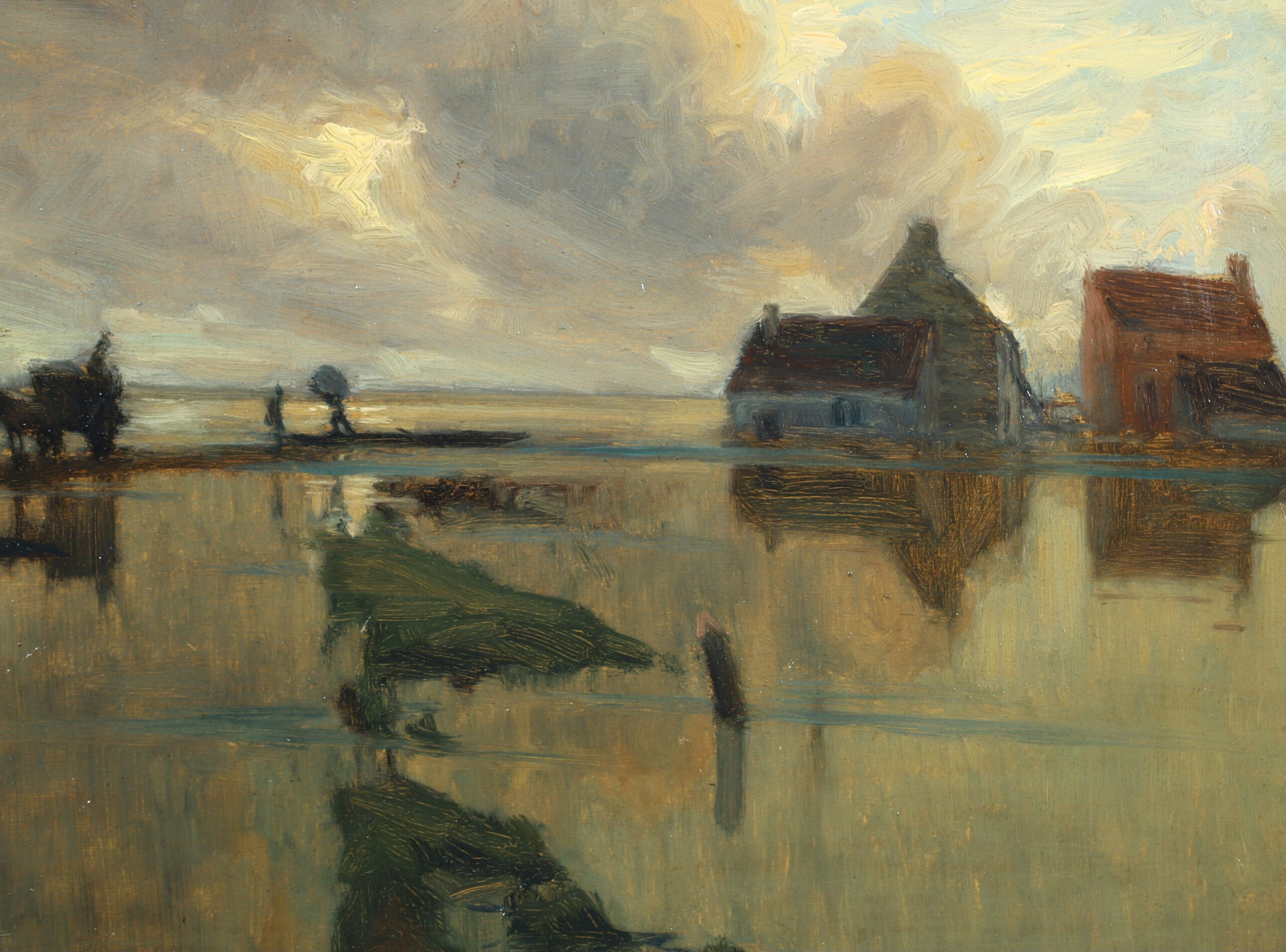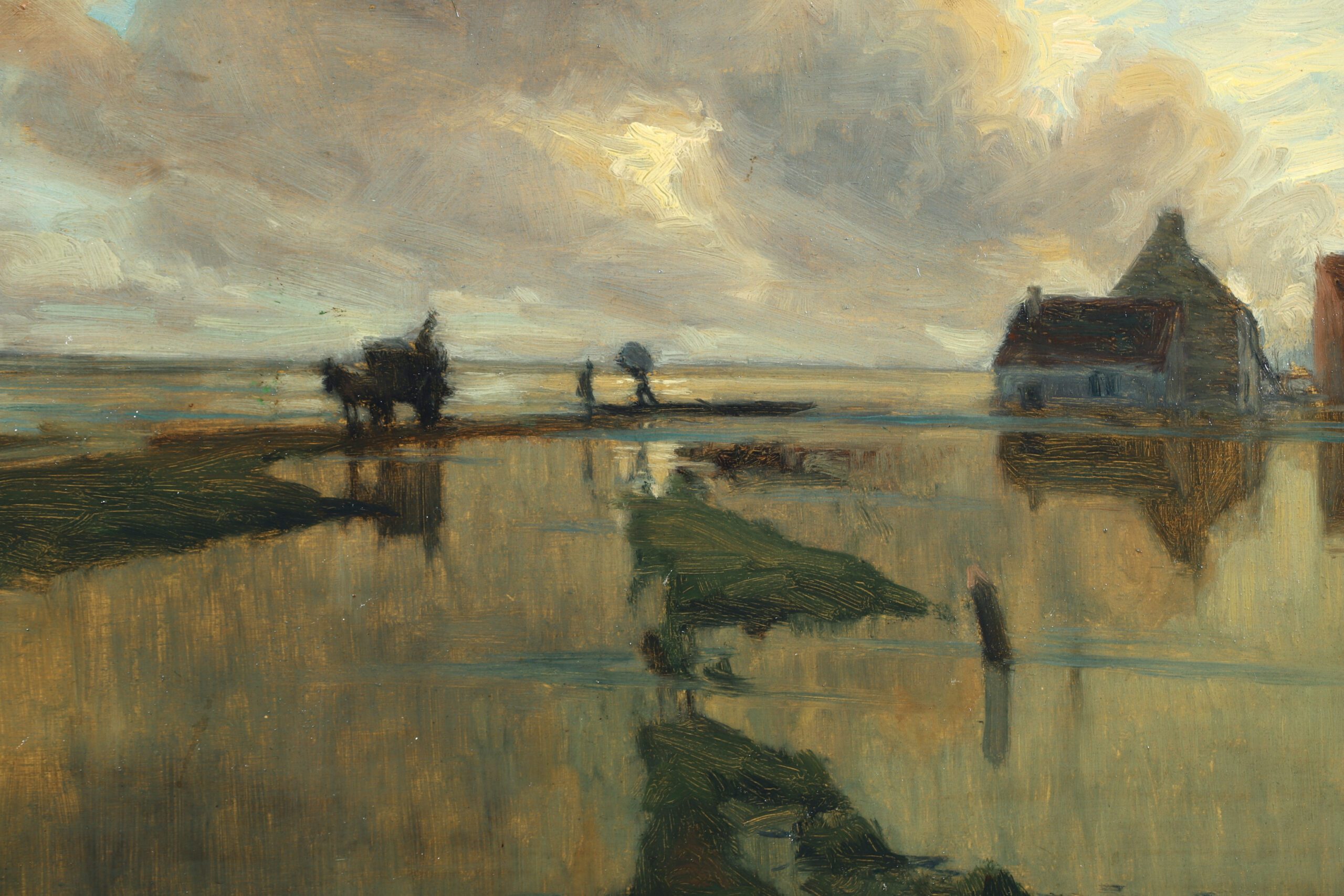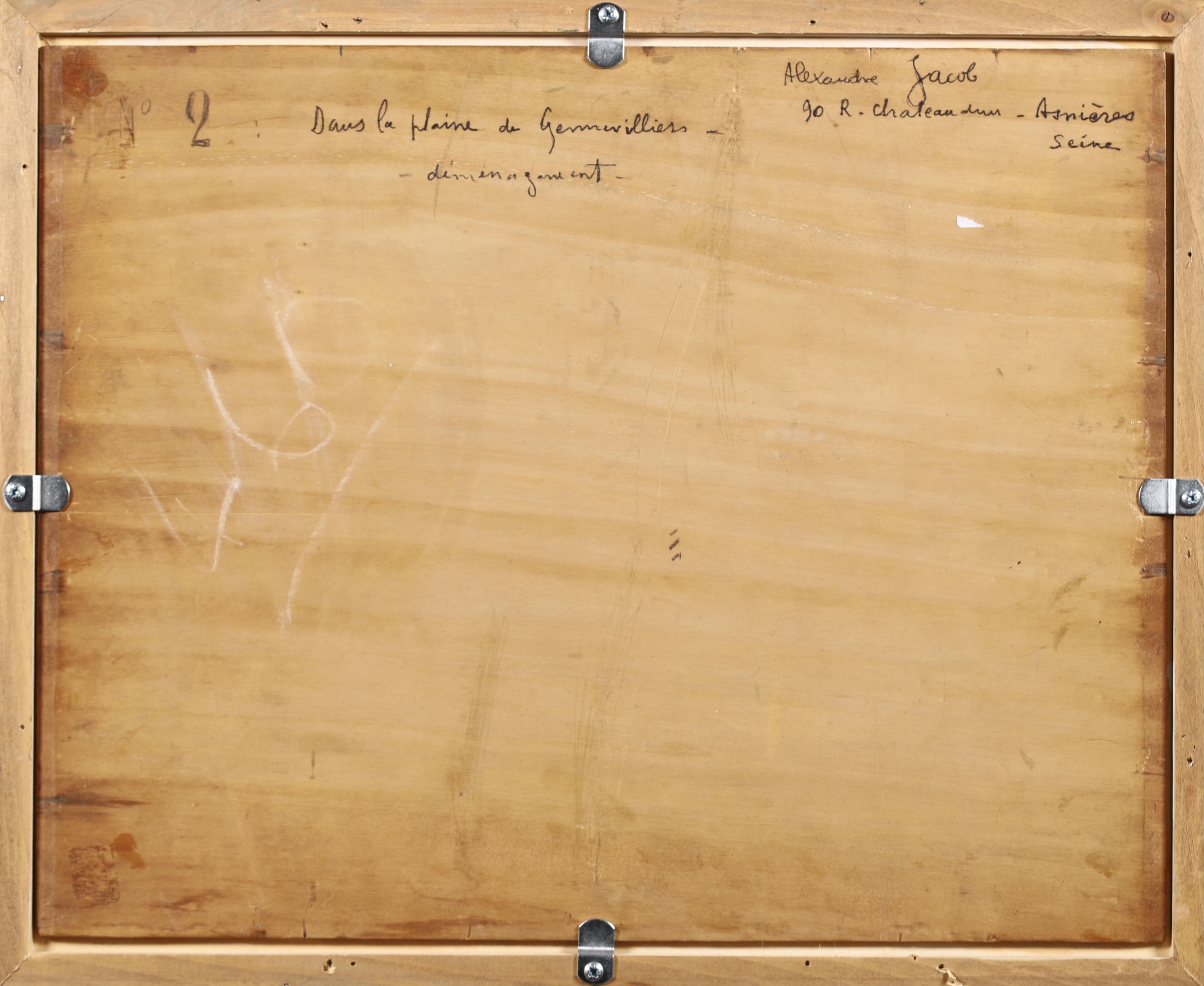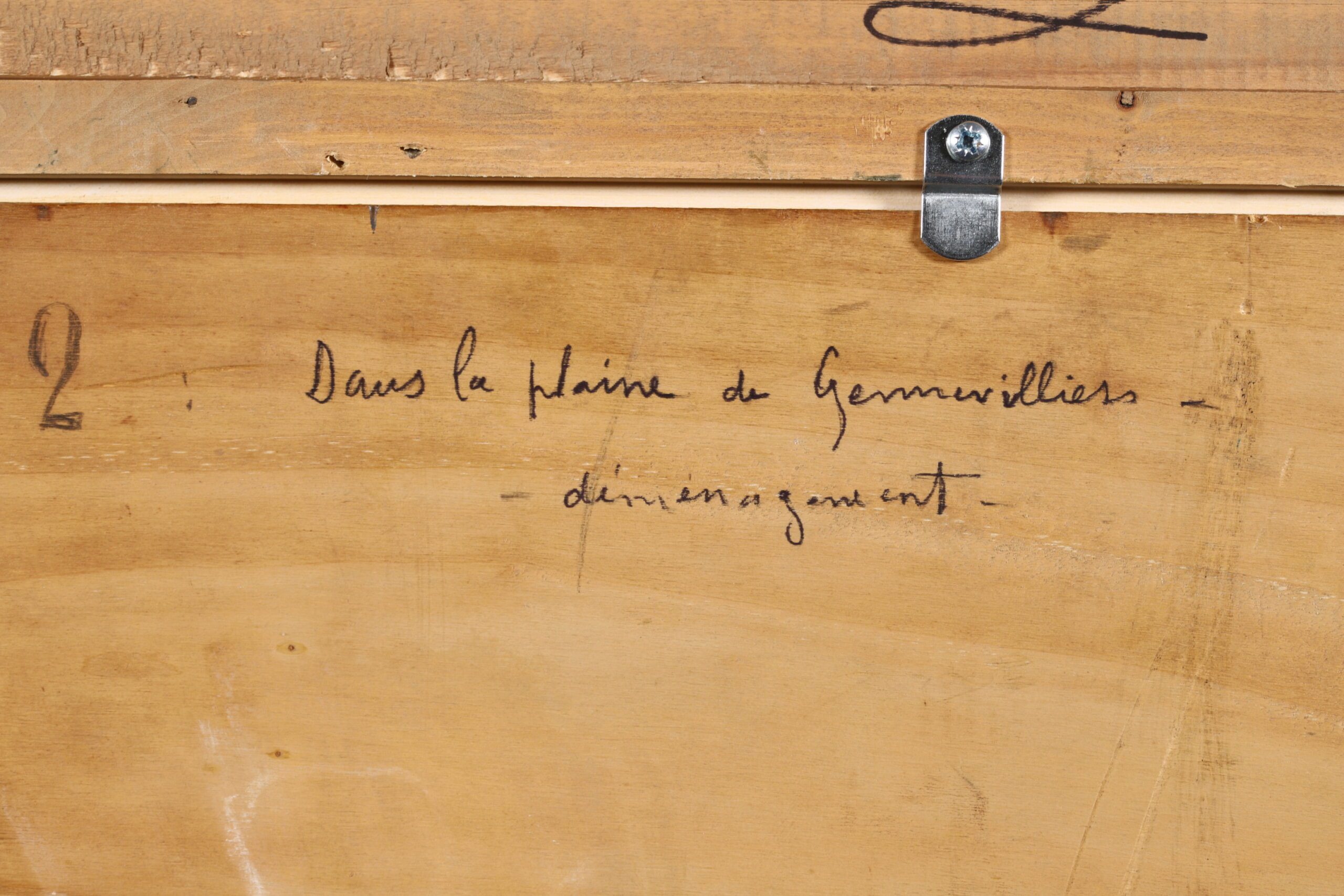 Literature: This very interesting work is titled verso with the added word "demenagement" - meaning to move house. The work pictures figures and a horse and cart heading away from flooded buildings in the plain at Gennevilliers on the Seine in the north of Paris. Due to its very flat nature the plain was susceptible to flooding.