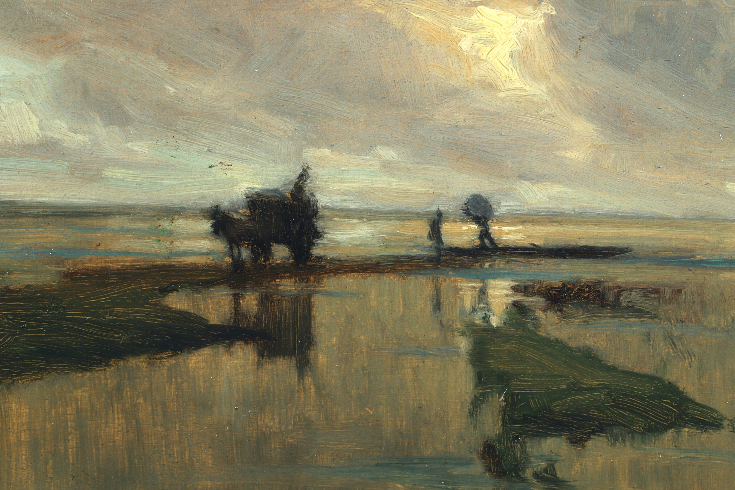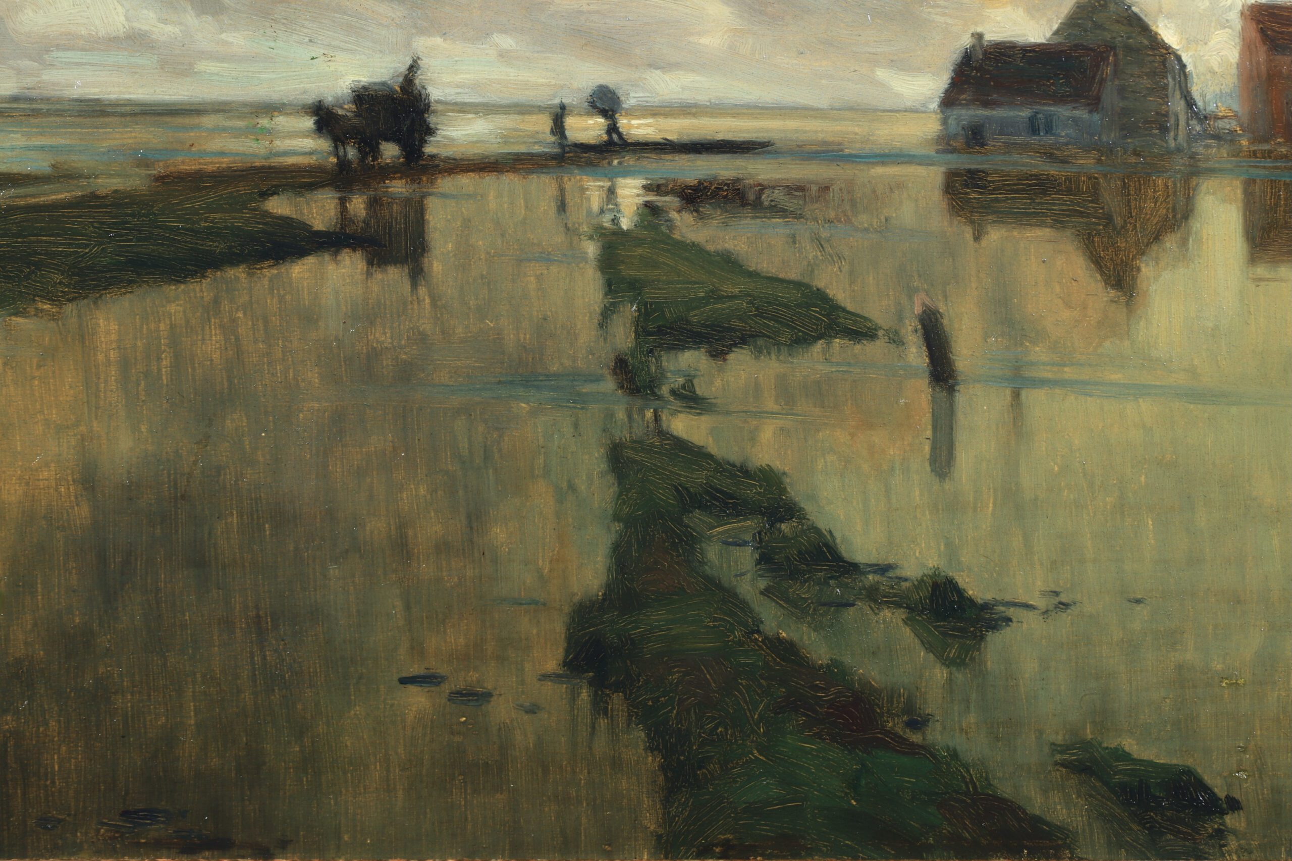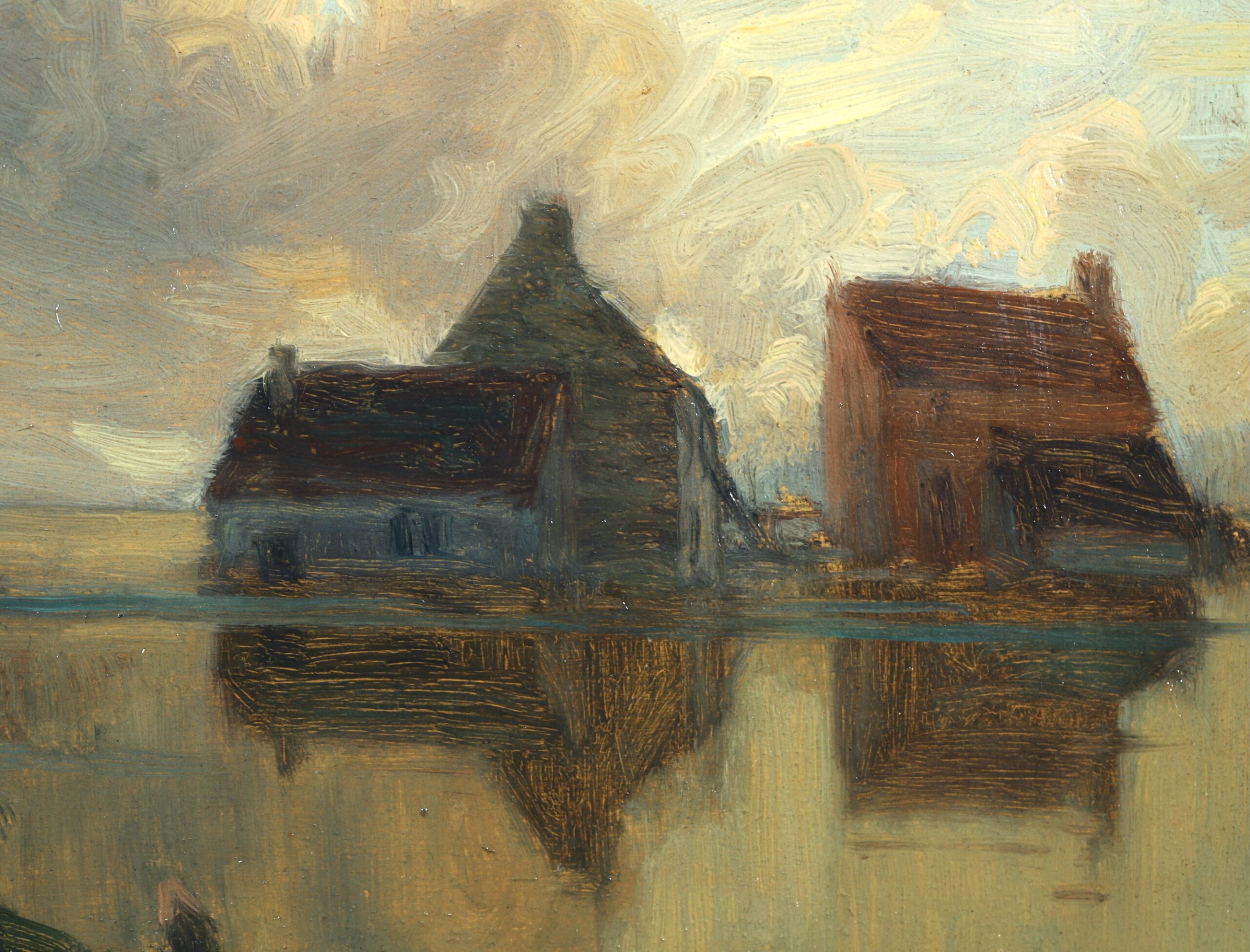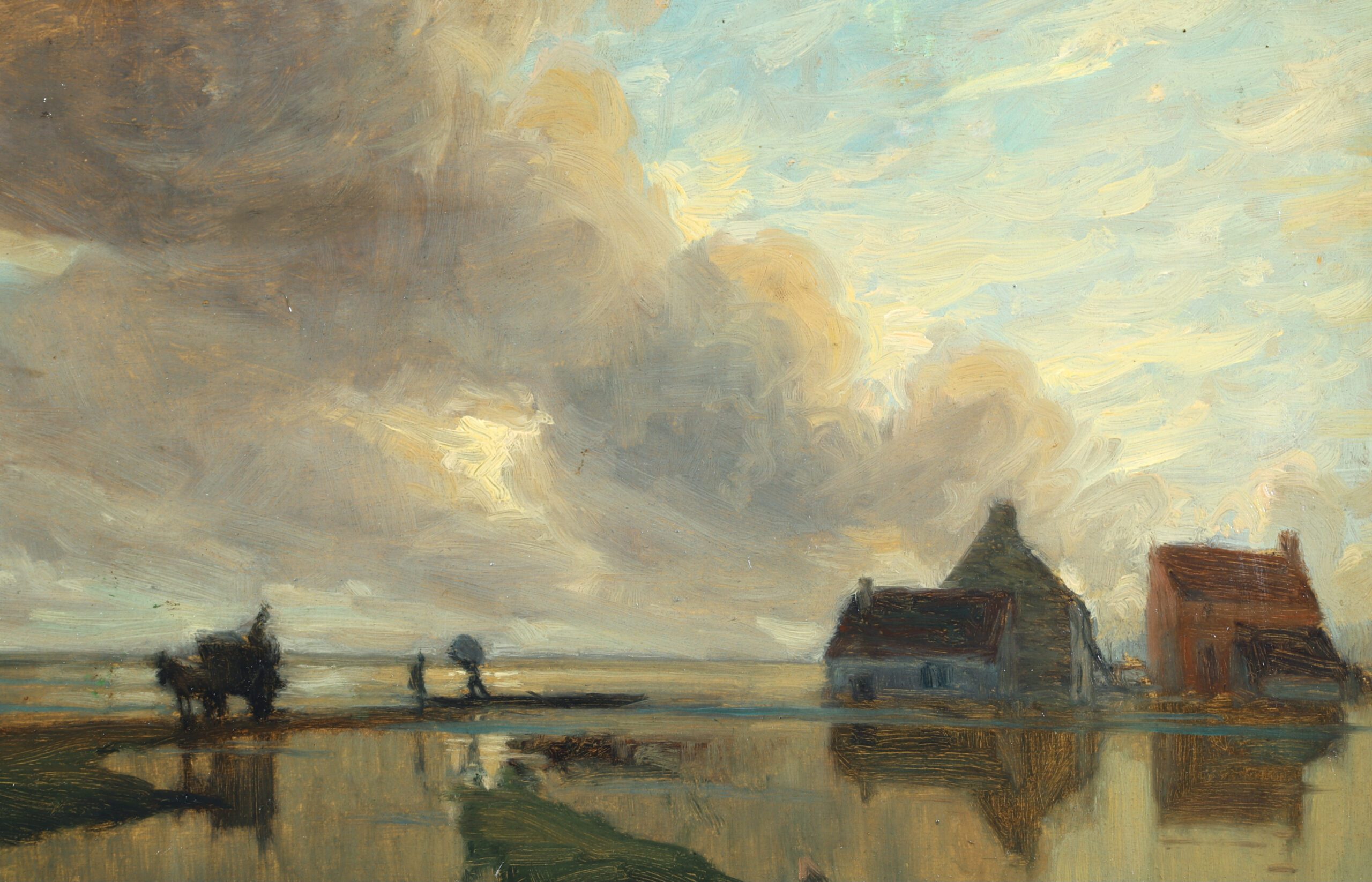 Literature: This very interesting work is titled verso with the added word "demenagement" - meaning to move house. The work pictures figures and a horse and cart heading away from flooded buildings in the plain at Gennevilliers on the Seine in the north of Paris. Due to its very flat nature the plain was susceptible to flooding.
