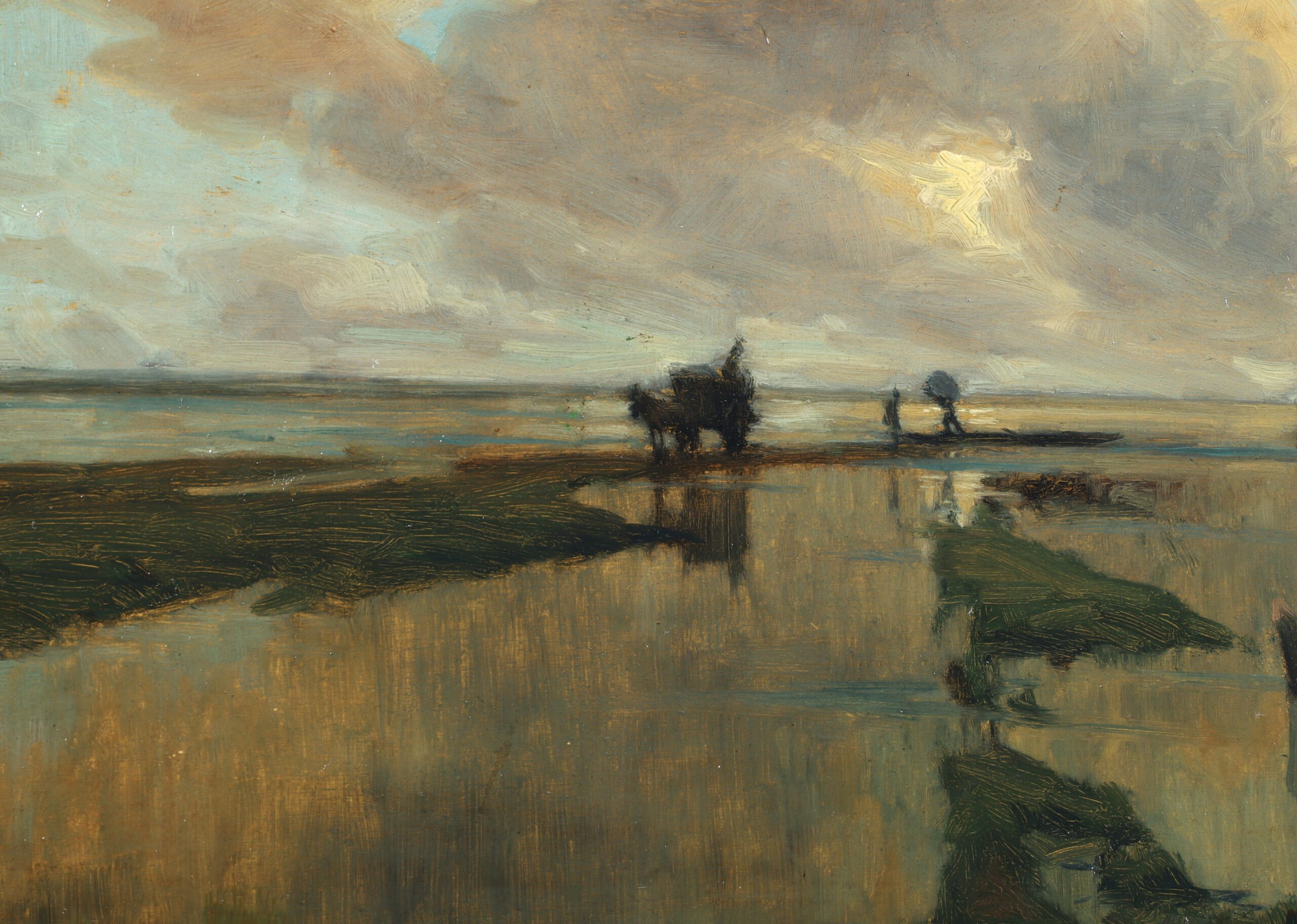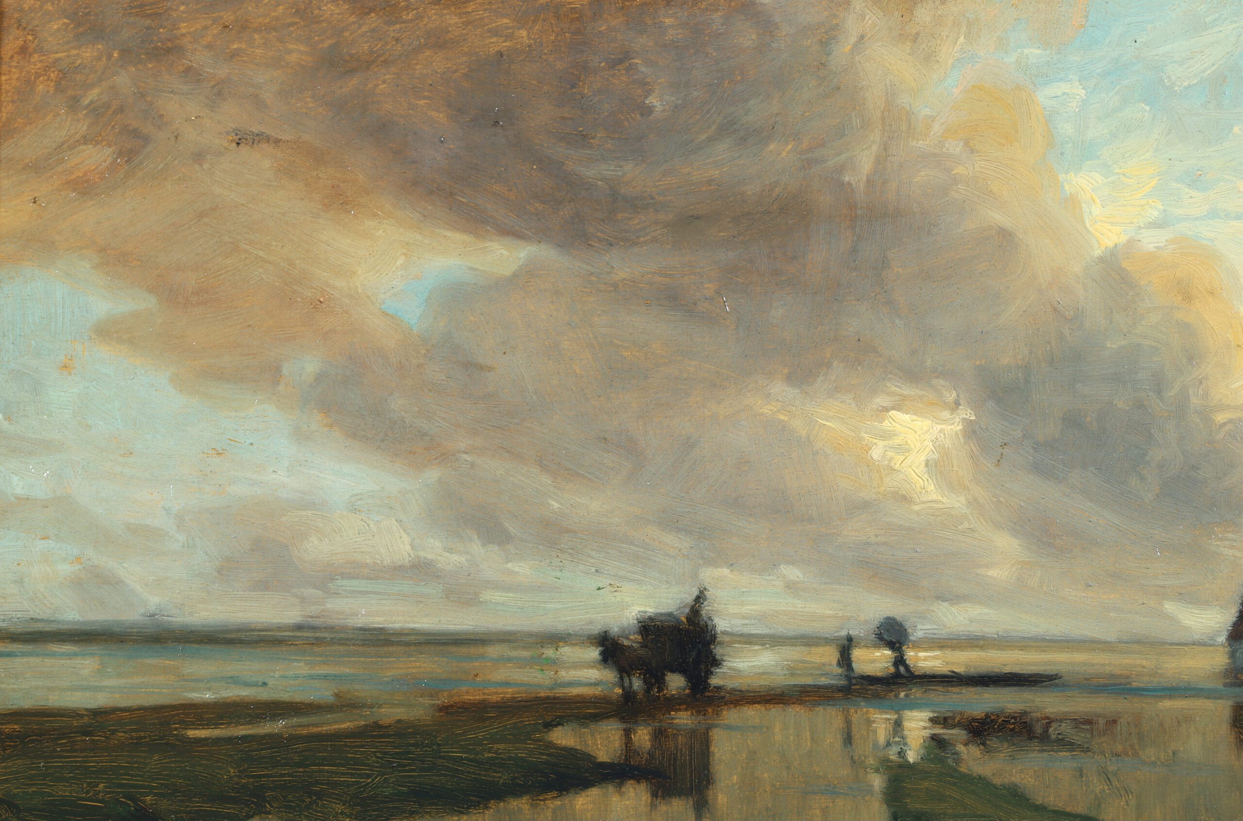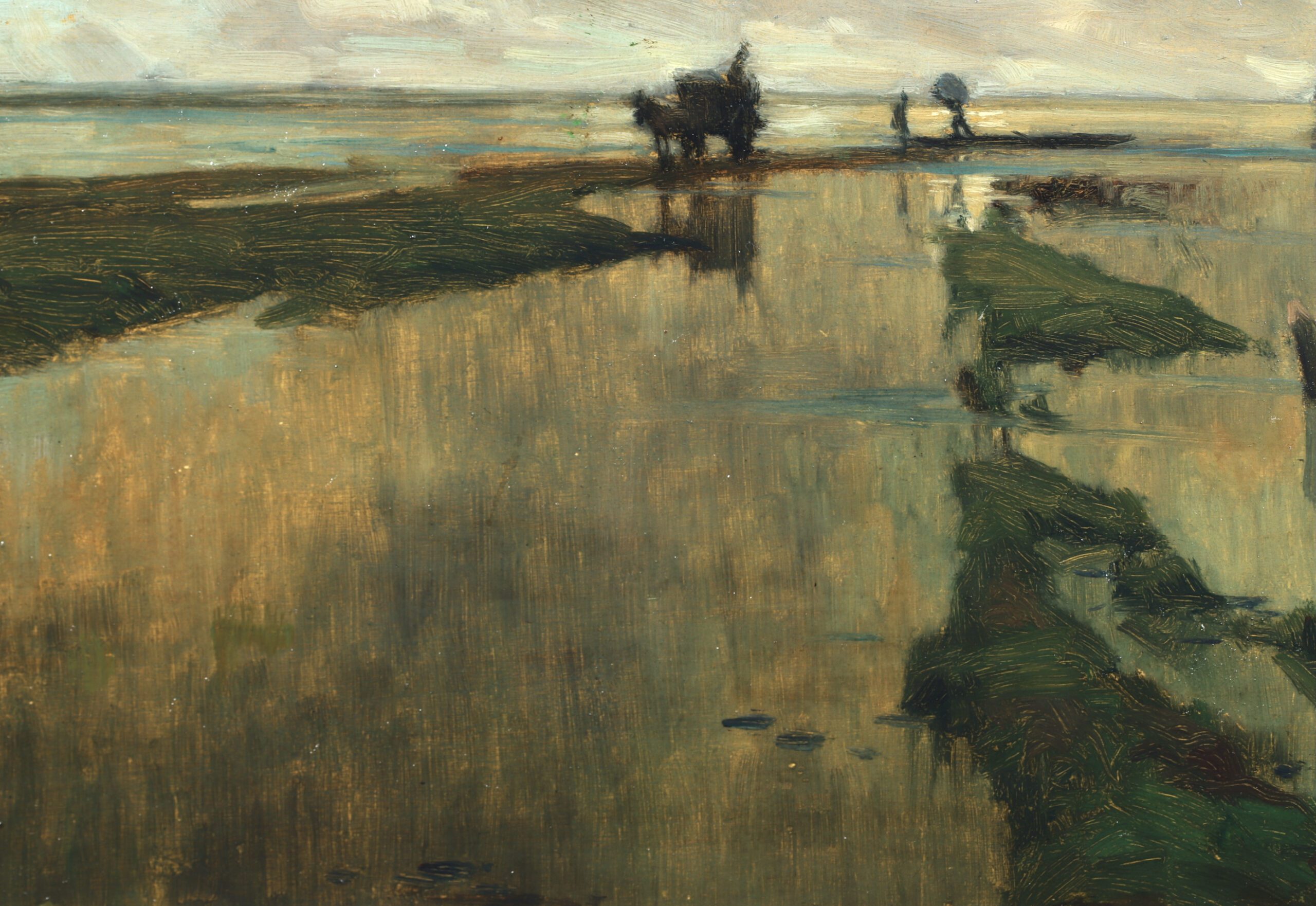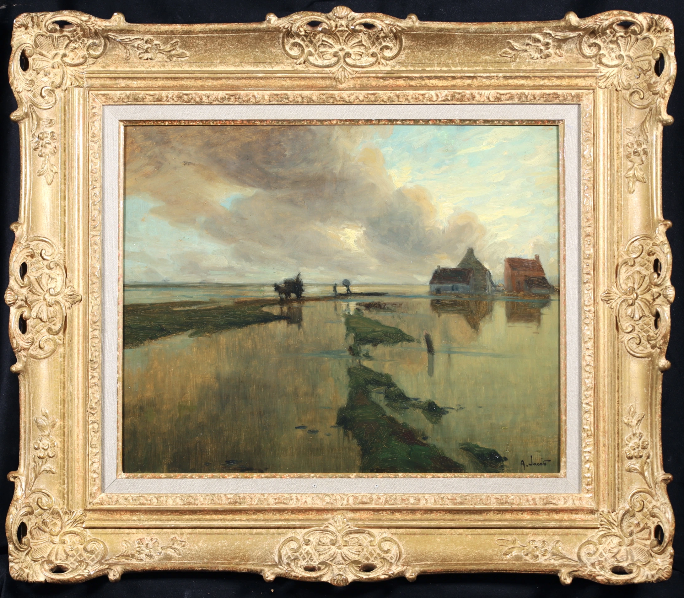 Literature: This very interesting work is titled verso with the added word "demenagement" - meaning to move house. The work pictures figures and a horse and cart heading away from flooded buildings in the plain at Gennevilliers on the Seine in the north of Paris. Due to its very flat nature the plain was susceptible to flooding.