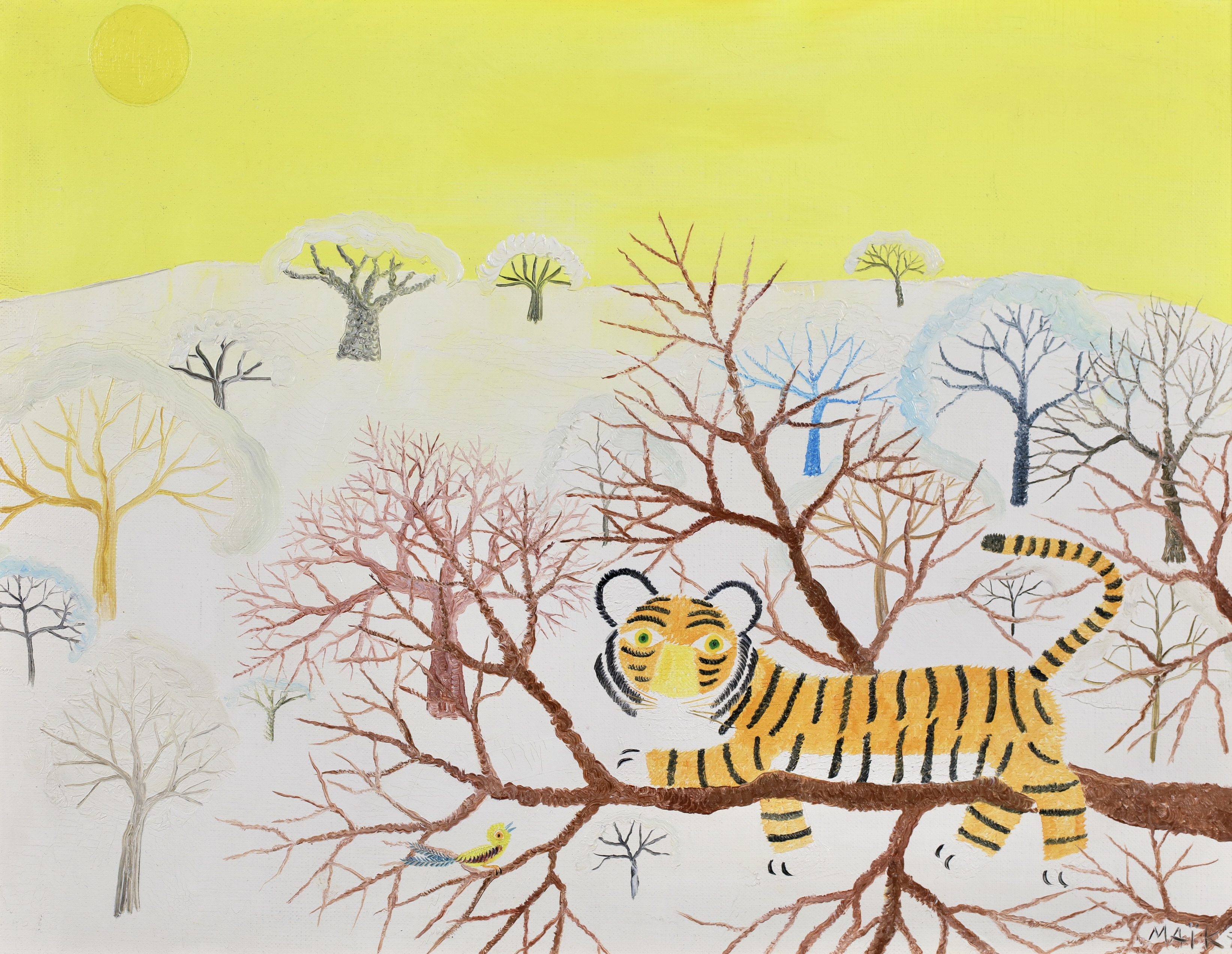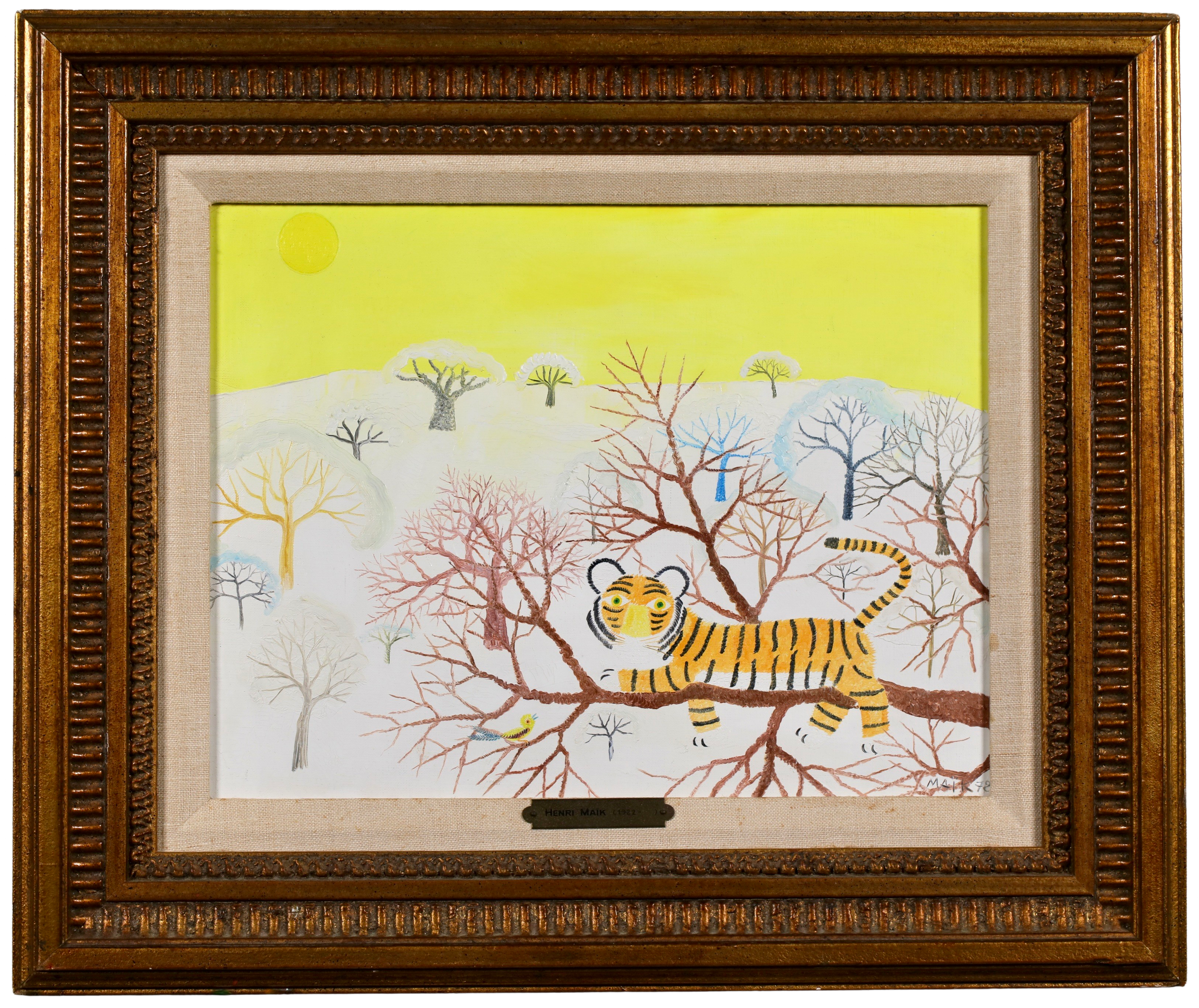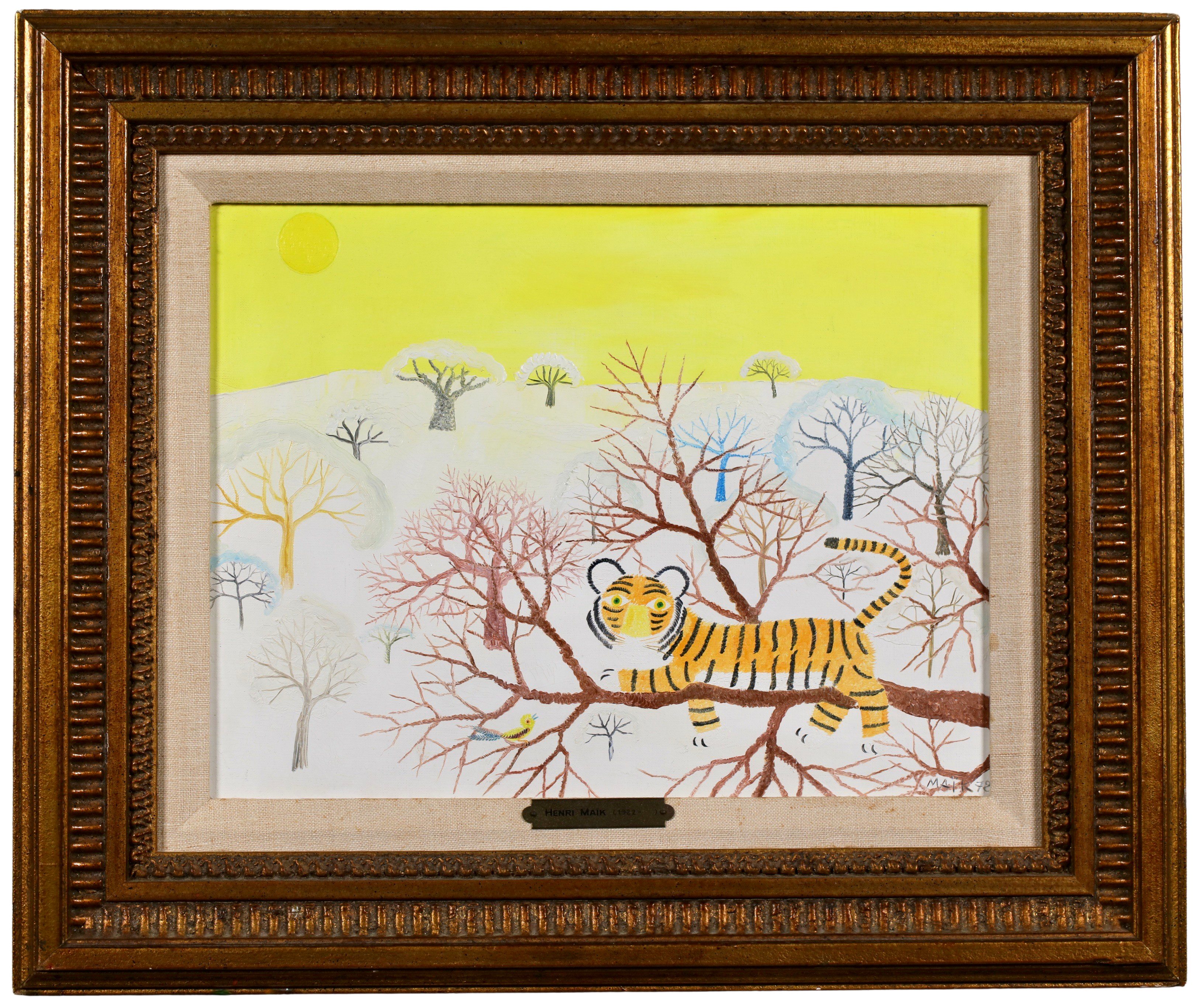 Henri Maik was born in Paris on March 27, 1922 the son of the illustrator and engraver, Joseph Hecht. Maik designates himself as a Primitive painter, not a naïf painter. In many ways, the paintings of Henri Maik are paradoxical, at once familiar and strange, childlike and sophisticated, quiet and vocal with color. They are dreamscapes; their terrain lush with fields of simple flowers, exotic trees, rare birds and the beasts of the jungle. In a Maik painting, you enter a community of creatures, at rest and at play, dwelling in perfect harmony, who seem to look out at us, as if to suggest we might do as they are doing.
