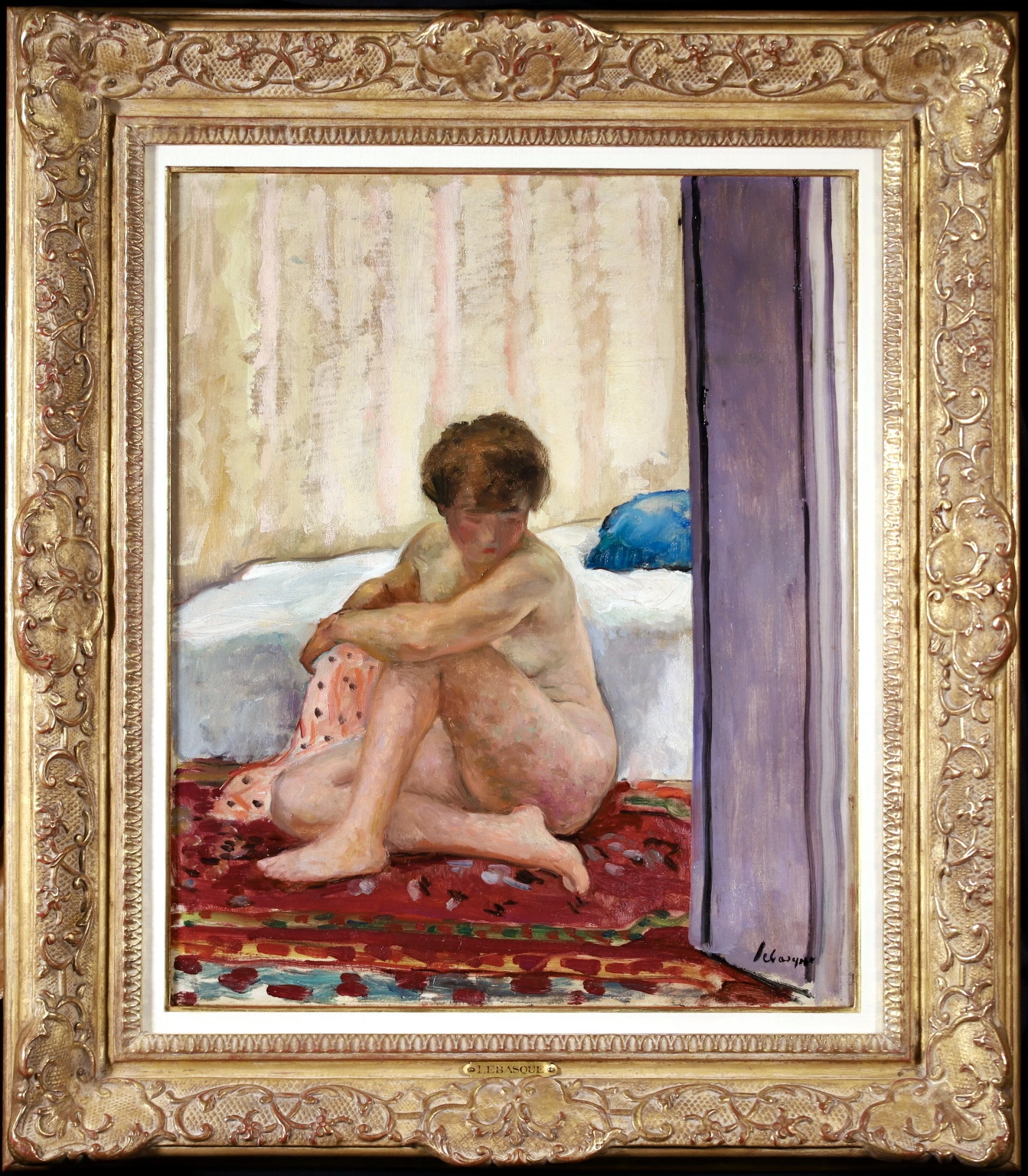 He painted members of his family in the settings in which he lived, mostly in Provence. His work shares some themes of his friend Bonnard. But although he exhibited with the Fauves, and admired Matisse, Rouault, Dufy, Valtat and Manguin (who introduced him to the Midi), he remained distinct from them in style. Lebasque was well known in his lifetime. He collaborated on the decorations of the Théâtre des Champs-Élysées and of the Atlantic liner Paris. He is remembered for: Nymphs at their Bath; The Sunshade; Girl with Hydrangeas; Great Nude on a Pink Sofa.