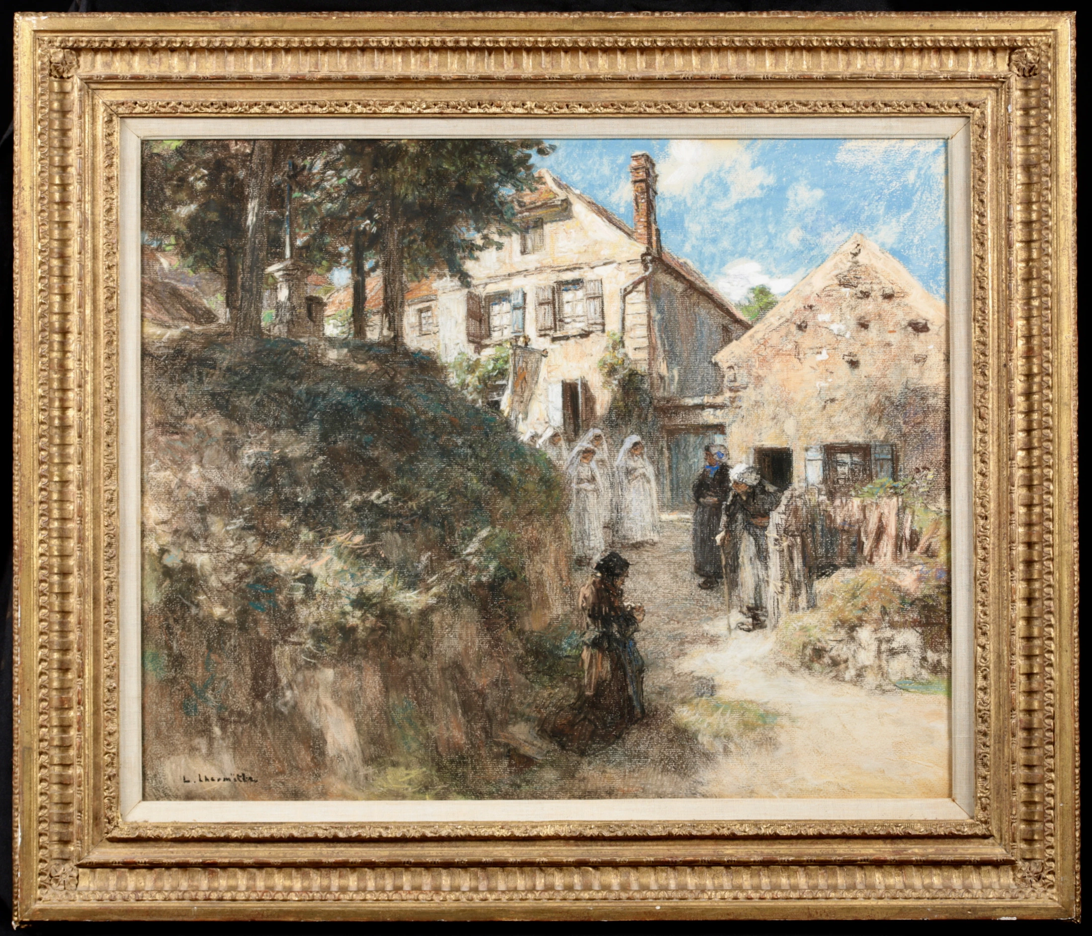 Lhermitte initially produced charcoal drawings which revealed his deep feeling for nature. His first attempt, Banks of the Marne near Alfort, caused a sensation. Following this he executed canvases, showing himself to be a fine landscape artist and a skilful draughtsman. He painted scenes from rural life almost exclusively and benefited from exceptional interest generated by the prizes awarded to the works of J. F. Millet. But although he was very much affected by the work of the painter of Angelus, he himself sought only the pictorial element and not a synthetic translation. Many other French masters of the period share his completely objective vision, for example Bastien Lepage, Roll, J. C. Cazin and Rafaelli. Like them, he put into practice very early on the technique of 'clear painting' made fashionable by the pursuit of Impressionism. But this group of artists borrowed from this method only those elements which appealed to public taste, and ignored chromatic elements. Lhermitte also paid the price for the easy success of those early days. His peasants, which found general favour with the public at the time, nowadays seem rather feeble alongside Camille Pissarro's renderings of the same subject.