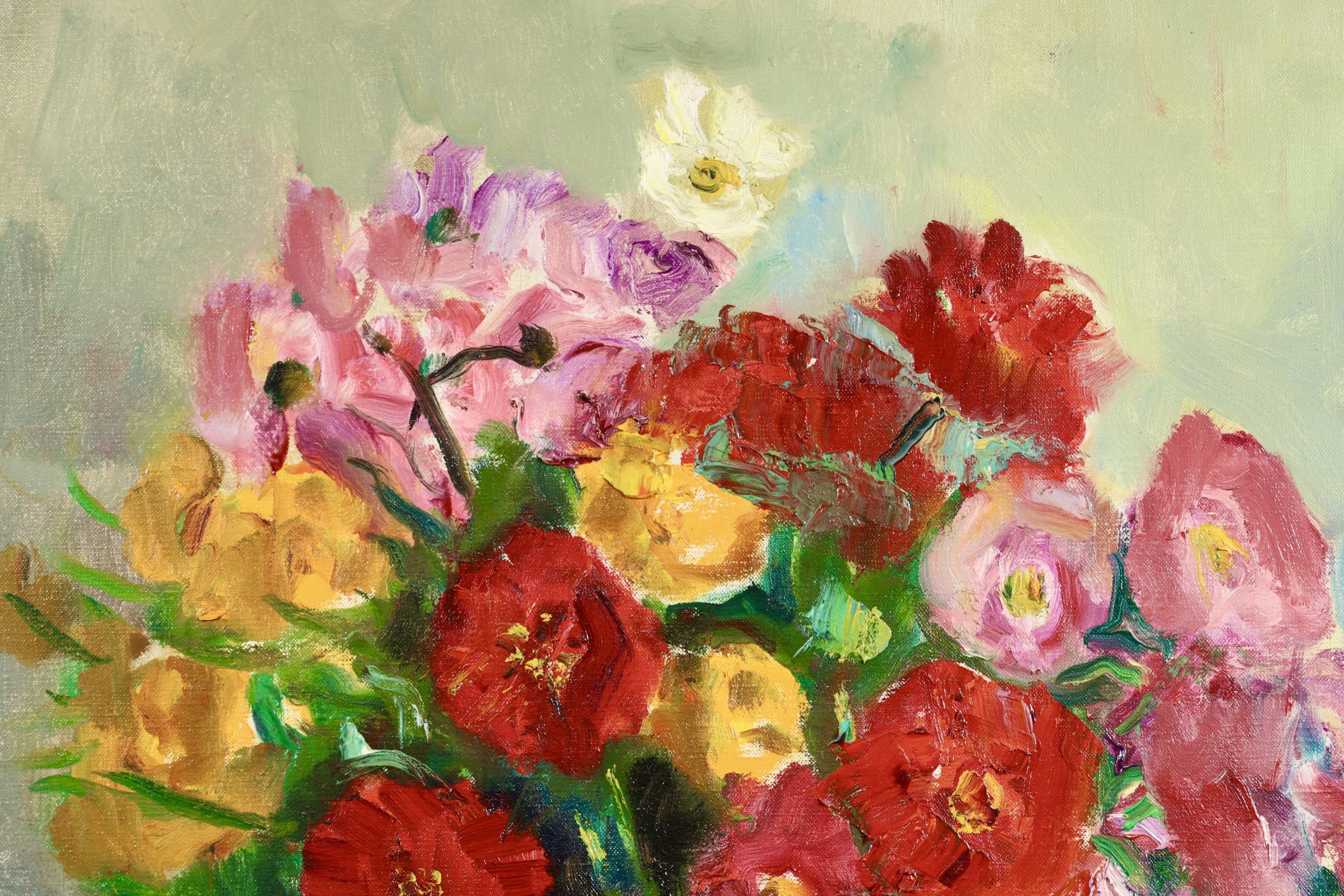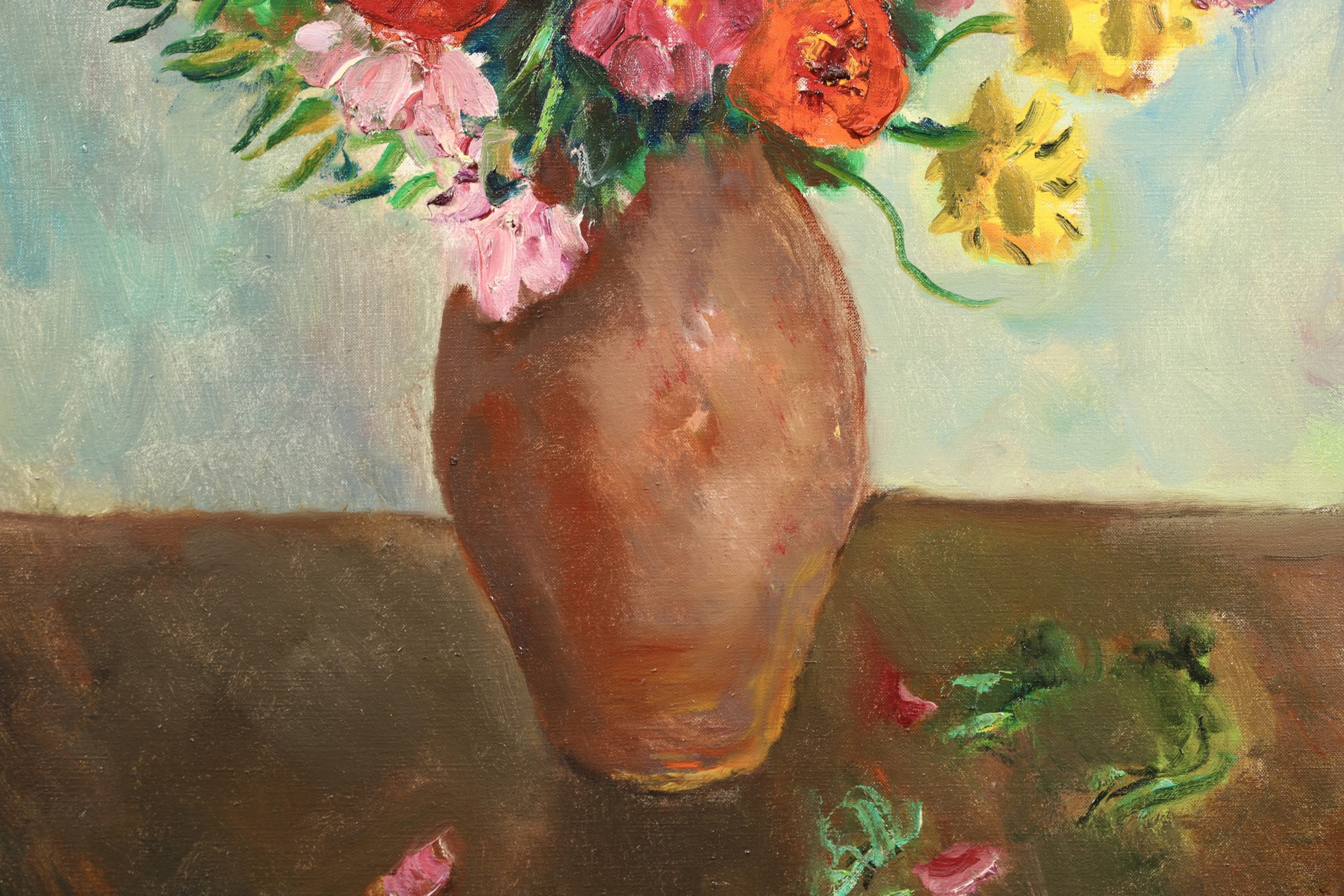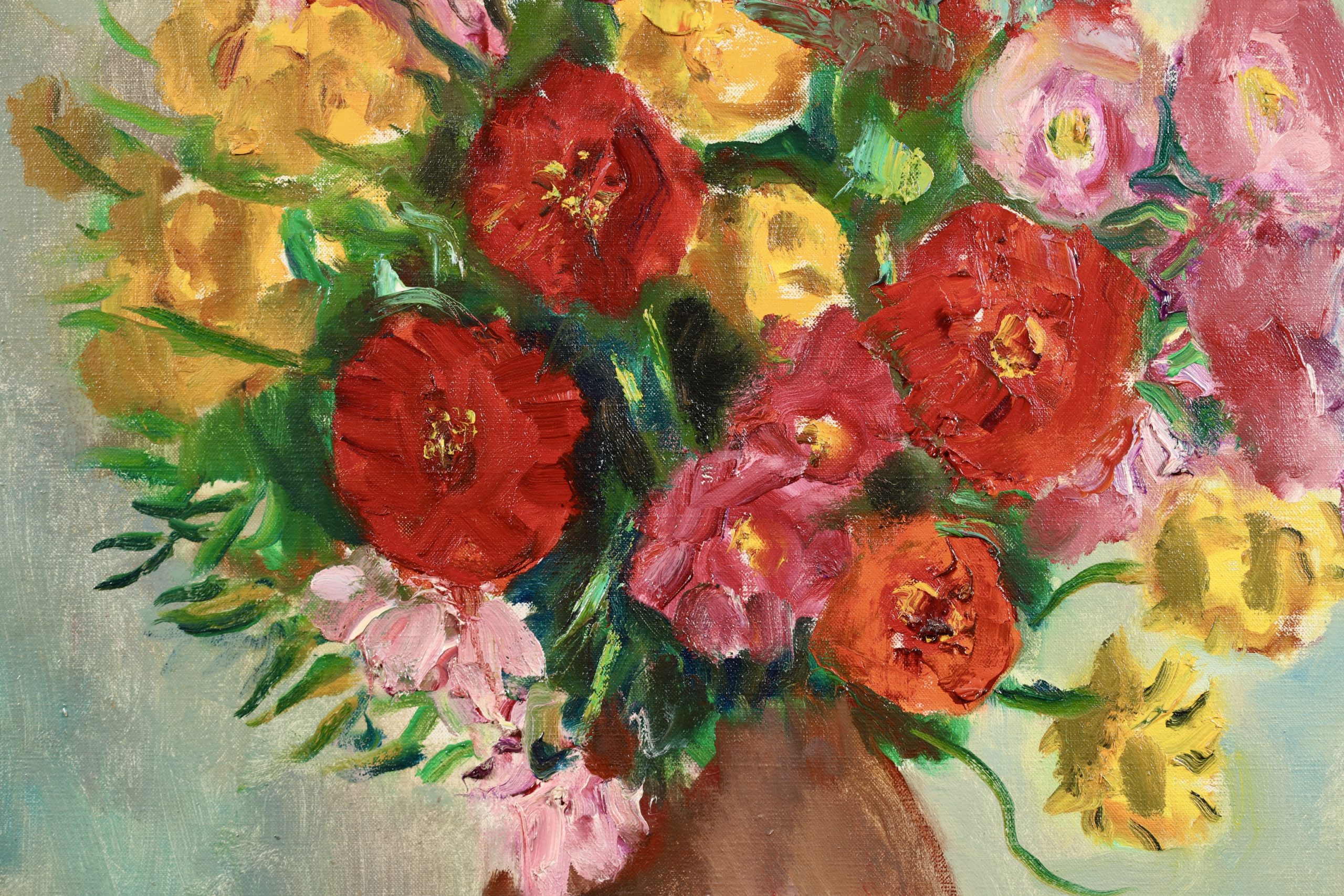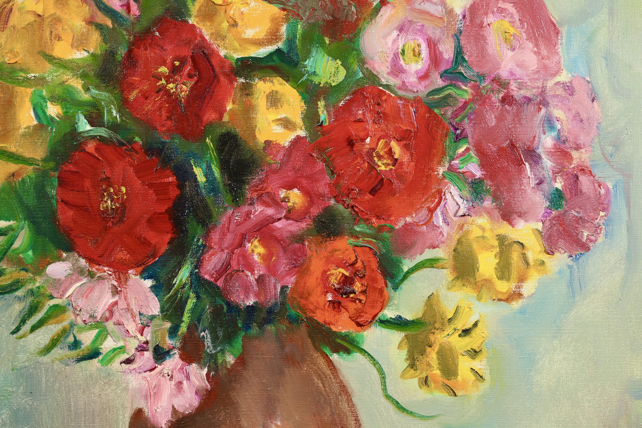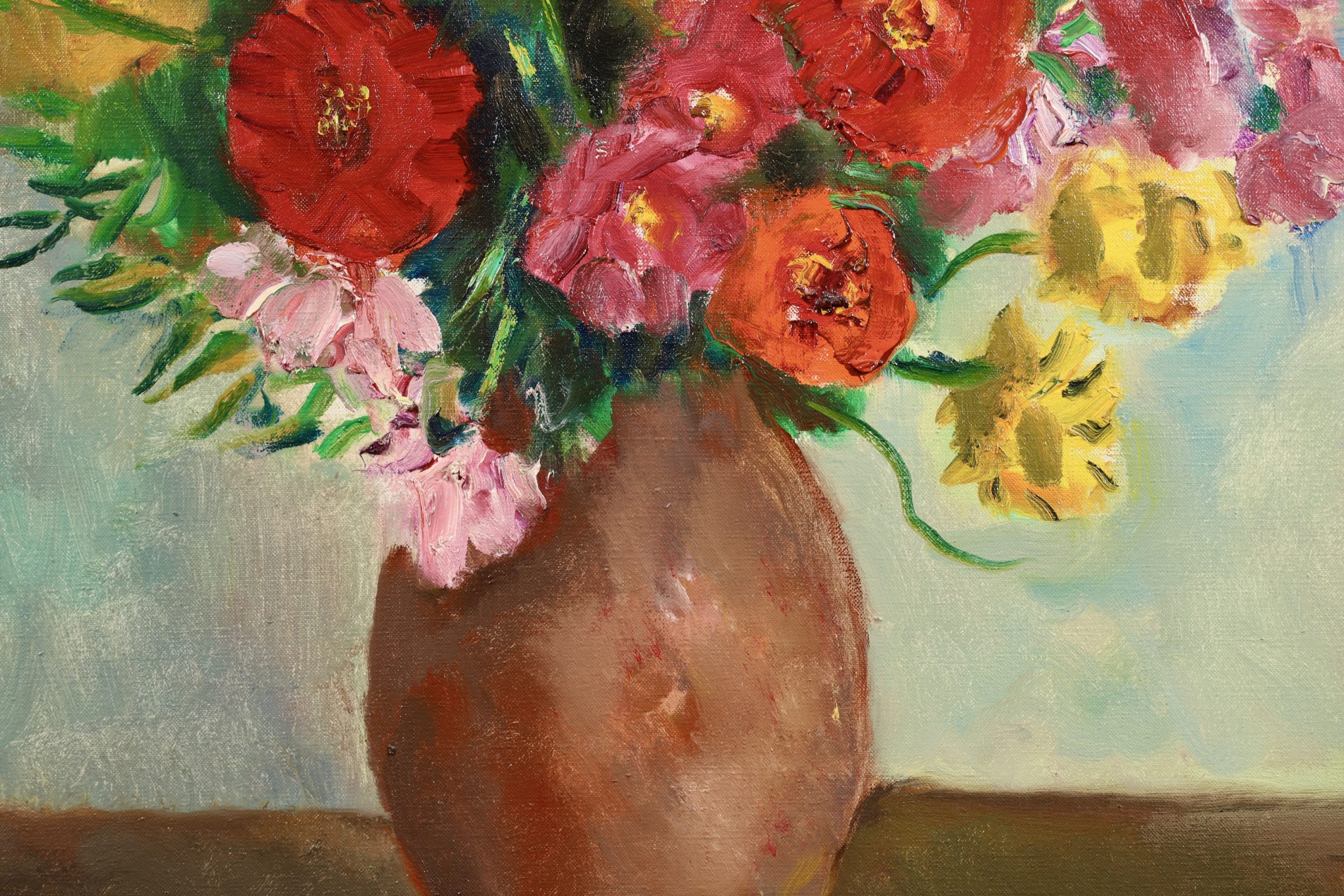 After visiting Renoir in 1918, Camoin became increasingly obsessed with light and the interplay of colours. As a result, he painted both in the studio and outdoors, directly from nature. His notebooks and journals document the difficulty he experienced in achieving a balance between the two, between as it were 'sensation' and 'construction'. In the event, he painted upwards of a hundred views of St-Tropez harbour as seen from his studio window, together with landscapes of the Var region he discovered while out walking. Camoin's productive life extended over half a century, from 1898 to 1964, but he painted little in the early years and his output while at the front during World War I consisted mainly of pastels and watercolours; equally, his output during World War II was also limited, due in part to the difficulty in obtaining materials. Nevertheless, outside those periods in his life, Camoin turned out by his own estimation some 50 canvases a year, which amounts to around 3,000 in total (of which roughly one-third were destroyed during his bout of depression). Nearly 700 of his paintings are housed in public and private collections. His output as an engraver was limited to some 30 plates as illustrations for various works. Camoin's output over the lengthy second period of his life was more restrained than in his Fauvist years. His sun-drenched landscapes full of flowers and peopled with attractive women and happy families on vacation are very much in tune with the overall hedonistic atmosphere that prevailed between the two world wars and which was typified by the 'poetic reality' of artists such as Legueult, Brianchon and Cavaillès.