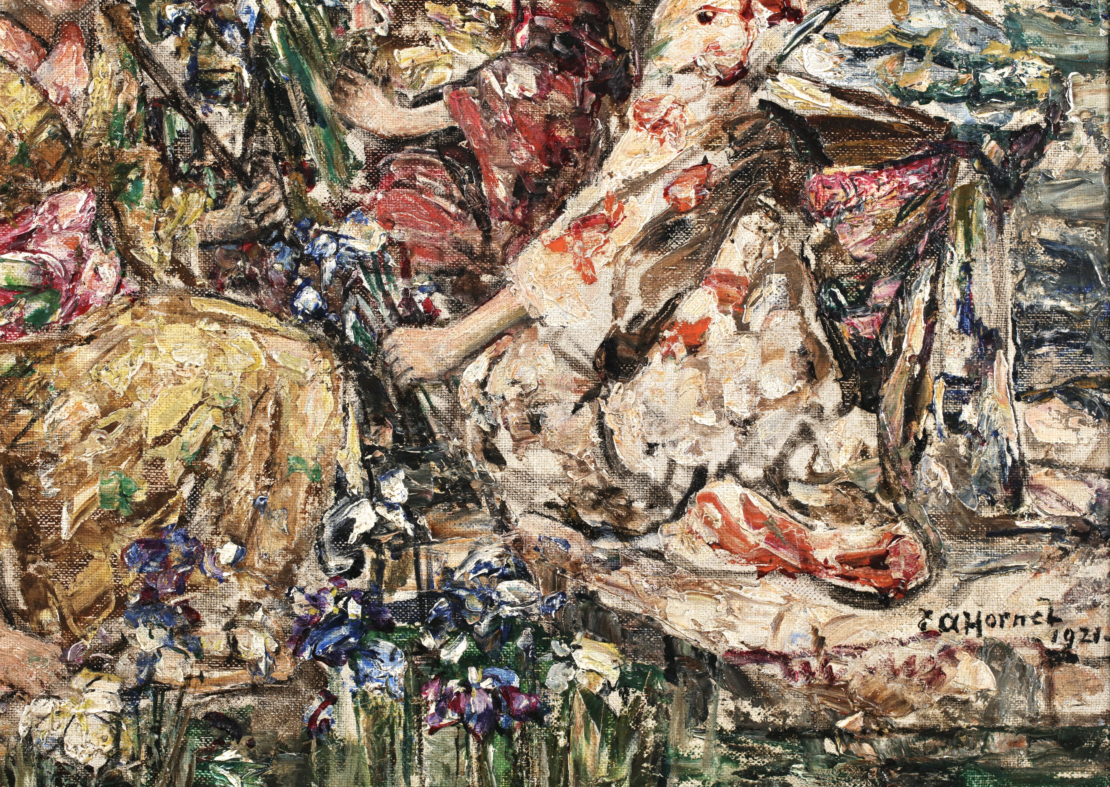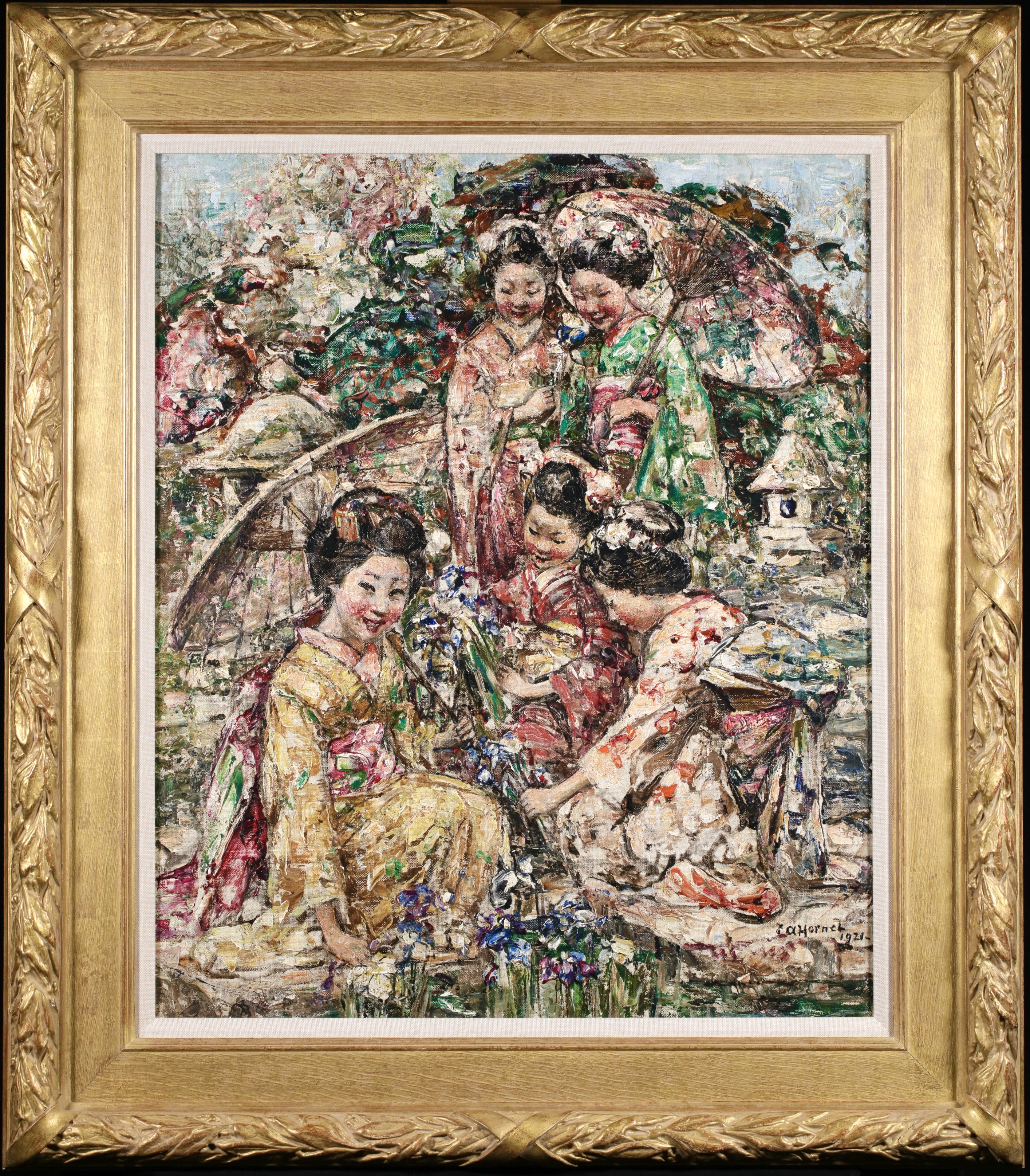 Edward Atkinson Hornel paintings are mainly of landscapes and flora, with children. His speciality was executing young girls in idyllic landscapes often surrounded by flora and fauna and occasionally with butterflies. His work is highly collected and he is considered as one of the most important "Glasgow Boys". Hornel's paintings are incredibly unique and identifiable from afar.