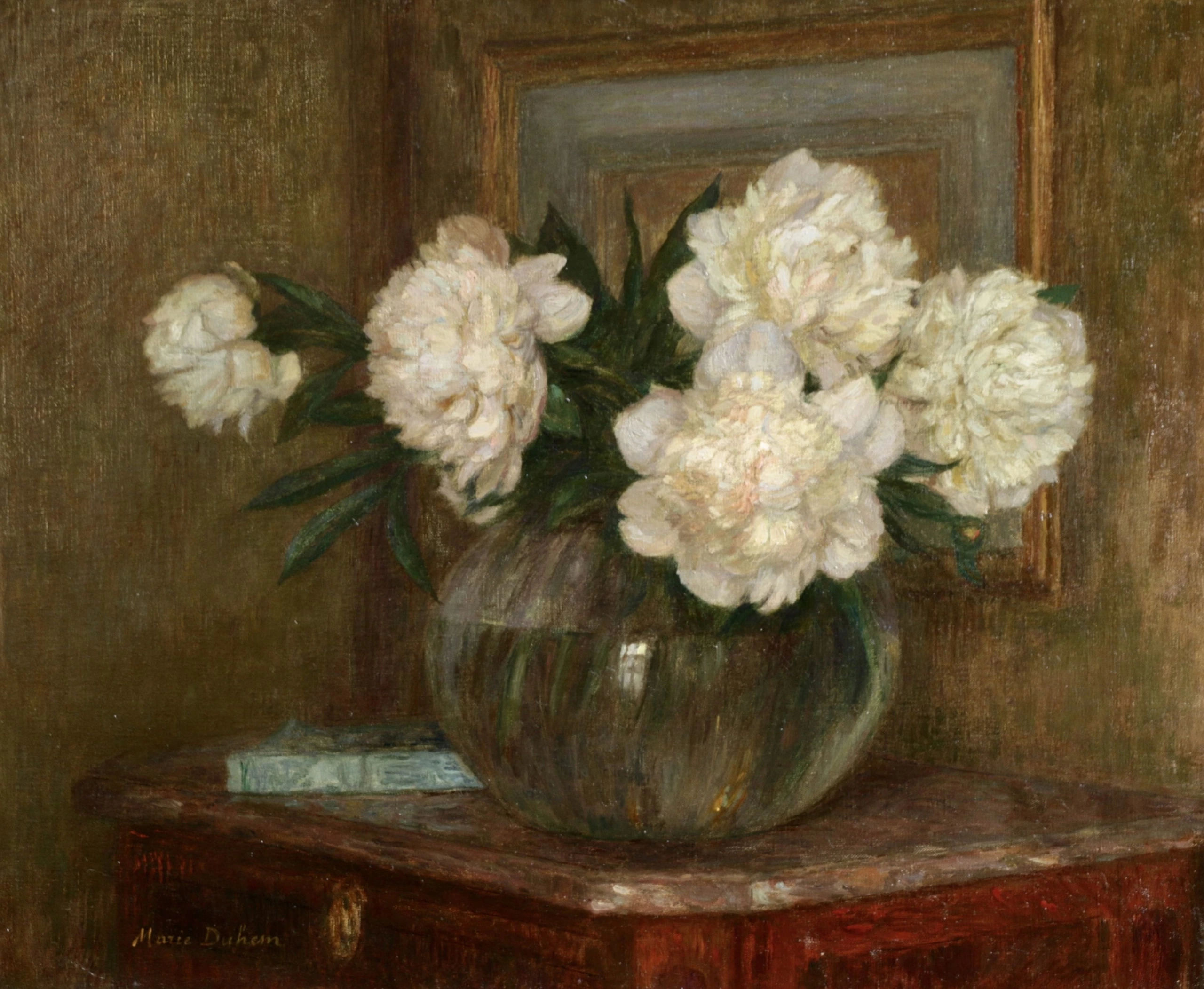 Marie Duhem was a painter whose career had a national influence. She was named Officer of the Palmes académiques, named Knight of the Legion of Honor in 1912, she received a medal at the World Fair of 1900. A personal exhibition is dedicated to her in 1906, in Paris, at the Georges Petit Gallery. That same year, the State acquired an oil on canvas entitled "White Buttercups" for the Luxembourg Museum, now kept at the Musée d'Orsay, which also owns Duhems "Queens Daisies in a Vase".