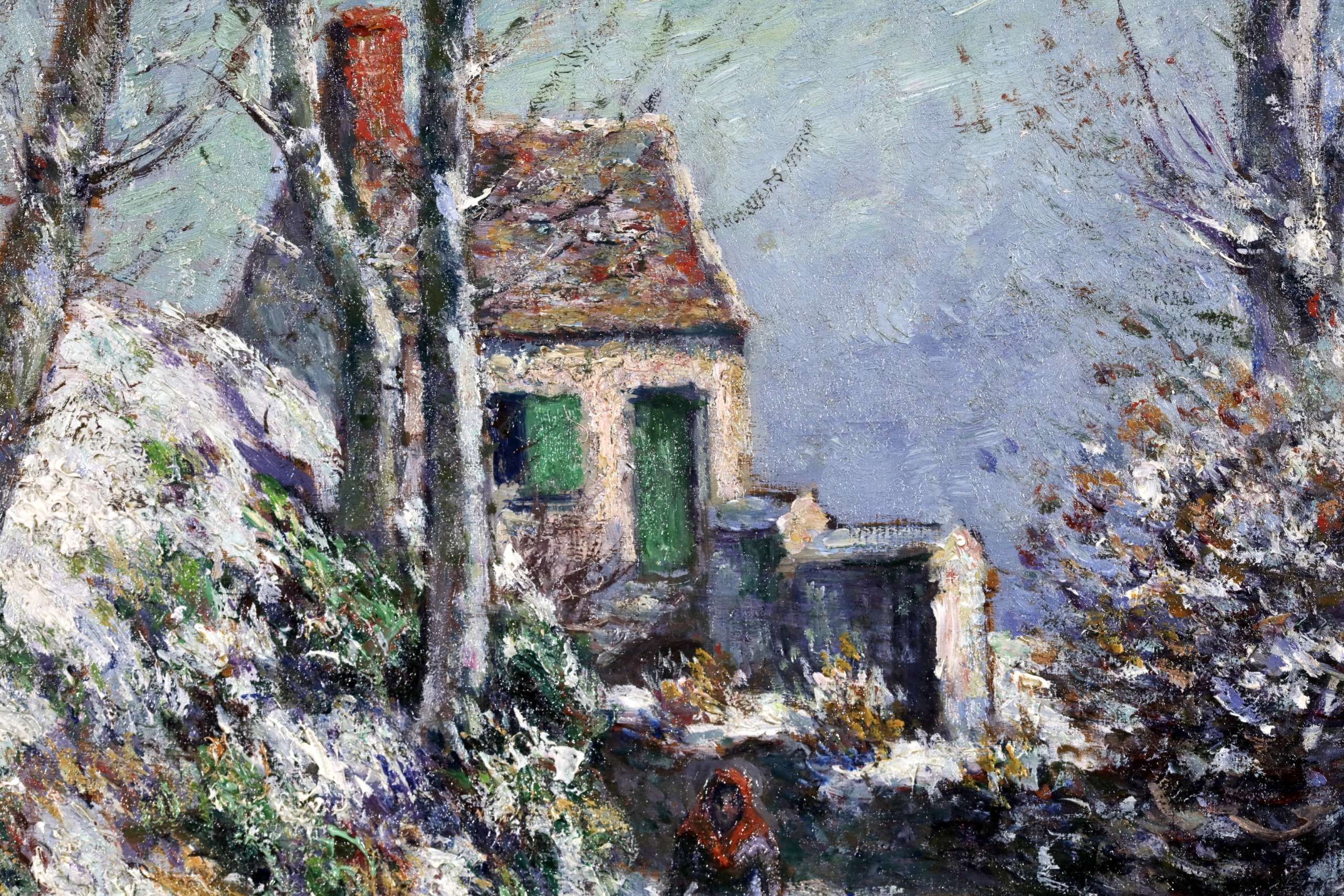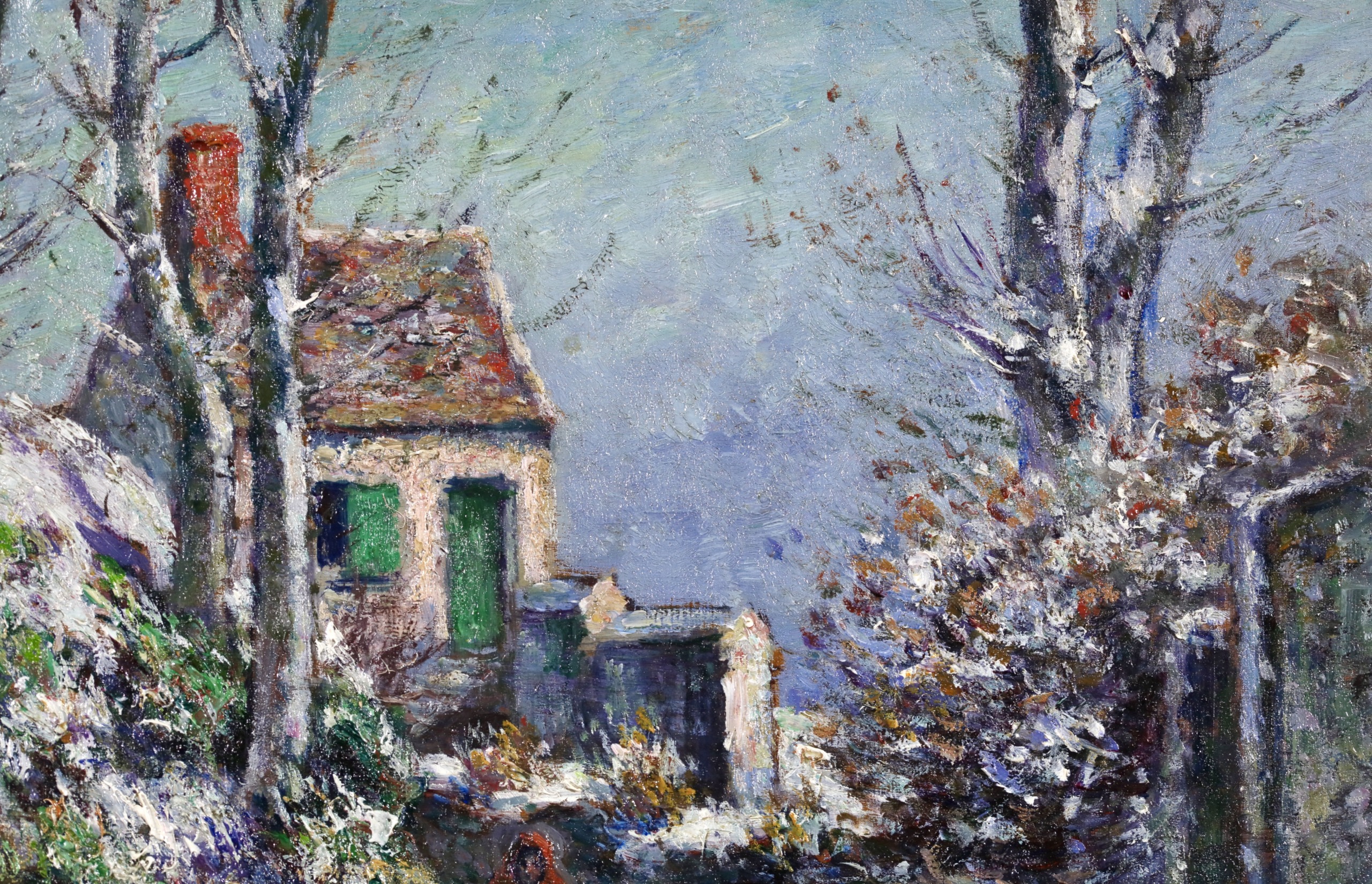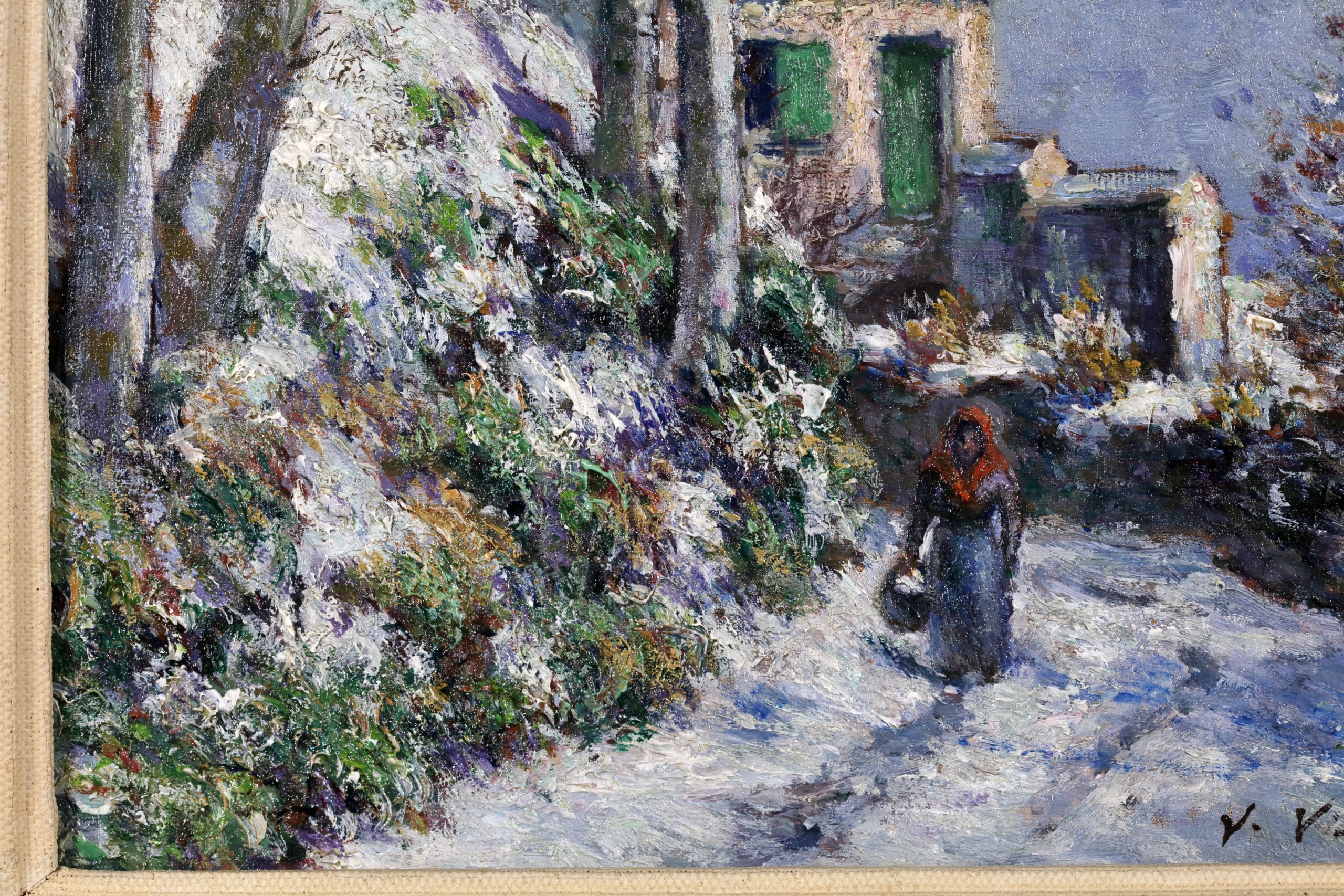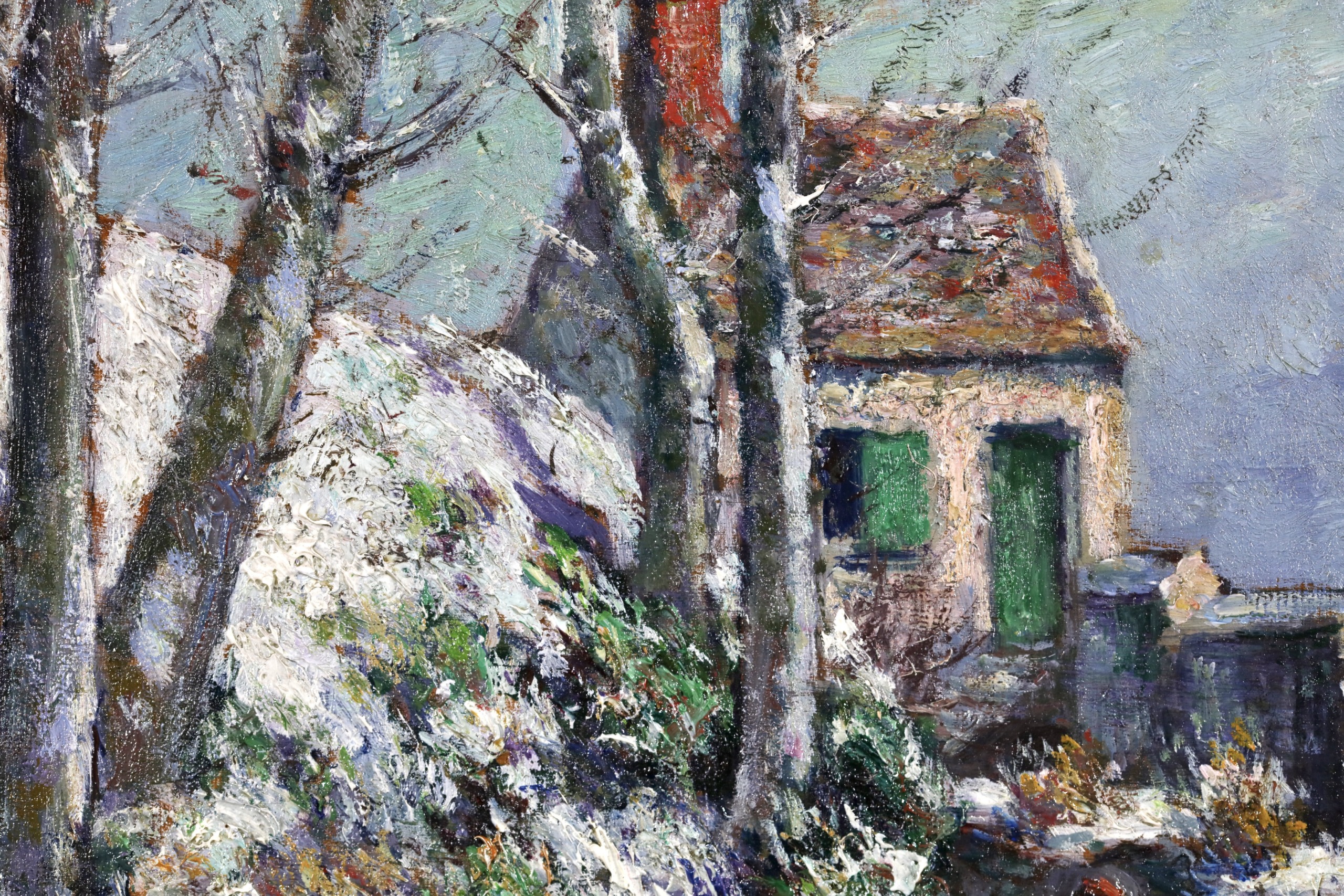 Literature: This work is dedicated by Vignon on the reverse to his cousin and is dated 1871. The painting can be placed into the period where Vignon worked beside Camille Pissarro in Auvers-sur Oise - thsi example painted just north in the commune of Jouy-le-comte and showing the house of the railway worker of the village.