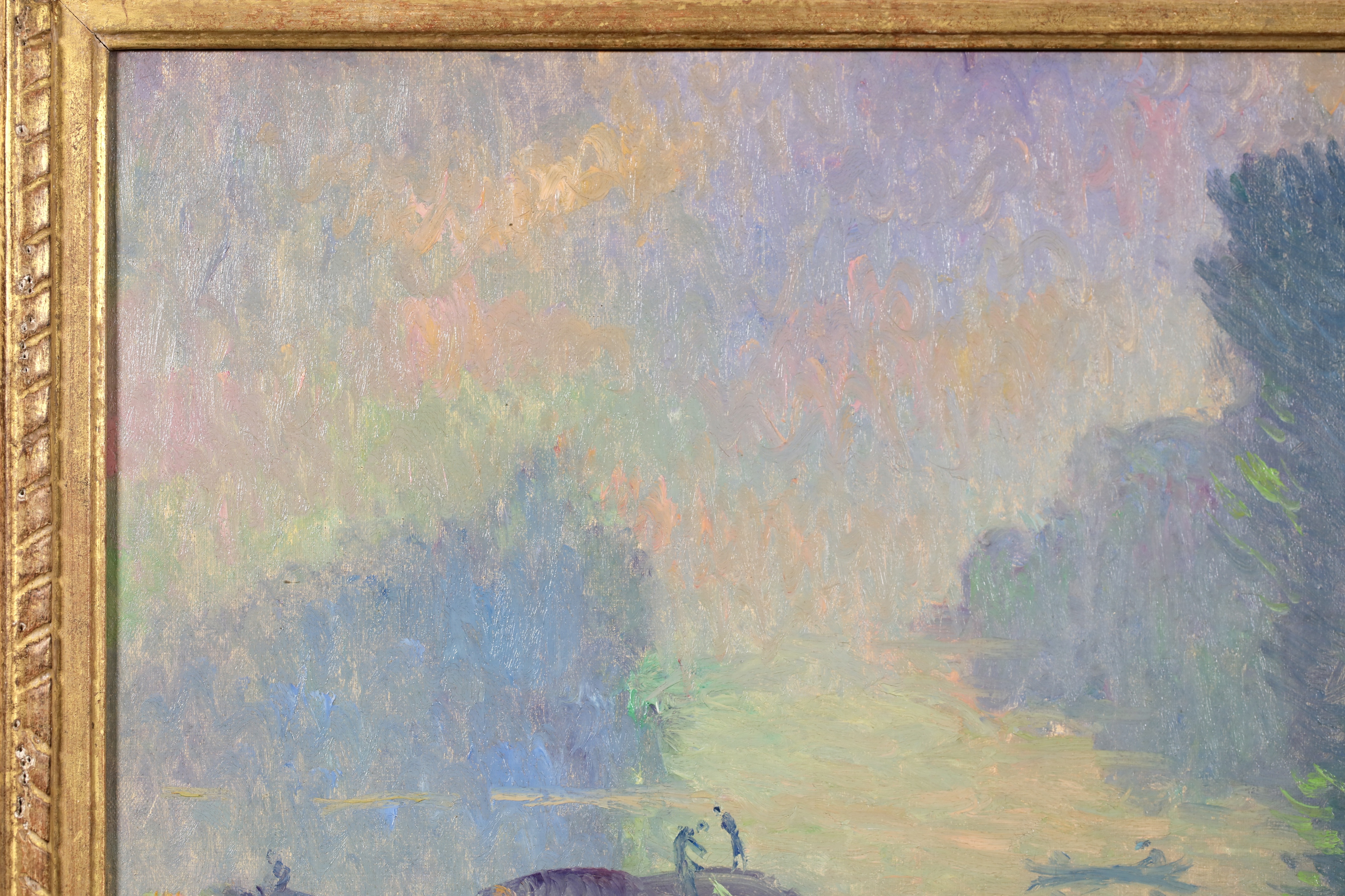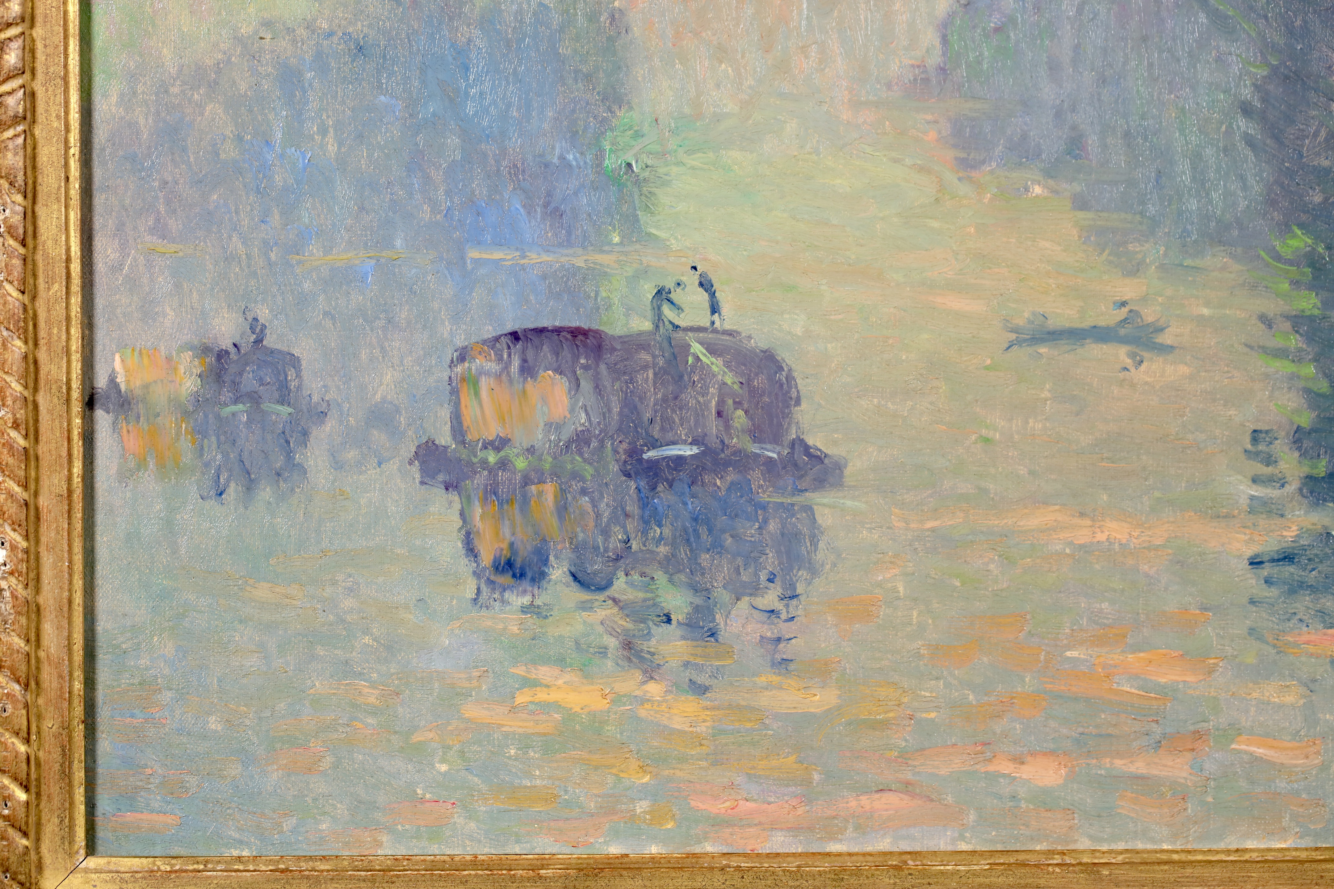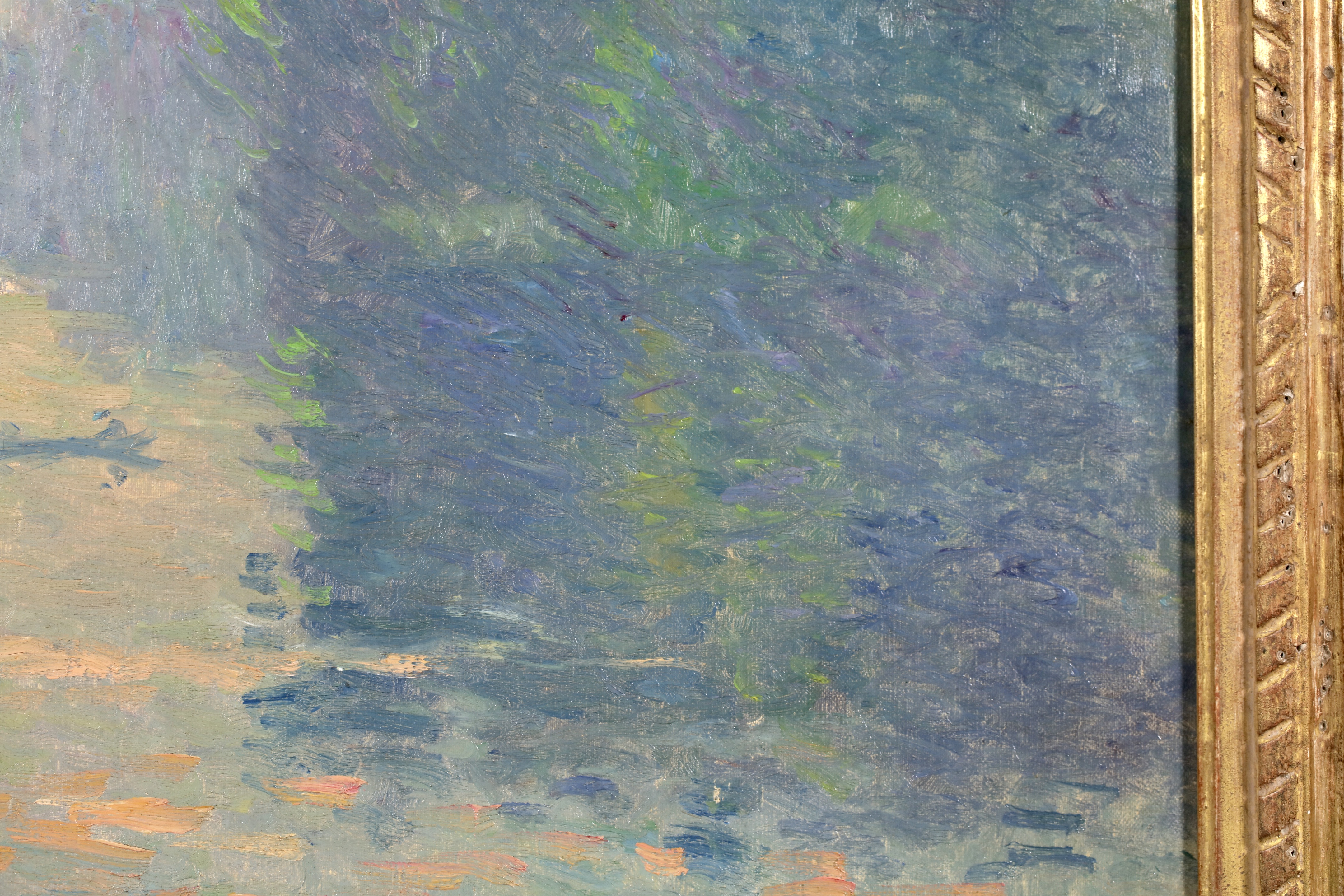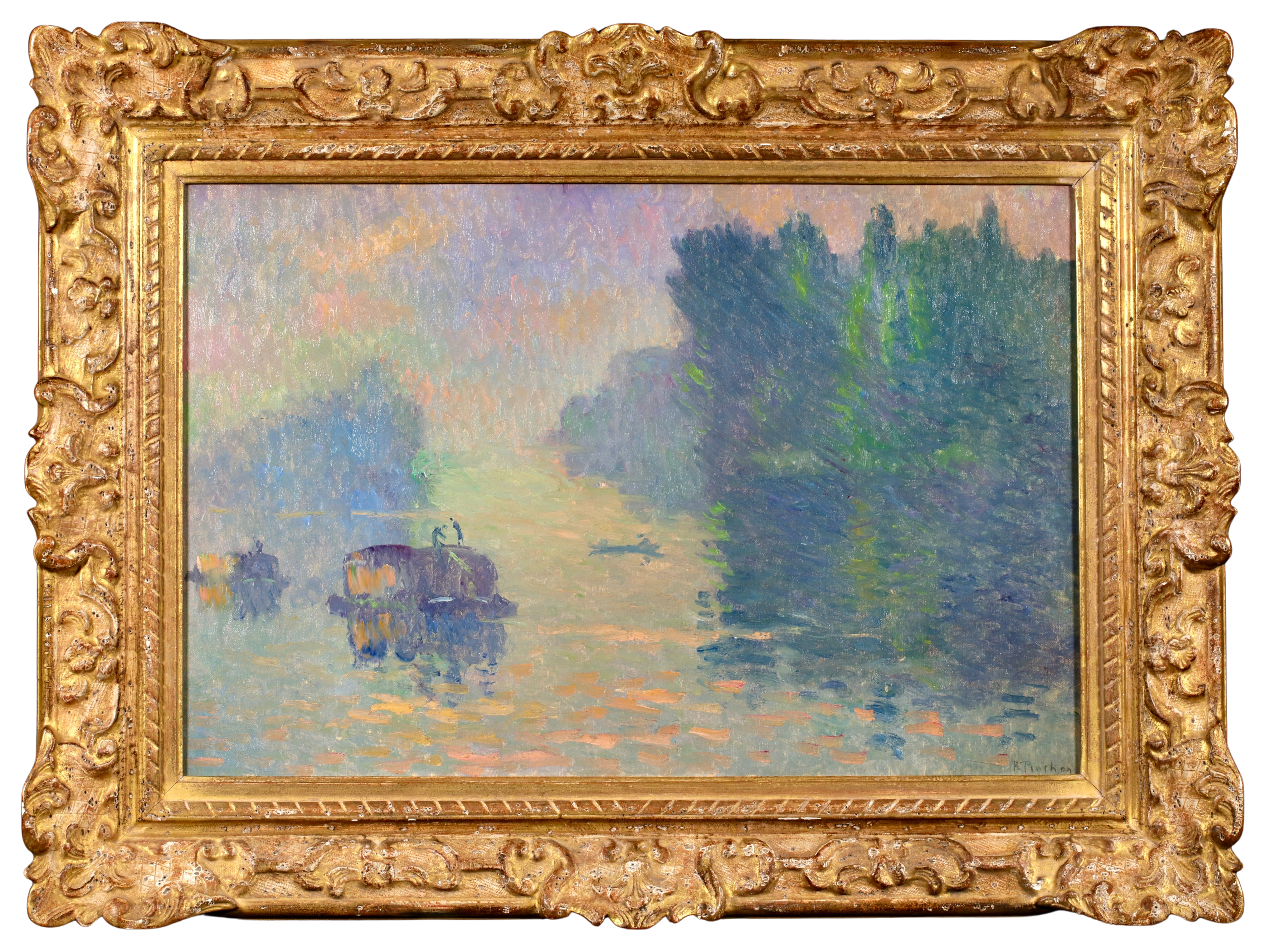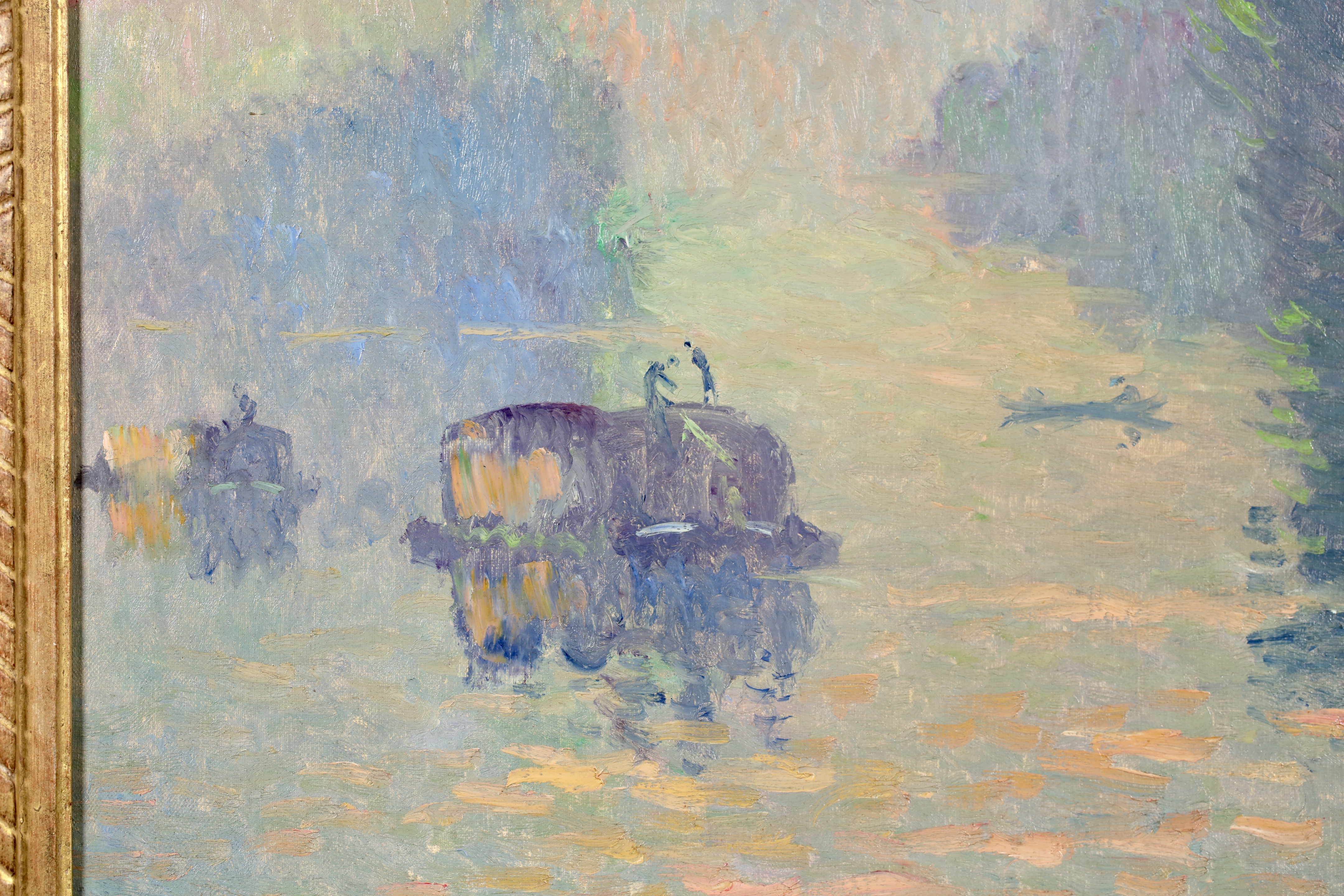 Along with Dumont and Guilbert, Robert Pinchon is one of the Rouen artists who understood Monet's teachings best. Monet himself noticed Pinchon's 'eye' when he met him for the first time. On a technical level, he used pure colours, just as they came out of the tube. His poetical art perfectly rendered not only the misty lights of the port of Rouen, but also scenes of daily life, whether of a young woman sitting in a garden or children playing with a ball. Noteworthy are: Embankment in Rouen; Rouen in the Snow; Banks of the Seine; Suspension Bridge at Elbeuf.