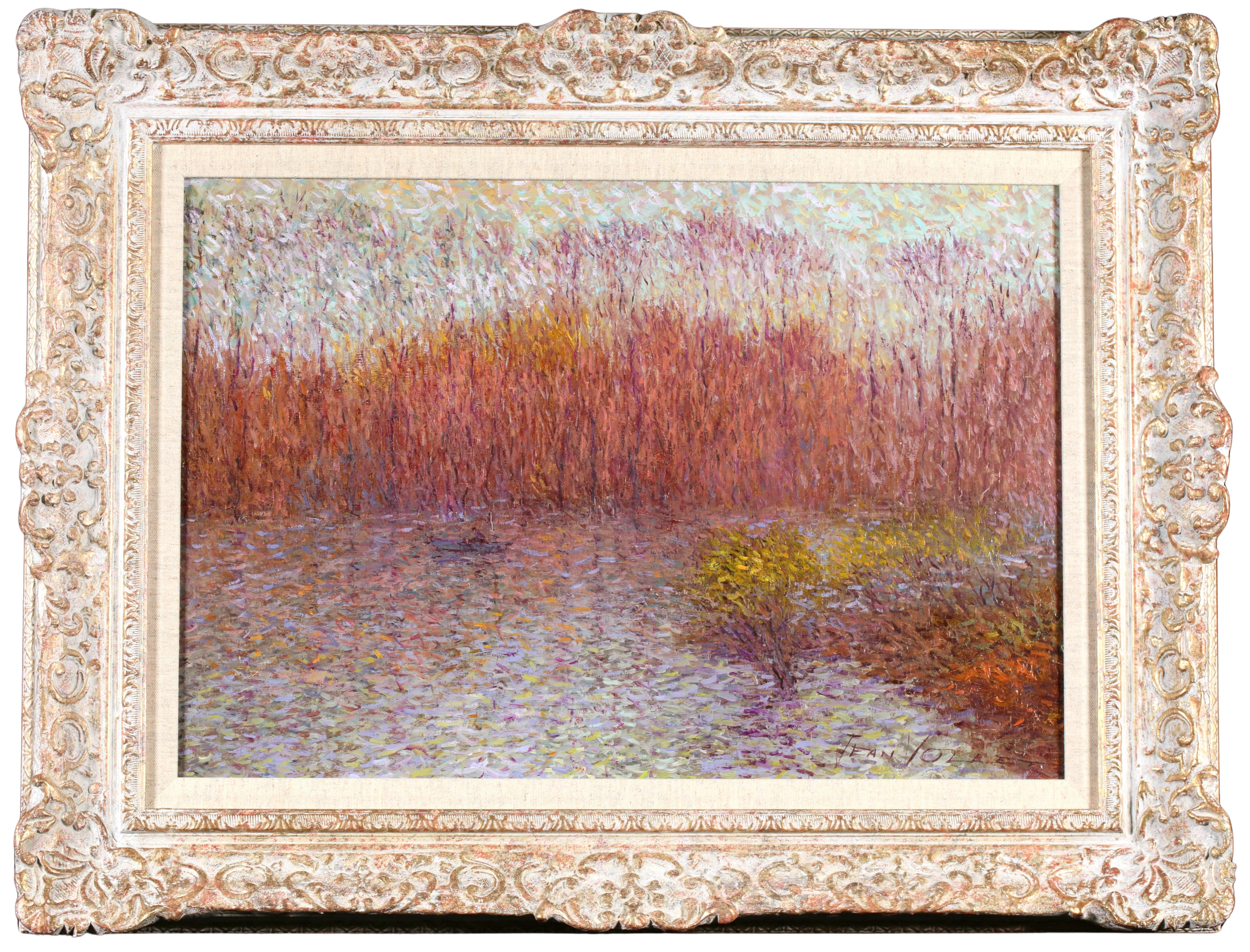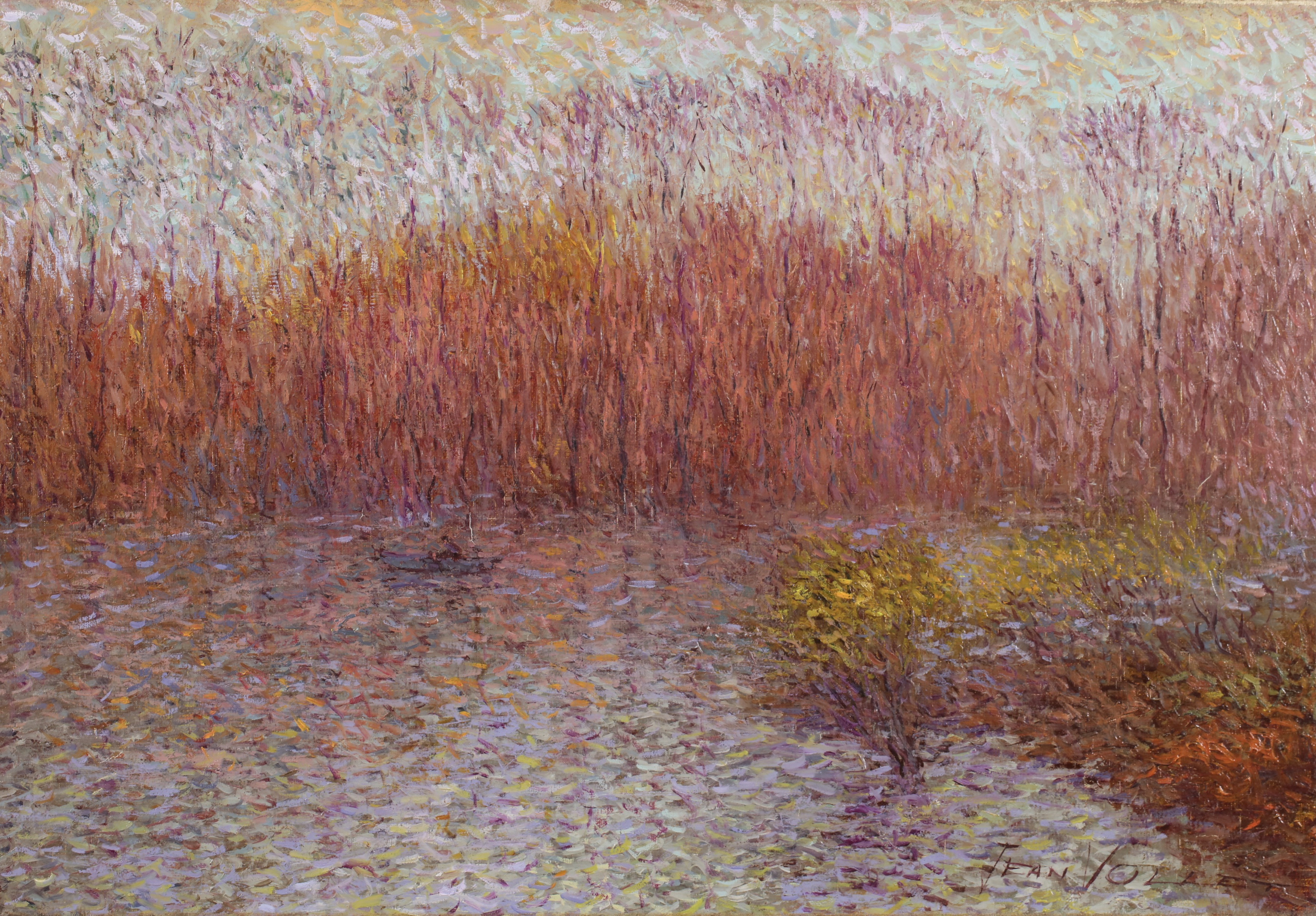 Jean Vollet creates a world of Paradise, a mist shining with joy is visible in his paintings. There is the spell of the masters of the 19th century, the magic of Renoir and Monet : the golden mist of the landscapes, the colors of the plants growing in the fields, the trees whose branches reach up to the sky surronding them, all recreate the world of happy childhood. The influence of Seurat, combined with Renoir and Pissaro, is visible in the paintings of Vollet, and their balance and equilibrium, their serenity, are typically French.