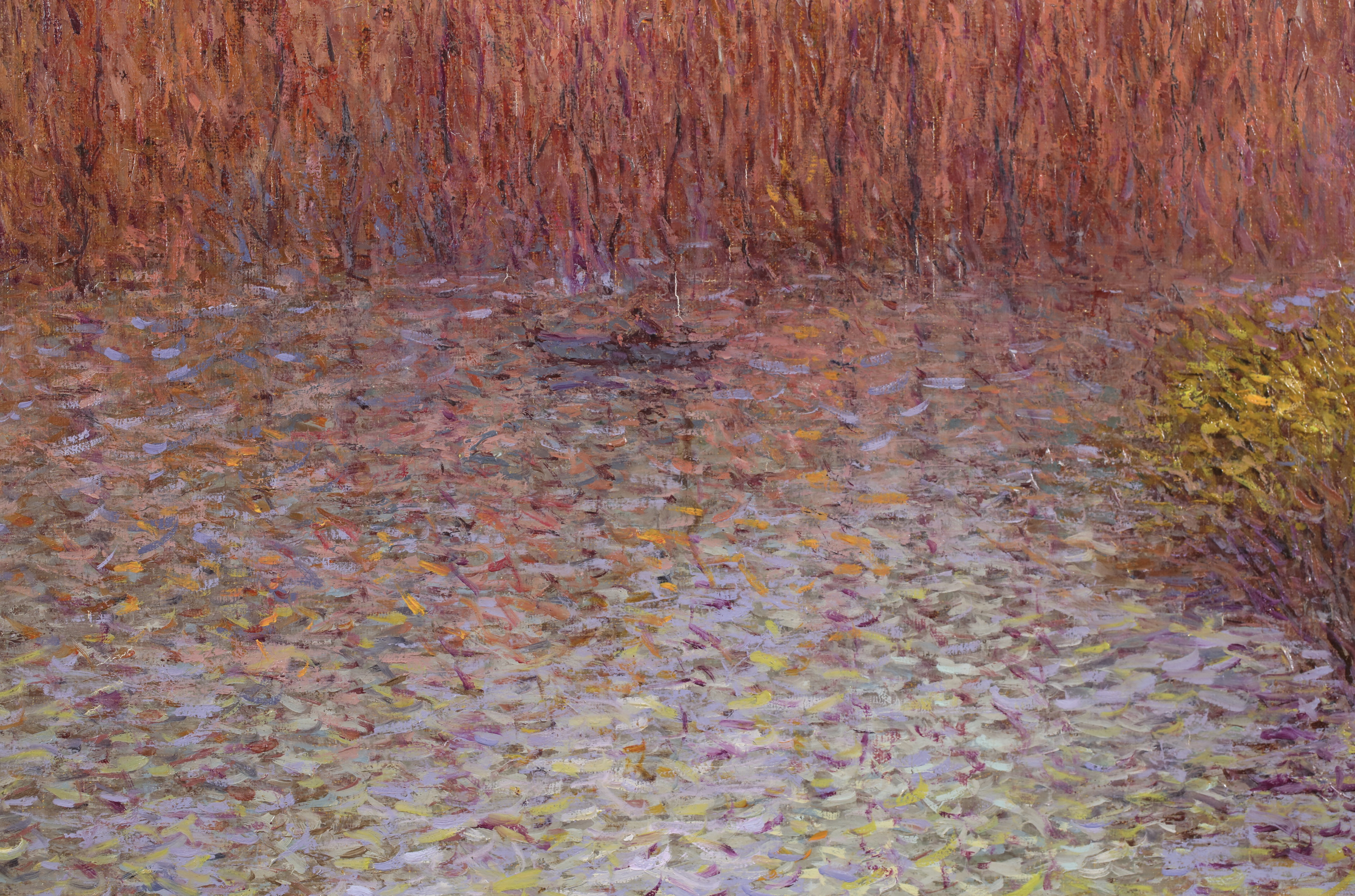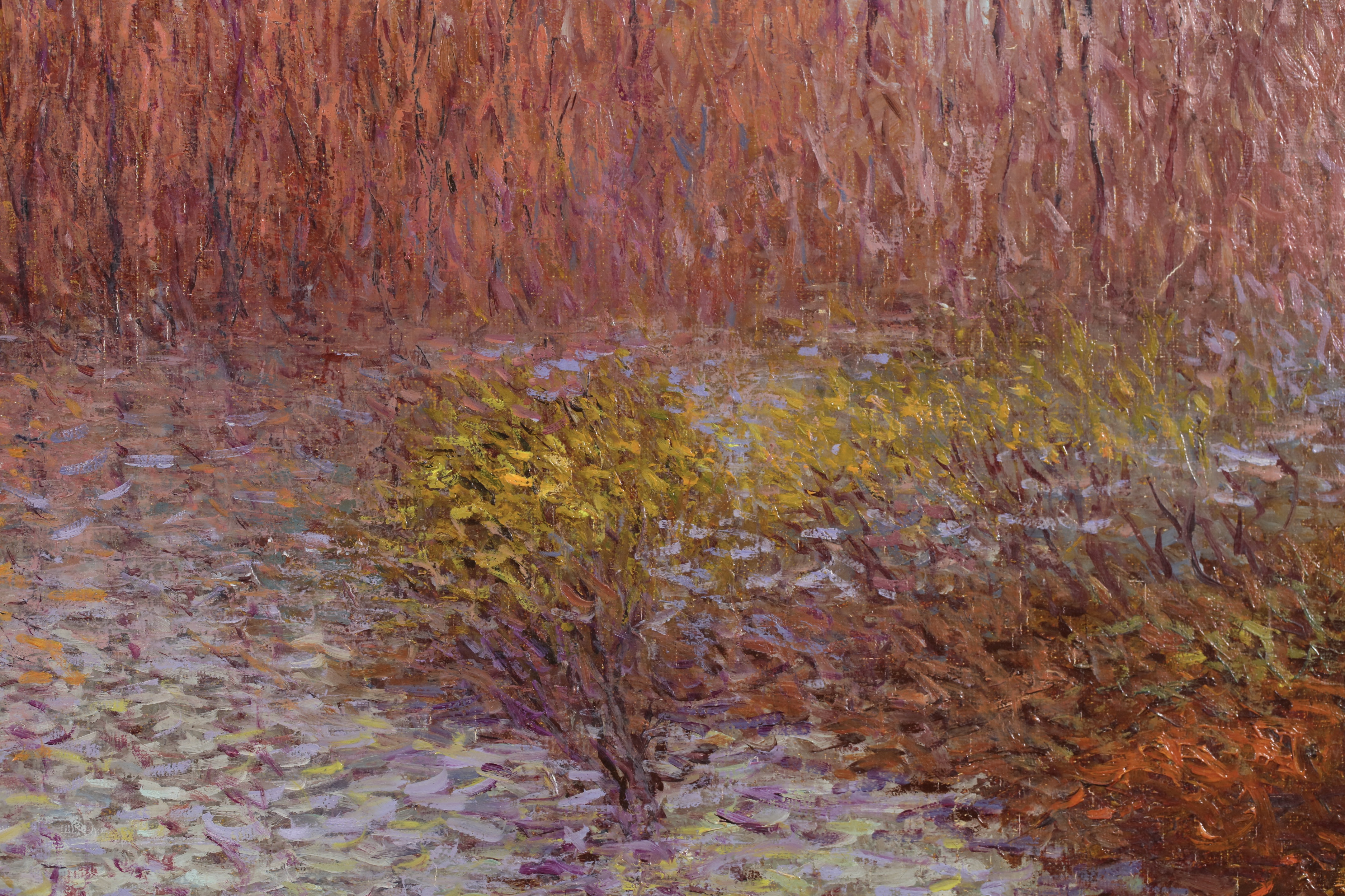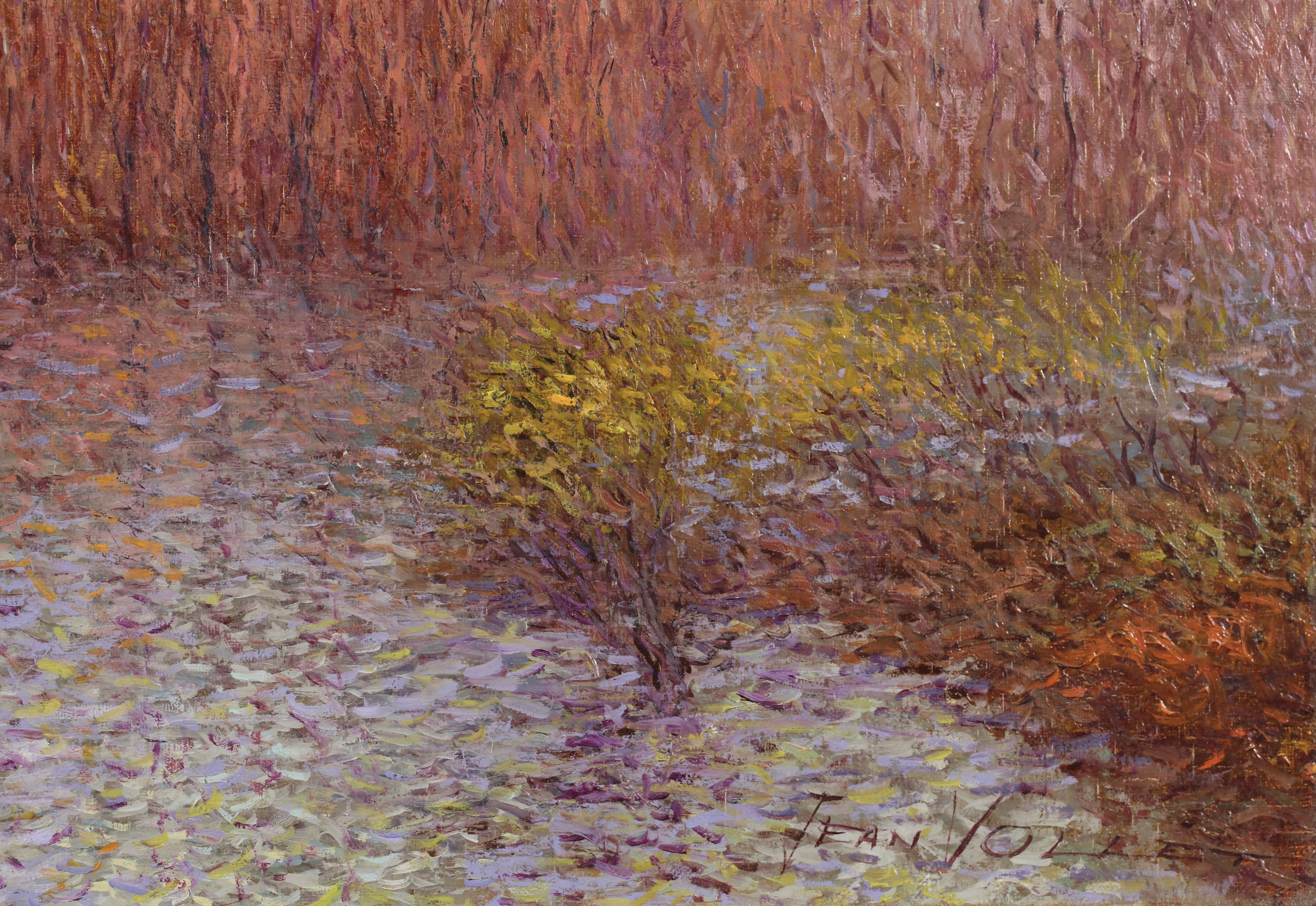 There is precise technique in Vollet's landscapes. A multitude of tiny, colored dots is blended to create movement depth and the charm of a gentle sensuality. His creative originality is demonstrated by his ability to combine tones of color : he mixes bluish-greens with the purplish-yellows to produce a new sensation of depth and an illusion of movement, shimmering with color.