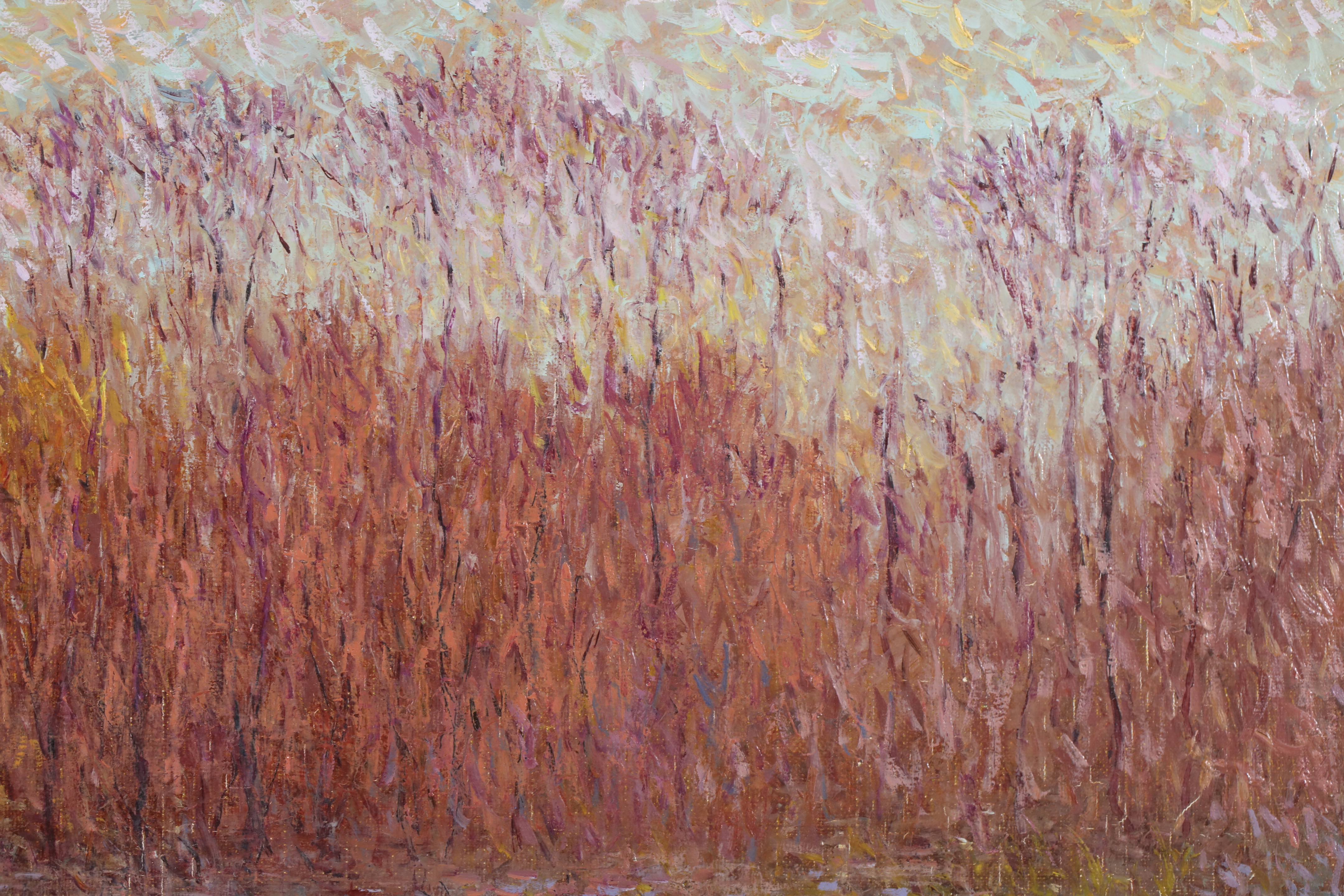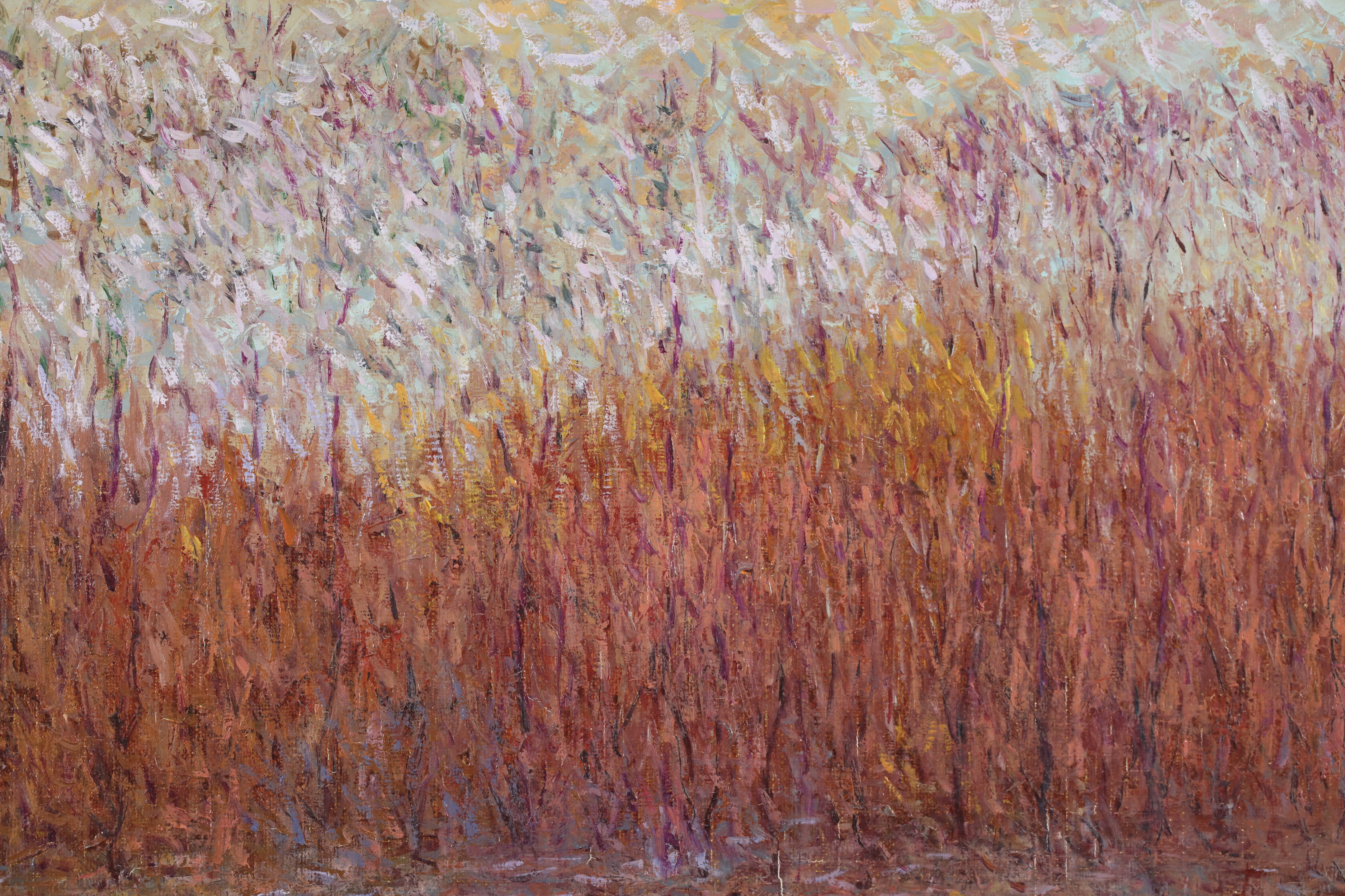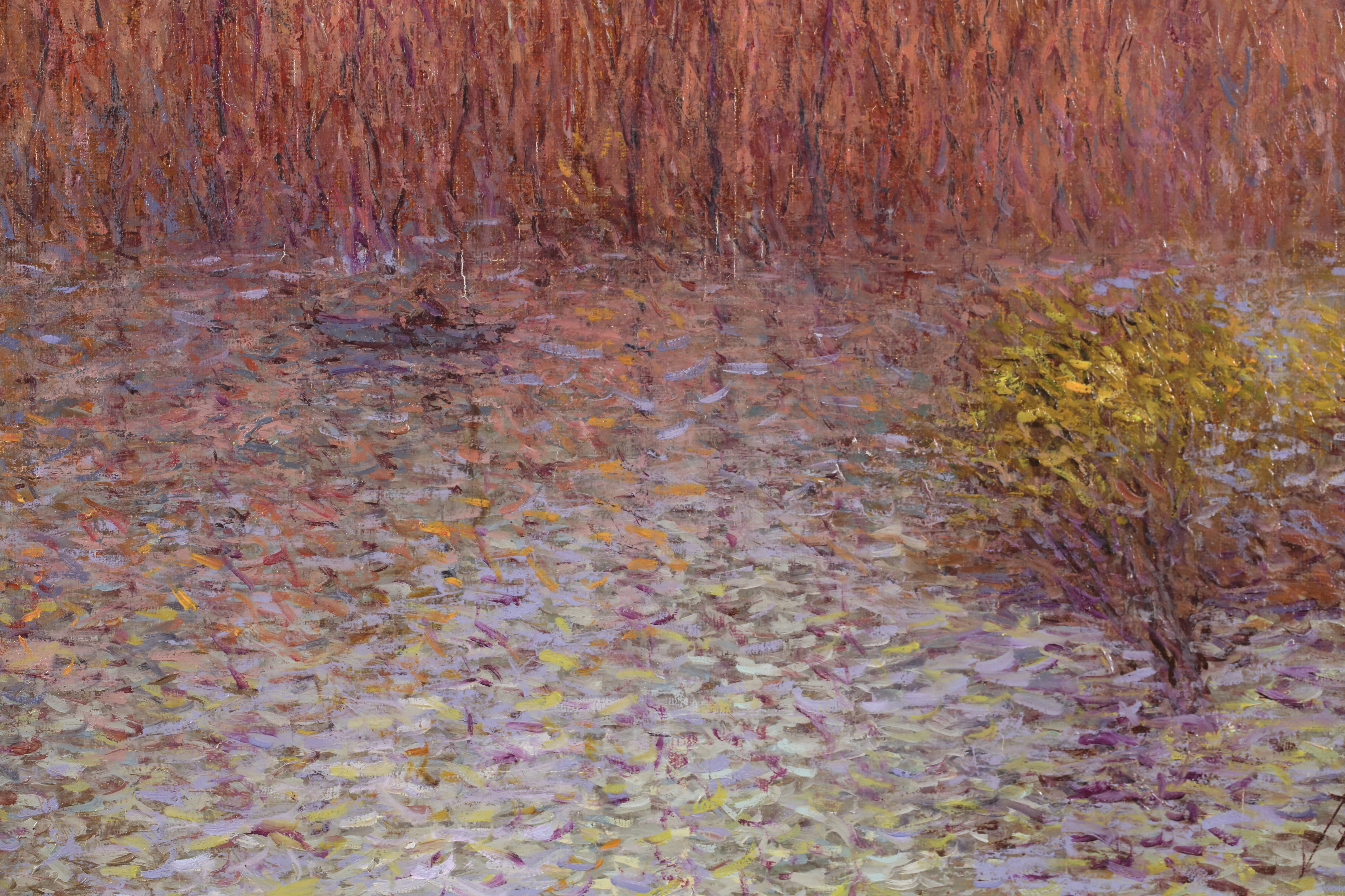 There is precise technique in Vollet's landscapes. A multitude of tiny, colored dots is blended to create movement depth and the charm of a gentle sensuality. His creative originality is demonstrated by his ability to combine tones of color : he mixes bluish-greens with the purplish-yellows to produce a new sensation of depth and an illusion of movement, shimmering with color.