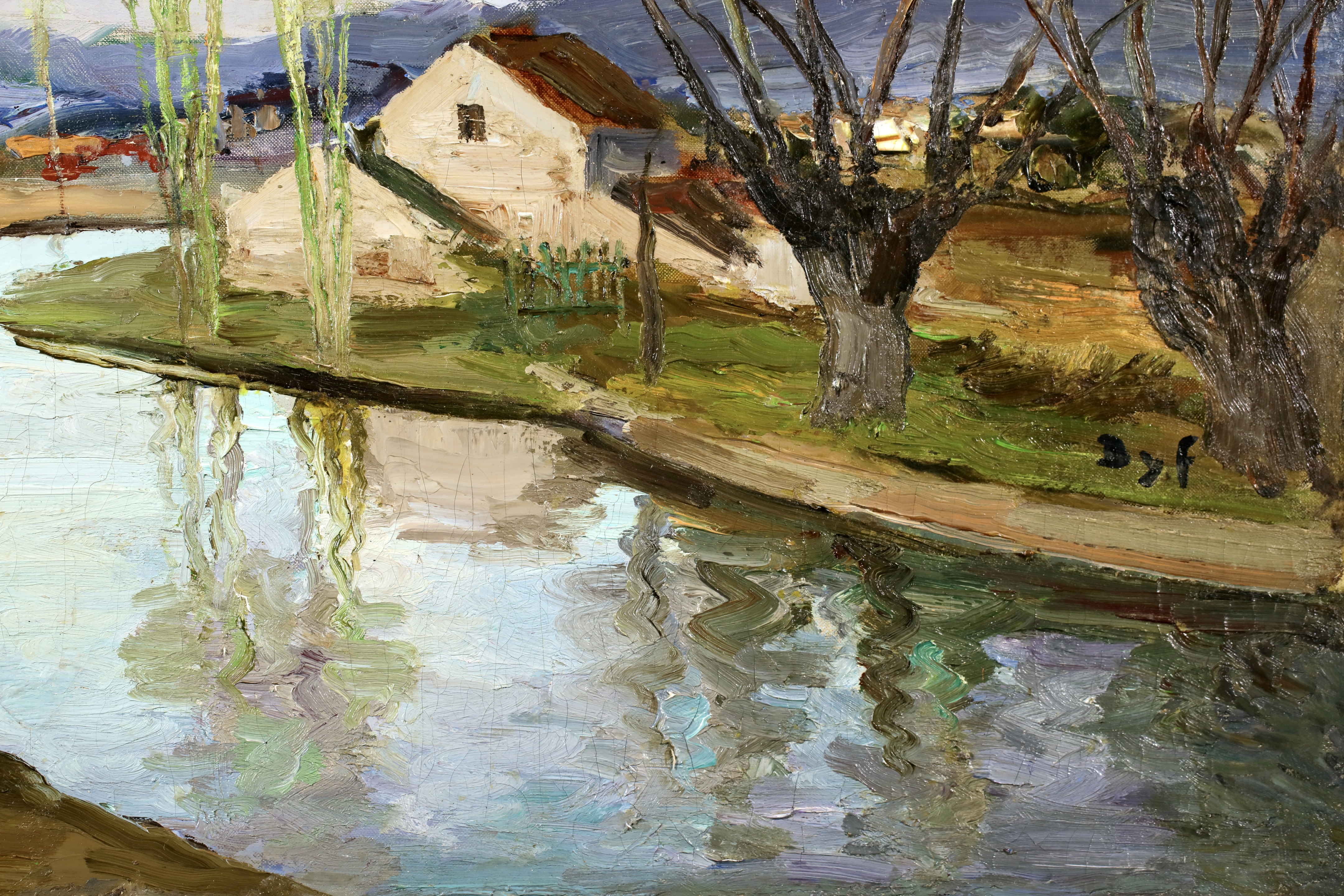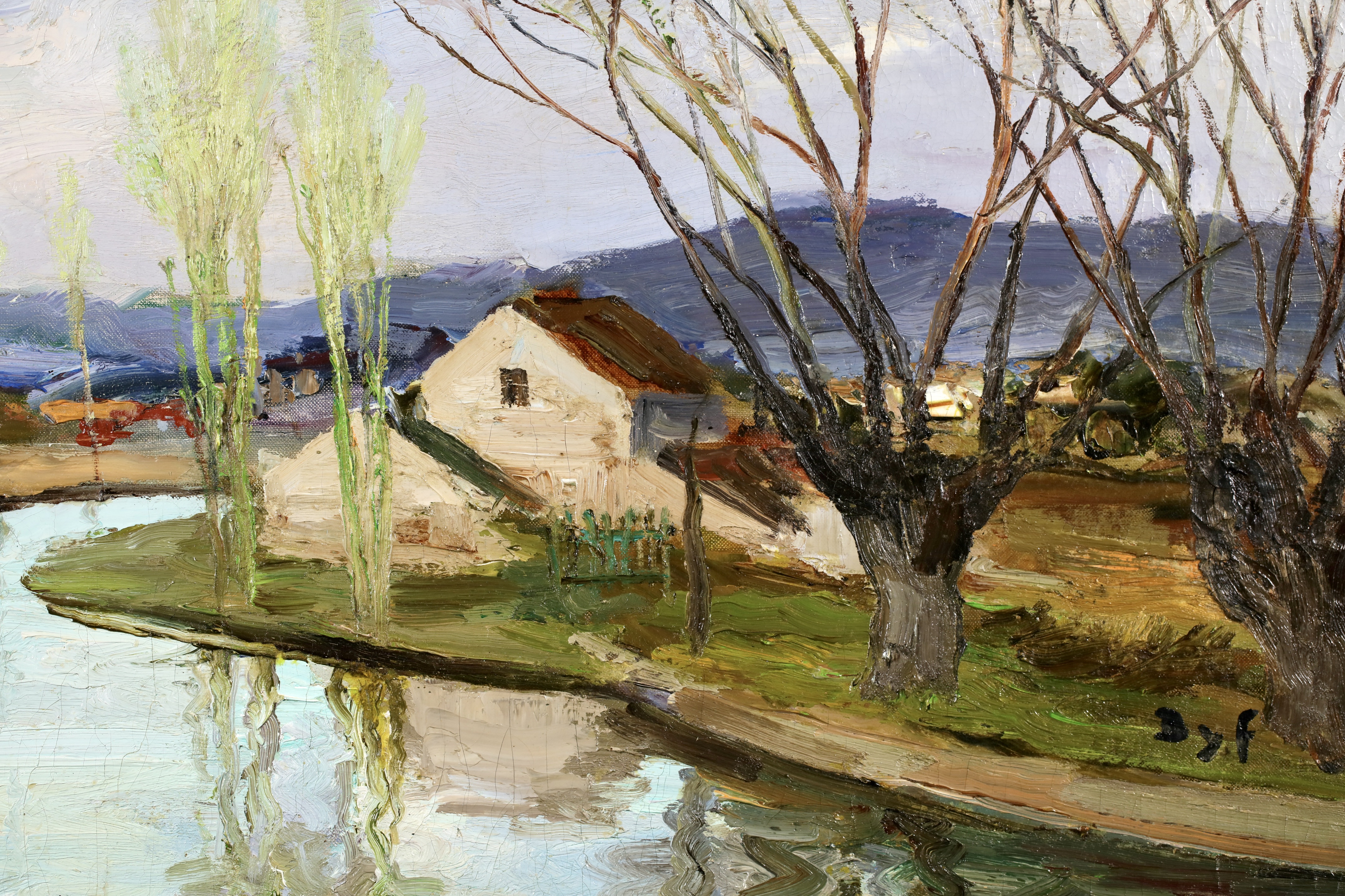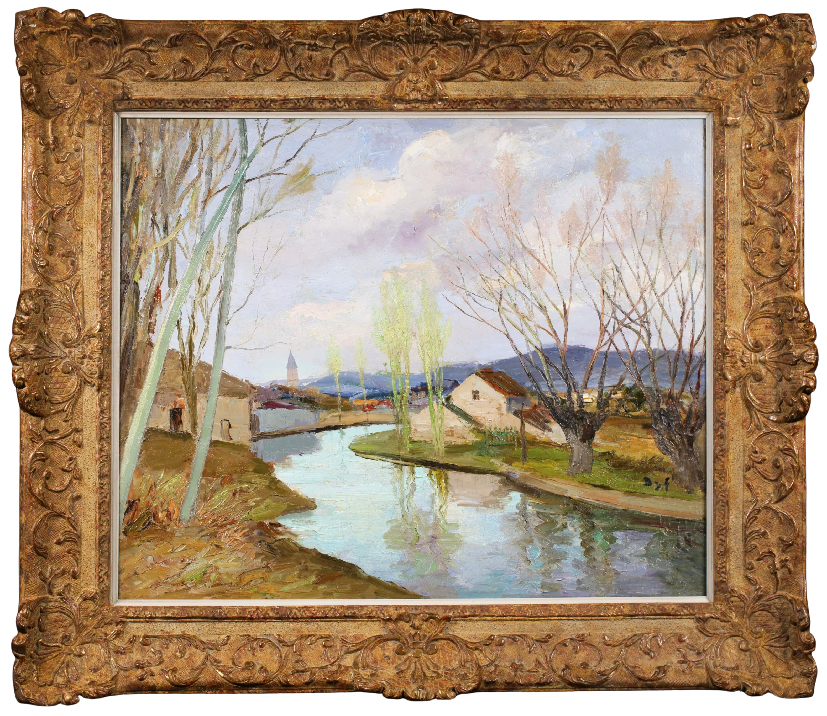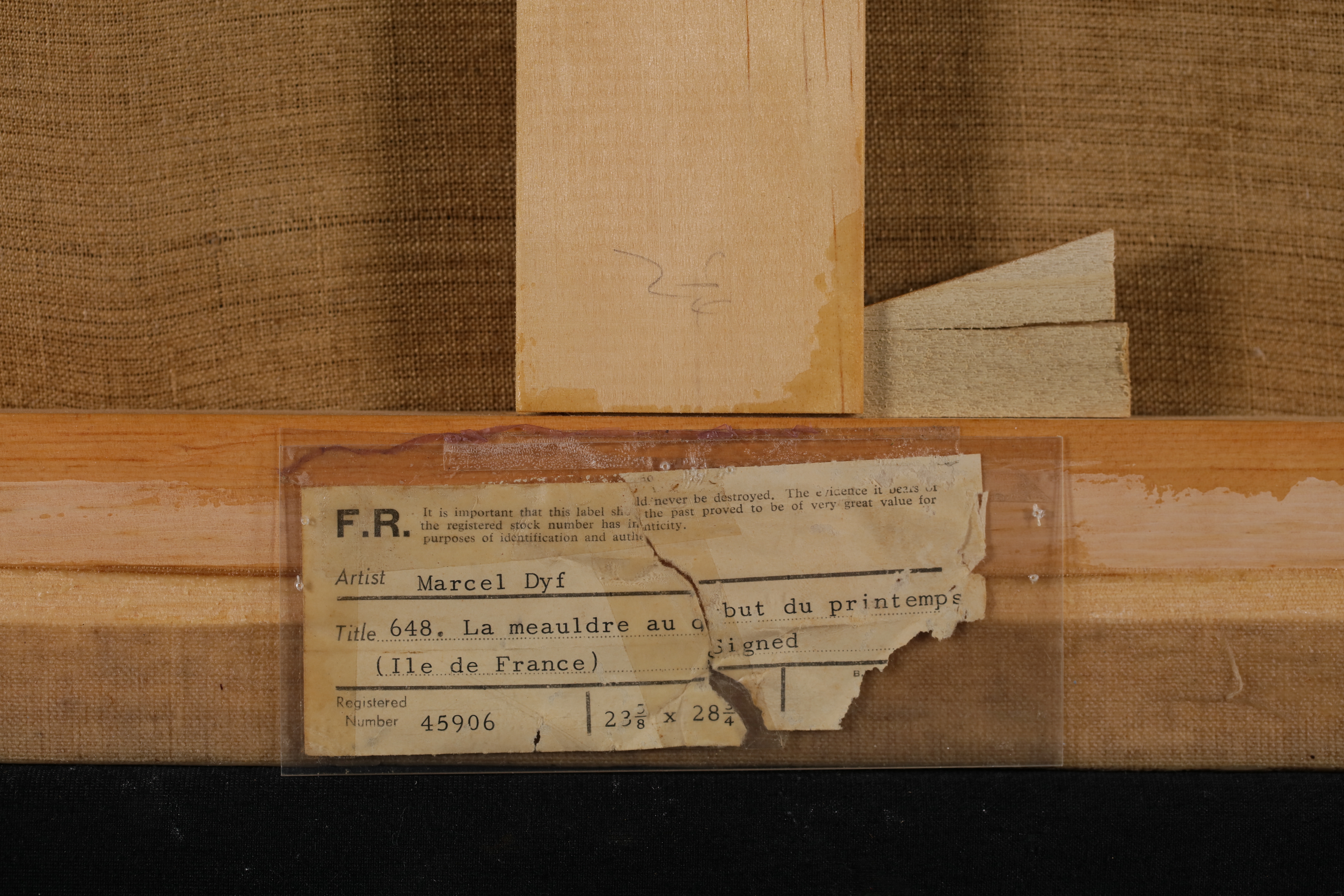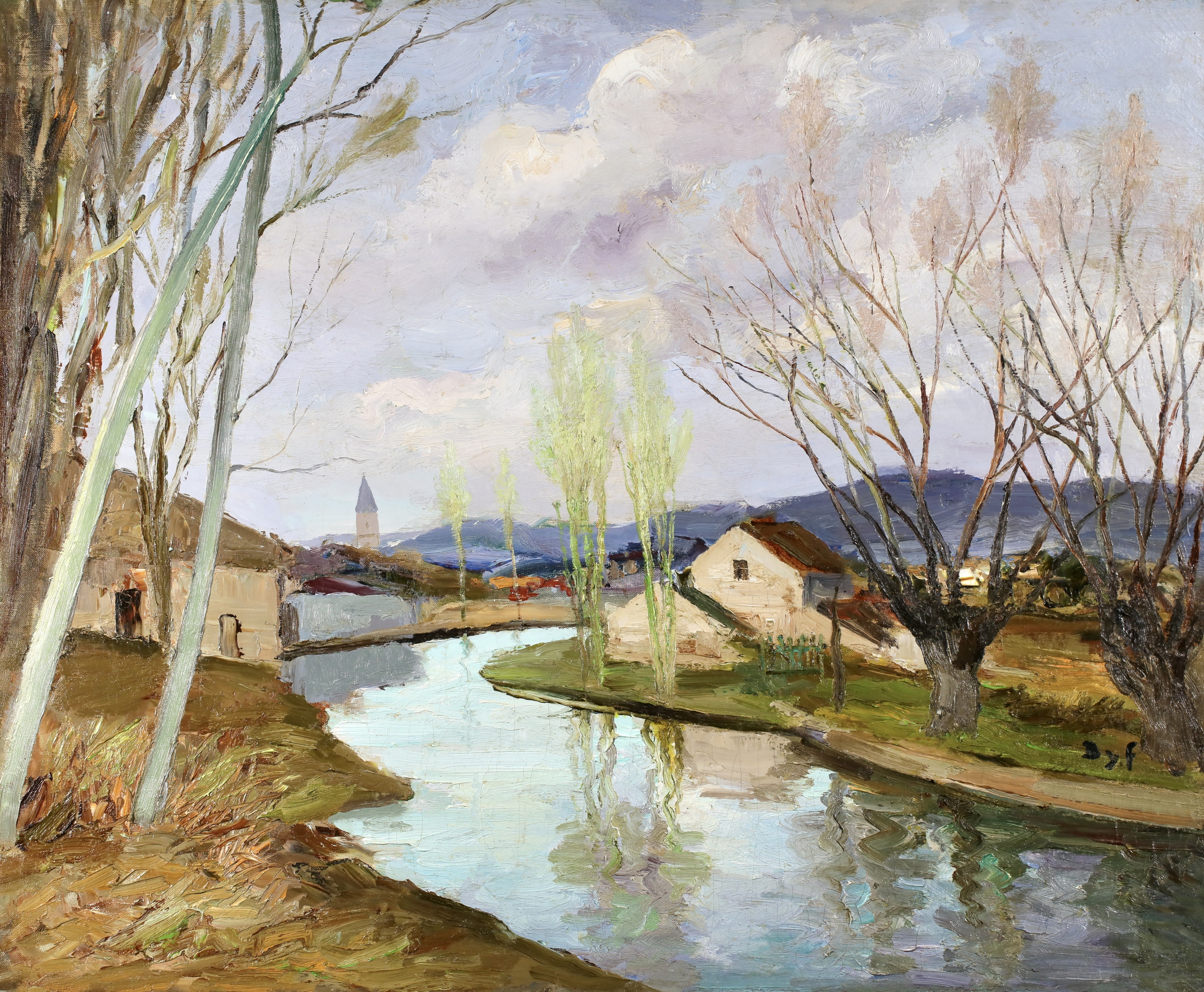 Marcel Dyf’s art derived from classical tradition and from moderate Post-Impressionism. His landscapes, which form the greater part of his output, are often painted in shades of ochre and in horizontal planes, with additional matter worked in. He produced many in the Île-de-France, in Provence where he lived, in Brittany and Normandy, in Venice, Morocco and Israel. He also painted portraits and figures, in the 1950s often of gypsy women, and frequently of his wife Claudine. He produced decorative work in the town halls of Stes-Maries de la Mer (Camargue) and St-Martin-de-Crau (Arles), and painted frescoes in the Musée Arlaten in Arles in 1936.