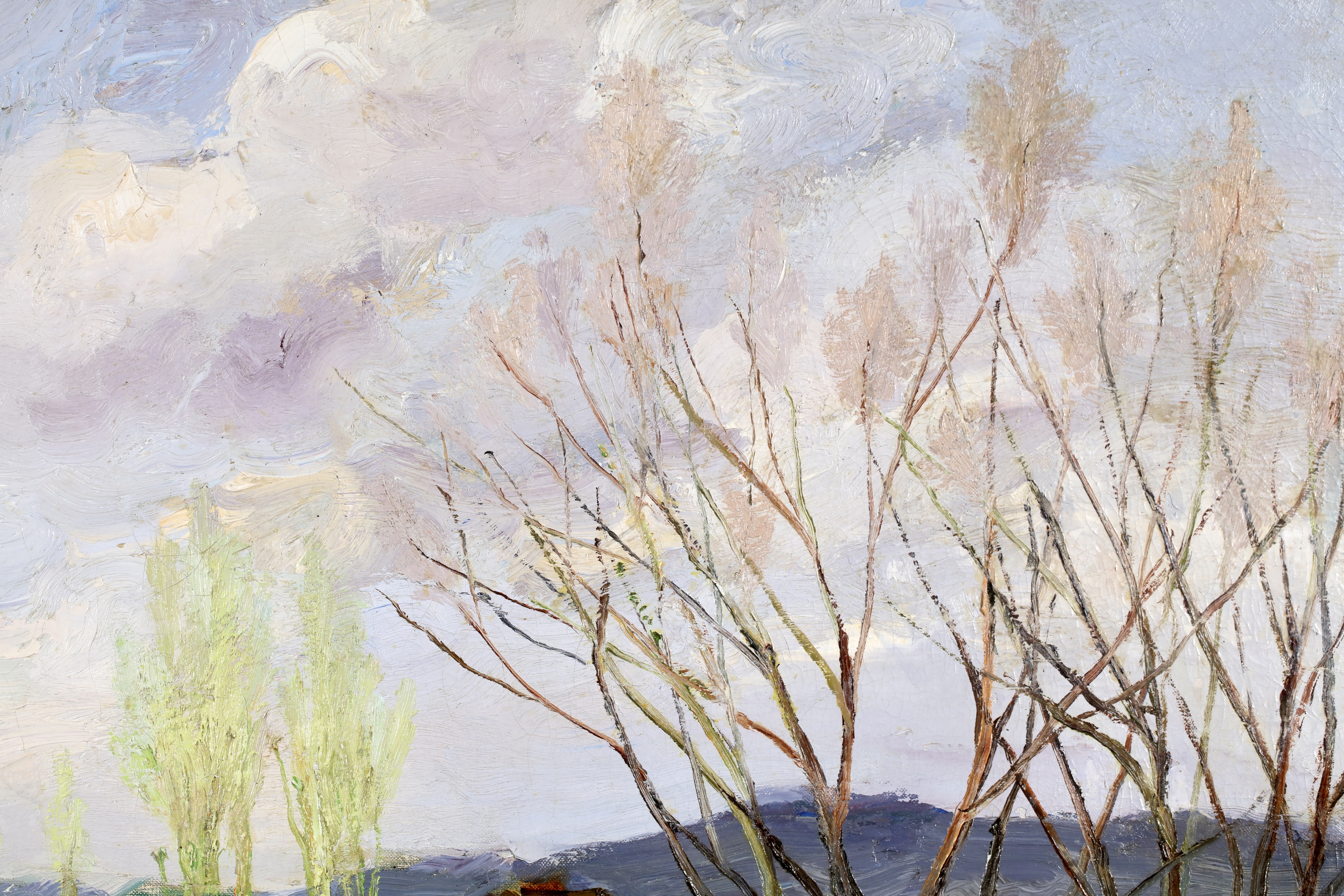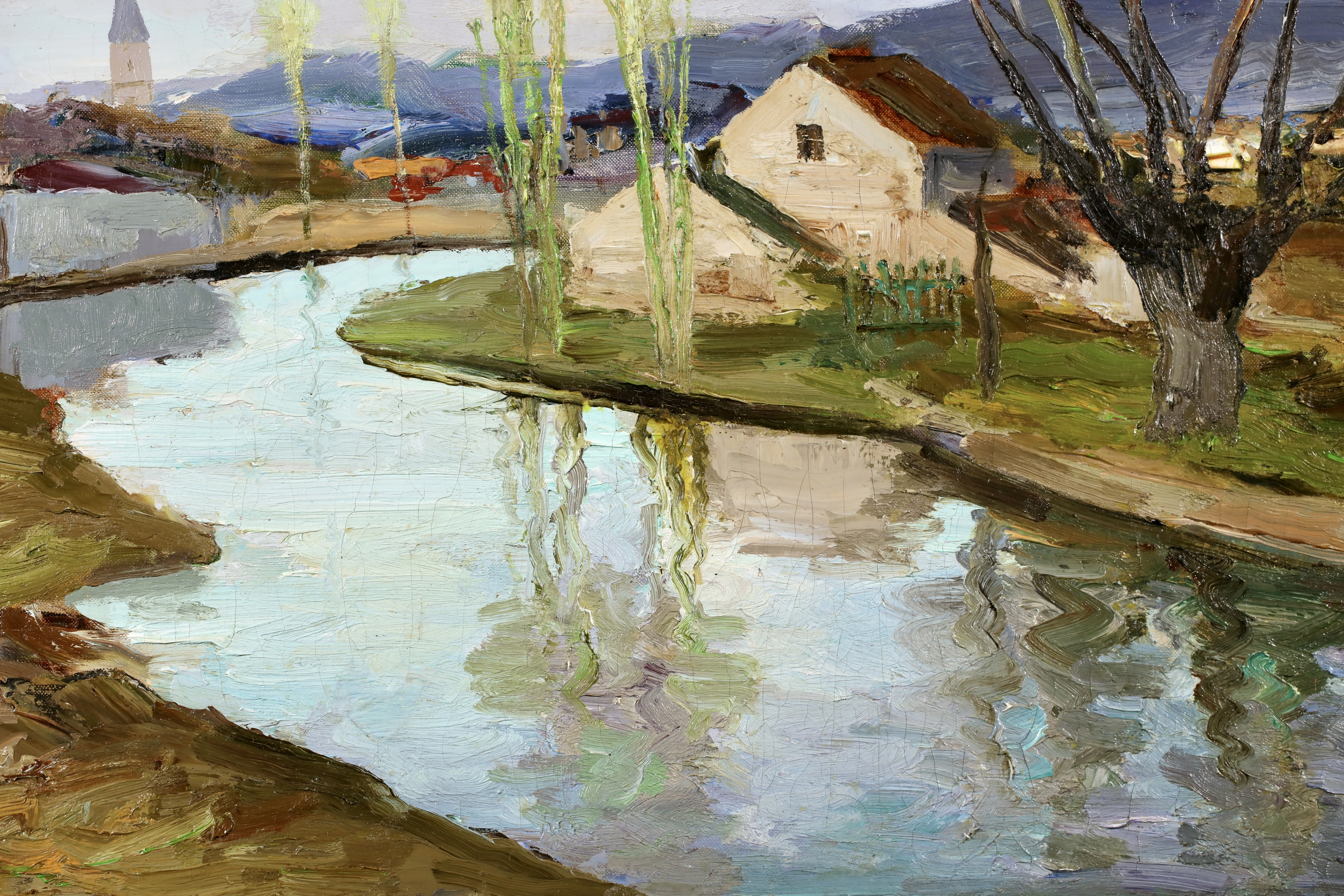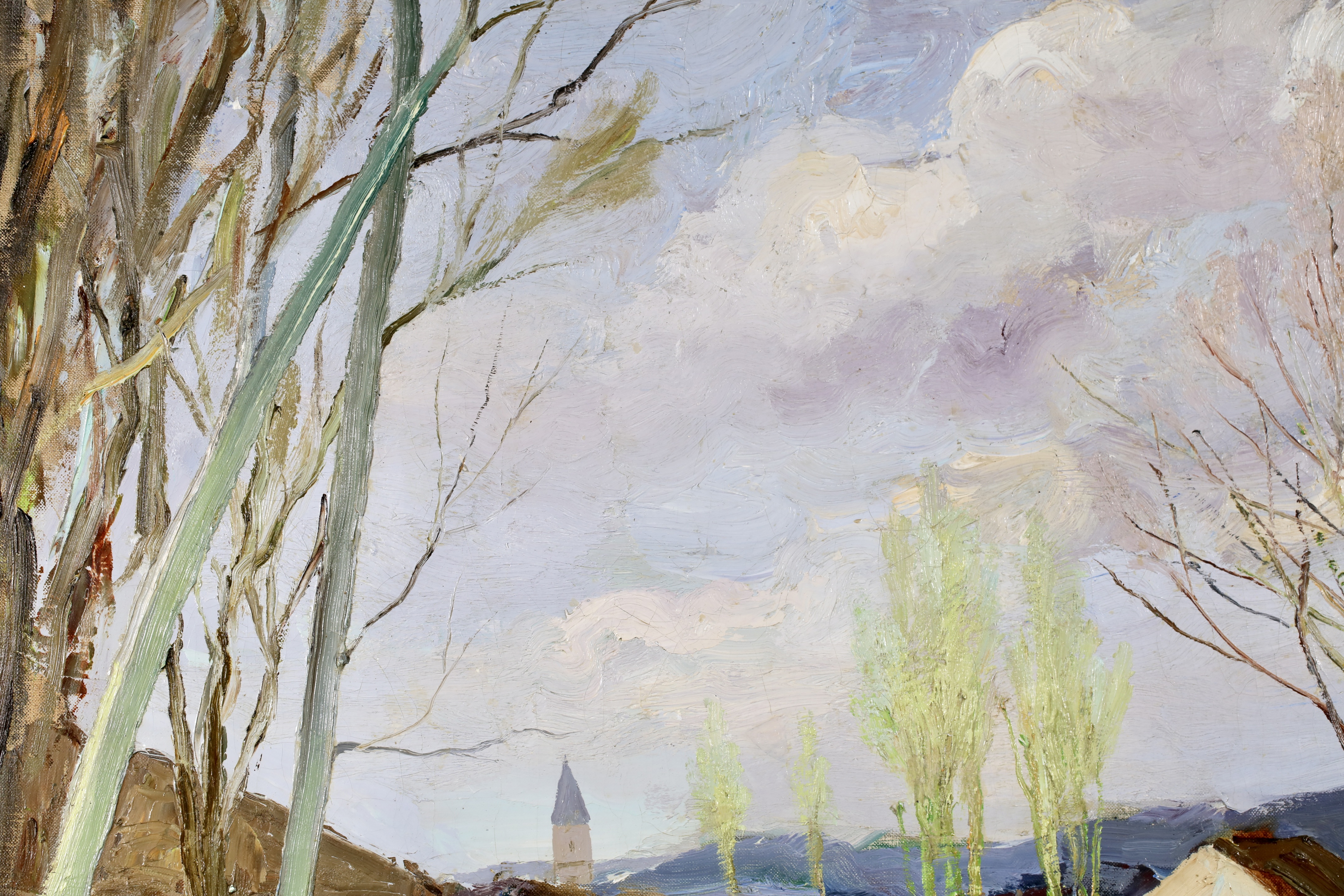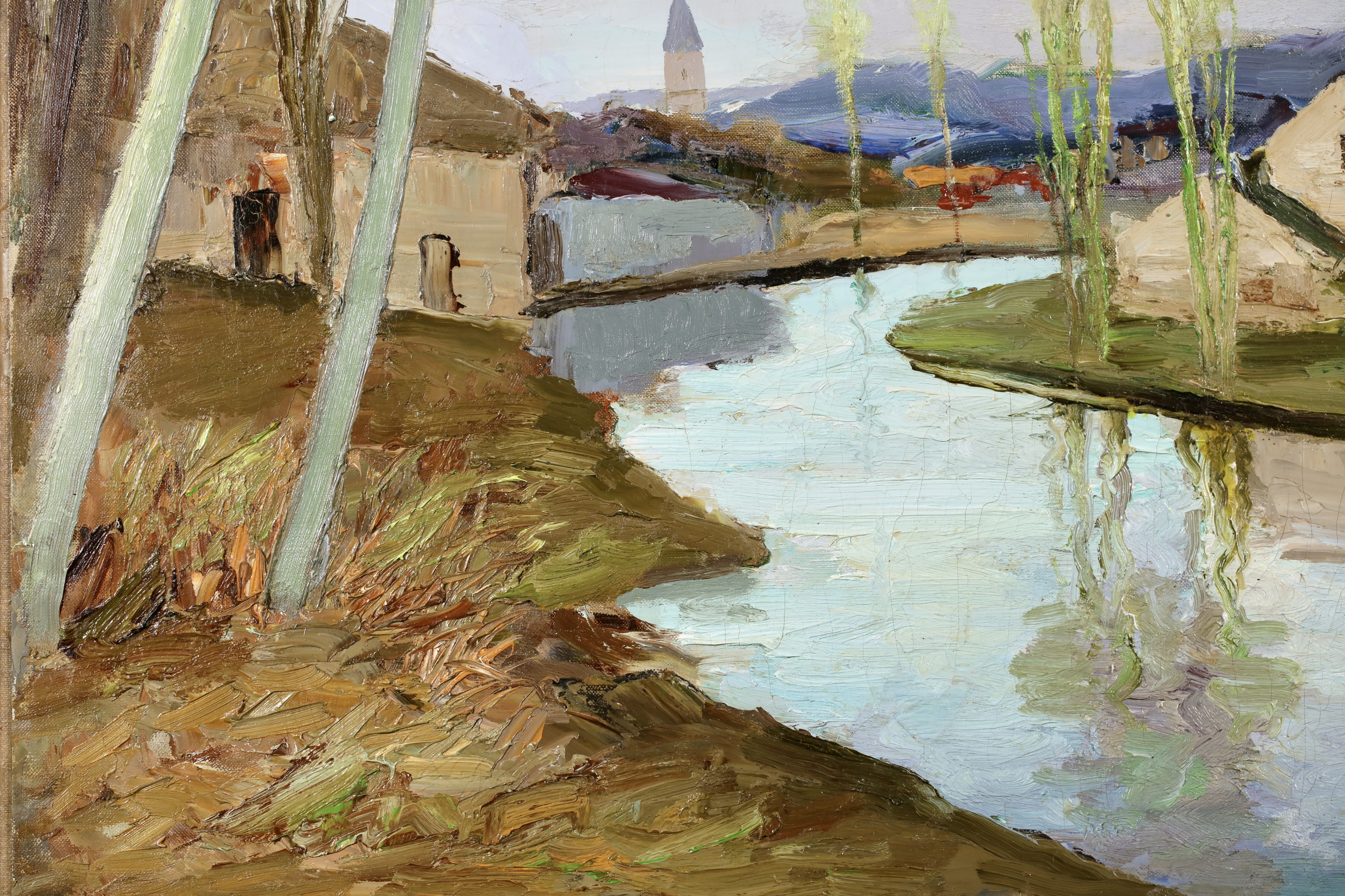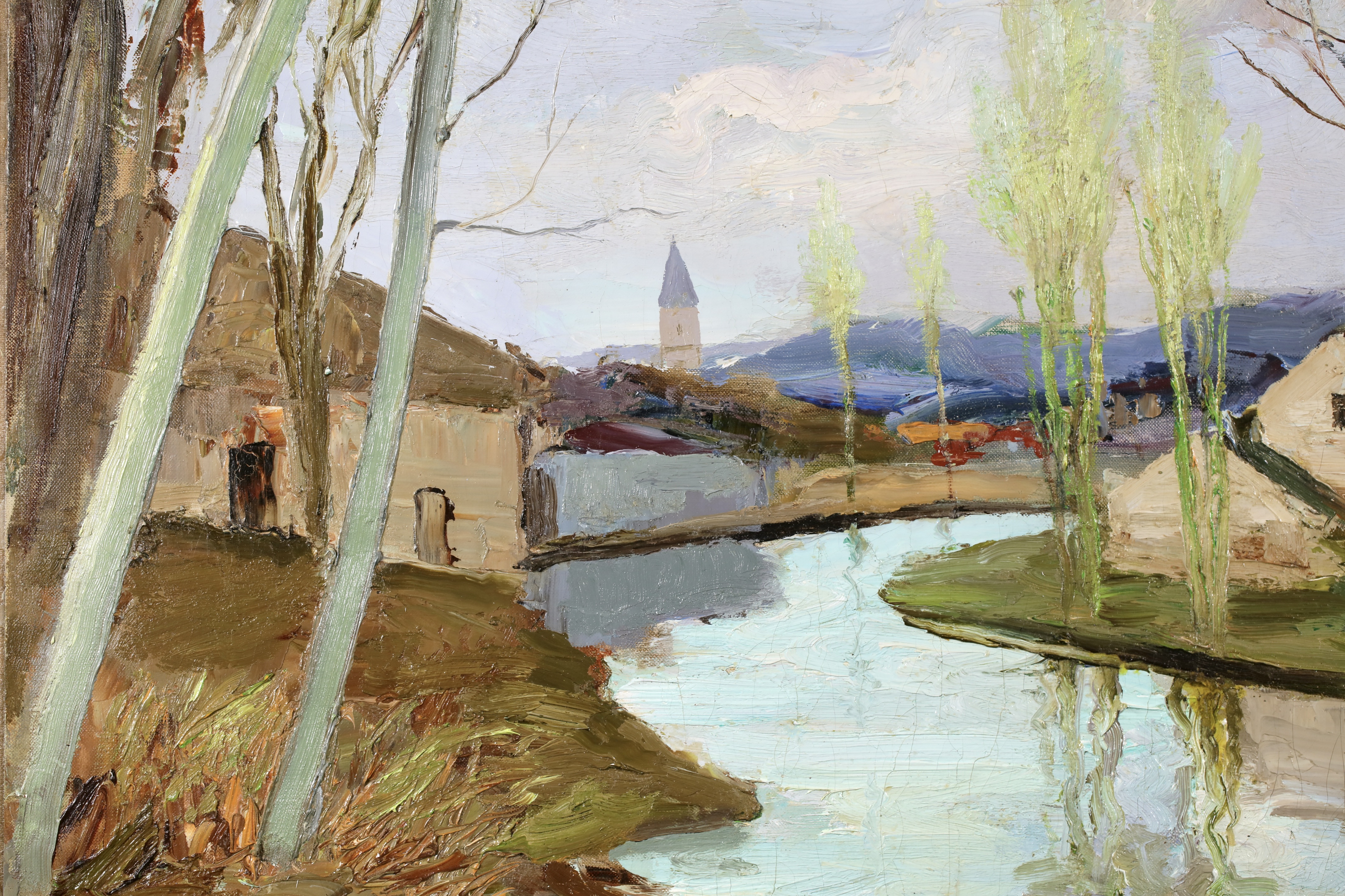 Marcel Dyf’s art derived from classical tradition and from moderate Post-Impressionism. His landscapes, which form the greater part of his output, are often painted in shades of ochre and in horizontal planes, with additional matter worked in. He produced many in the Île-de-France, in Provence where he lived, in Brittany and Normandy, in Venice, Morocco and Israel. He also painted portraits and figures, in the 1950s often of gypsy women, and frequently of his wife Claudine. He produced decorative work in the town halls of Stes-Maries de la Mer (Camargue) and St-Martin-de-Crau (Arles), and painted frescoes in the Musée Arlaten in Arles in 1936.
