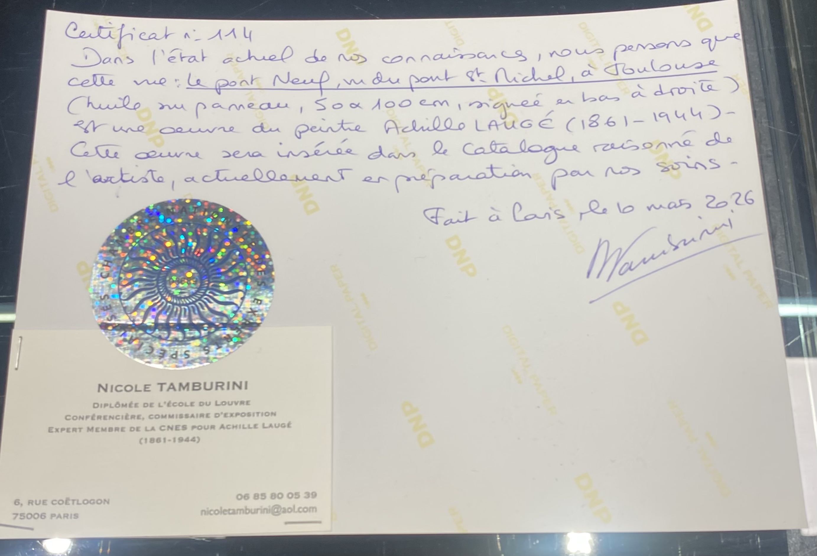 This work is accompanied by a photo certificate from Mme. Nicole Tamburini and will be included in the forthcoming raisonne of the work of Achille Lauge under preparation by Mme. Tamburini under certificate reference number 114