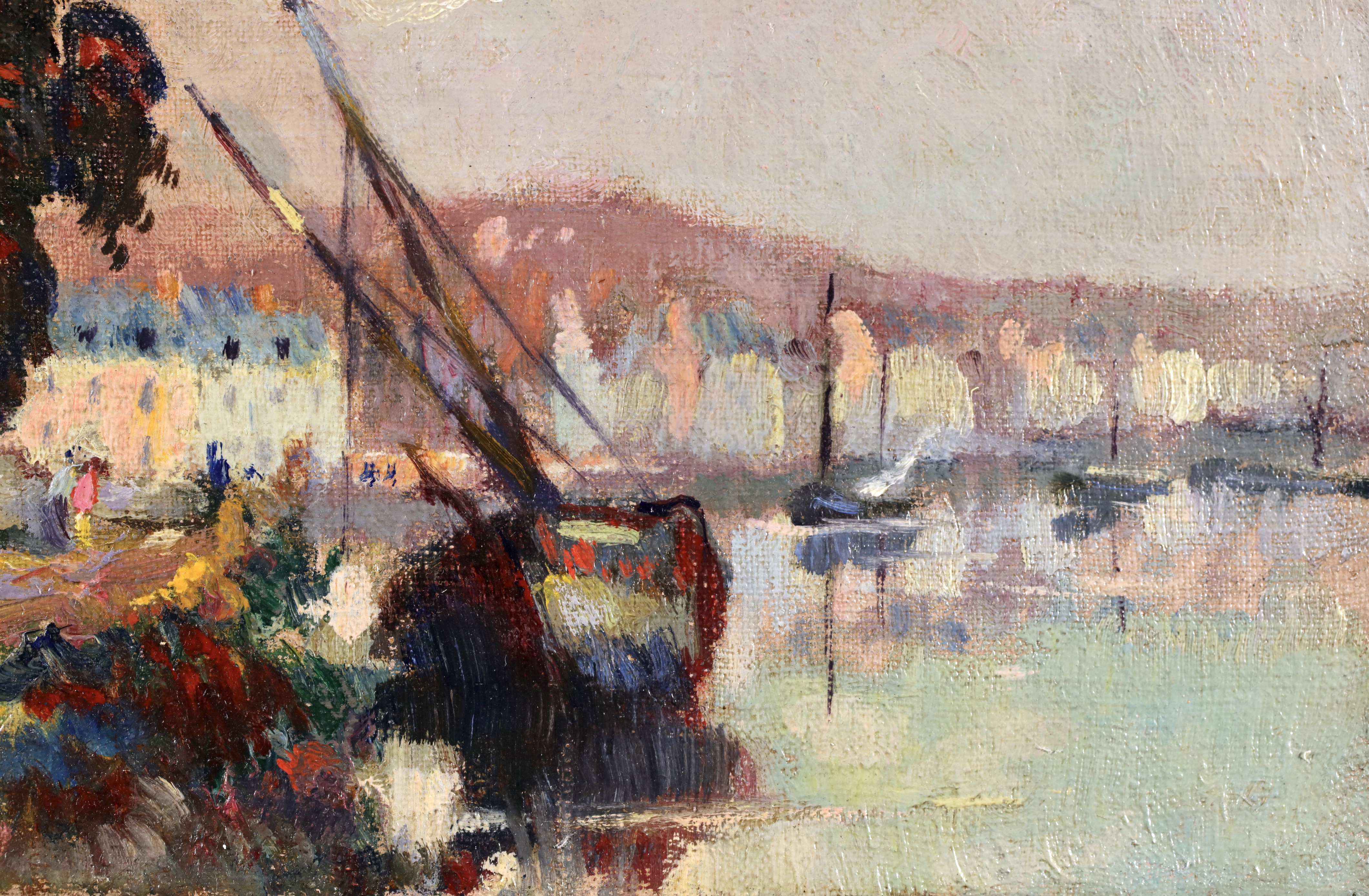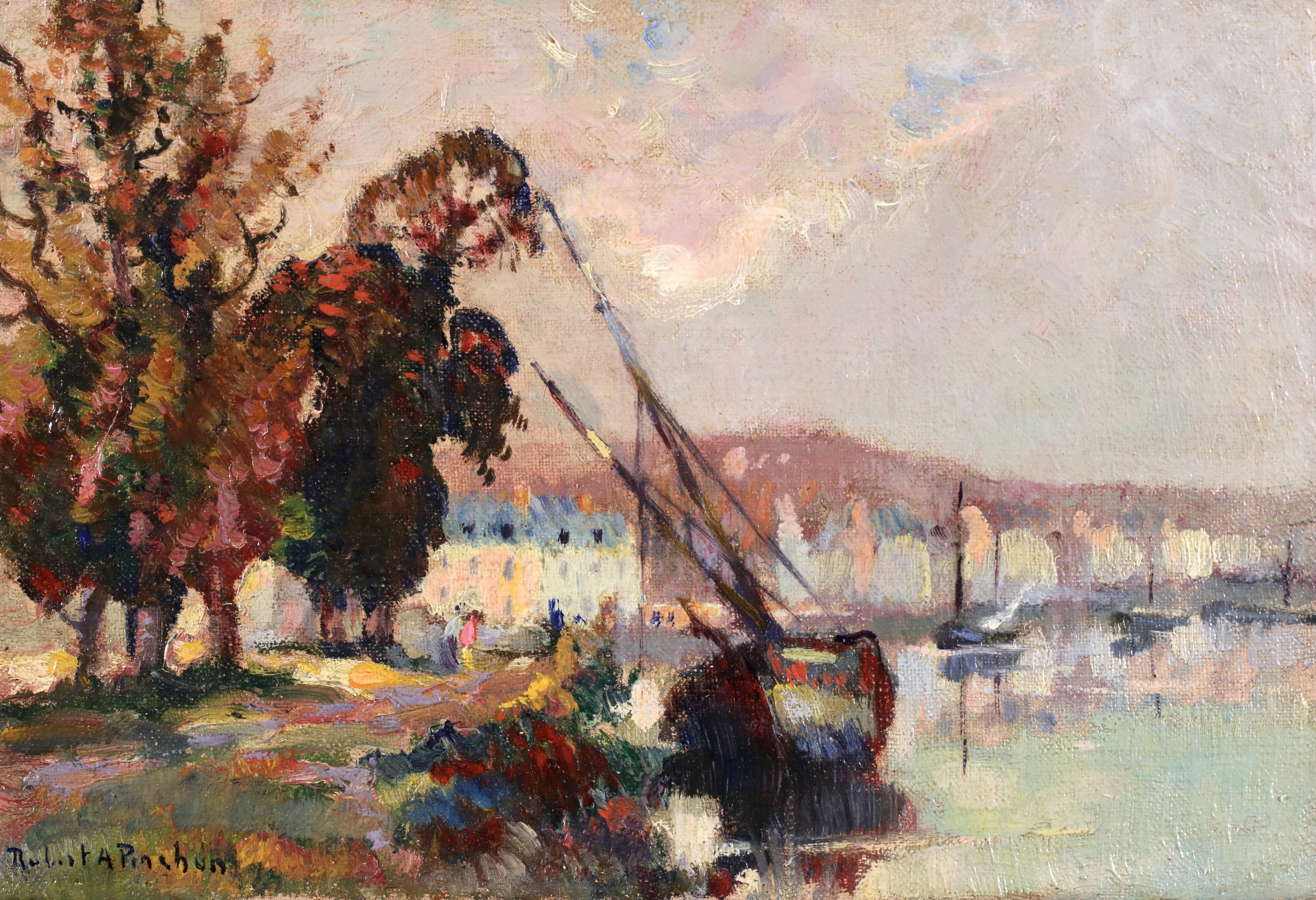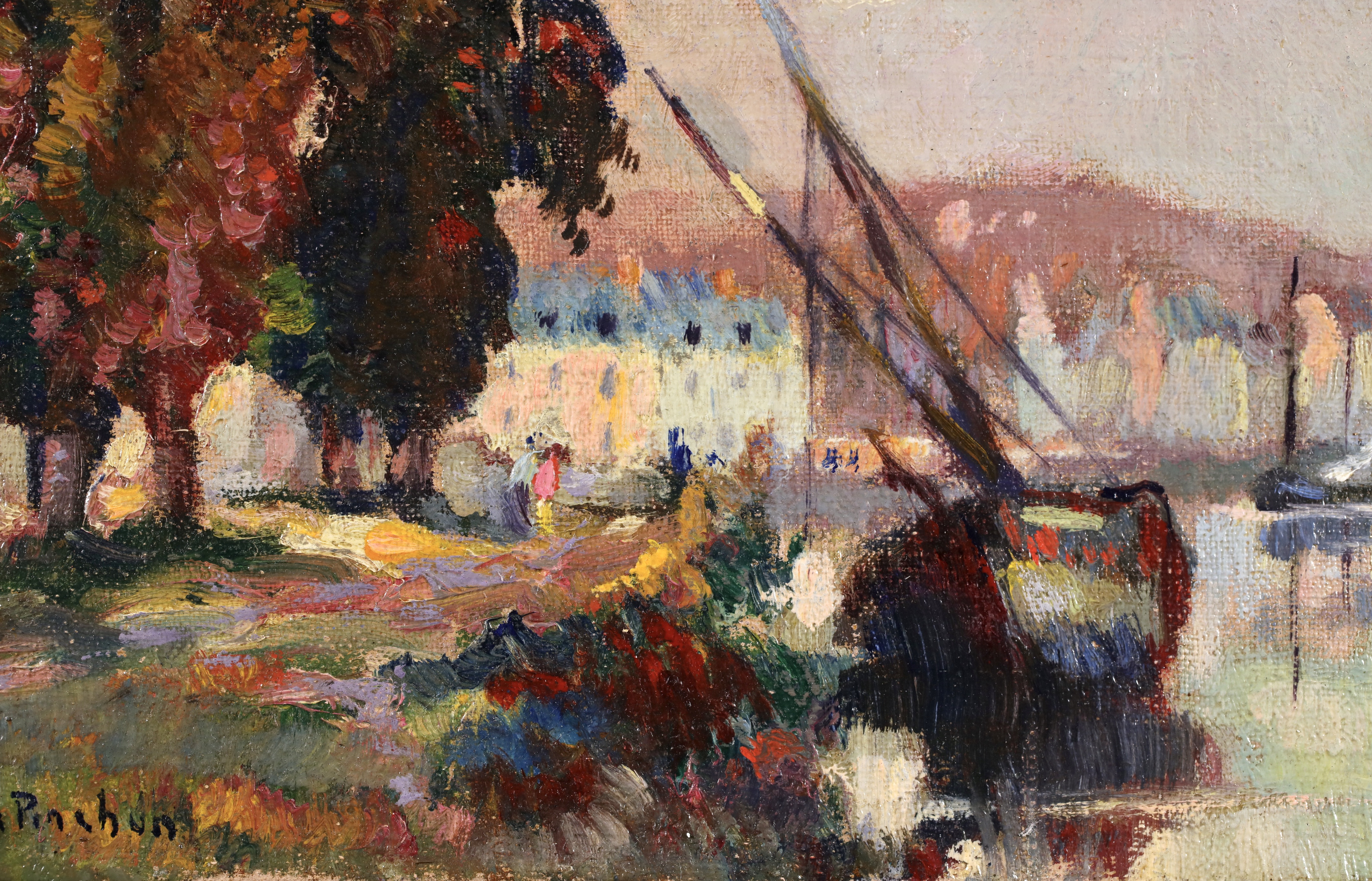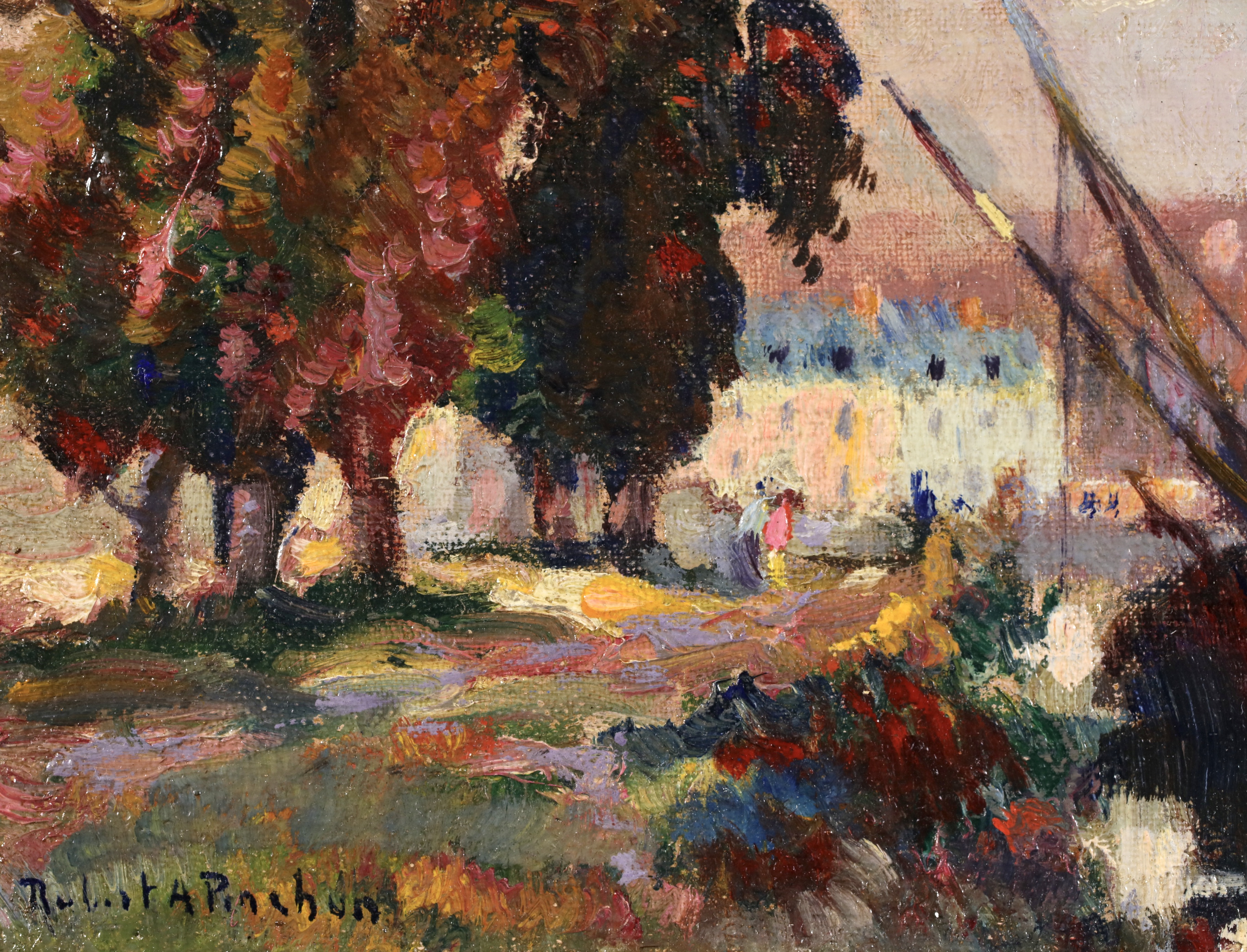 Along with Dumont and Guilbert, Robert Pinchon is one of the Rouen artists who understood Monet's teachings best. Monet himself noticed Pinchon's 'eye' when he met him for the first time. On a technical level, he used pure colours, just as they came out of the tube. His poetical art perfectly rendered not only the misty lights of the port of Rouen, but also scenes of daily life, whether of a young woman sitting in a garden or children playing with a ball. Noteworthy are: Embankment in Rouen; Rouen in the Snow; Banks of the Seine; Suspension Bridge at Elbeuf.