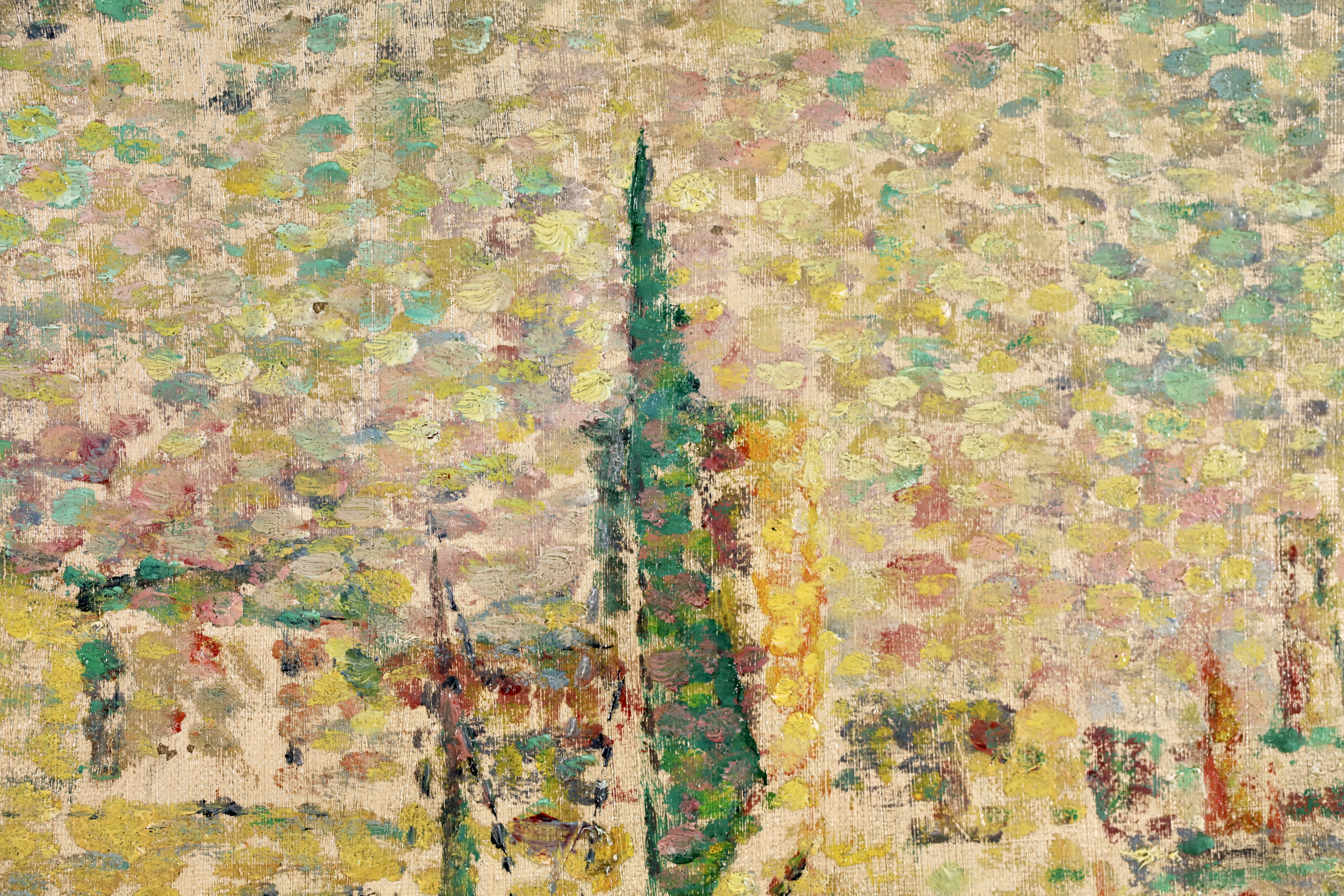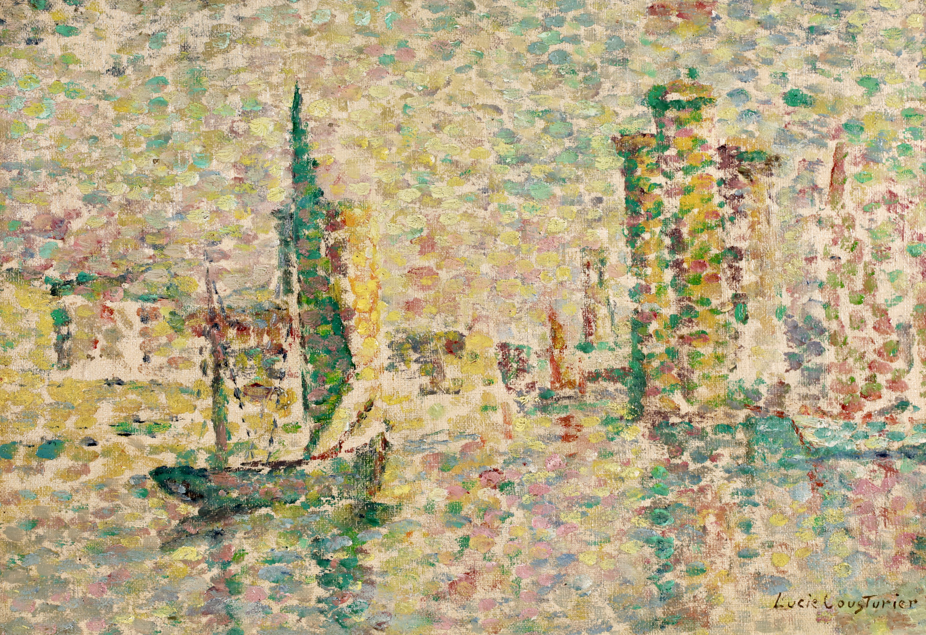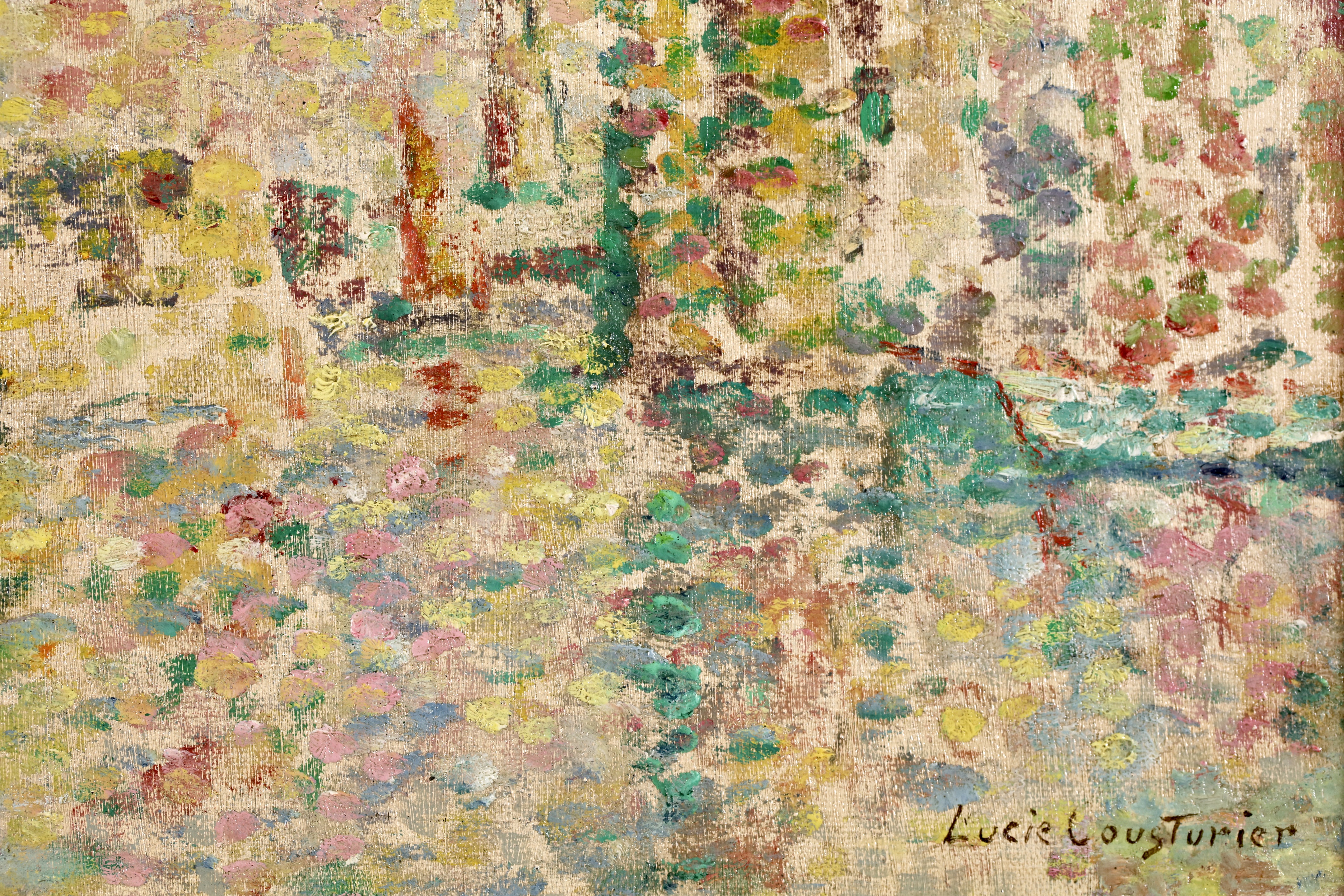 Lucie Cousturier first exhibited at the Salon des Artistes Indépendants in 1901, and was to exhibit three to eight oils there every year until 1920. She exhibited at other exhibitions in Brussels and Berlin, and at the end of 1906 gave her first solo exhibition in Paris. By 1907 she had a perfect mastery of technique and color. In her later paintings, particularly outdoors scenes, her style became increasingly fluid and free, with warm and lively colors. She exhibited with Signac regularly and had a two man show at the Galerie de Bruxelles with Signac in Brussels in 1923. Lucie also had an important writing career by writing articles and monographs about the major members of the emerging Neo-Impressionist movement. She is credited for being the first specialist writer of the movement.