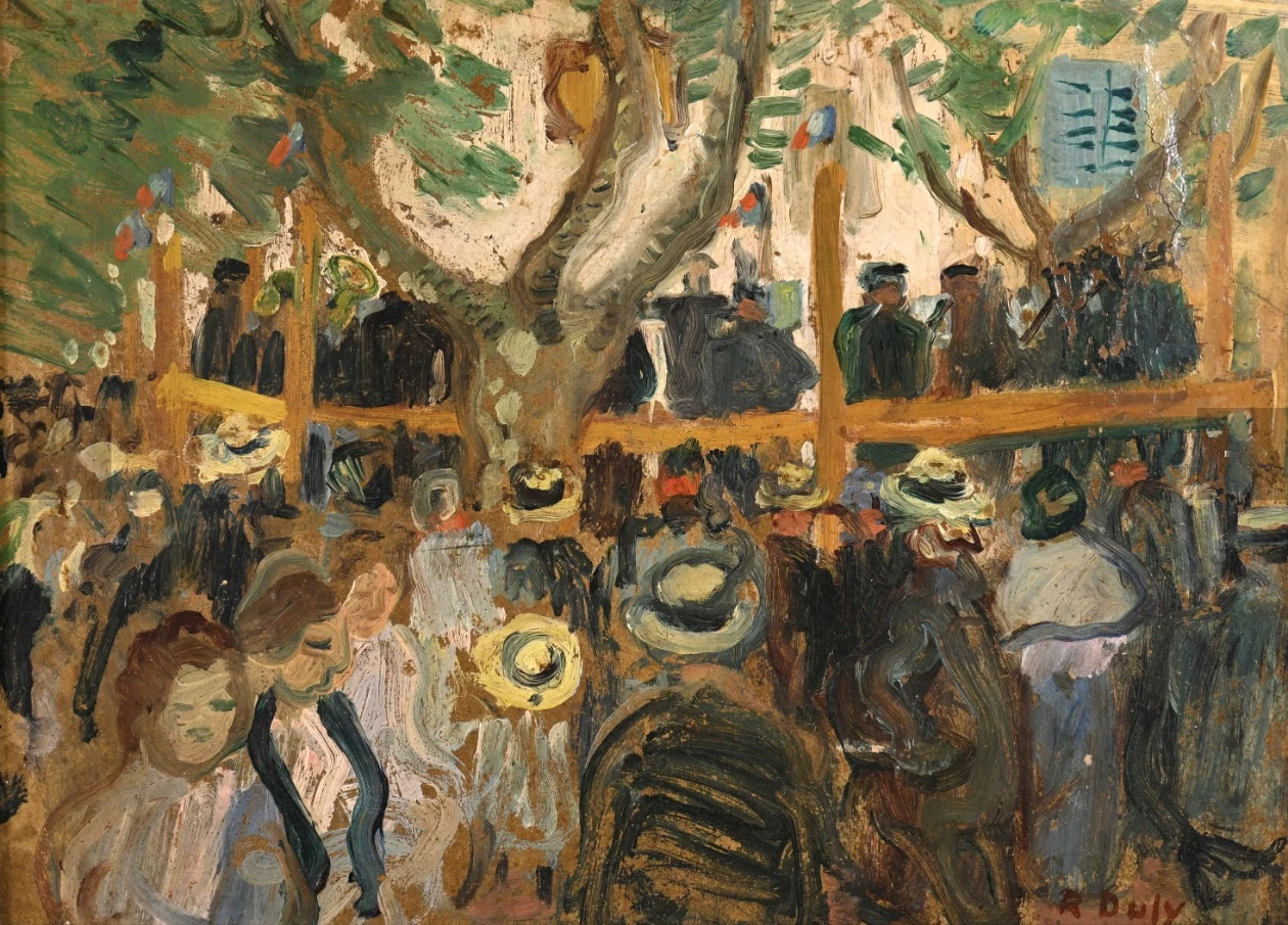 Between 1940 and 1950, Dufy went on to develop what would prove to be one of the most important series of all, his Orchestras and Concerts, featuring large orchestras and chamber music trios, quartets and the like. He had assembled from 1930 innumerable sketches of Conservatory musicians, sketched from above during rehearsals when Dufy would typically sit behind the percussion section. Following his move to Perpignan, he painted nudes, clowns, landscapes and, not least, views of wheatfields recorded while staying with Roland Dorgelès in Montsaunes in the Haute-Garonne. He also started work on the extended series entitled Cargots Noirs (1948-1952) which, painted at the end of his career, appears in some respects to be a reprise of his early views of Ste-Adresse. In these Cargots noirs, as elsewhere in his work, Dufy was at pains to 'generate light from black'. In 1943, he painted a rejoinder to Auguste Renoir's Bal du Moulin de la Galette and a Beautiful Sunday (which Dufy himself considered to be his finest work). He designed sets in 1944 for Armand Salacrou's Les Fiancés du Havre (Betrothal in Le Havre), presented at the Comédie Française. In 1946 tapestries designed by Dufy in Madame Cuttoli's studio featured at the Exhibition of French Tapestry and in 1952 he produced stage sets for Jean Anouilh's Ring Around the Moon.