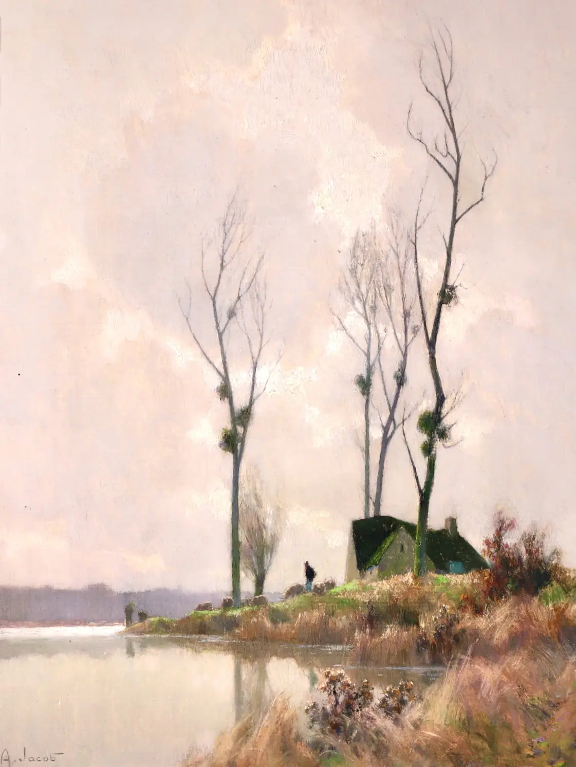 Jacob was a pupil of Eugène Claude. He was noted for his effects evoking the light of dawn and dusk. From 1899, he exhibited in Paris at the Salon des Artistes Français, of which he became a member in 1902. He received an honourable mention in 1908, a gold medal hors concours in 1914 and a gold medal at the Exposition Internationale in 1937. He exhibited there until 1950. He also showed at the Salon d'Hiver, the Salon des Aquarellistes, as well as in private galleries.
