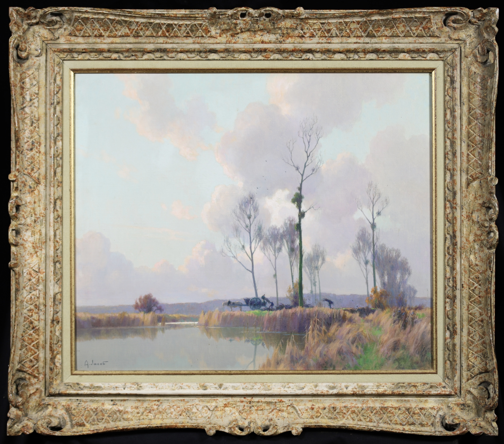 Jacob was a pupil of Eugène Claude. He was noted for his effects evoking the light of dawn and dusk. From 1899, he exhibited in Paris at the Salon des Artistes Français, of which he became a member in 1902. He received an honourable mention in 1908, a gold medal hors concours in 1914 and a gold medal at the Exposition Internationale in 1937. He exhibited there until 1950. He also showed at the Salon d'Hiver, the Salon des Aquarellistes, as well as in private galleries.