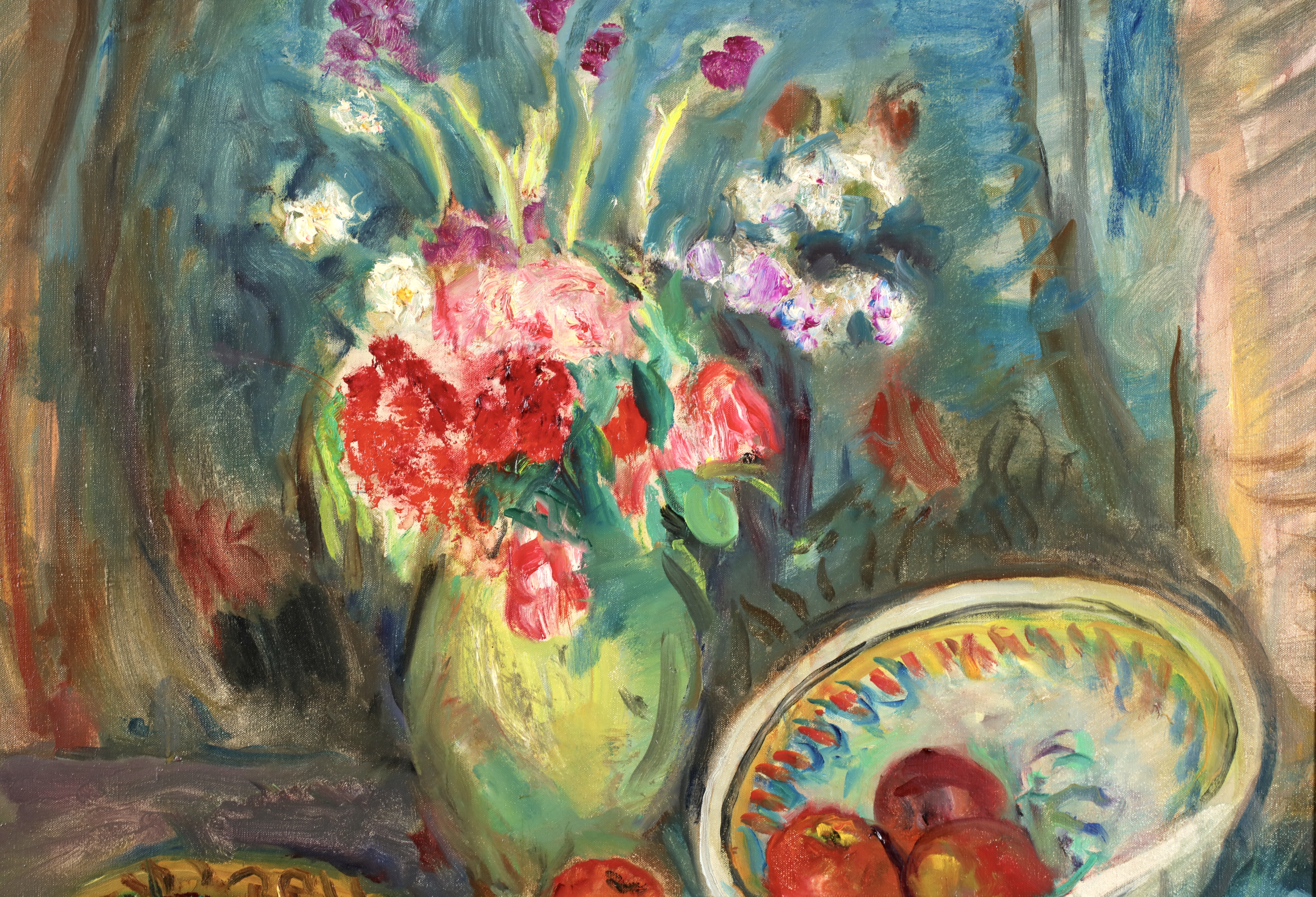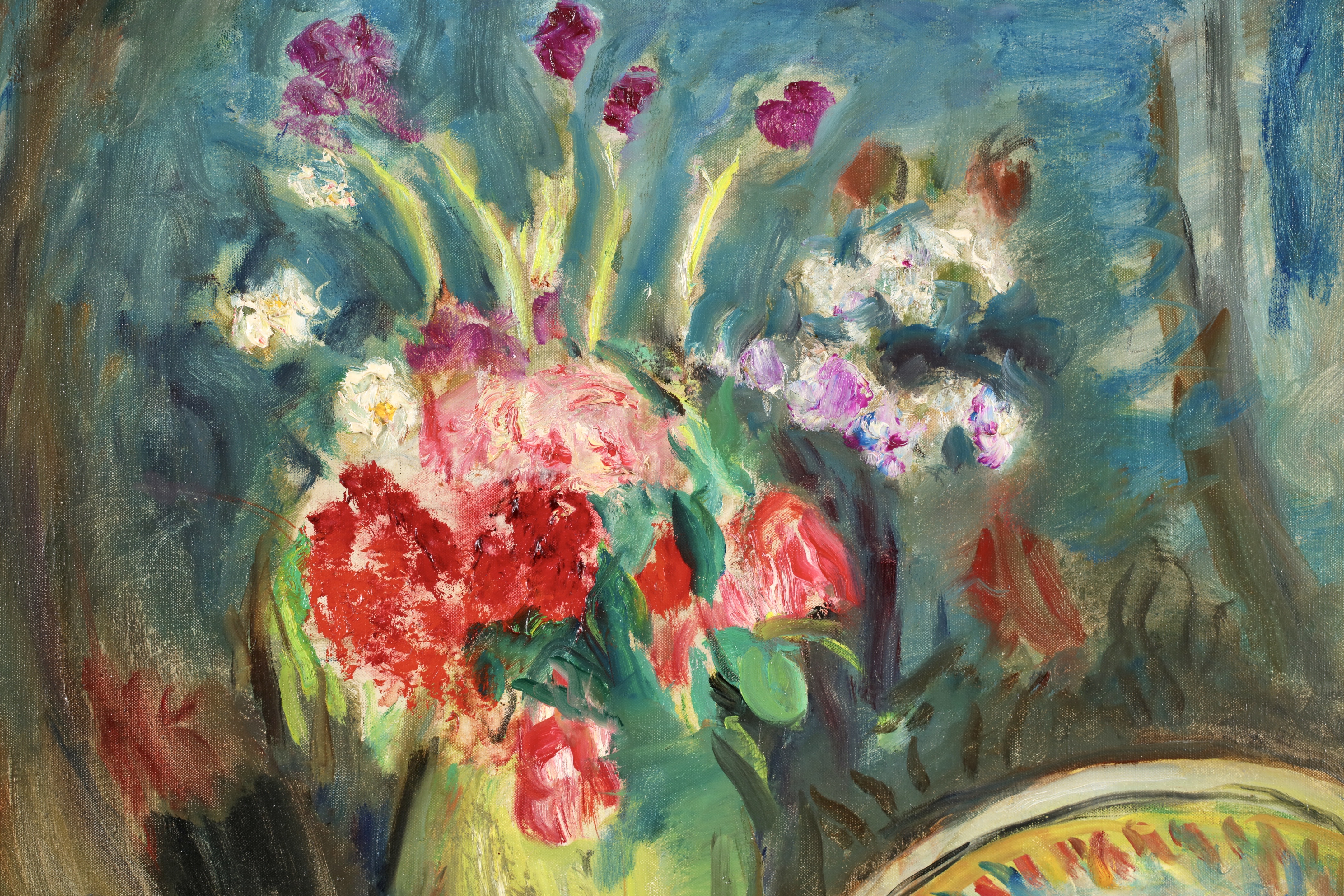 After visiting Renoir in 1918, Camoin became increasingly obsessed with light and the interplay of colours. As a result, he painted both in the studio and outdoors, directly from nature. His notebooks and journals document the difficulty he experienced in achieving a balance between the two, between as it were 'sensation' and 'construction'. In the event, he painted upwards of a hundred views of St-Tropez harbour as seen from his studio window, together with landscapes of the Var region he discovered while out walking. Camoin's productive life extended over half a century, from 1898 to 1964, but he painted little in the early years and his output while at the front during World War I consisted mainly of pastels and watercolours; equally, his output during World War II was also limited, due in part to the difficulty in obtaining materials. Nevertheless, outside those periods in his life, Camoin turned out by his own estimation some 50 canvases a year, which amounts to around 3,000 in total (of which roughly one-third were destroyed during his bout of depression). Nearly 700 of his paintings are housed in public and private collections. His output as an engraver was limited to some 30 plates as illustrations for various works. Camoin's output over the lengthy second period of his life was more restrained than in his Fauvist years. His sun-drenched landscapes full of flowers and peopled with attractive women and happy families on vacation are very much in tune with the overall hedonistic atmosphere that prevailed between the two world wars and which was typified by the 'poetic reality' of artists such as Legueult, Brianchon and Cavaillès.