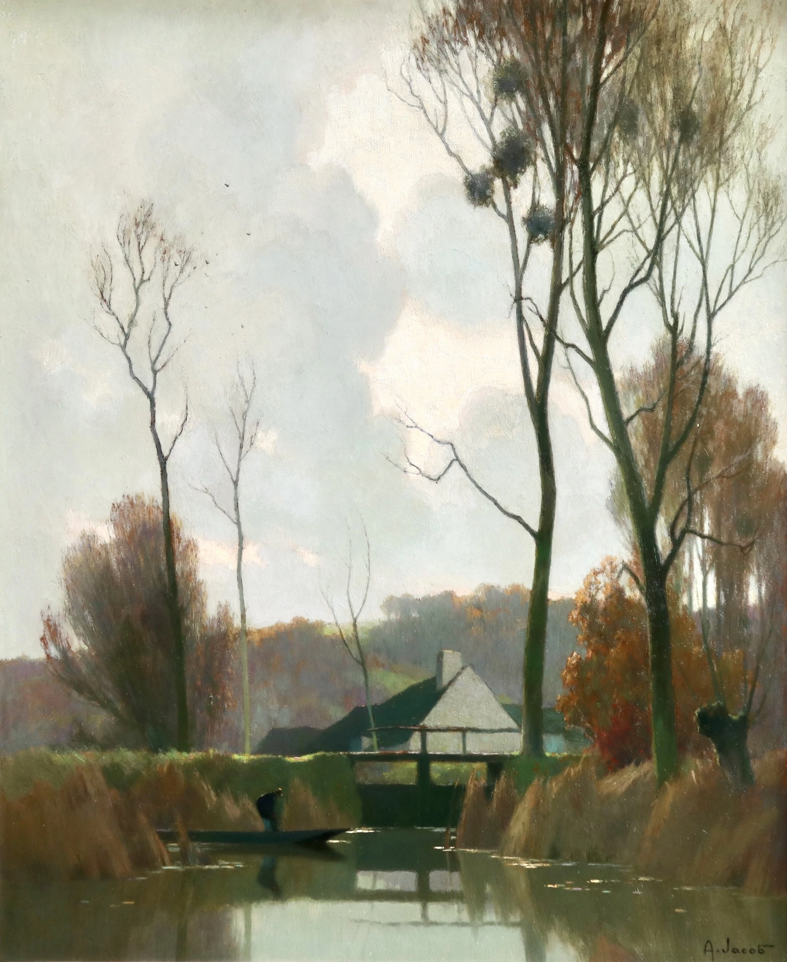 Jacob was a pupil of Eugène Claude. He was noted for his effects evoking the light of dawn and dusk. From 1899, he exhibited in Paris at the Salon des Artistes Français, of which he became a member in 1902. He received an honourable mention in 1908, a gold medal hors concours in 1914 and a gold medal at the Exposition Internationale in 1937. He exhibited there until 1950. He also showed at the Salon d'Hiver, the Salon des Aquarellistes, as well as in private galleries.