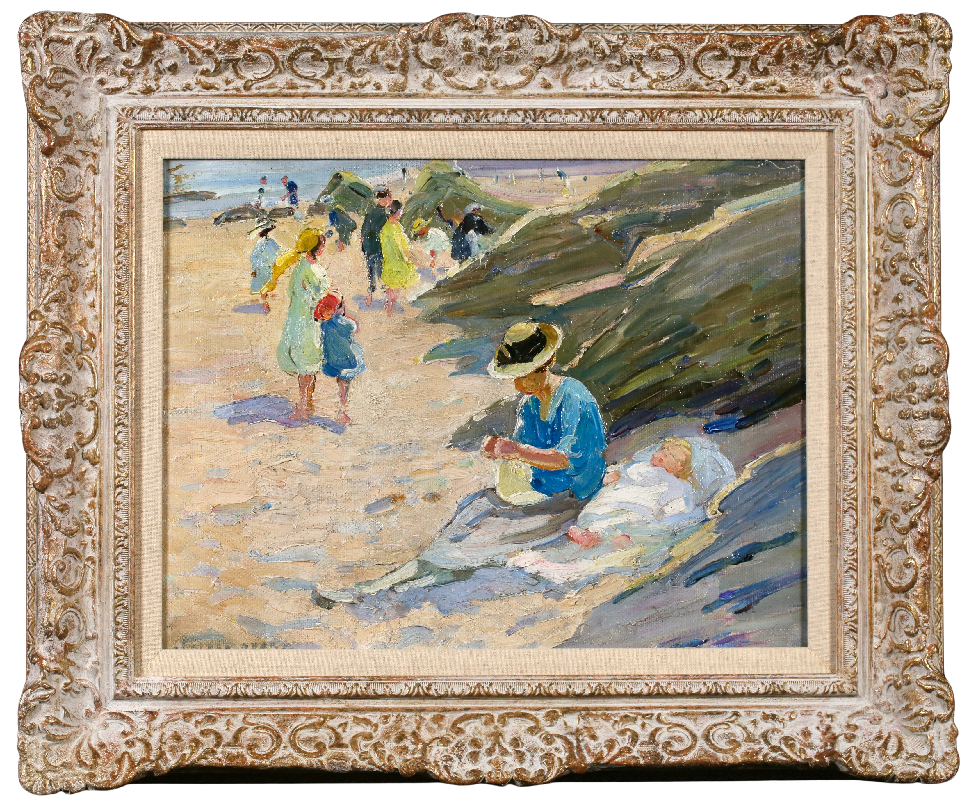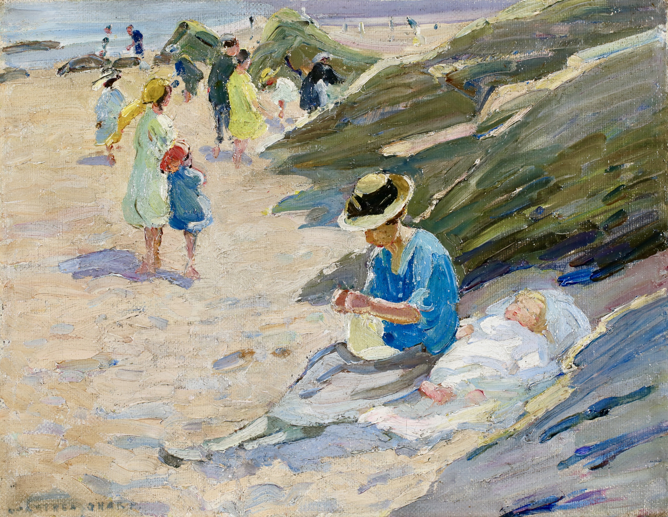Dorothea Sharp studied art in Richmond before joining London's Regent Street Polytechnic, where her teachers included David Murray and George Clausen. She also studied in Paris where she was introduced to the work of the Impressionists and in particular Claude Monet. She was a member of the Royal Society of British Artists (from 1907), the Royal Institute of Oil Painters (1922) and the Society of Women Artists (1908). She lived in London, working at studios in Maida Vale. In the 1920s and 1930s she travelled in France, Spain, Portugal and Italy. In 1928 she was appointed an honorary member of the St Ives Society of Artists and from 1940 to 1946 she settled in St Ives, where she produced many plein air paintings of beach scenes, notably including children.