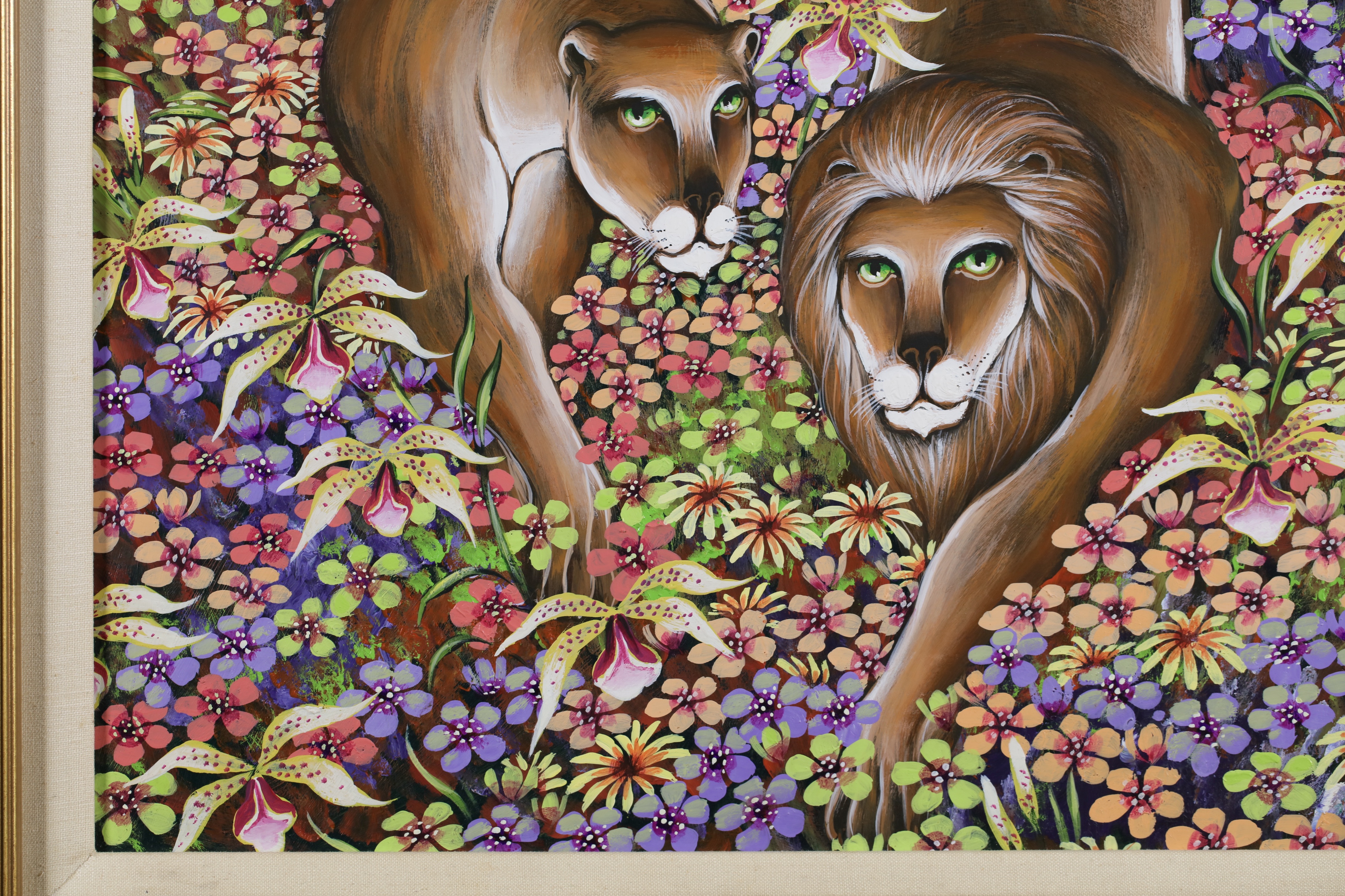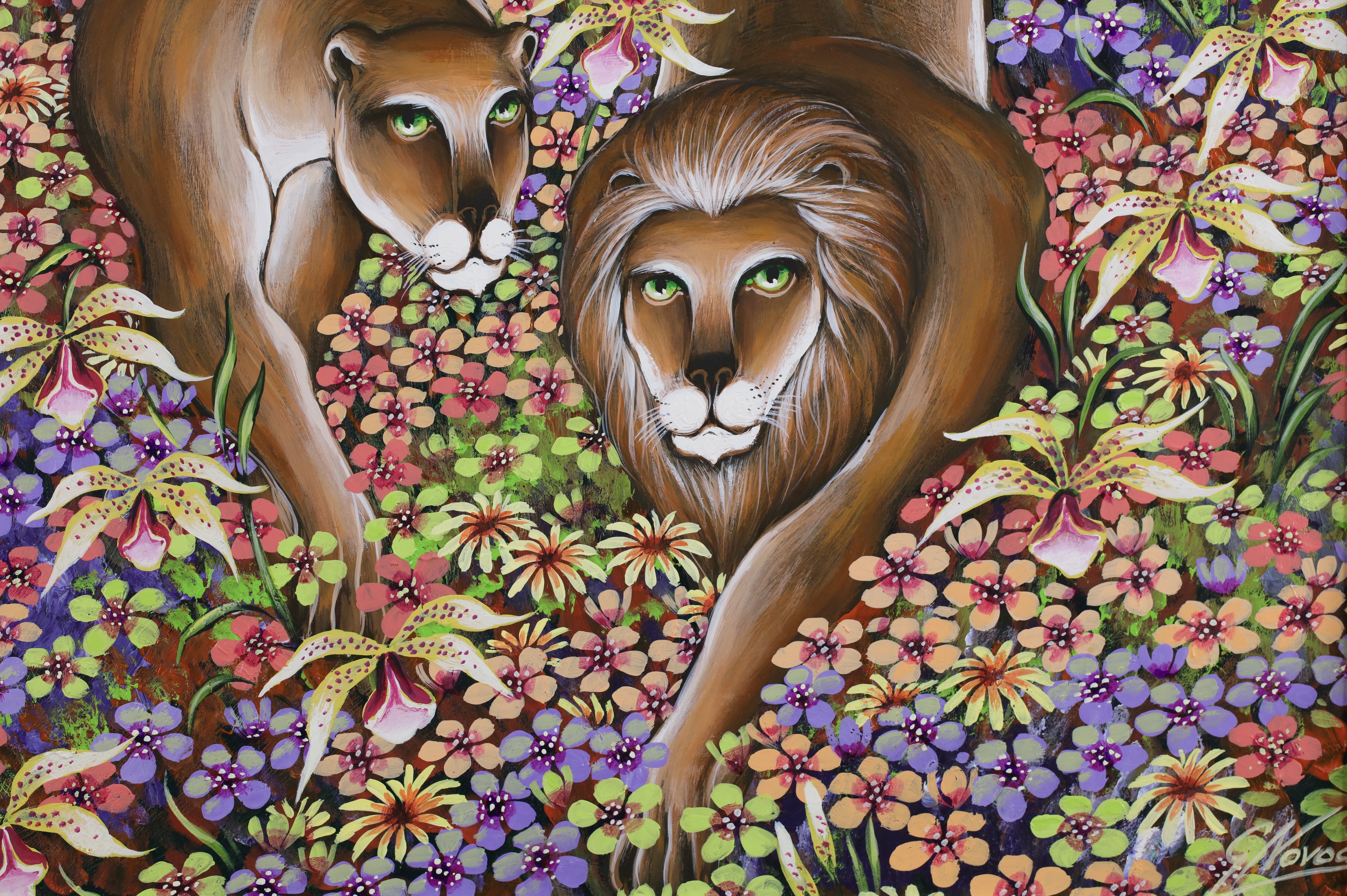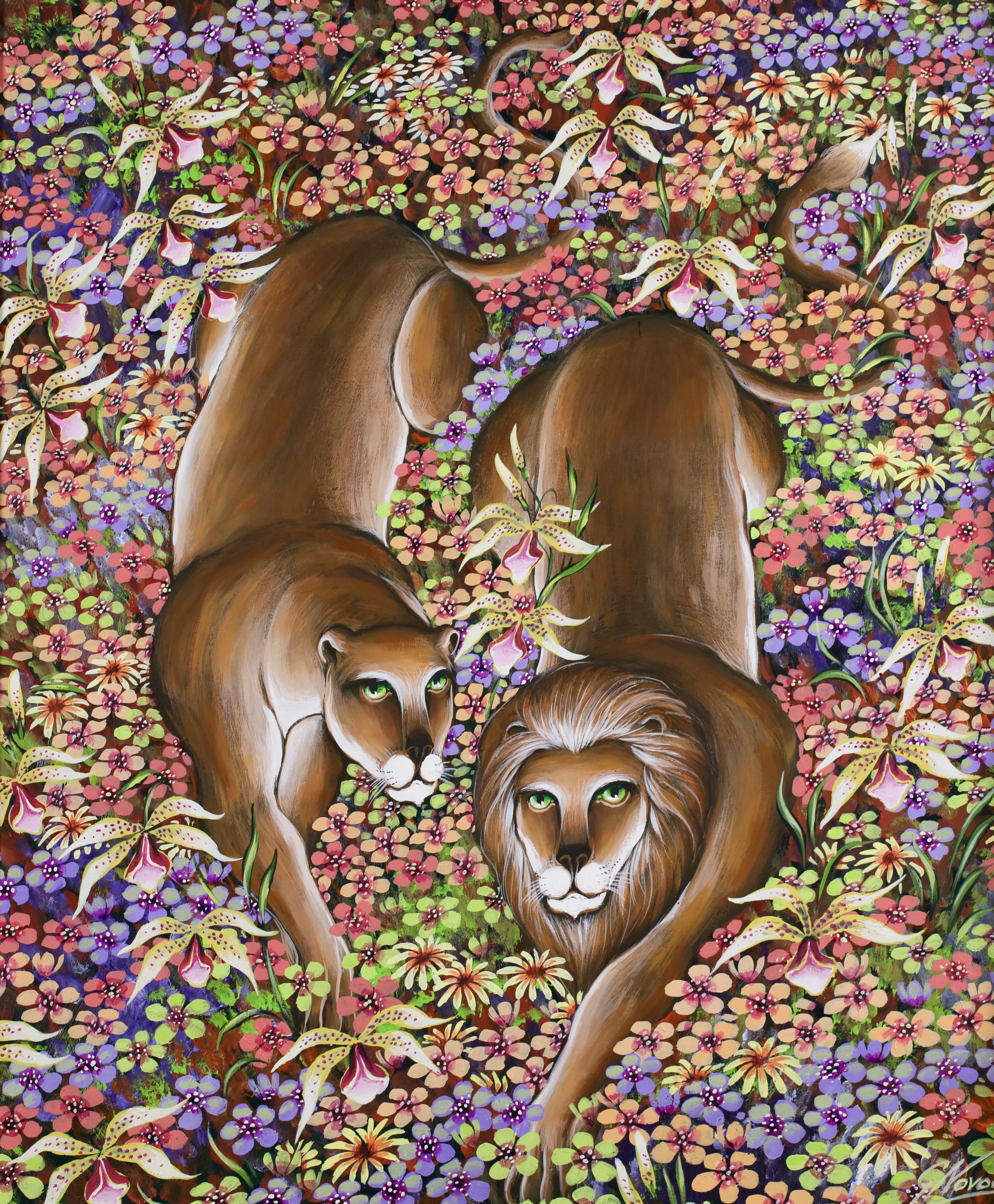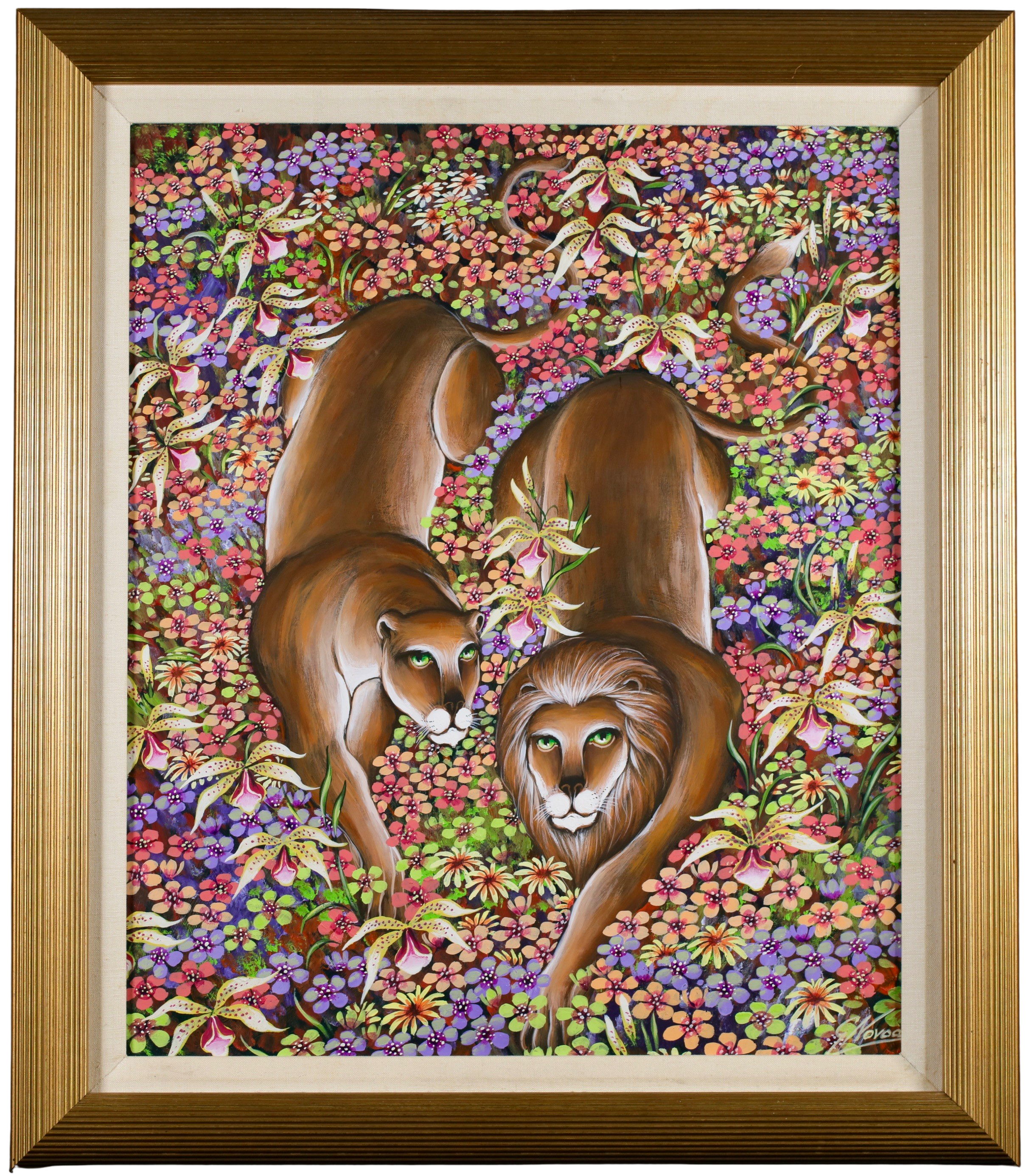 Chilean born Gustavo Novoa became represented exclusively by the Wally Findlay Galleries in the early 1970’s, and his one-man shows in New York, Paris, Palm Beach and Beverly Hills established him as a champion of ecology and wildlife preservation. His animals were primitive and painted in lush and colorful backgrounds.