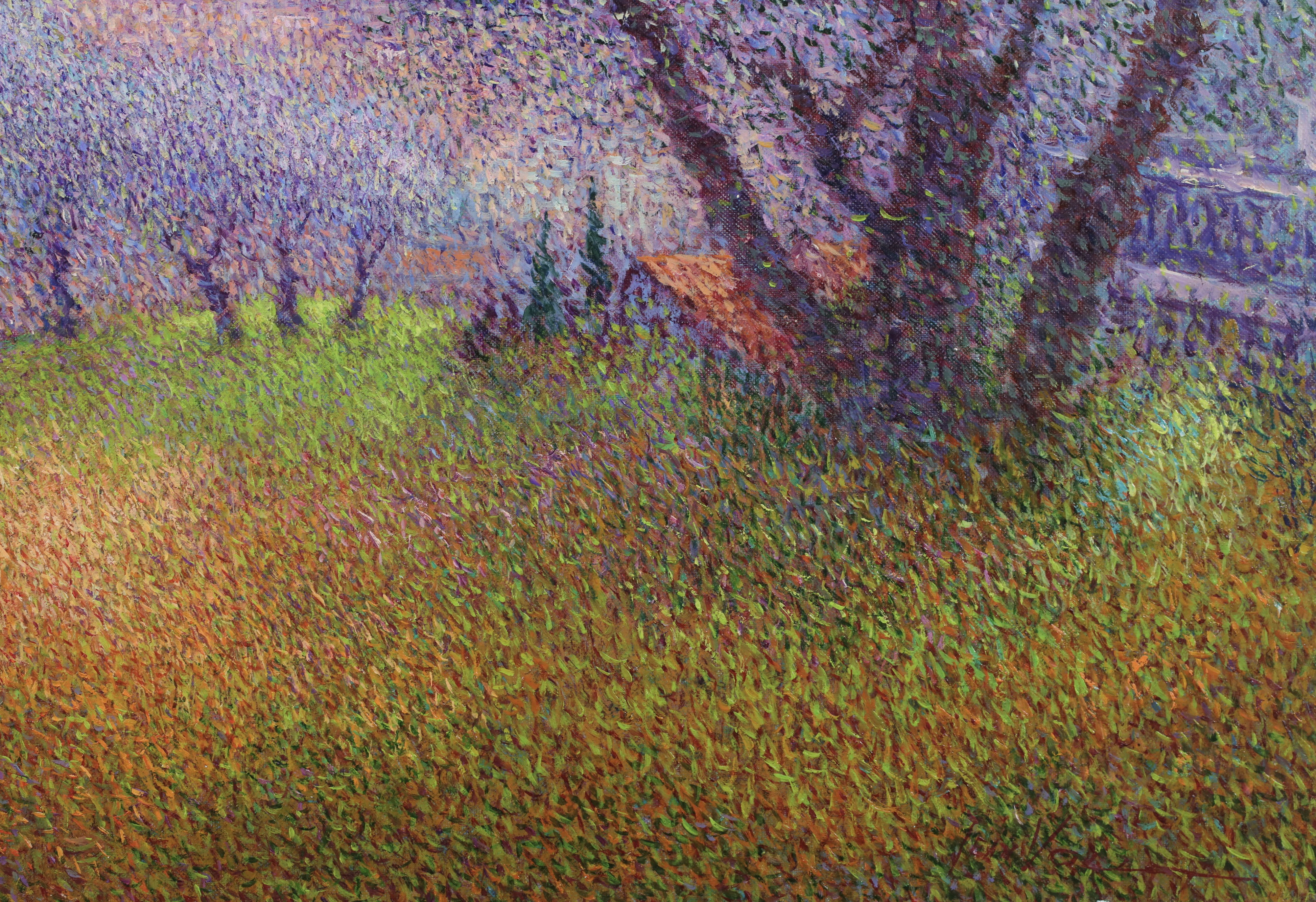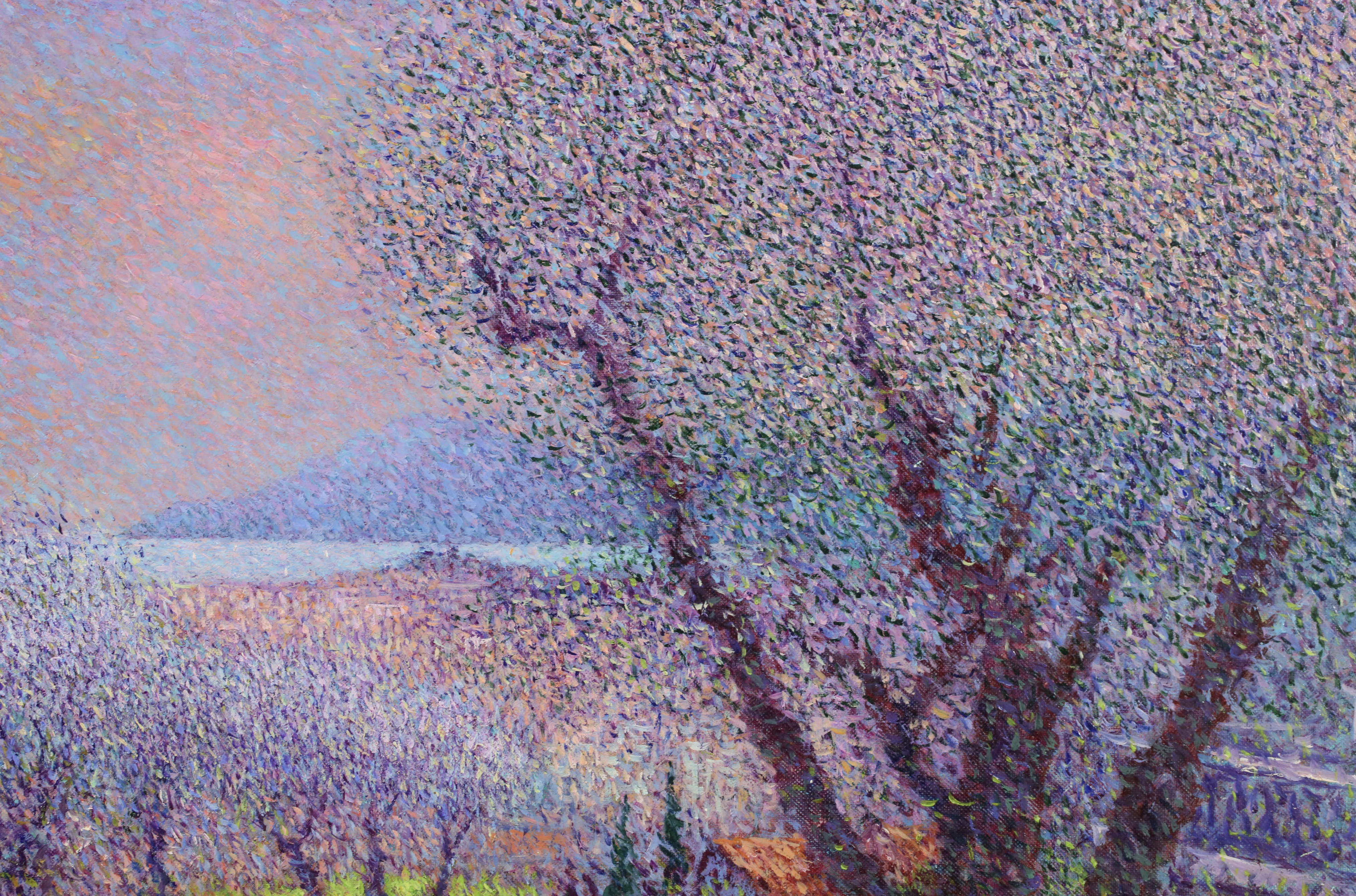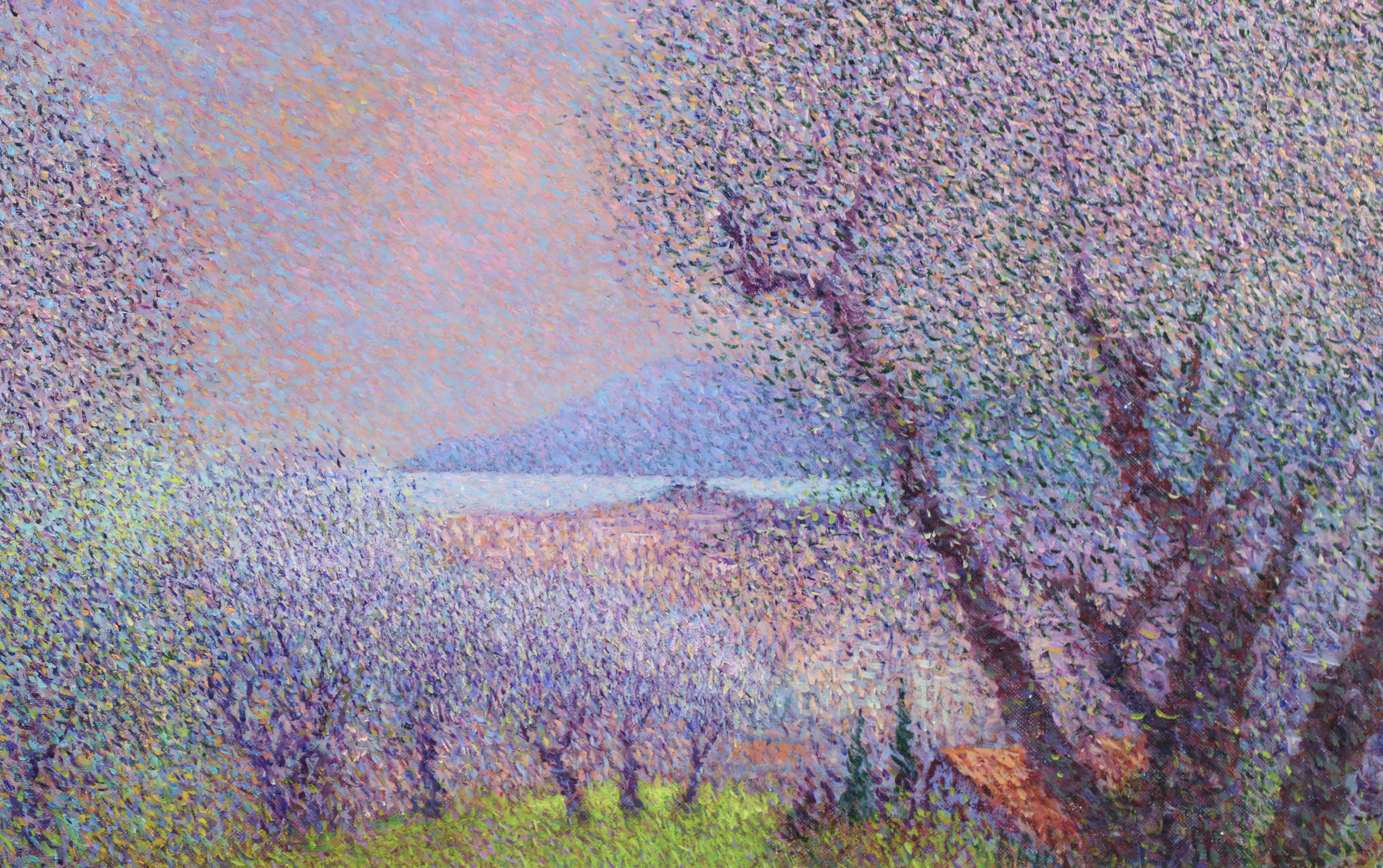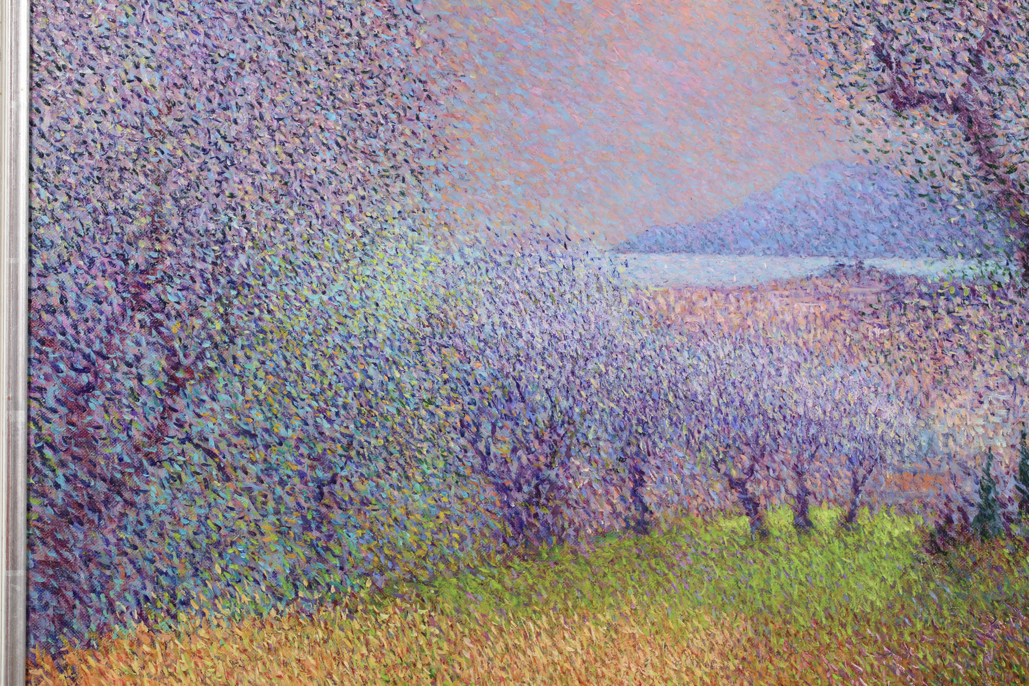 There is precise technique in Vollet's landscapes. A multitude of tiny, colored dots is blended to create movement depth and the charm of a gentle sensuality. His creative originality is demonstrated by his ability to combine tones of color : he mixes bluish-greens with the purplish-yellows to produce a new sensation of depth and an illusion of movement, shimmering with color.