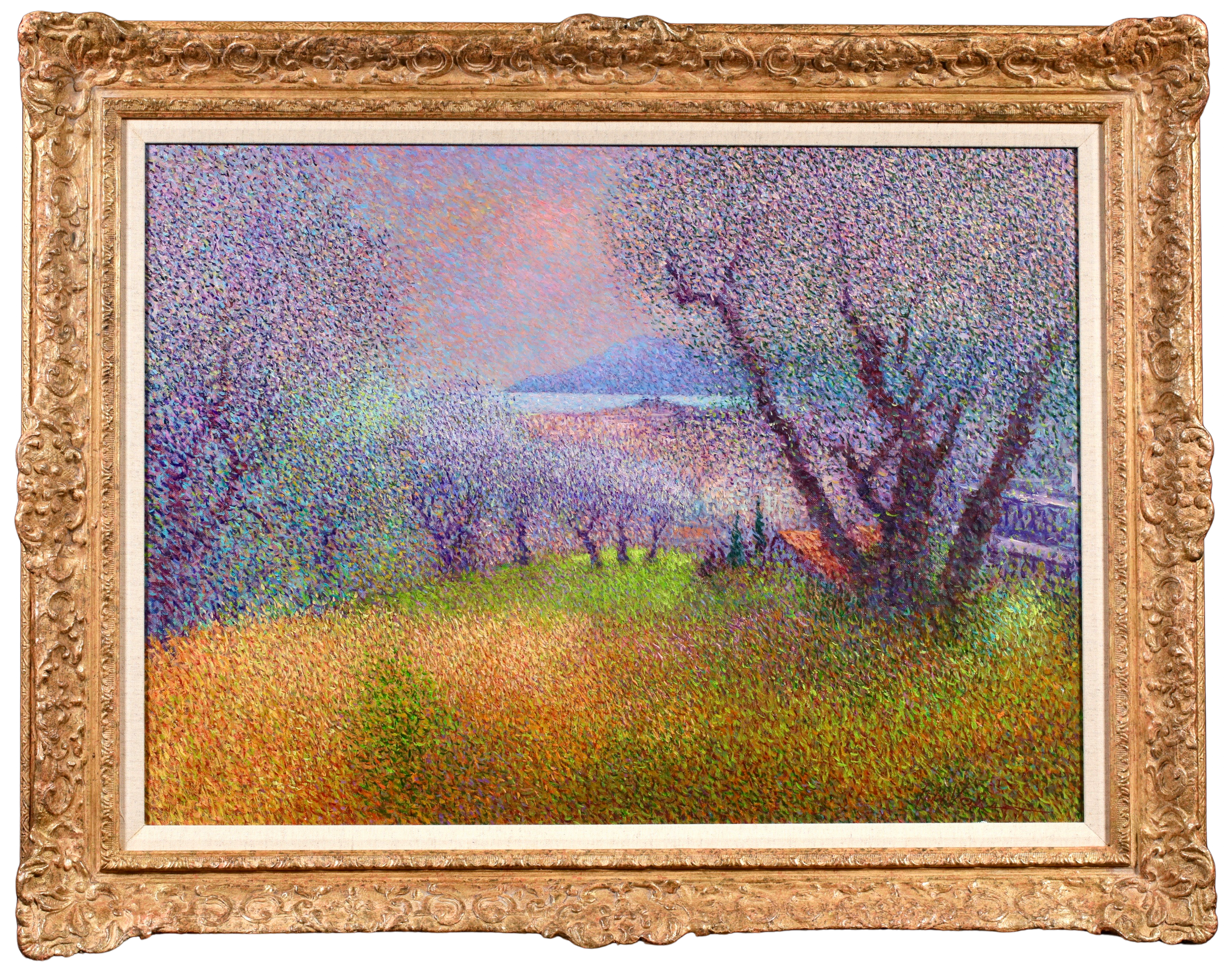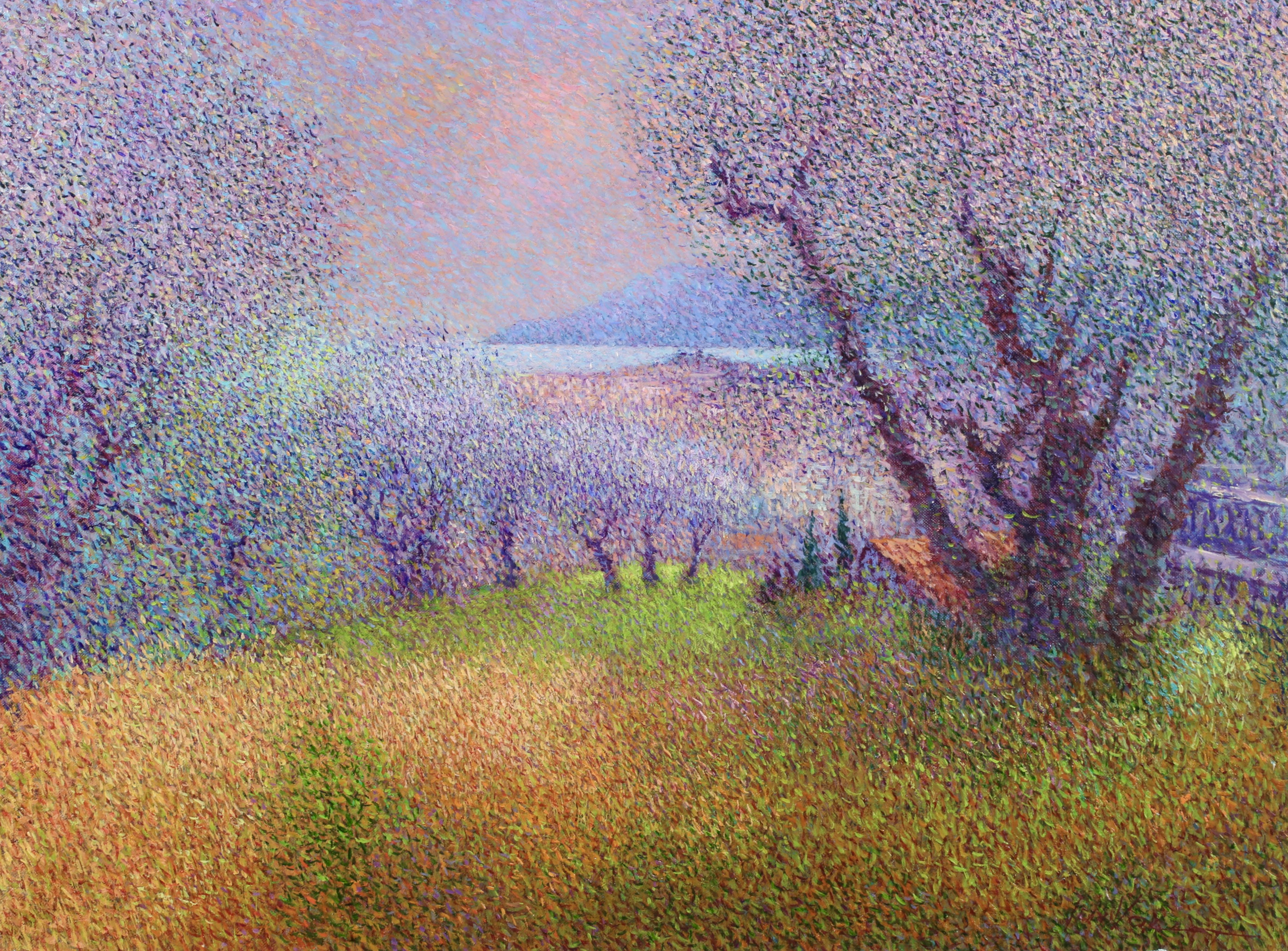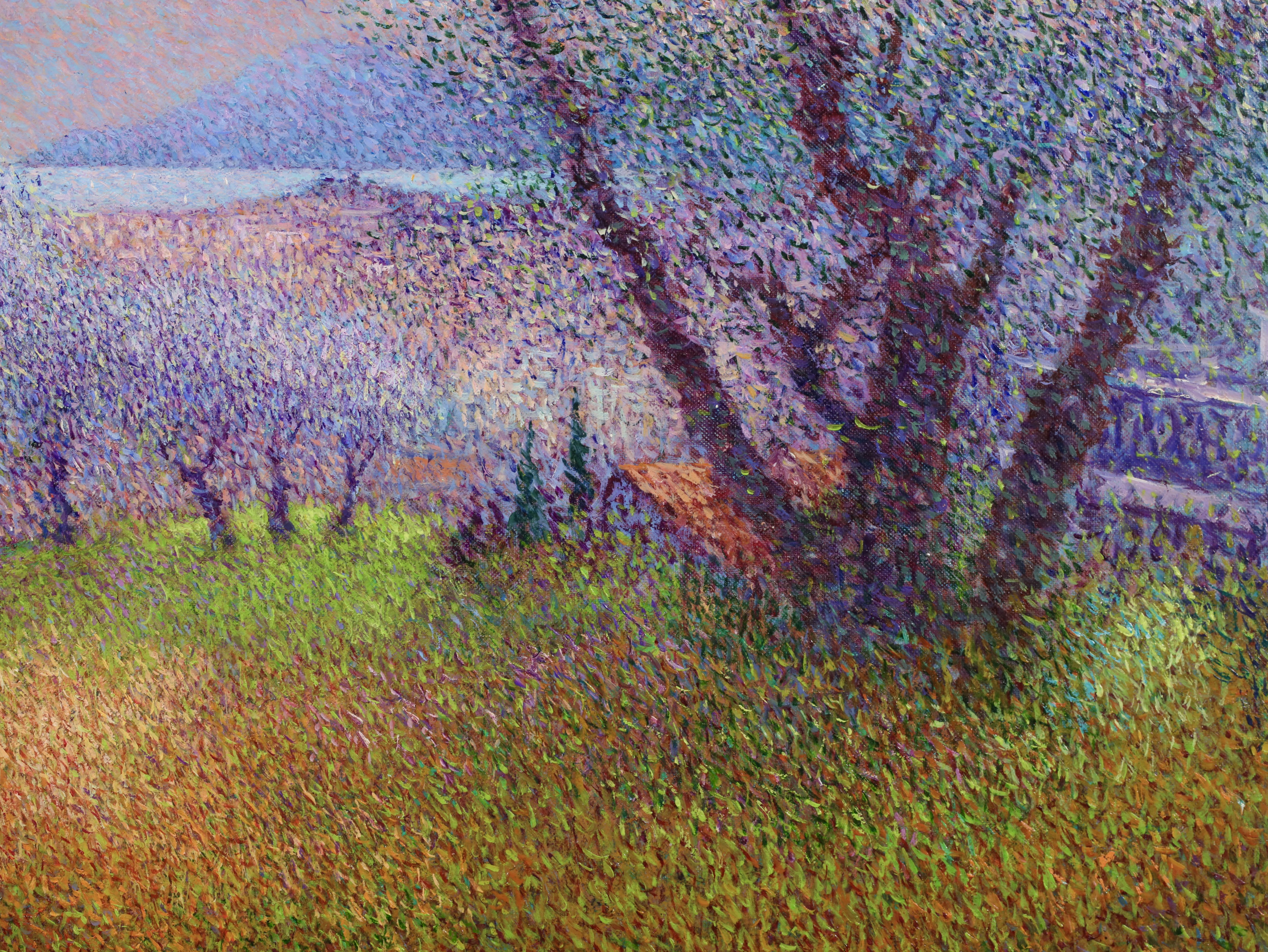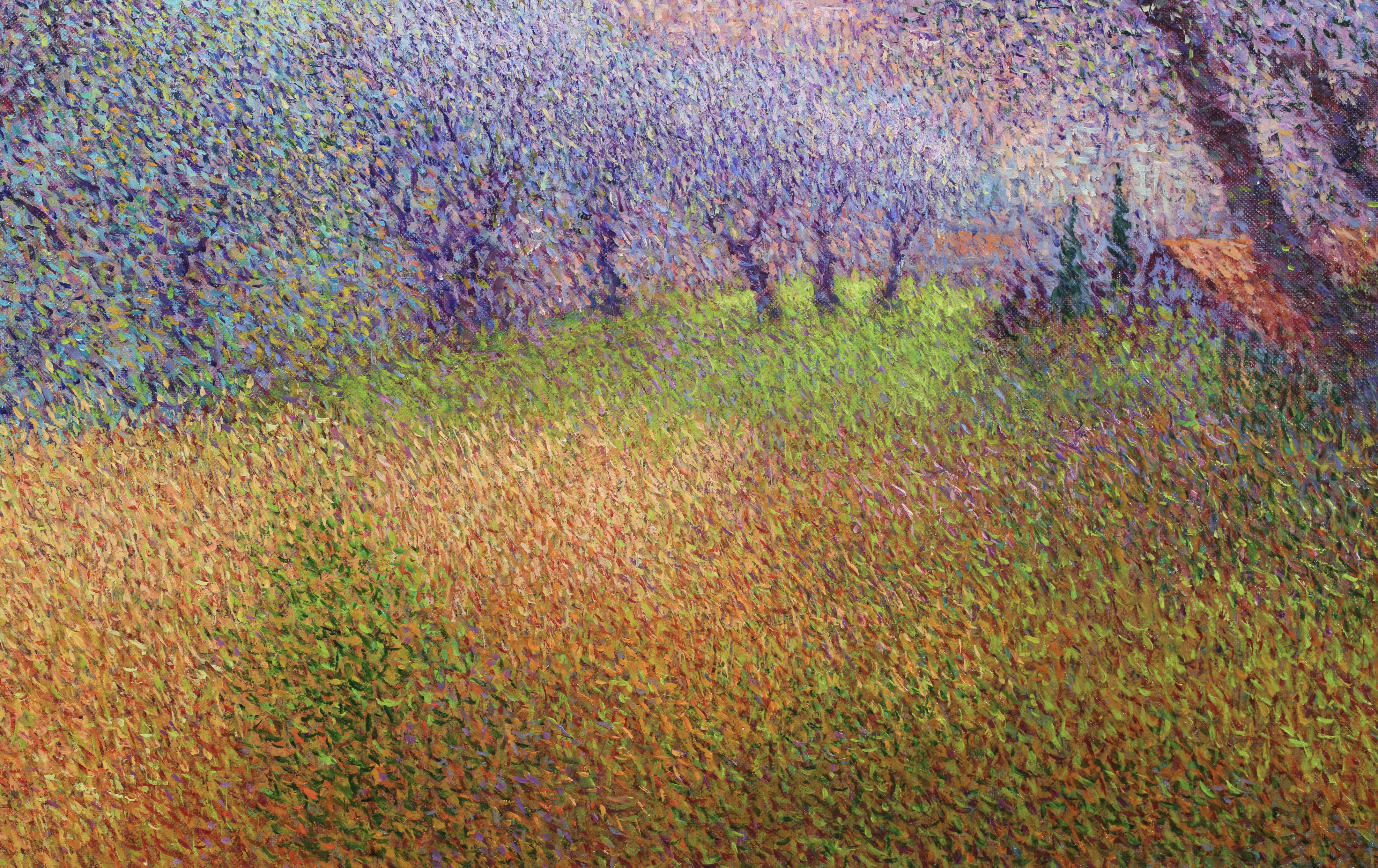 There is precise technique in Vollet's landscapes. A multitude of tiny, colored dots is blended to create movement depth and the charm of a gentle sensuality. His creative originality is demonstrated by his ability to combine tones of color : he mixes bluish-greens with the purplish-yellows to produce a new sensation of depth and an illusion of movement, shimmering with color.