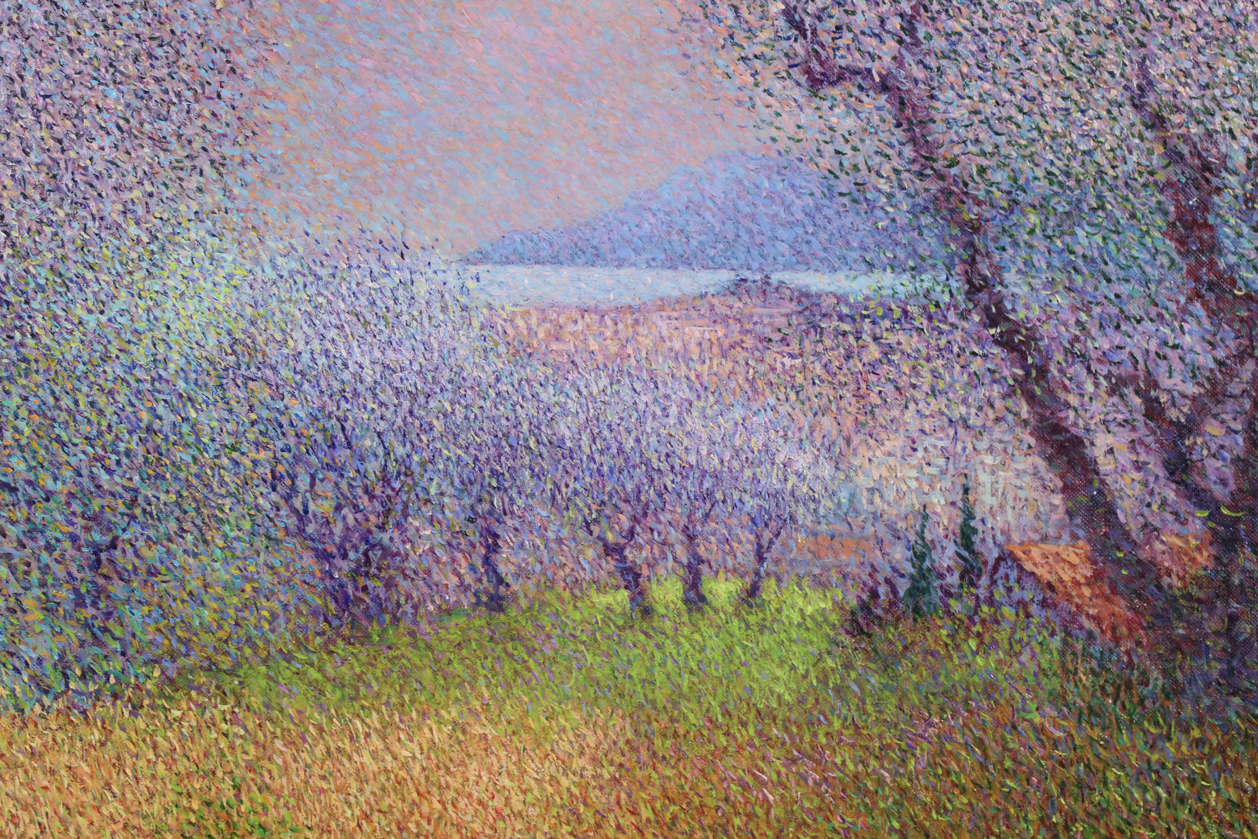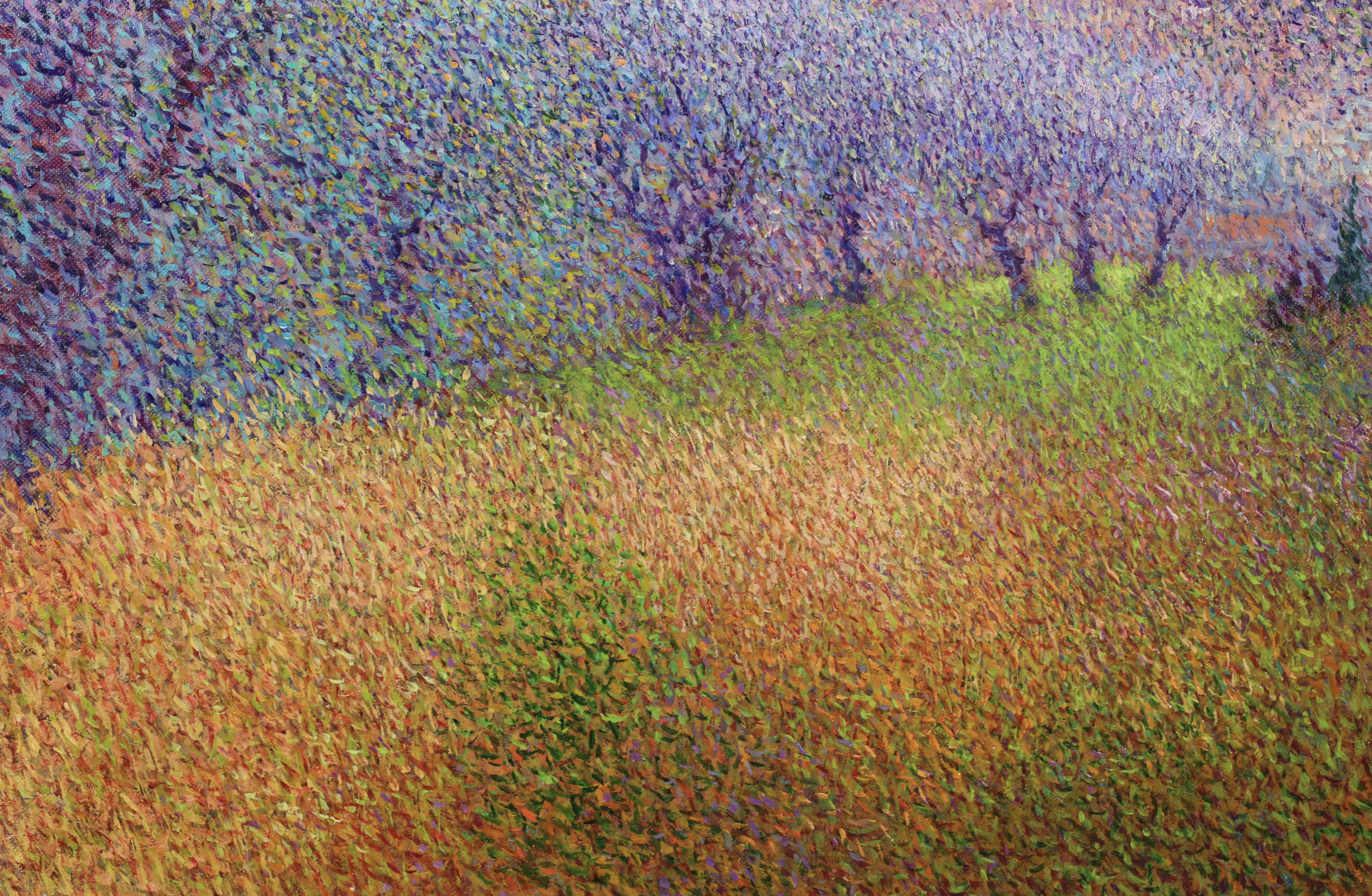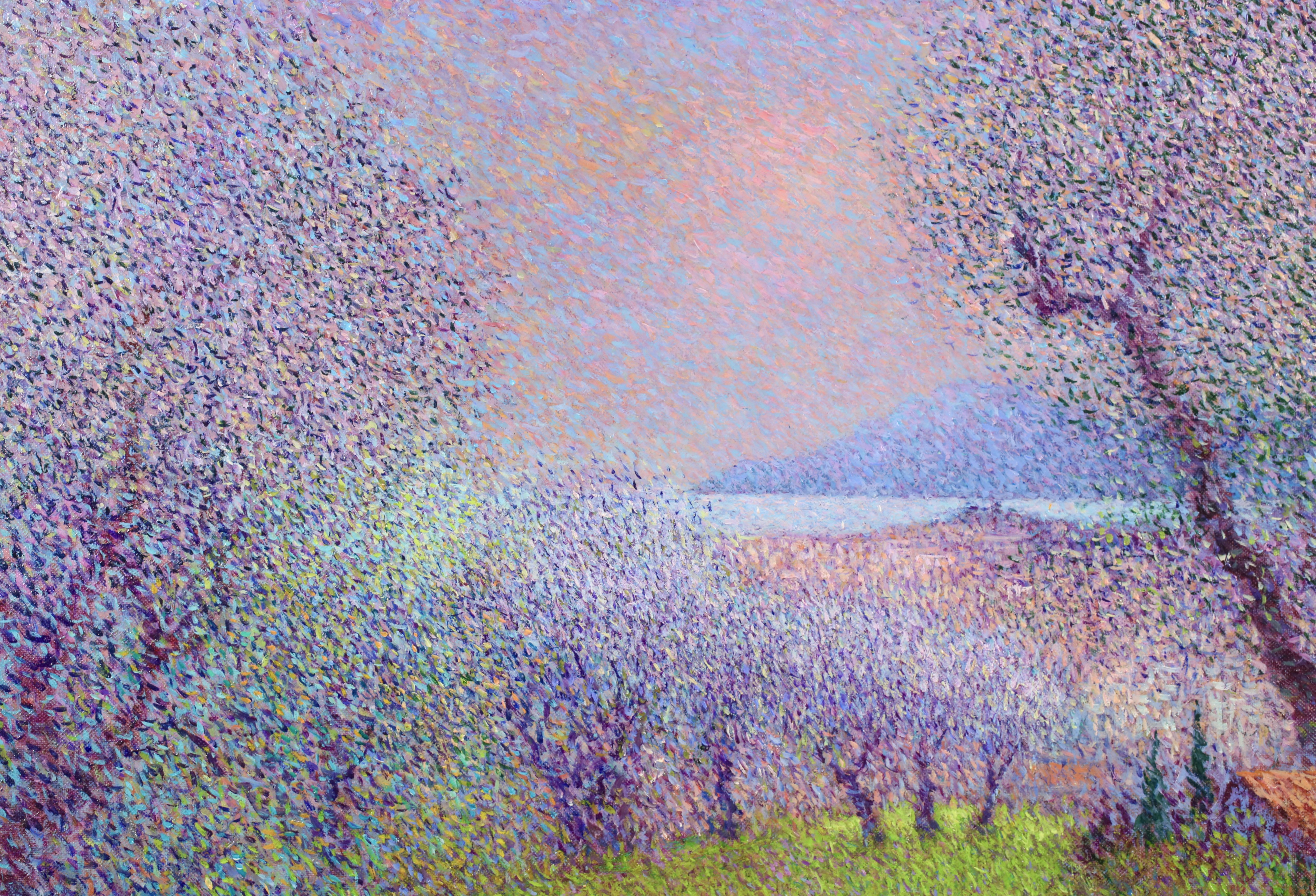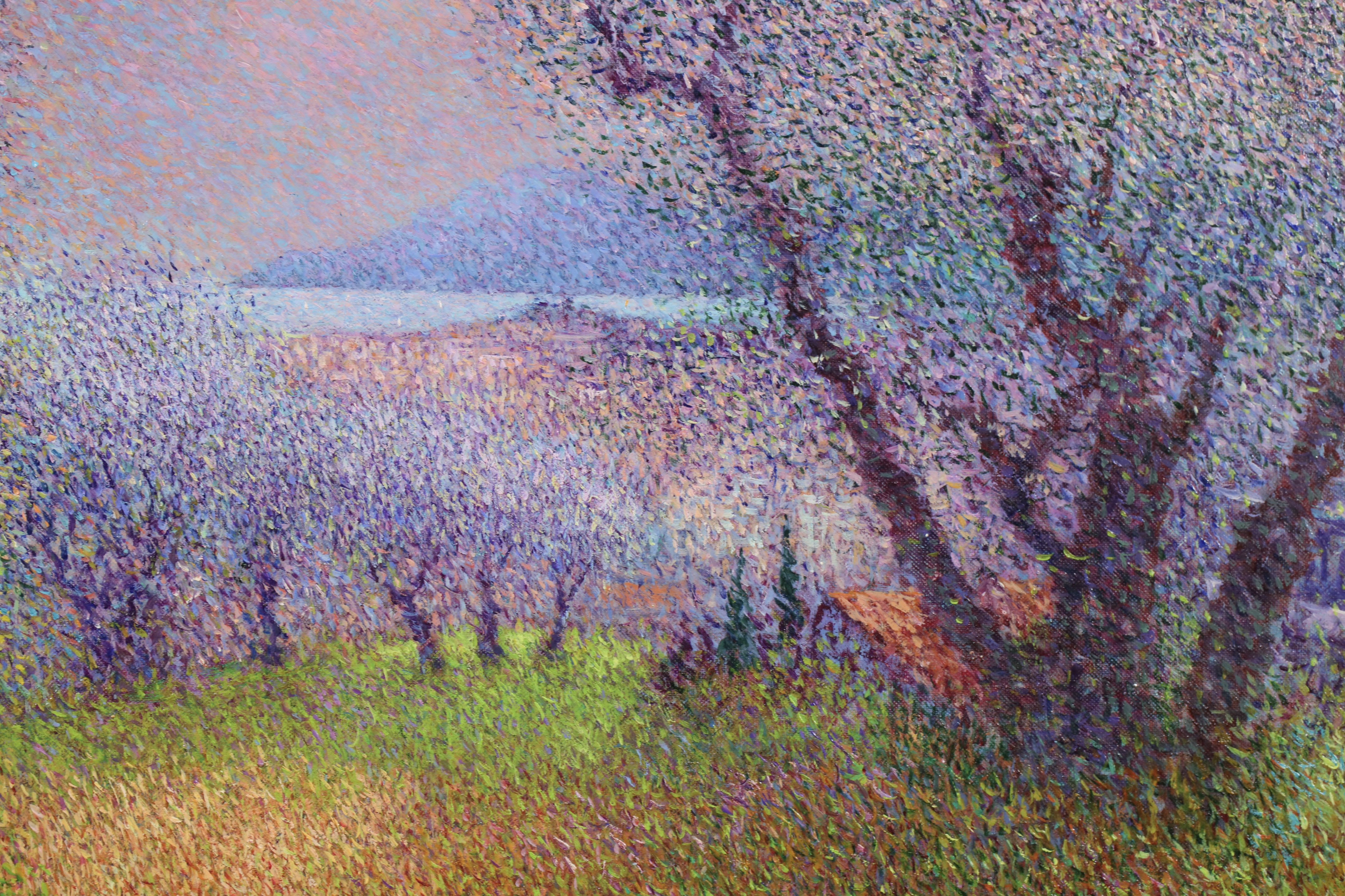 There is precise technique in Vollet's landscapes. A multitude of tiny, colored dots is blended to create movement depth and the charm of a gentle sensuality. His creative originality is demonstrated by his ability to combine tones of color : he mixes bluish-greens with the purplish-yellows to produce a new sensation of depth and an illusion of movement, shimmering with color.