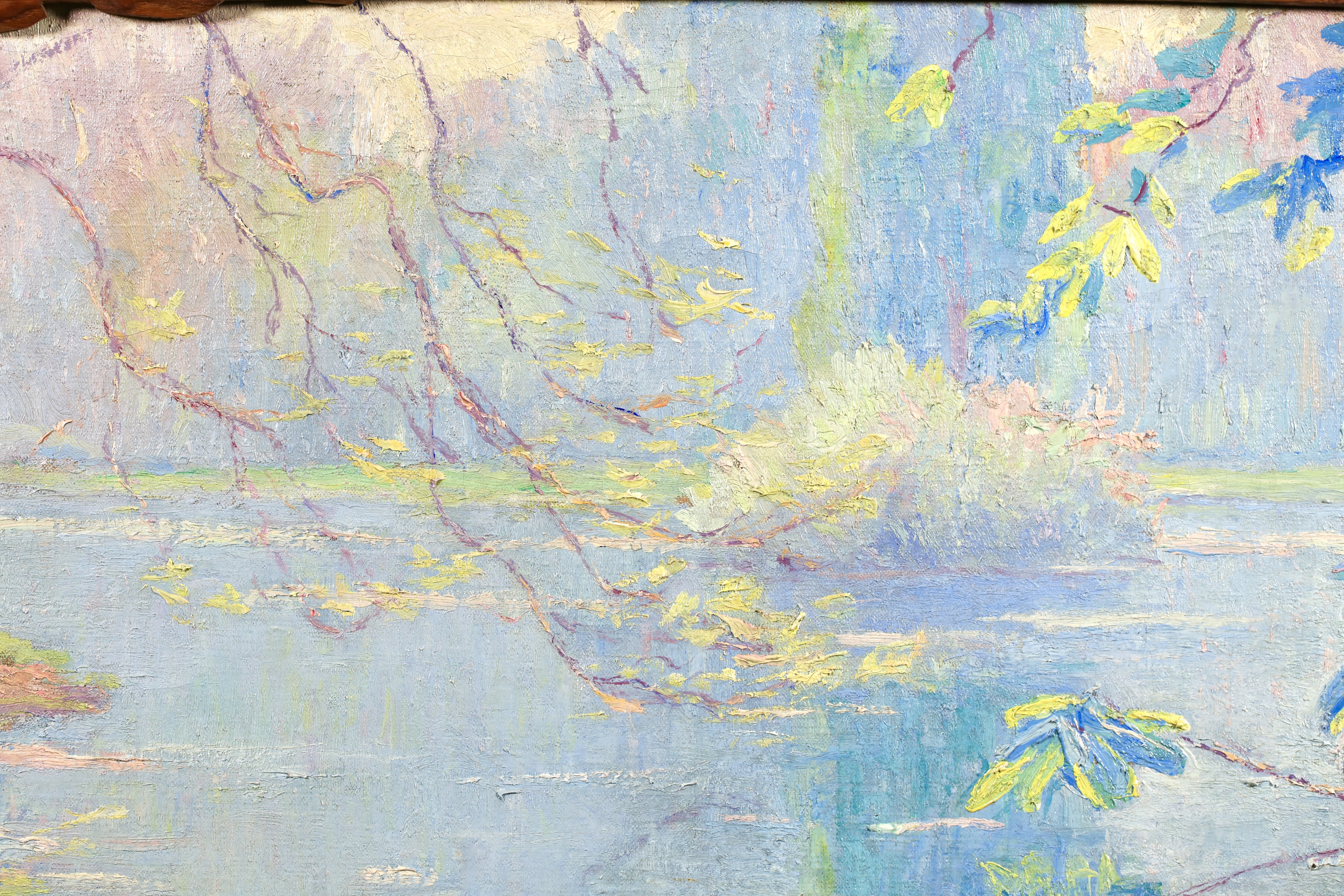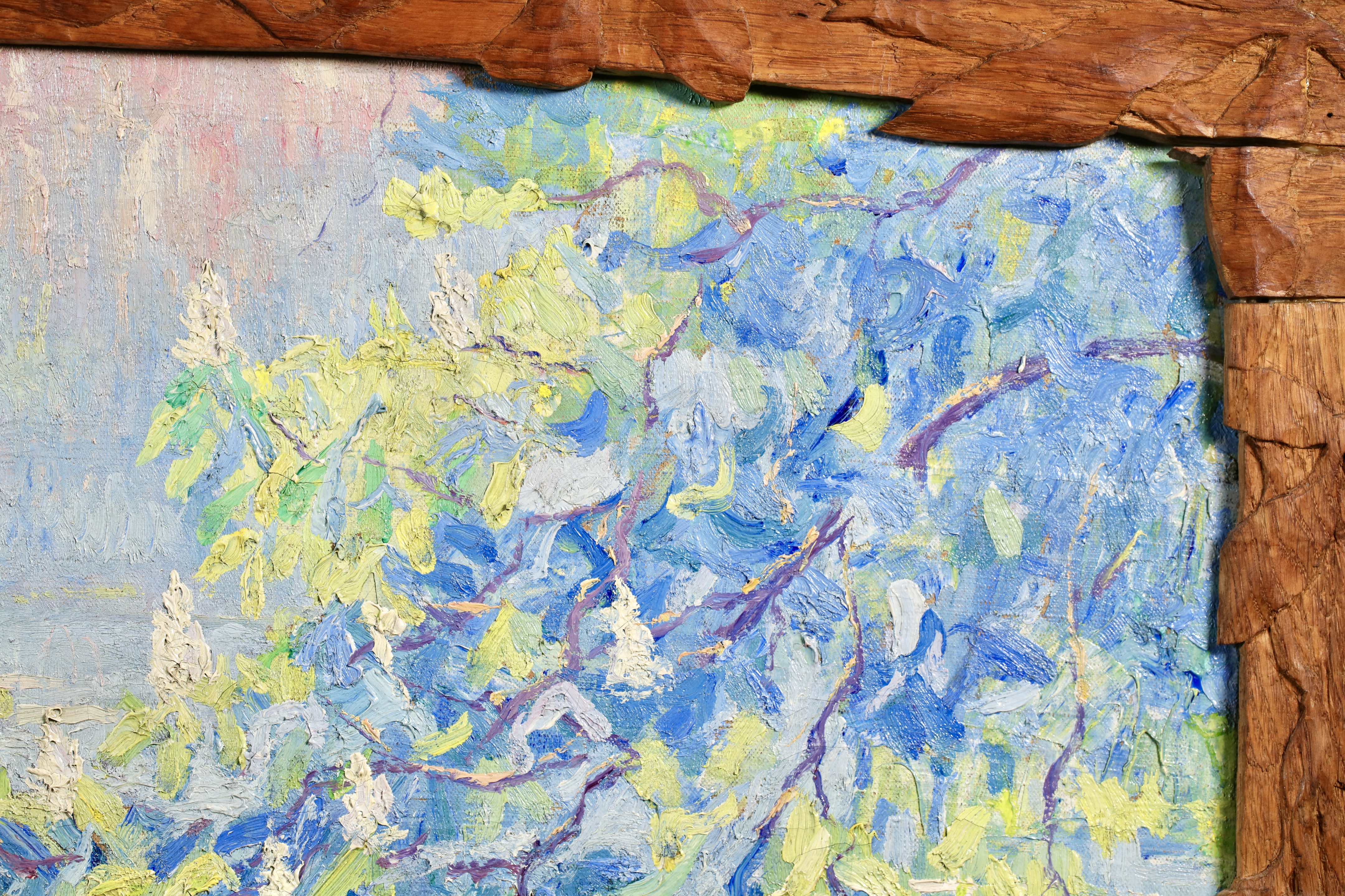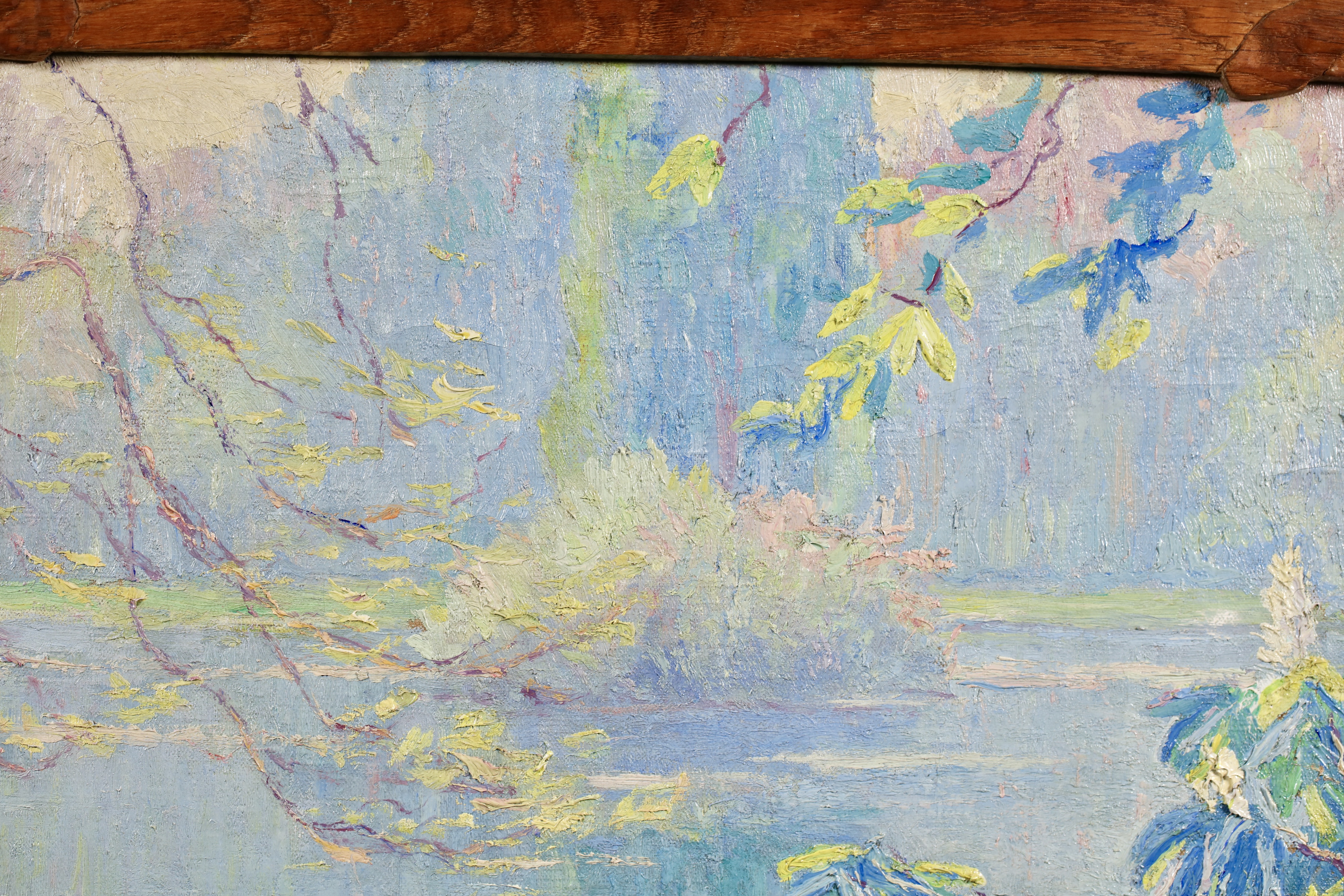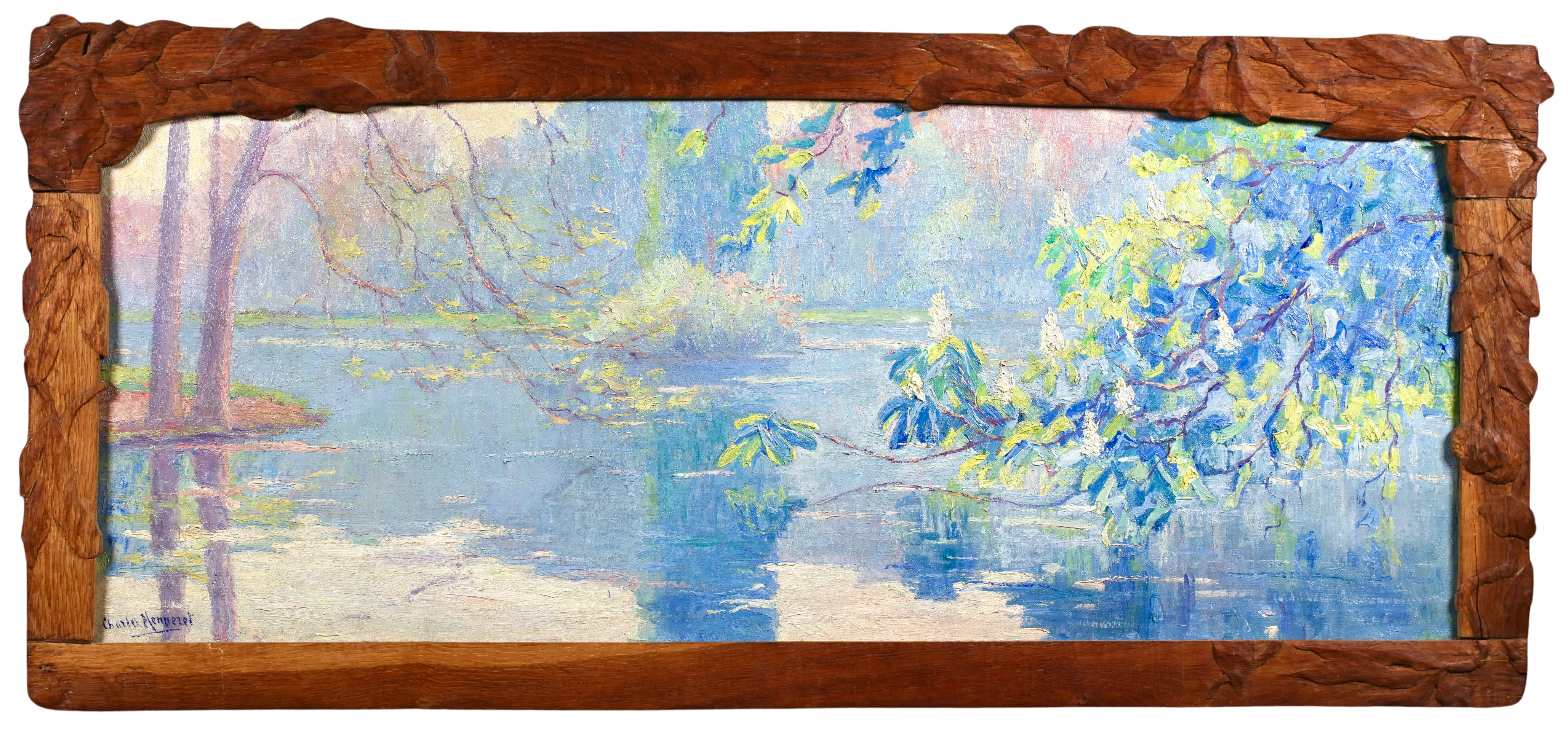 Literature: This work is housed in its original hand carved oak frame which was made by Menneret specifically for this work. Menneret was a sculptor as well as a painter. The frame is signed with the artists initials in the lower left corner.