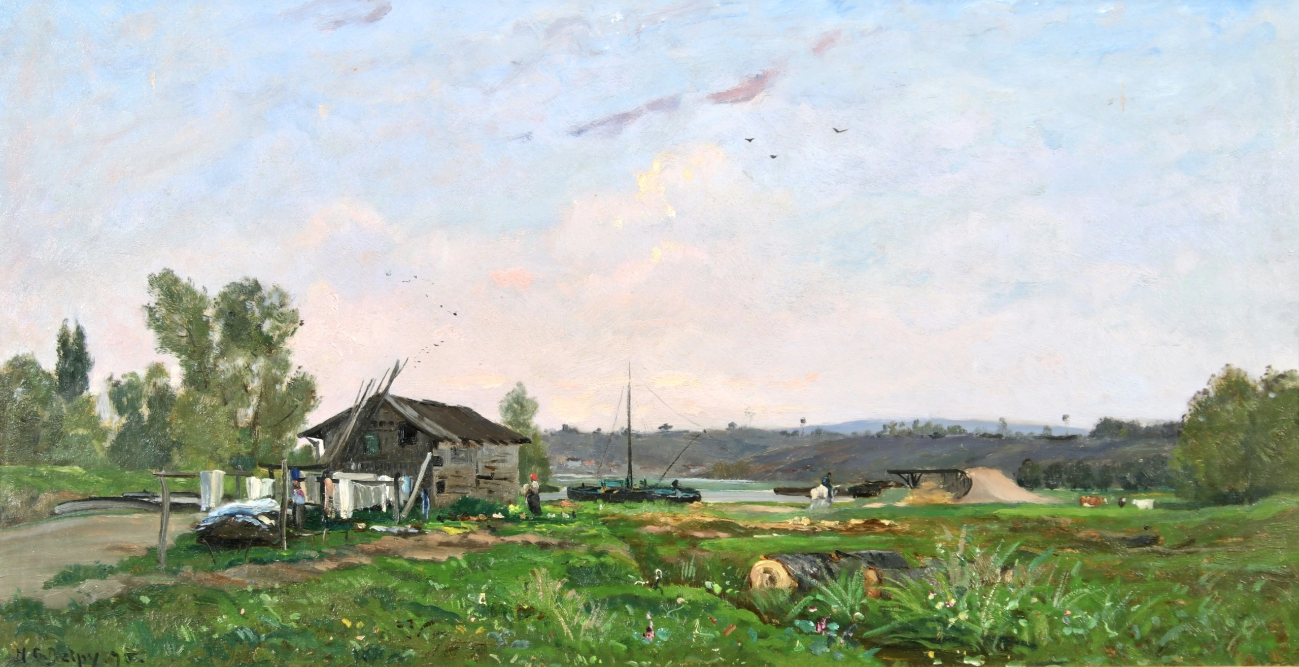 Hippolyte-Camille Delpy studied under Daubigny and exhibited at the Exposition Universelle of 1900 in Paris. He first exhibited at the Salon of 1869 where he submitted one of his snow scenes such as can also be found among the work of Pissarro and Monet around this time. During the 1870s he frequently worked in Ville d'Avray, favoured by Corot, and in Auvers where Daubigny often worked. Delpy admired Daubigny's work and he shared this passion with Pissarro and Cézanne with whom he became friends. Delpy's work was favourably received by the Salon critics in 1874 and 1875, and in 1876 the artist organised a public auction of his own work at the Hôtel Drouot, the Paris auctionhouse, where he sold all 45 paintings. Following the sale, Delpy and his family moved to Fontainebleau. In 1881 Delpy received a commendation at the Salon followed by a bronze medal in 1884, a commendation at the Exposition Universelle in 1889 and a silver medal in 1900. He became a member of the Société des Artistes Français in 1886. The prominent Galerie Georges Petit, a specialist in contemporary French art, began selling Delpy's work. In 1908 Delpy showed work at the Grafton Galleries in London. Delpy has been criticised for continuing to work in the style of his master, Daubigny, rather than developing his own approach. He is nevertheless an interesting artist who has his place among the landscape artists of the late 19th century. He mainly painted the same subjects as Daubigny.