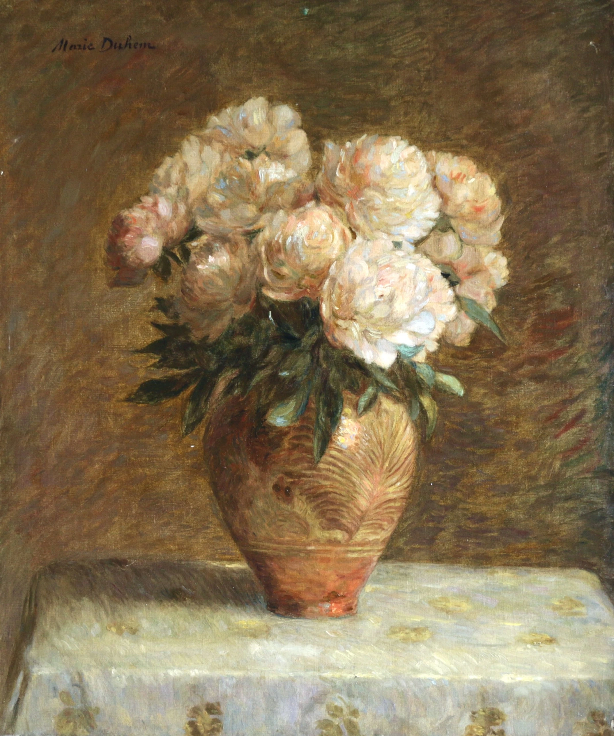 Marie Duhem was a painter whose career had a national influence. She was named Officer of the Palmes académiques, named Knight of the Legion of Honor in 1912, she received a medal at the World Fair of 1900. A personal exhibition is dedicated to her in 1906, in Paris, at the Georges Petit Gallery. That same year, the State acquired an oil on canvas entitled "White Buttercups" for the Luxembourg Museum, now kept at the Musée d'Orsay, which also owns Duhems "Queens Daisies in a Vase".