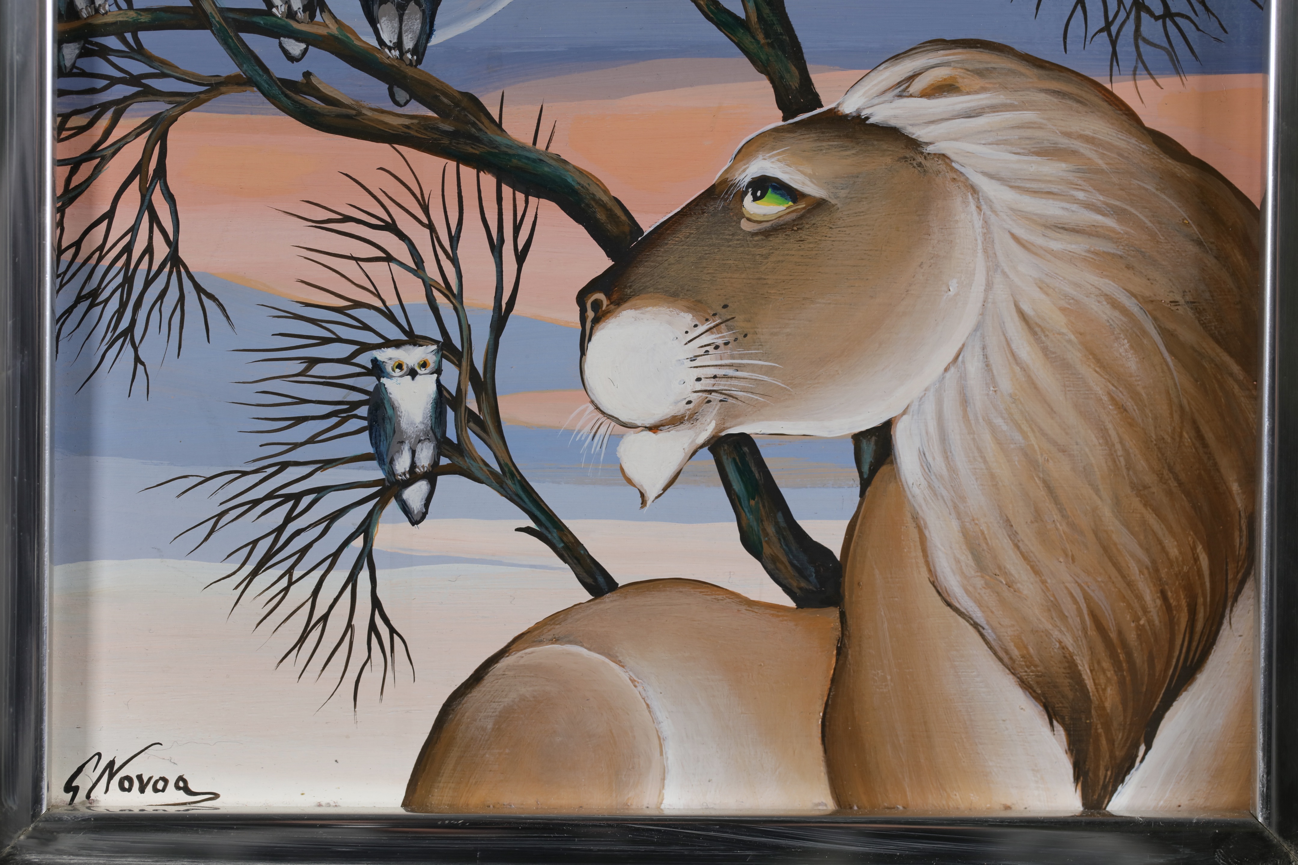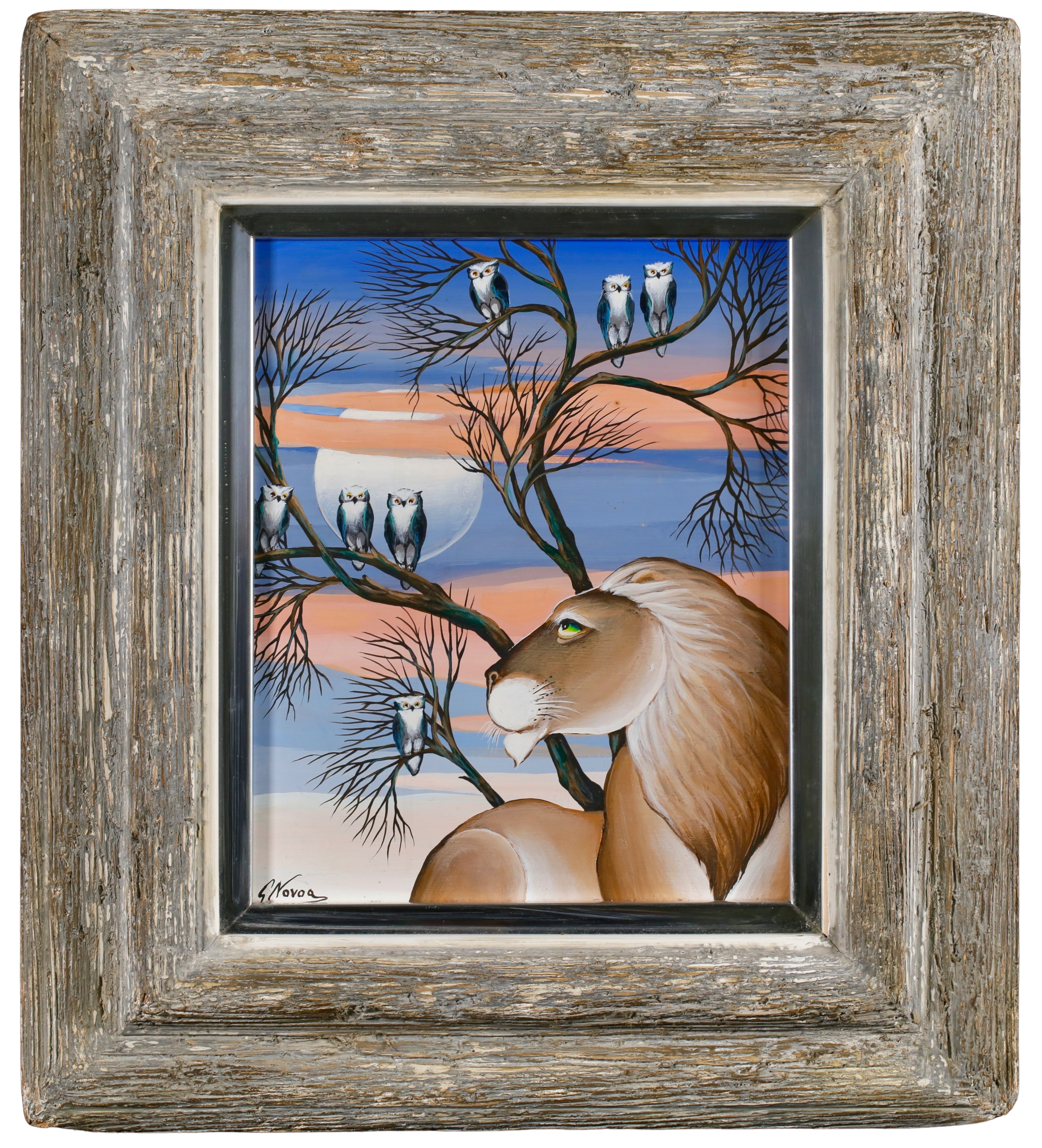 Chilean born Gustavo Novoa became represented exclusively by the Wally Findlay Galleries in the early 1970’s, and his one-man shows in New York, Paris, Palm Beach and Beverly Hills established him as a champion of ecology and wildlife preservation. His animals were primitive and painted in lush and colorful backgrounds.