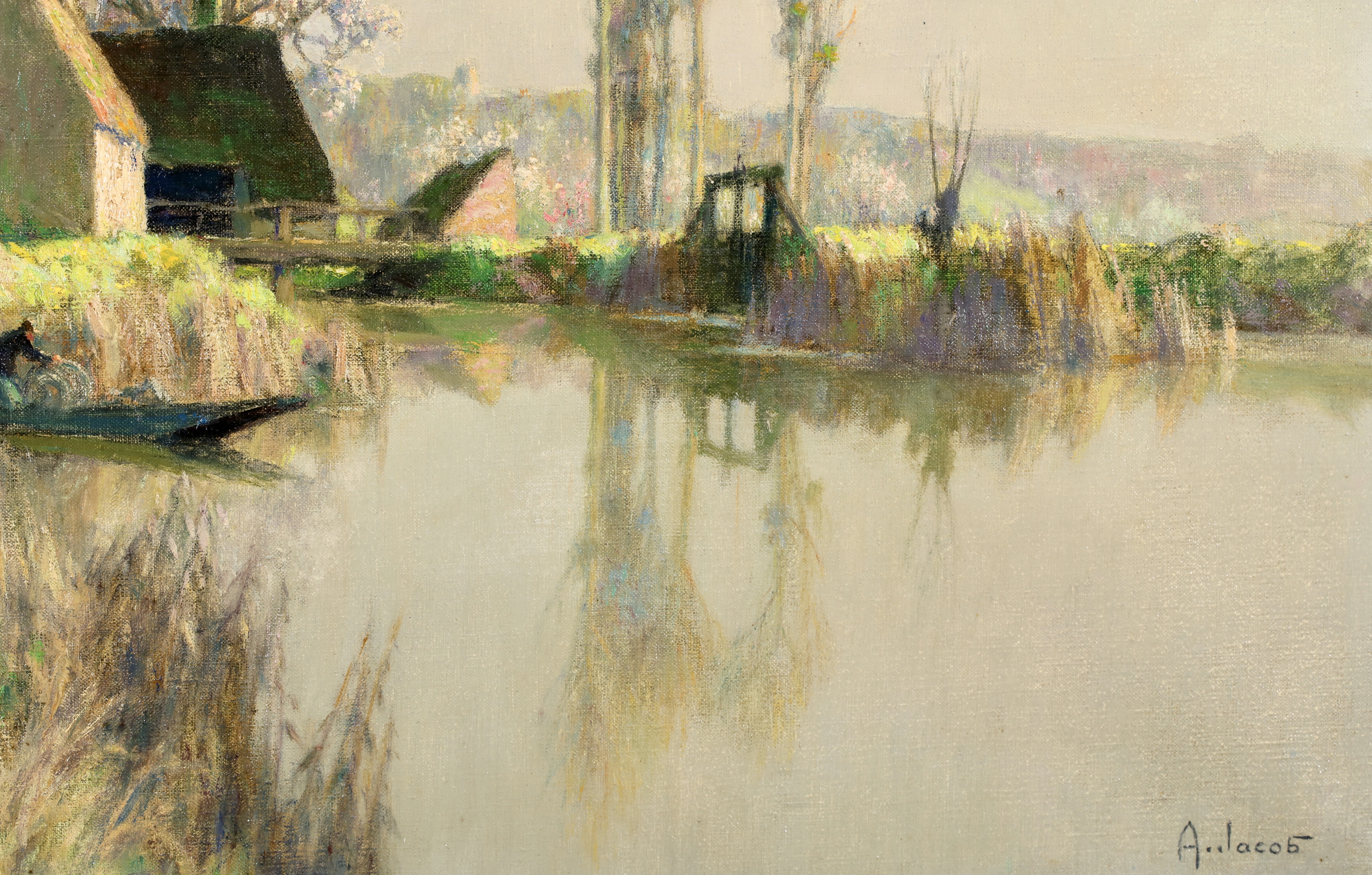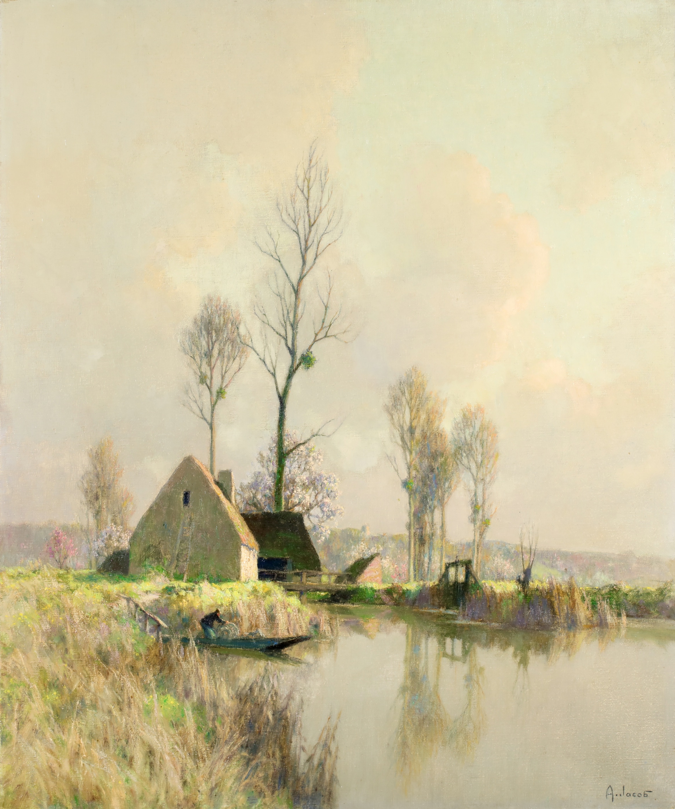 Jacob was a pupil of Eugène Claude. He was noted for his effects evoking the light of dawn and dusk. From 1899, he exhibited in Paris at the Salon des Artistes Français, of which he became a member in 1902. He received an honourable mention in 1908, a gold medal hors concours in 1914 and a gold medal at the Exposition Internationale in 1937. He exhibited there until 1950. He also showed at the Salon d'Hiver, the Salon des Aquarellistes, as well as in private galleries.