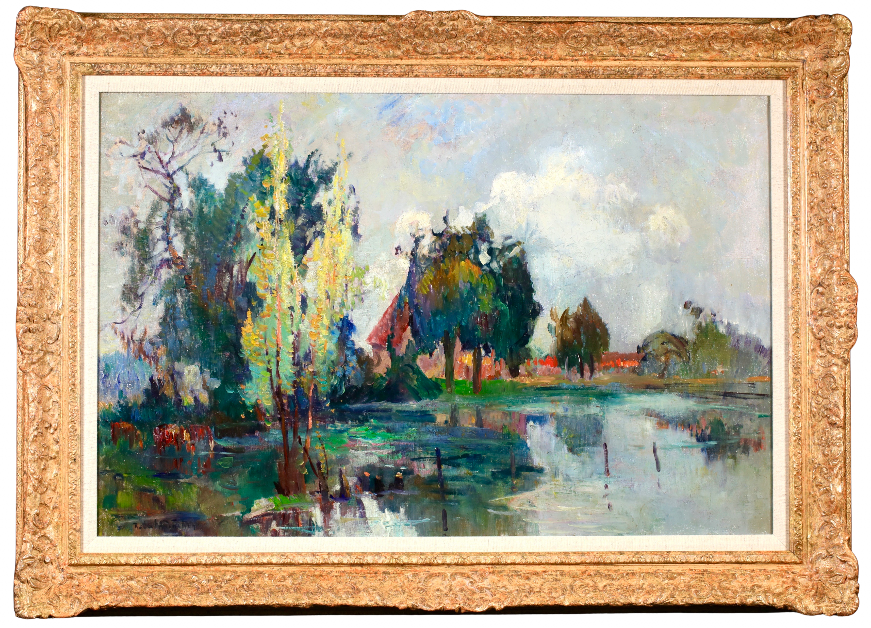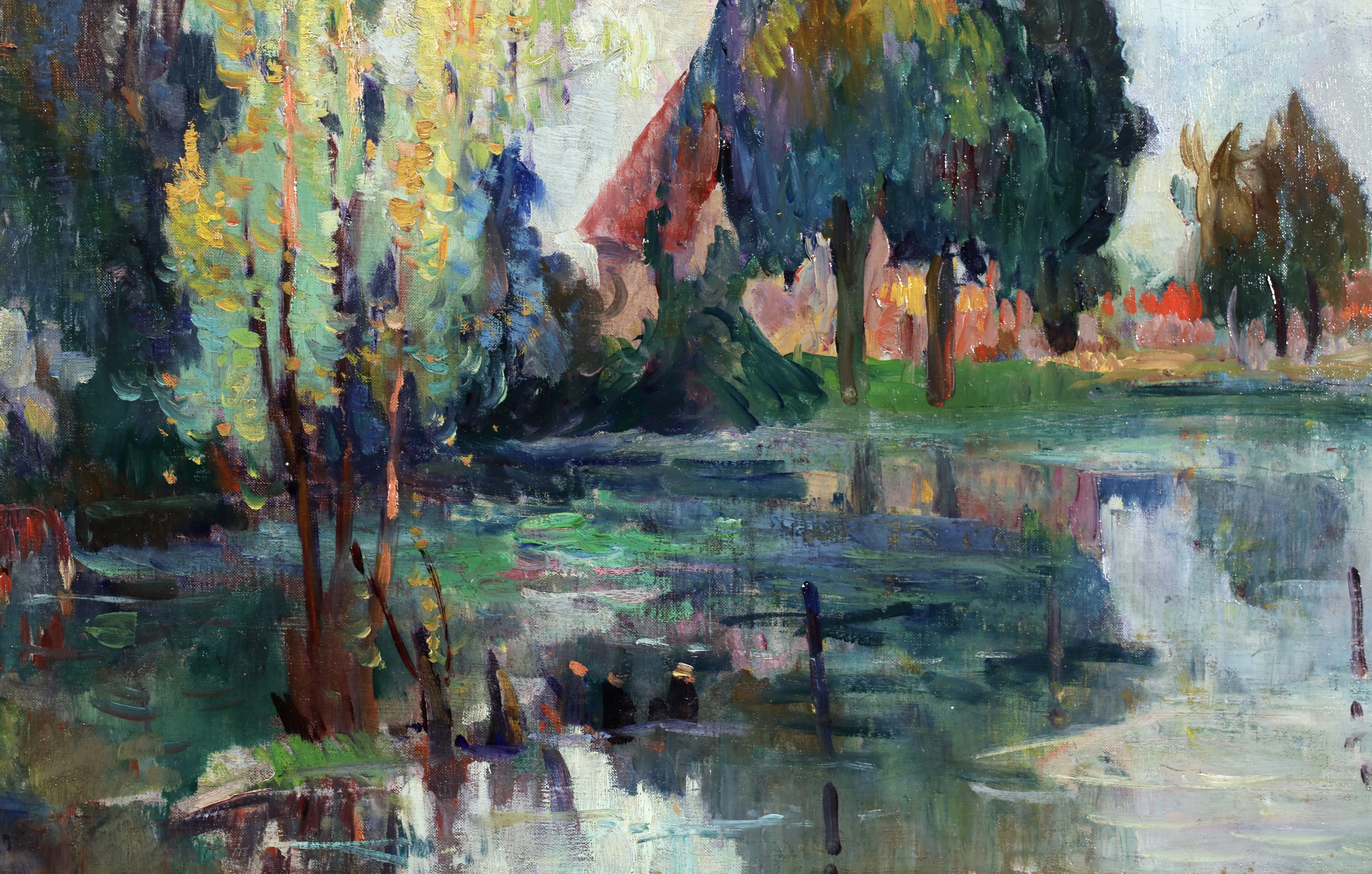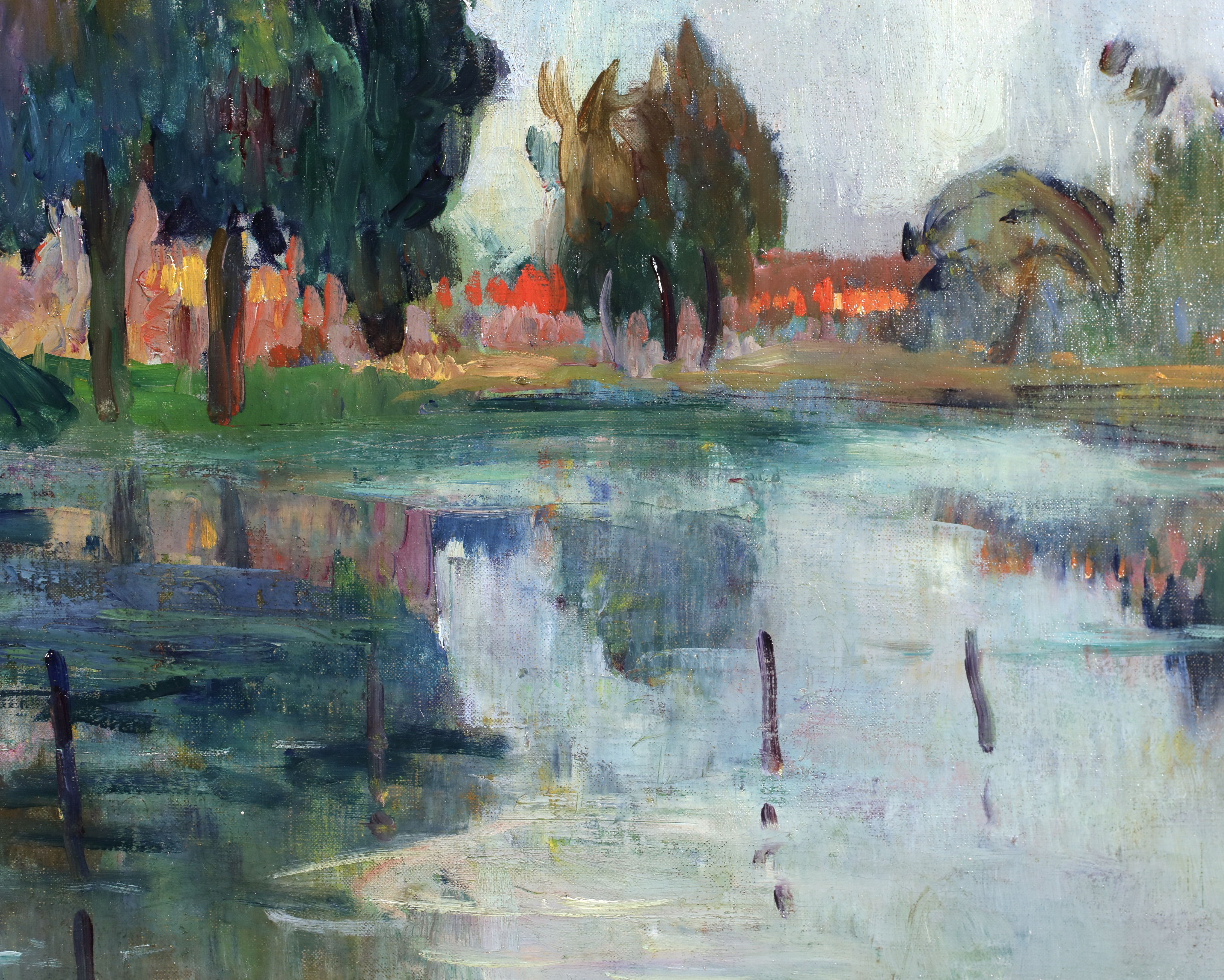 Along with Dumont and Guilbert, Robert Pinchon is one of the Rouen artists who understood Monet's teachings best. Monet himself noticed Pinchon's 'eye' when he met him for the first time. On a technical level, he used pure colours, just as they came out of the tube. His poetical art perfectly rendered not only the misty lights of the port of Rouen, but also scenes of daily life, whether of a young woman sitting in a garden or children playing with a ball. Noteworthy are: Embankment in Rouen; Rouen in the Snow; Banks of the Seine; Suspension Bridge at Elbeuf.