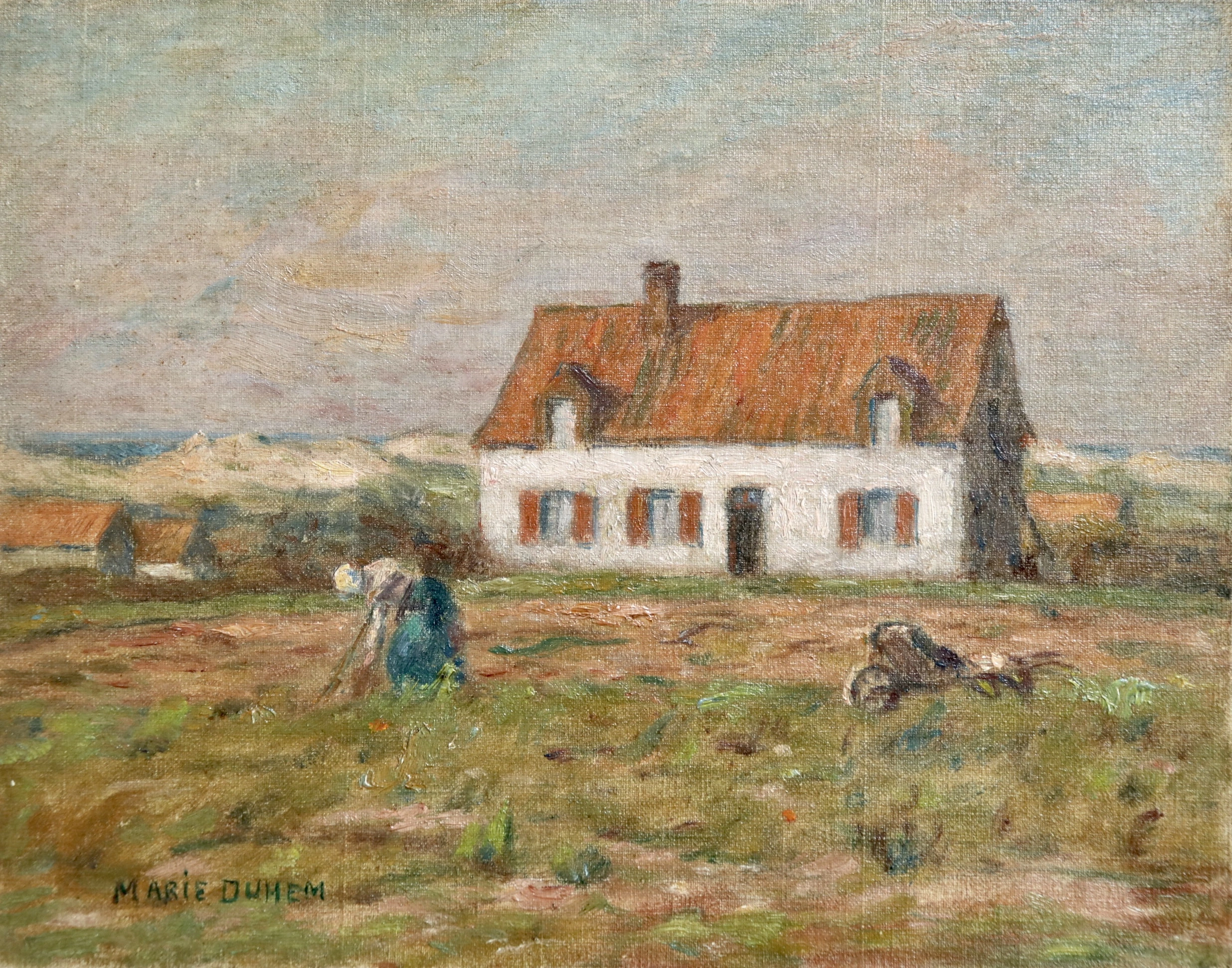 Marie Duhem's parents ran a lace factory. From her childhood, she became familiar with the work of model designers. She becomes the student of the painter Adrien Demont, husband of the painter Virginie Demont-Breton. It was in their Wissant workshop that she met, in 1889, Henri Duhem. Eleven years older than her a passionate advocate of painting. They were married in 1890 and, the following year, she gave birth to a boy, Rémy (1891-1915). It was at this time they formed the group of Wissant (still called School of Wissant) centering around the Demont-Breton, each summer for several years, the Duhems, installed in their country house in Camiers worked with a whole group of friends in the countryside of Boulogne and the coastline of the Opal Coast. Among the most assiduous are Georges Maroniez, Francis Tattegrain, Fernand Stievenart or Felix Planquette.
