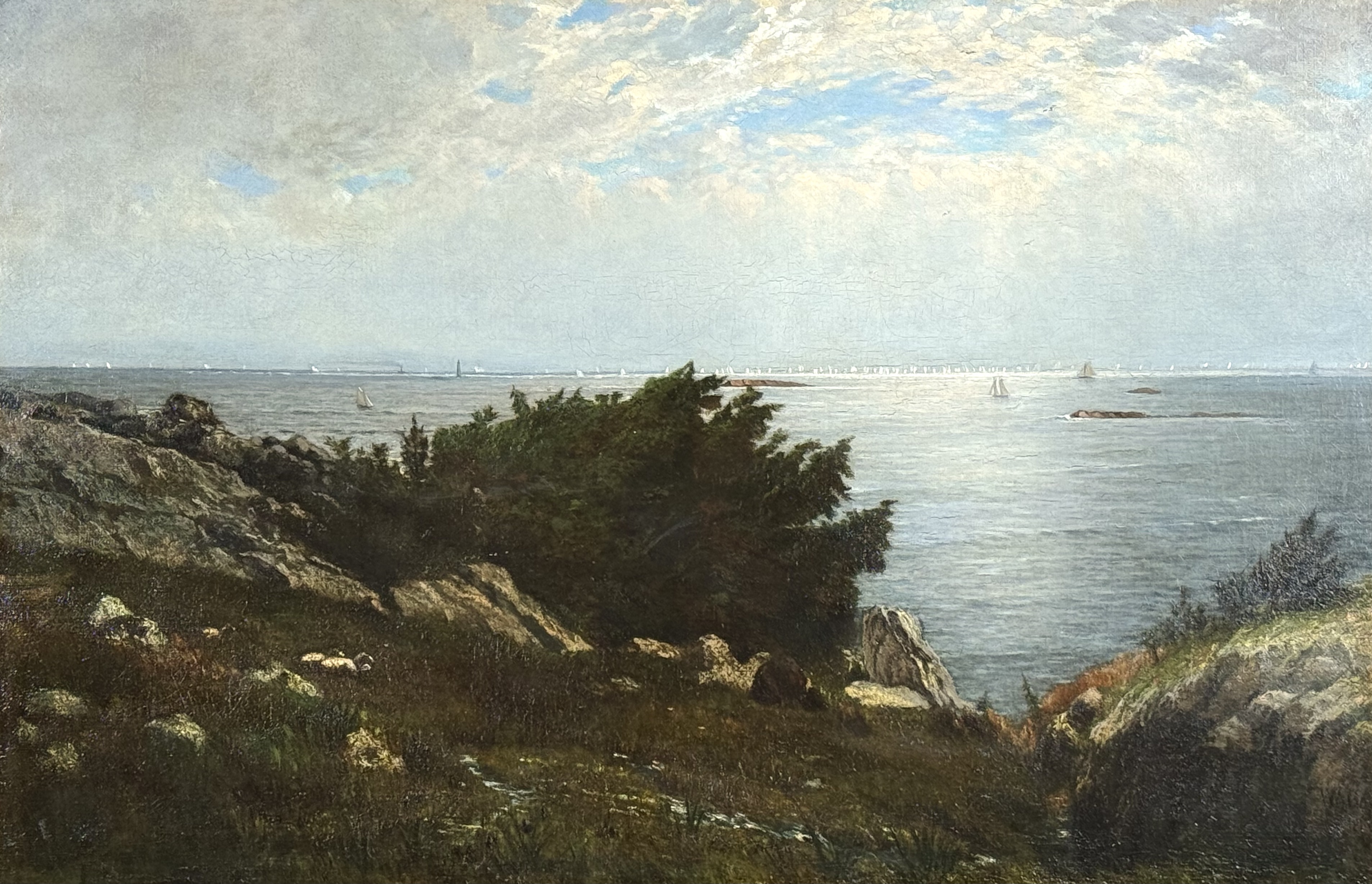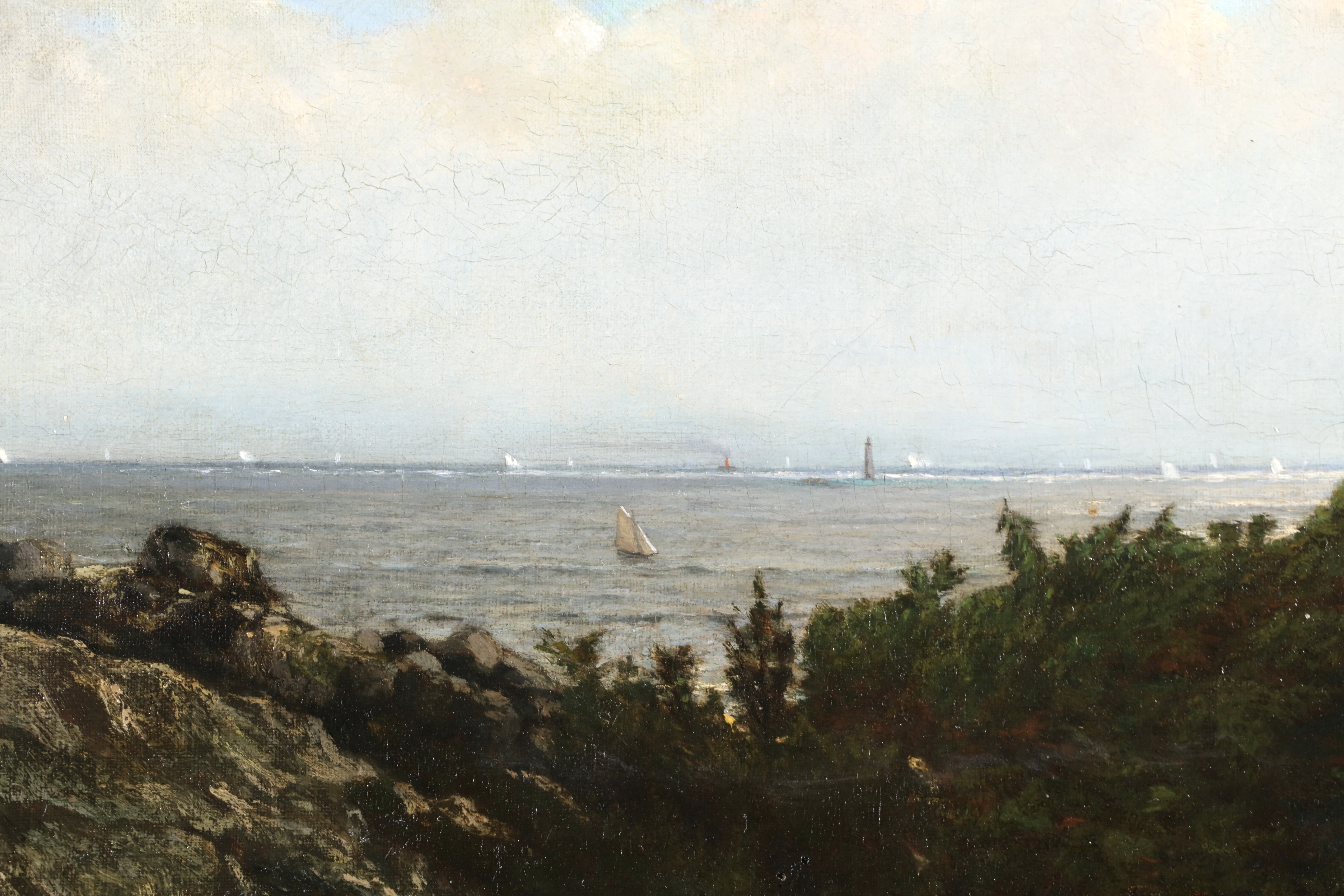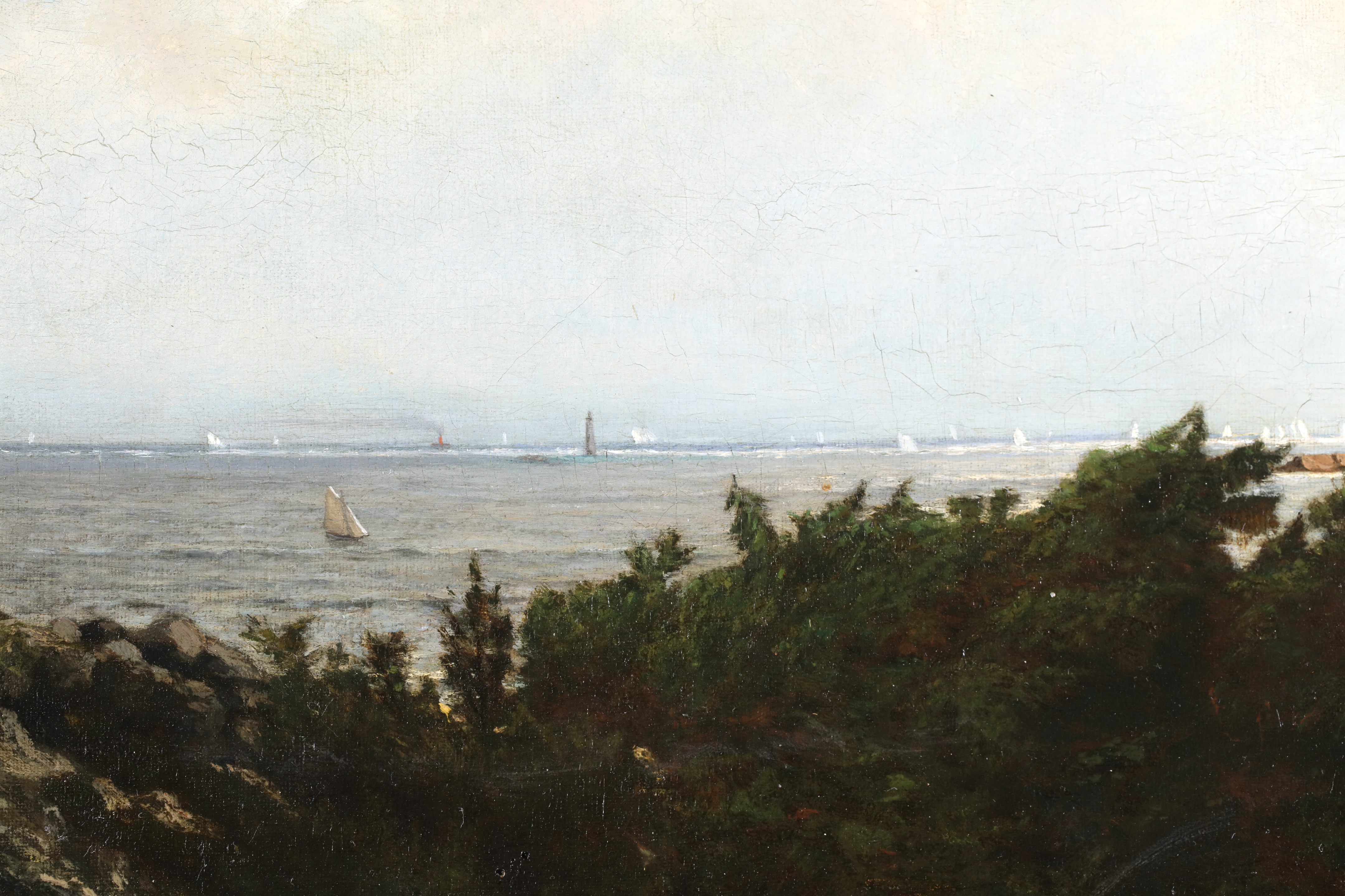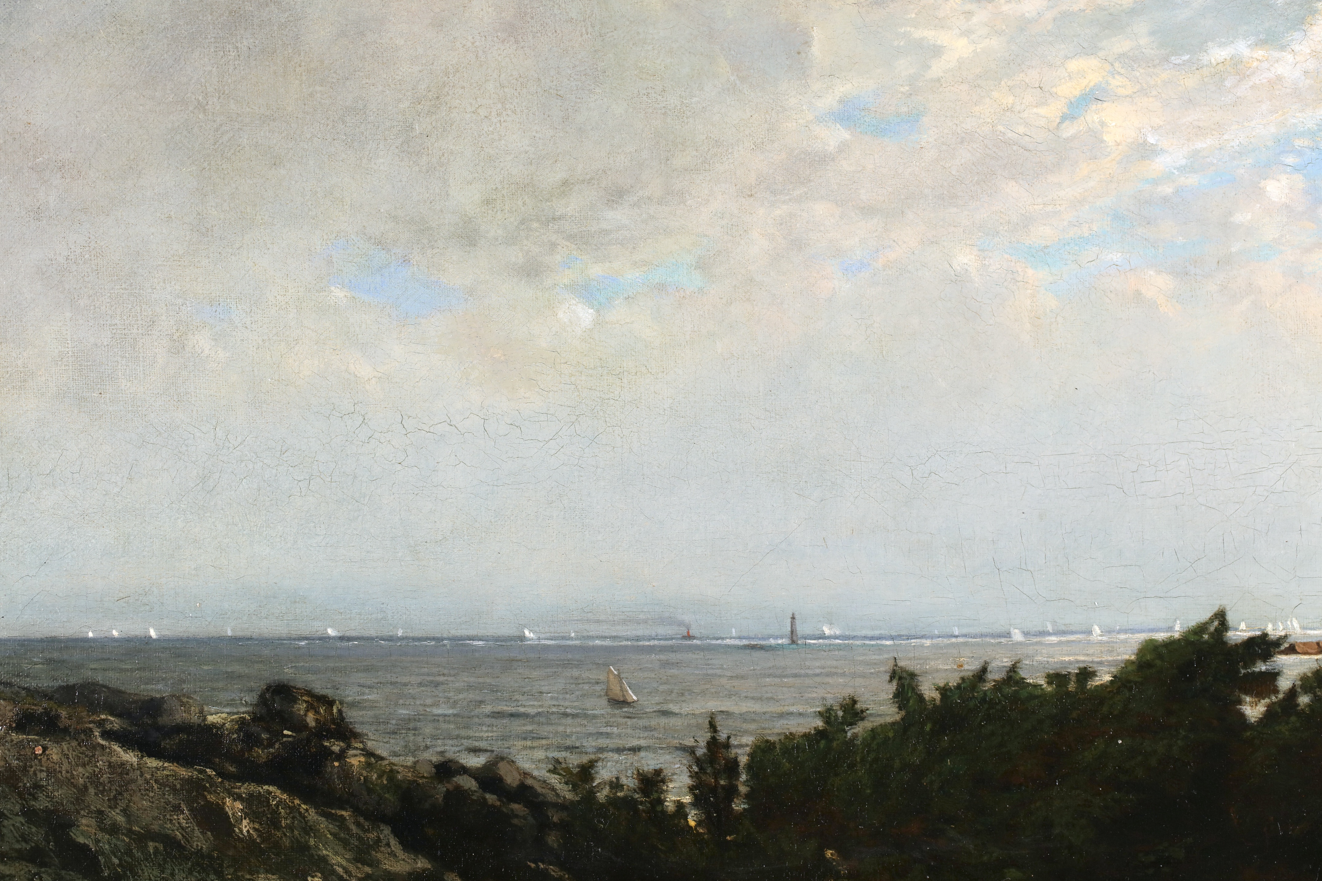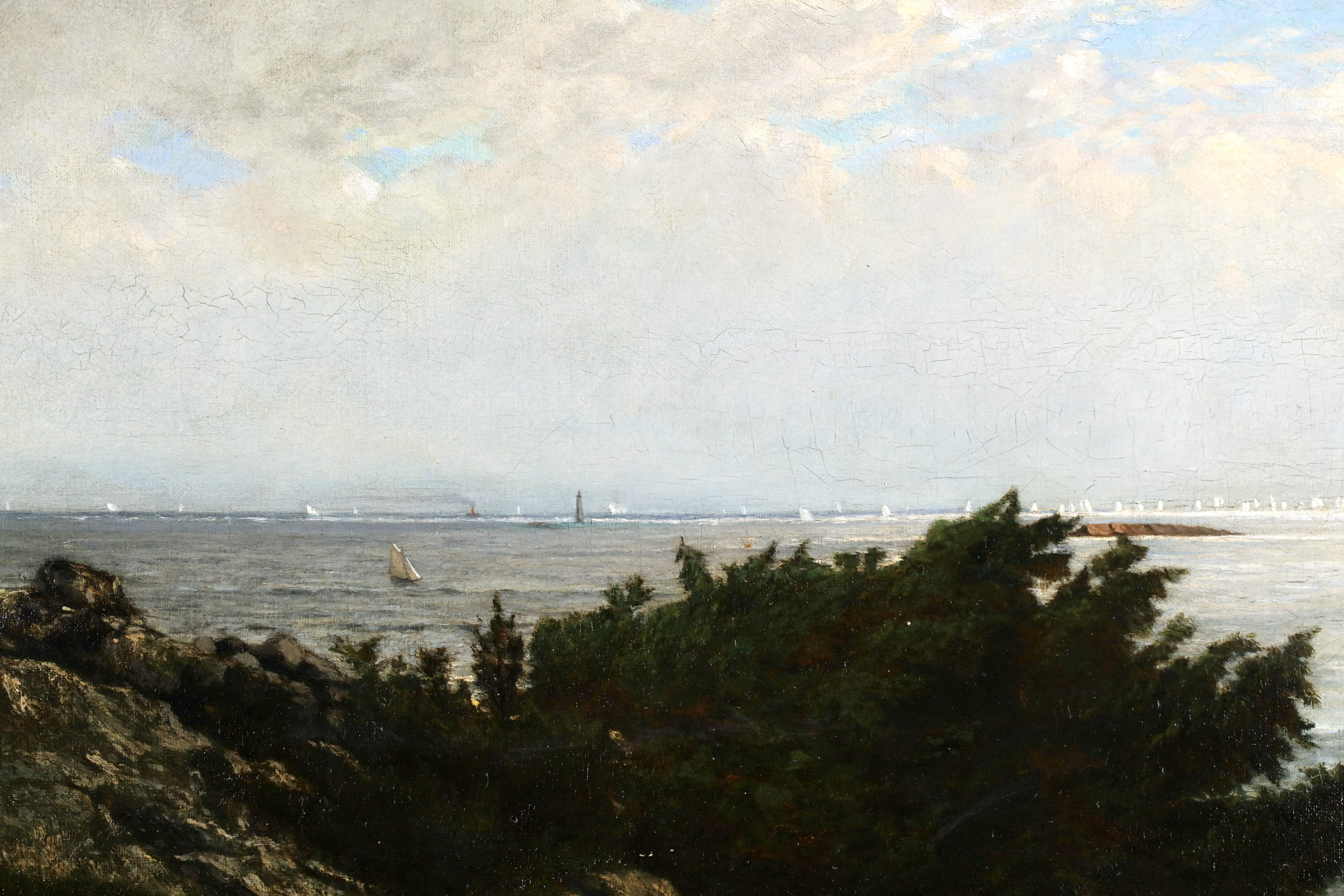 Literature: This work depicts an expansive view of Massachusetts Bay with the Boston Yacht Club sailing boats massed in the distance. We believe the lighthouse in the foreground is the Cohasset Lighthouse which sits to the south of Massachusetts Bay.