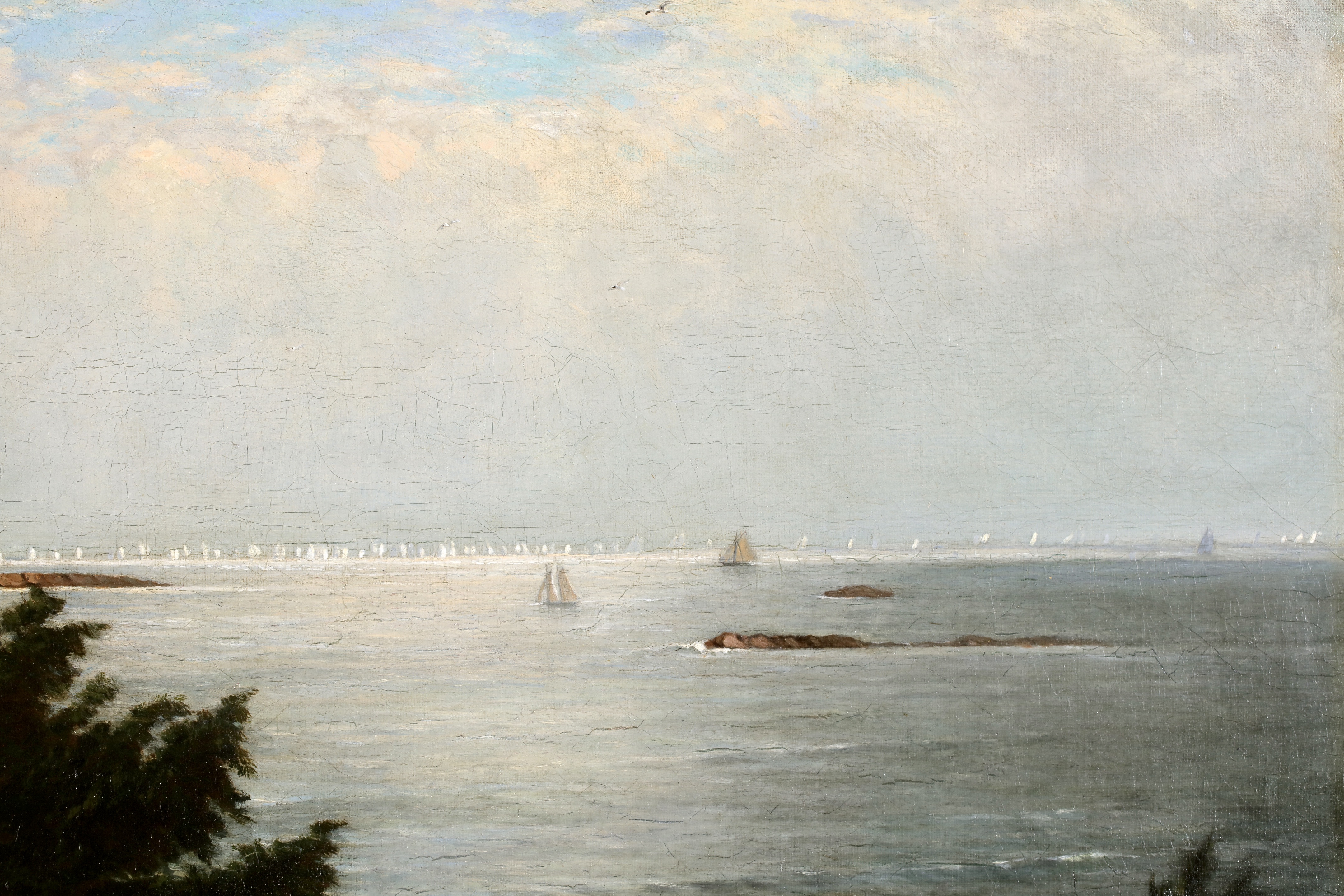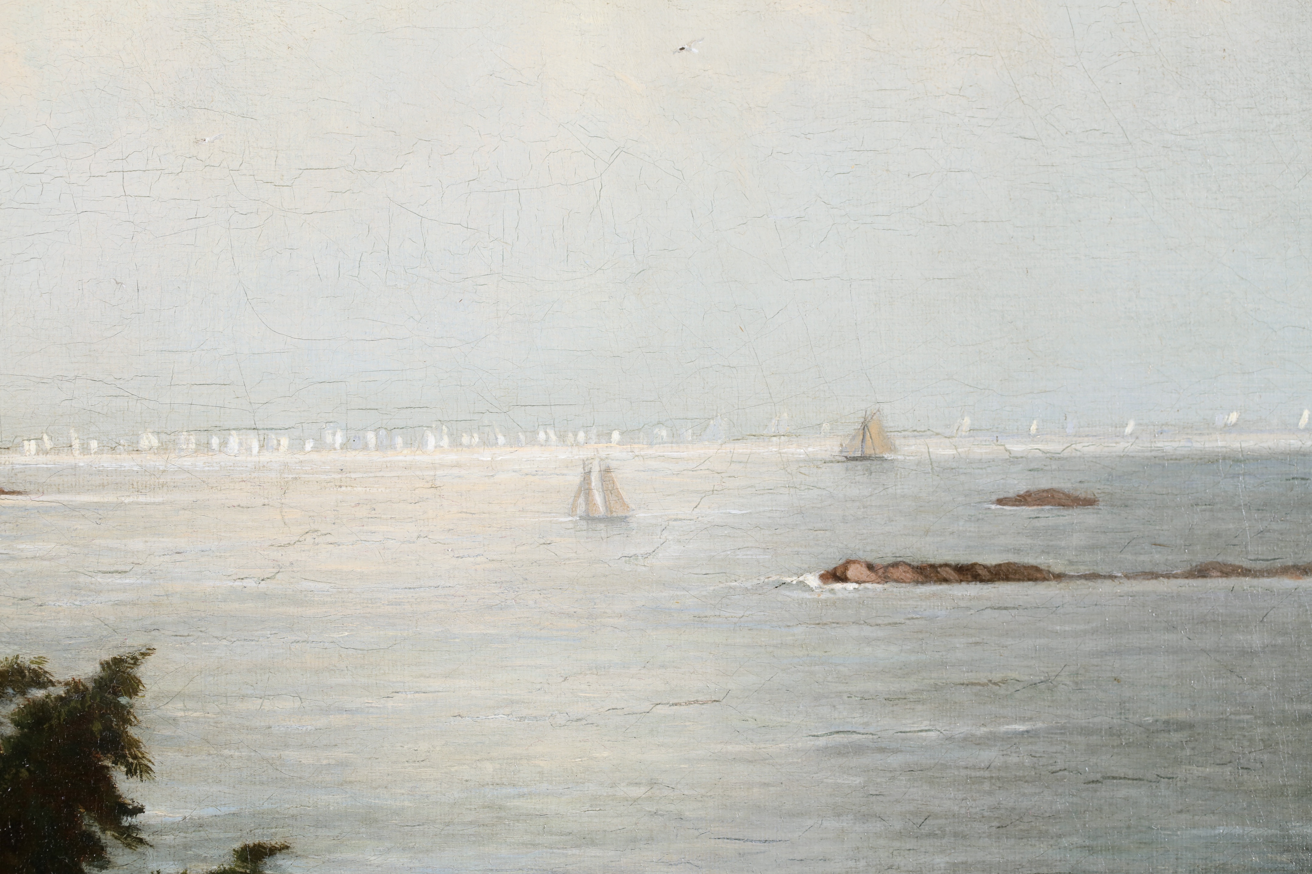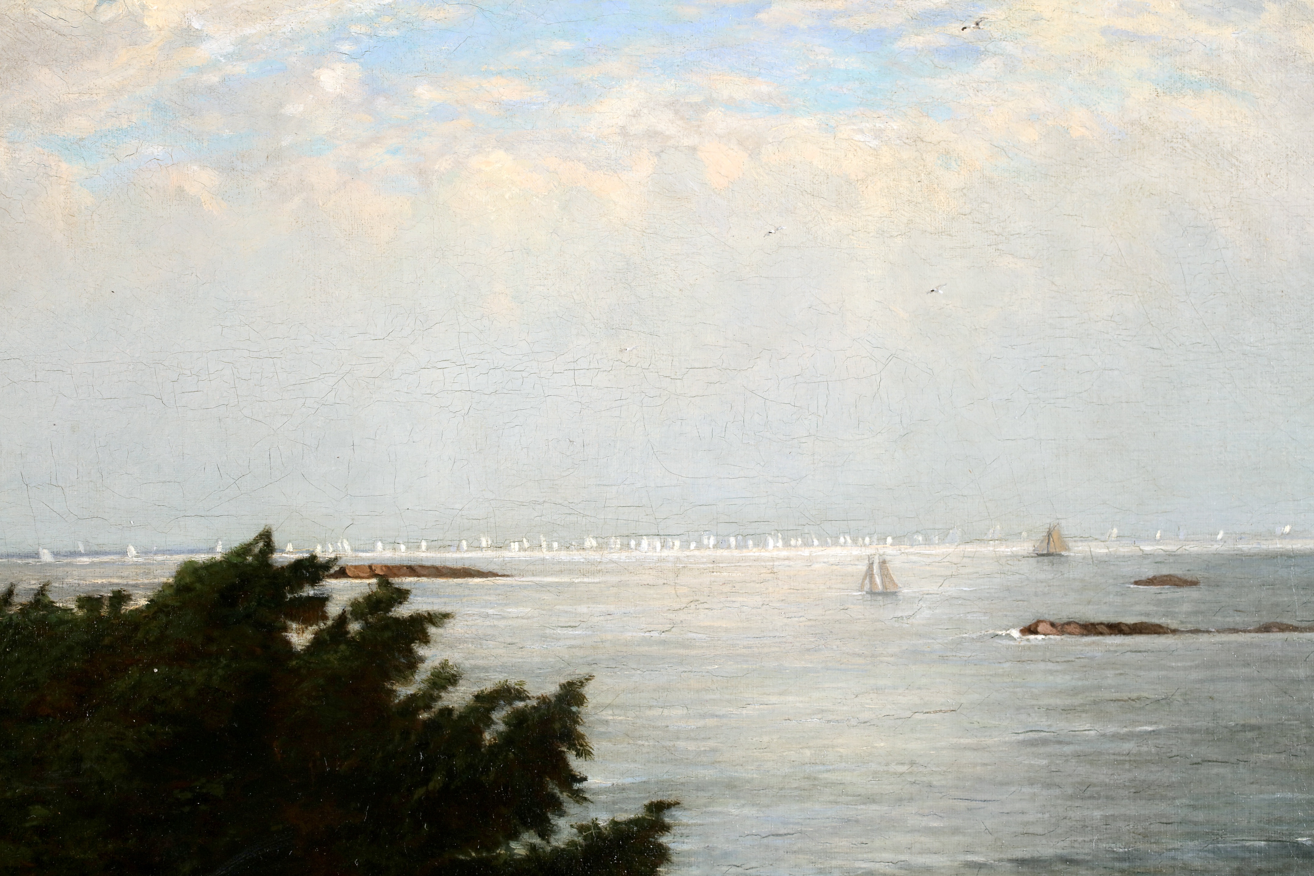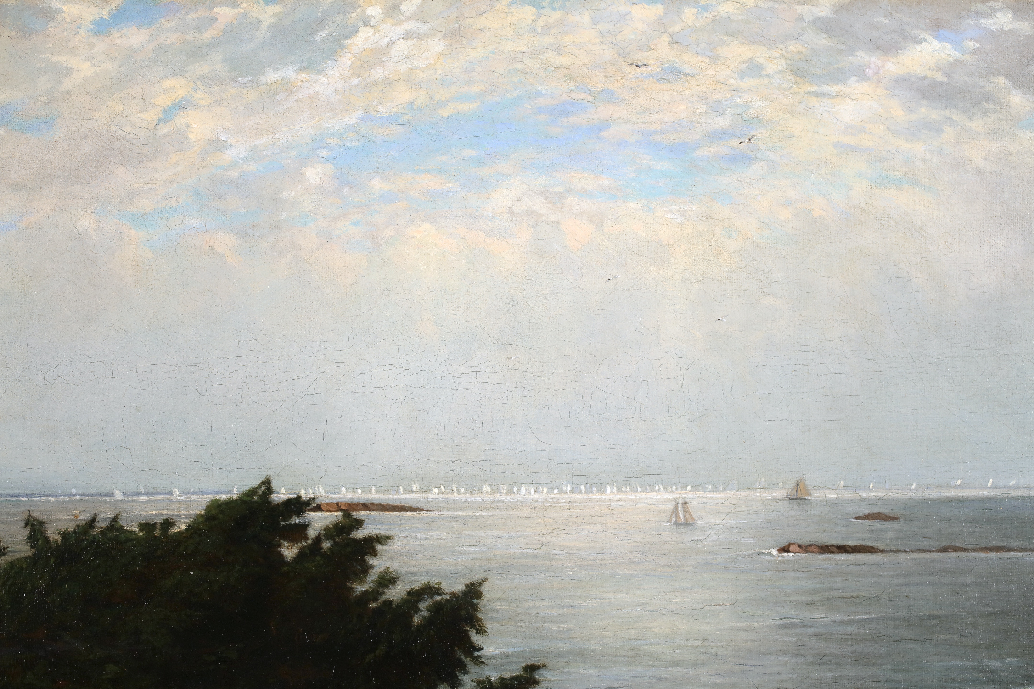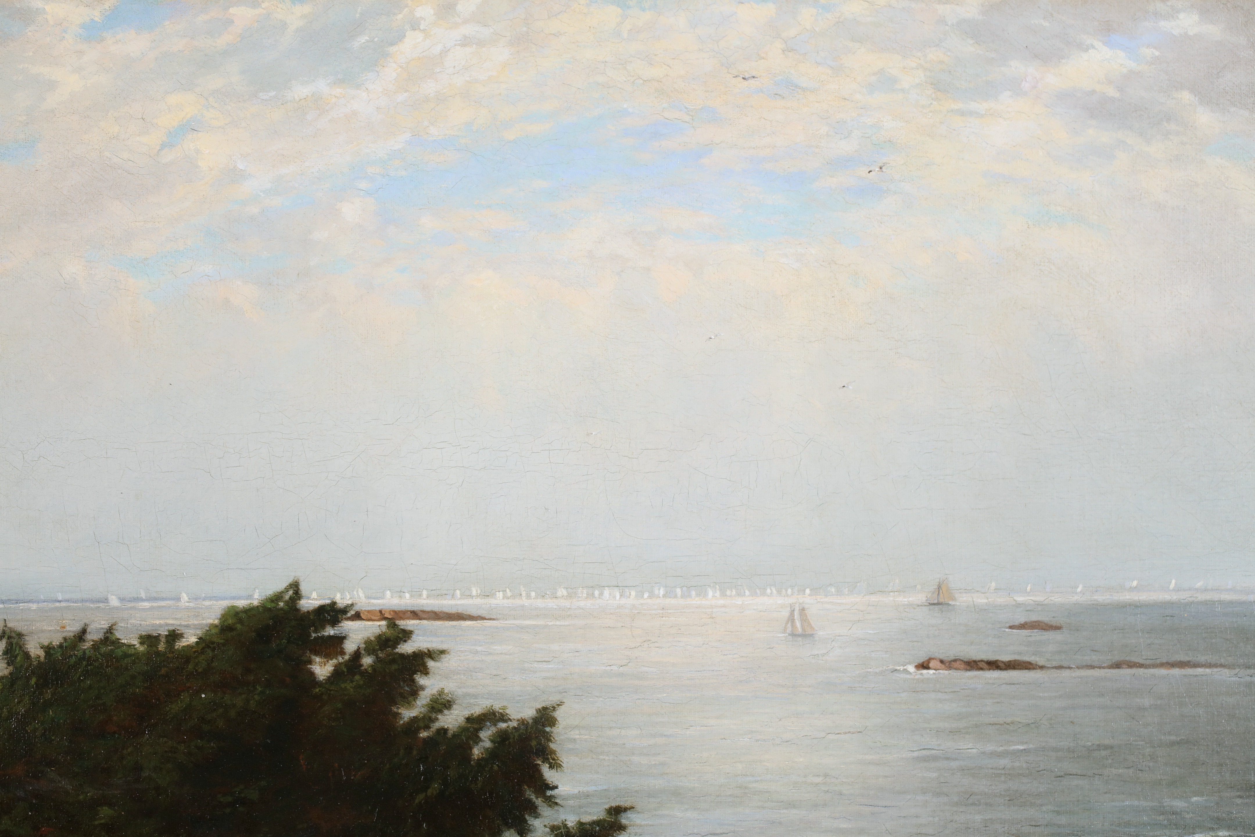 Literature: This work depicts an expansive view of Massachusetts Bay with the Boston Yacht Club sailing boats massed in the distance. We believe the lighthouse in the foreground is the Cohasset Lighthouse which sits to the south of Massachusetts Bay.