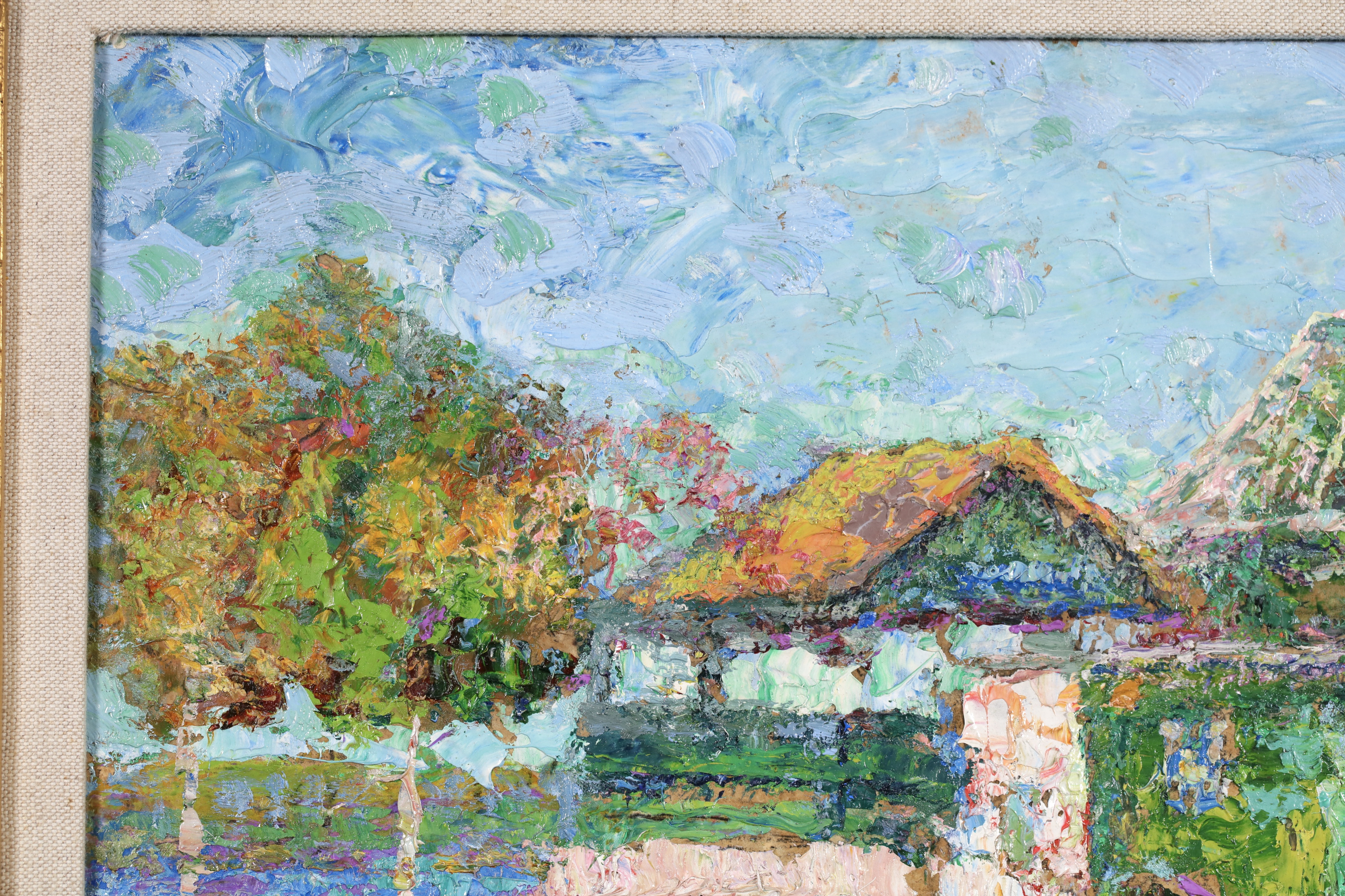 Charreton was a landscape artist in the Lyons tradition with a love of sensual impasto. In his works he seeks to capture fleeting, momentary effects, like those achieved by the Impressionists: effects at different times of day and in different seasons, such as dusk and snow. As a young man he painted the environs of Bourgoin, but his marriage in 1893 took him to Auvergne where he painted the characteristic landscapes of the region. Landscapes of Auvergne make up approximately two-thirds of his output. What became known as the School of Murols, named after a village in Auvergne, was principally formed around him between 1910 and 1925. Skilled in capturing minute changes in the weather, he was also adept at capturing the spirit of new places. Beside his native Dauphiné and his adopted Auvergne, he was also charmed by the landscapes of the Île-de-France and Paris - Montmartre, the Jardin du Luxembourg and the Parc Montsouris - and also Provence, Creuse and Brittany. However, no trace has been found of his trips abroad. It would be a misjudgment to think that he only painted pretty picture-postcard scenes in the regions he visited; on the contrary, he would seek out the intimist qualities of a place, choosing perhaps a quiet hamlet, with a humble bridge over an anonymous stretch of water, or an ordinary tree outside a tumbledown house. He would paint blazing autumn landscapes, with a sumptuous colour palette, but also favoured snowy scenes, their exact chromatic opposite. At the start of his career he would paint dusky scenes and contre-jours in halftones and misty sunsets. As his artistic development progressed, he attached more and more importance to light and colour. In this respect his work follows on from that of Ravier and, like Guillaumin, it is almost a precursor to Fauvism, or alternatively can be regarded as complicit with it, like the work of Maurice Marinot. His brushwork evolved in tandem with his use of colour, which became ever more vibrant; for example his fondness for purple hues and later his striking colour contrasts. His brushwork became more conspicuous and he would suppress the insignificant details in order to bring out the forms that made up the general composition. Among art historians he is not ranked alongside the innovators who succeeded the Impressionists, like Gauguin, Seurat, Van Gogh or Cézanne. Older than Matisse, who was himself already by far the eldest of the Fauves, Charreton stopped short of what he considered to be their excesses. He placed himself at the crossroads between two centuries: the end of the century of Impressionism and the start of the leaps made by Fauvism. His life and the major themes in his work are evidence of this, but he decided to be a regional painter; as such, his talent and qualities are clearer than they may otherwise have been if he had chosen a more ambitious career. Beside his painting, he also wrote a play in three acts entitled The Montrouge Well ( Le Puits de Montrouge), which was performed in Bourgoin in December 1883.
