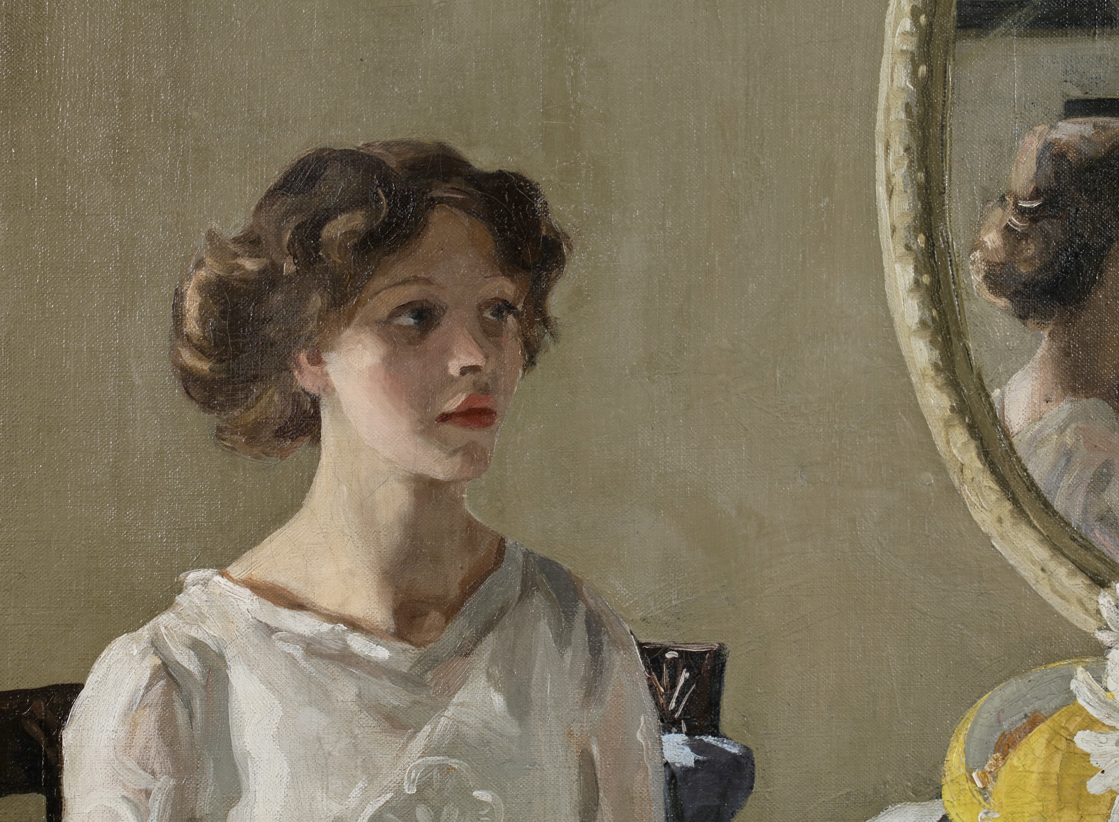 In her paintings, Fearon predominantly depicted middle class women and children in domestic interiors or engaging in leisurely activities out of doors. This typifies the taste for understated domestic genre scenes prevalent in popular British painting preceding the First World War. Later this was termed the ‘golden age’ and now seen as a poignant and nostalgic time, presaging the horror to come. The present work was exhibited at the Royal Academy in 1914. It is a charming, tender scene illuminated by soft afternoon light. In a 1914 article on the artist published in The International Studio magazine, of the present work it is said, ‘The picture is in the key of silver, and between the girl reader and the listening children there are threads of attention, so that the meaning of the title is perfectly expressed.’ The ethereal beauty and light skilfully rendered in Enchantment becomes all the more touching knowing that it was painted at the start of the First World War. It represents an idealised way of life, emblematic of the beauty and peace of the English countryside, here captured in a small family group (perhaps symbolically without father). The mother reads steadfastly to her children: a plump, rosy-cheeked baby sits opposite her and her middle daughter nestles into her mother’s side; the eldest girl sits with ramrod straight back, her blonde head raised and lit by a shaft of light directly above her from the blue sky. She perhaps becomes a symbol of the upright, resilience and determination of the British people; the epitome of a tranquil world and a way of life under threat.