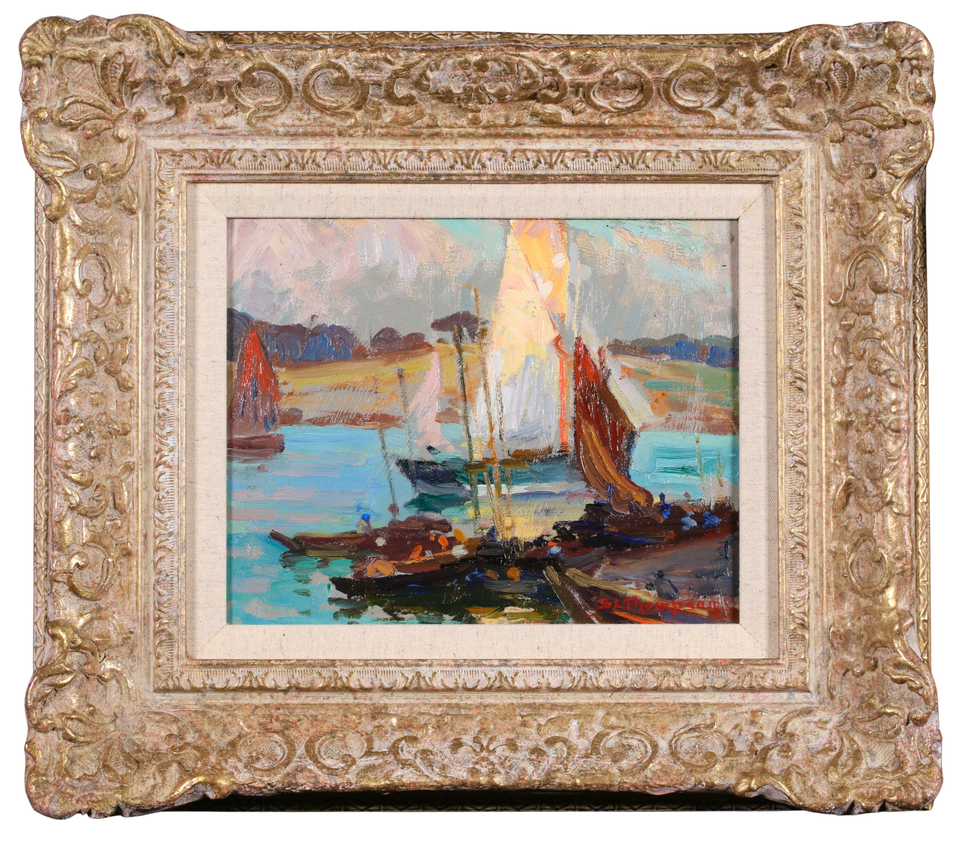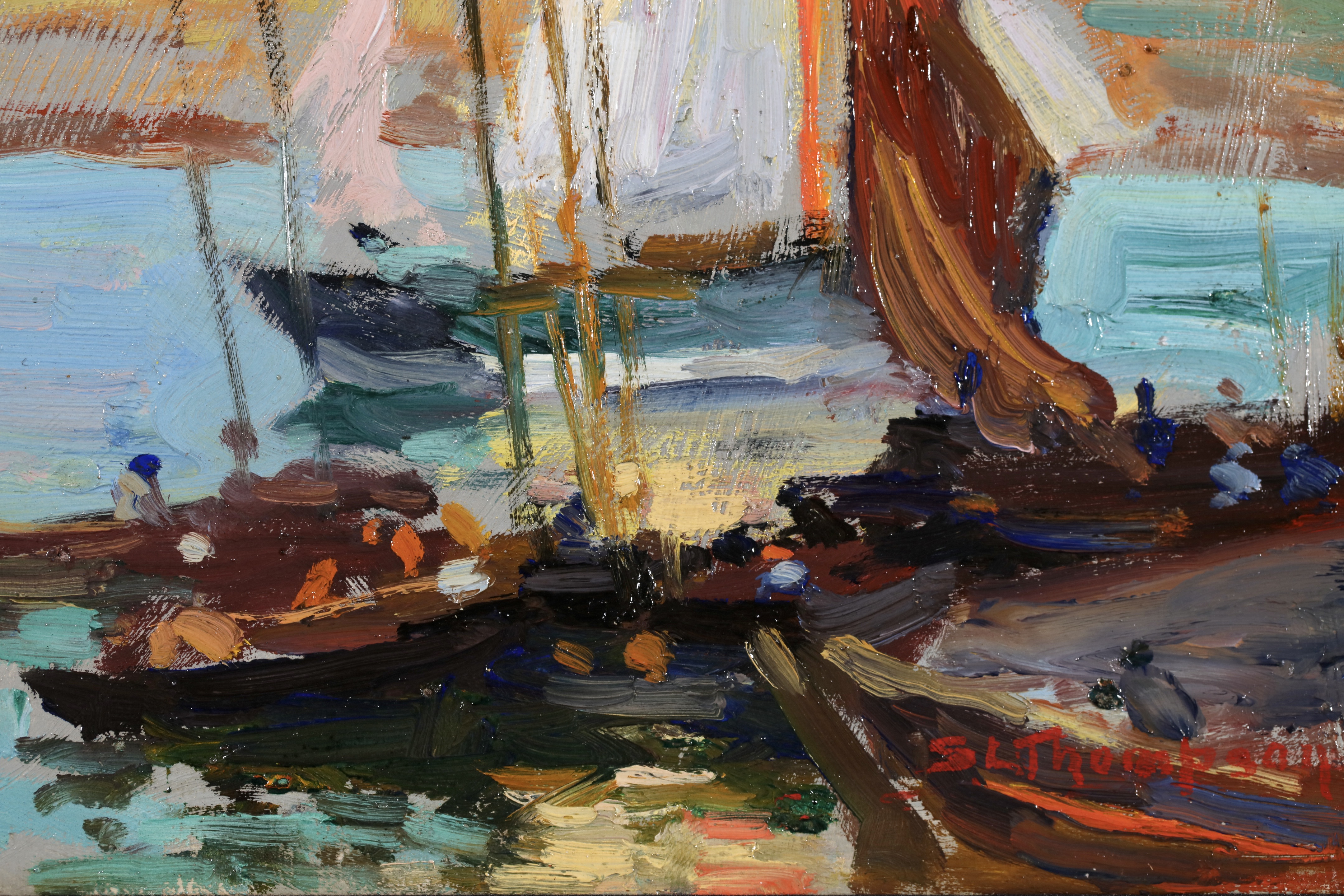 He married Maude Ethel Coe at St Mary's Church, Irwell, Canterbury, on 28 March 1911, and shortly afterwards the couple left for Europe. Ethel Thompson was committed to supporting her husband's career as an artist, and independent enough to face the challenges which their life in France was to present. After a brief stay in England, where Sydney revisited Staithes, the couple arrived in Paris in autumn 1911. Sydney studied with Lucien Simon, as well as attending the Académie Colarossi and taking anatomy classes at the École nationale supérieure des beaux-arts. He made contact with expatriate New Zealand painters Frances Hodgkins, Owen Merton and Cora Wilding, and renewed his friendship with William Leech, as well as meeting members of the expatriate circle of the Irish post-impressionist Roderic O'Conor. After six months in Paris, during which time he became aware of the varied stylistic currents of post-impressionism, he left for Concarneau to work out his new artistic direction. Rejecting studio practice he painted out of doors at the harbour, concentrating on capturing colour and movement, and developing his technique by working systematically on increasingly large formats. The First World War disrupted his painting career, but the family remained in France. Three children – a son and two daughters – were born at Concarneau. Thompson's achievements in France included a successful exhibition in 1920 at the Galeries Georges Petit, Paris, and a 'mention honorable' at the Paris Salon in 1922.